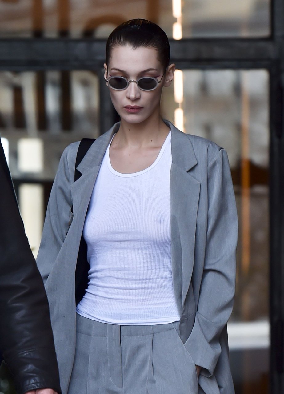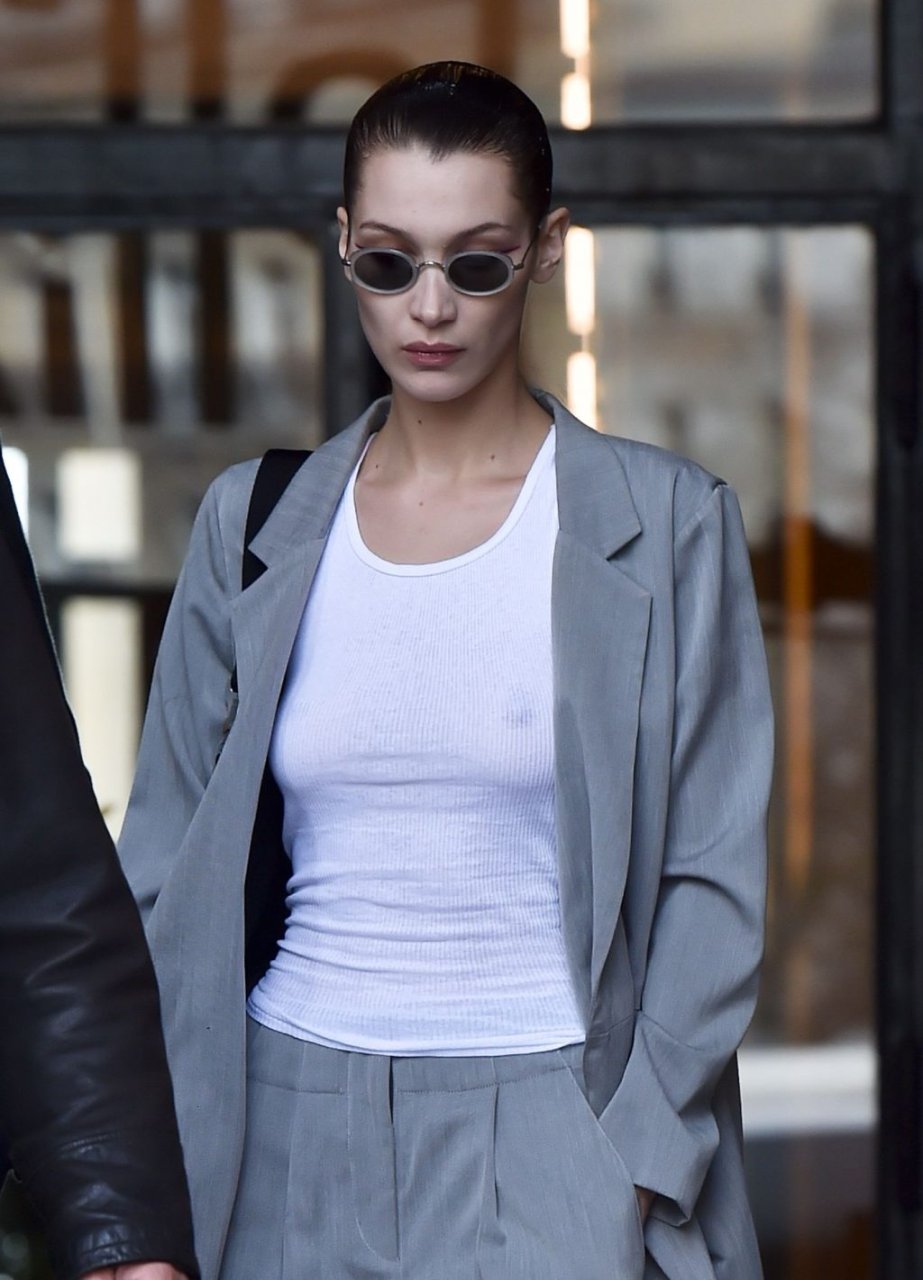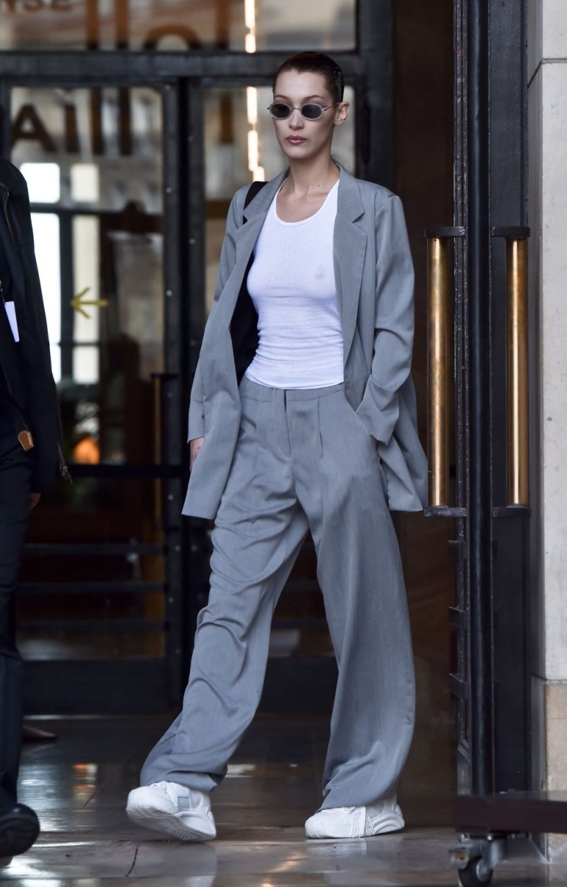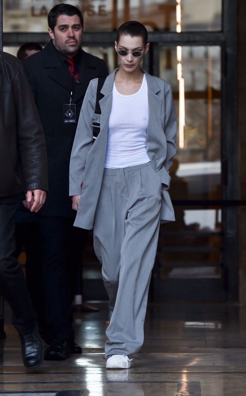 Белла Хадид без бюстгальтера в белом топе под бледно-голубым костюмом покидает свой отель в Париже.