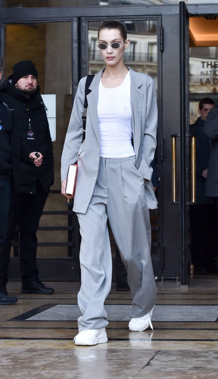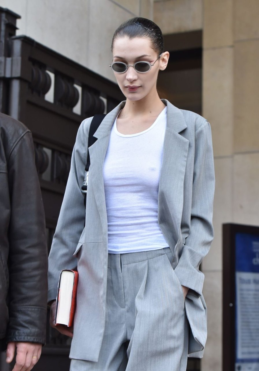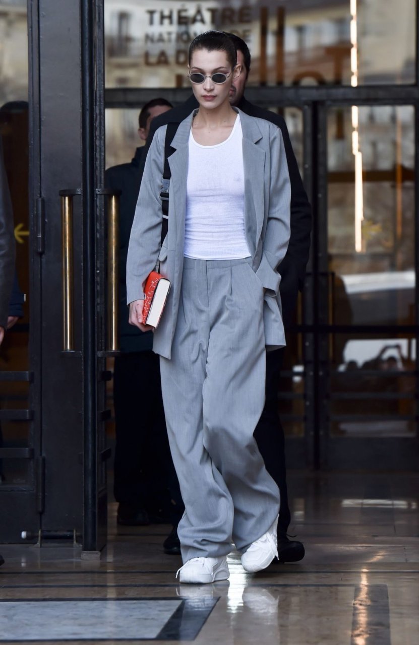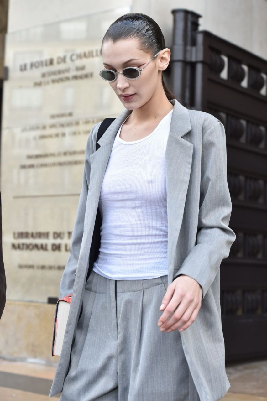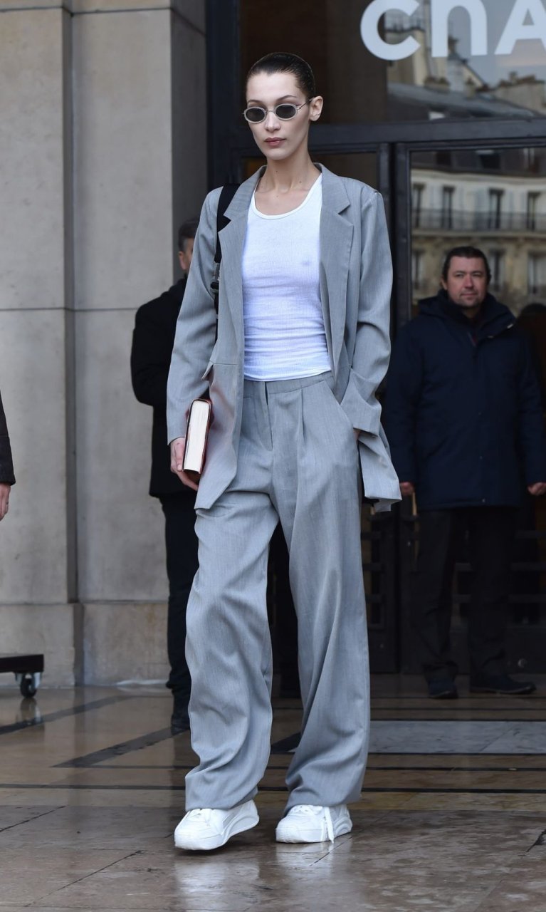 Белла Хадид без бюстгальтера в белом топе под бледно-голубым костюмом покидает свой отель в Париже.