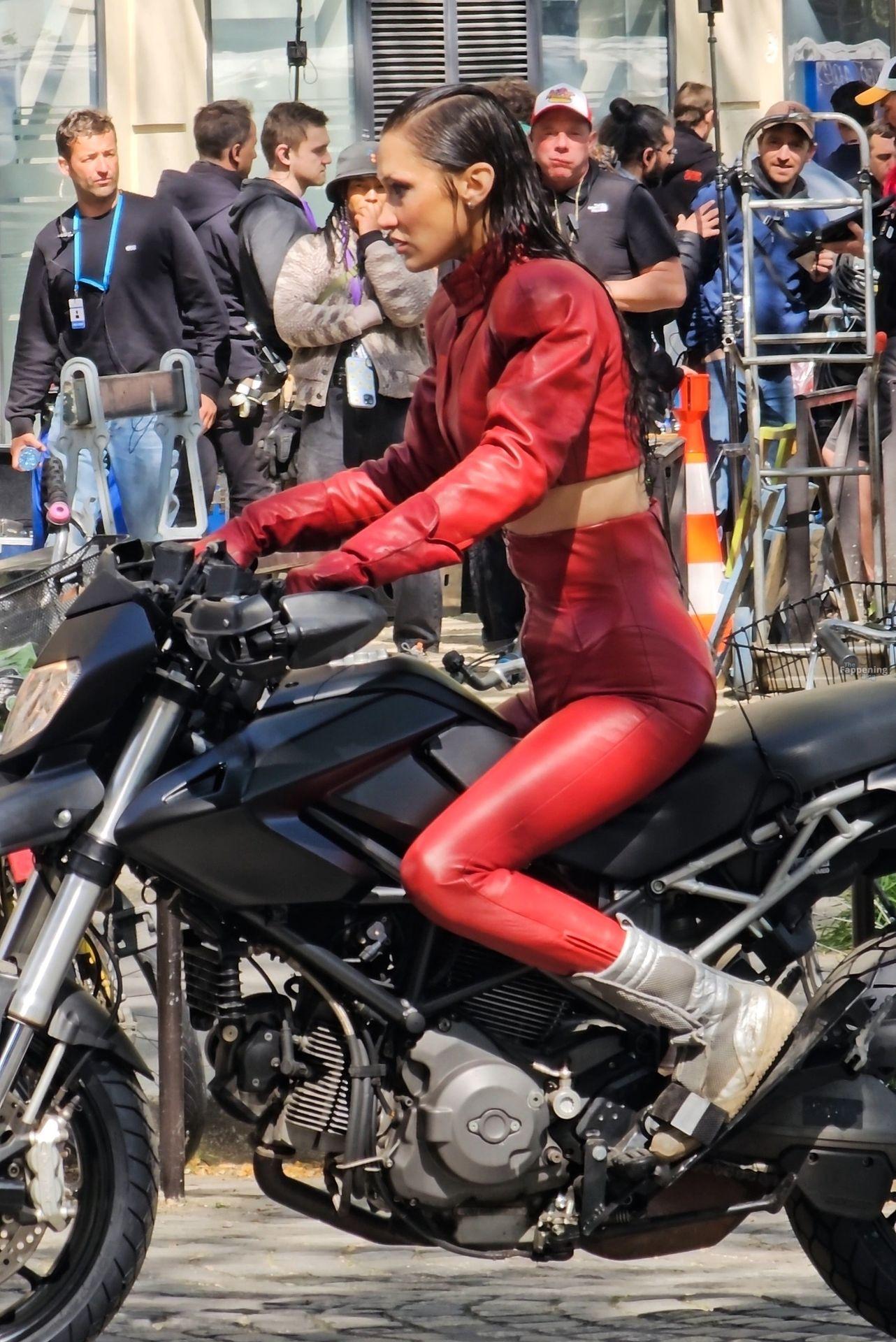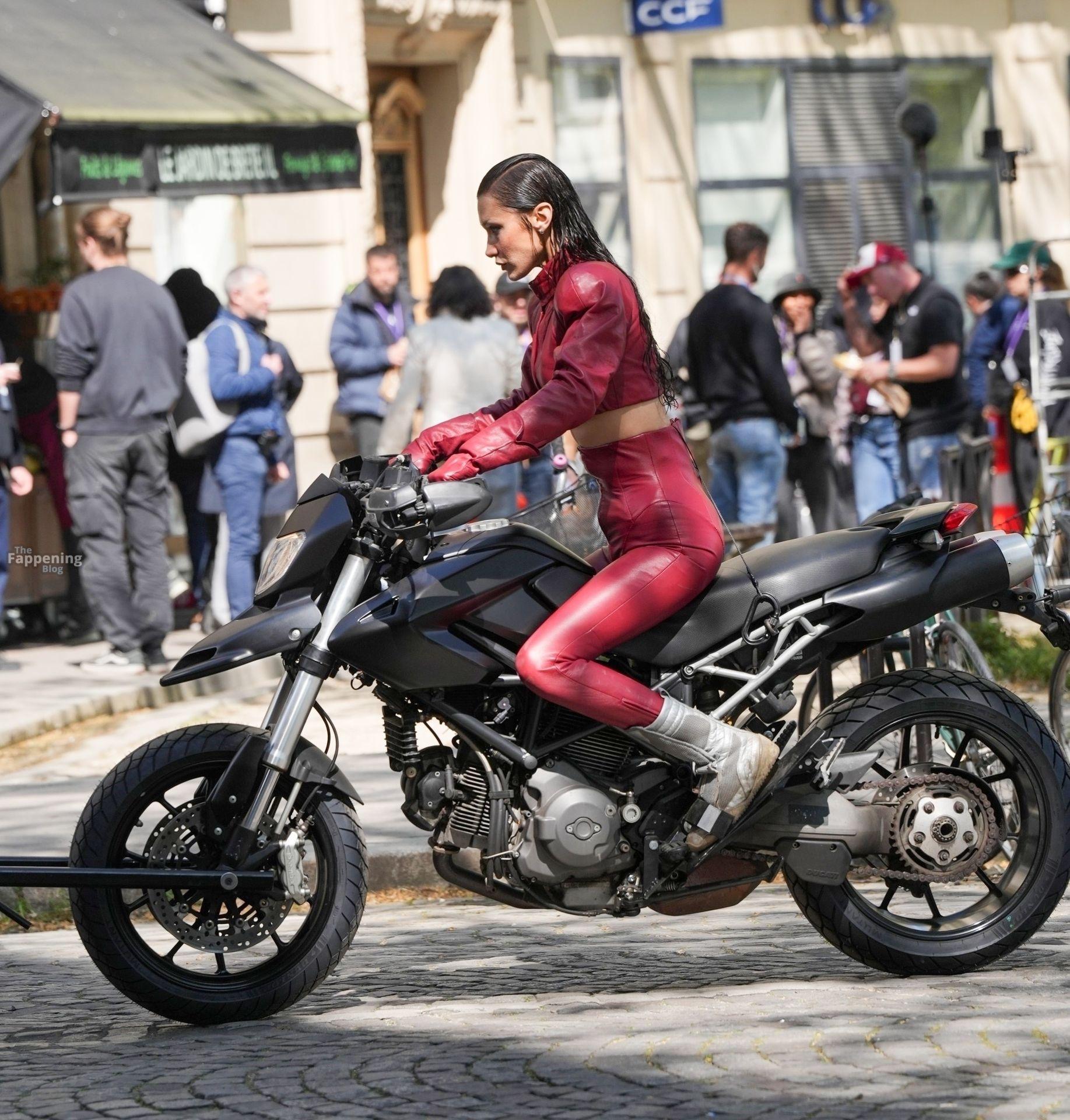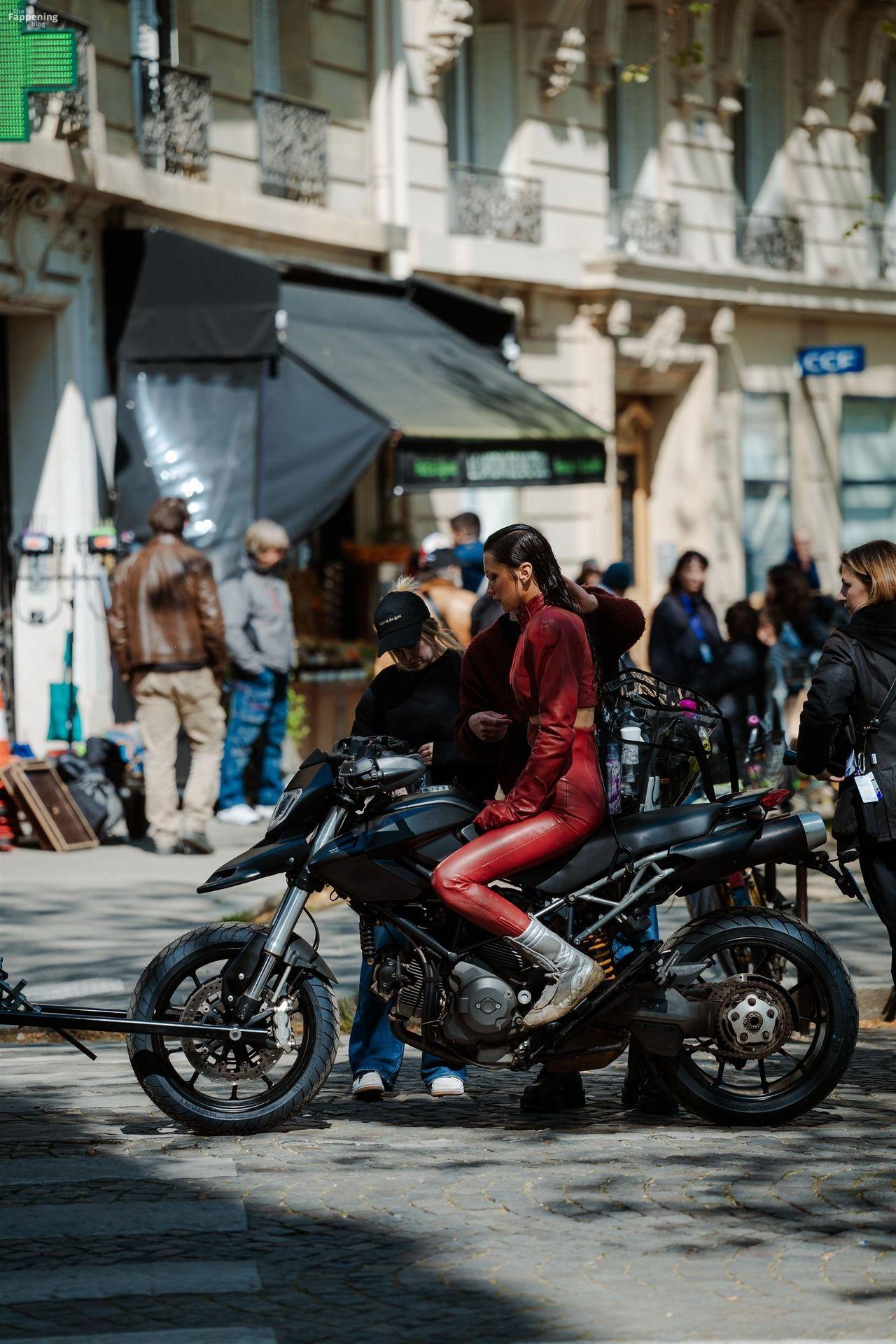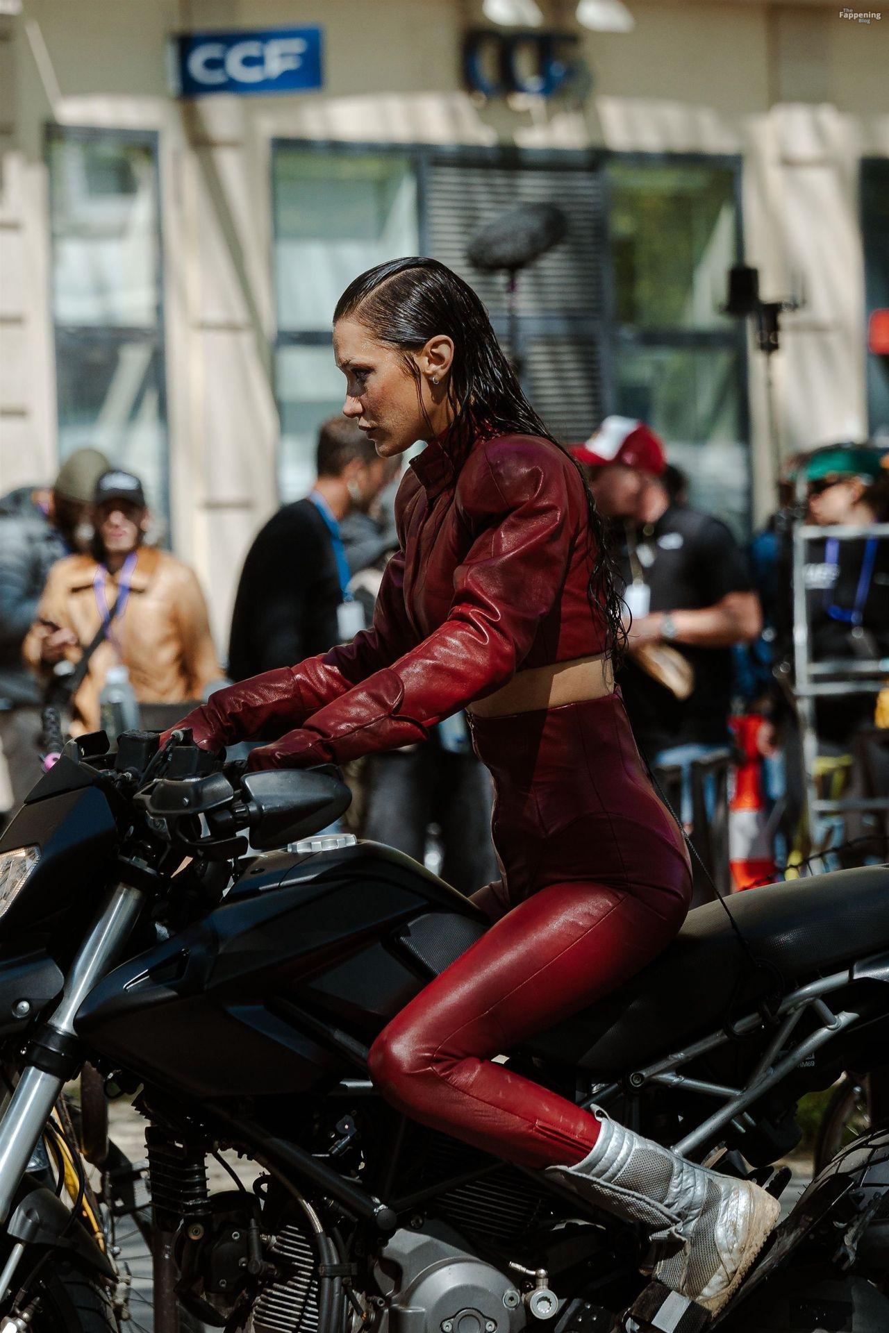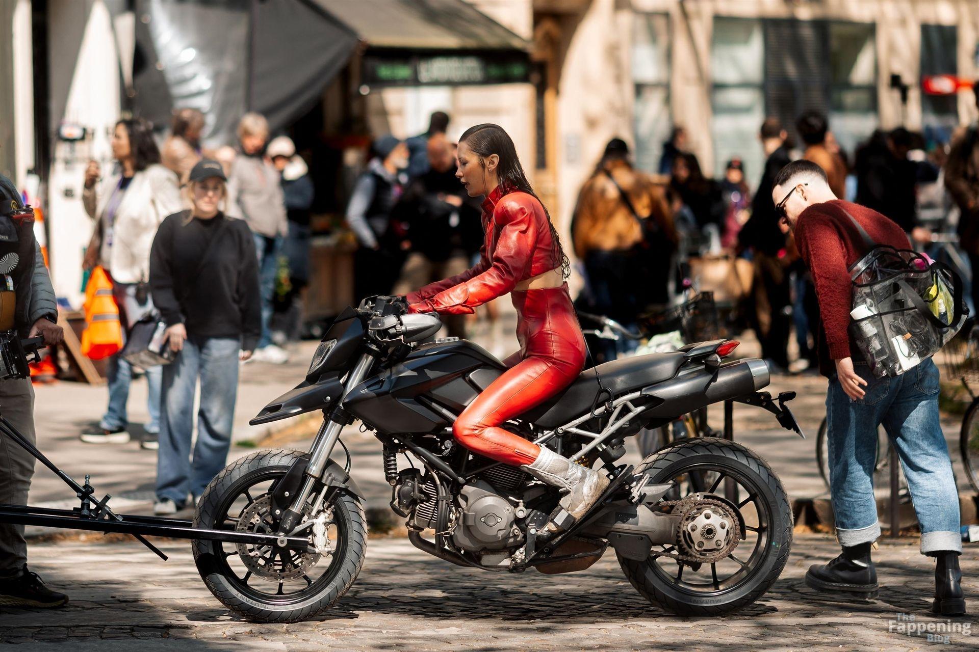 Белла Хадид запечатлена в Париже в огненно-красном кожаном комбинезоне, оседлав мотоцикл. После того дикого трюка с манекеном и аварии, она играет крутую девушку с серьёзной травмой ноги для сцены в сериале «Красота» в Париже, Франция.