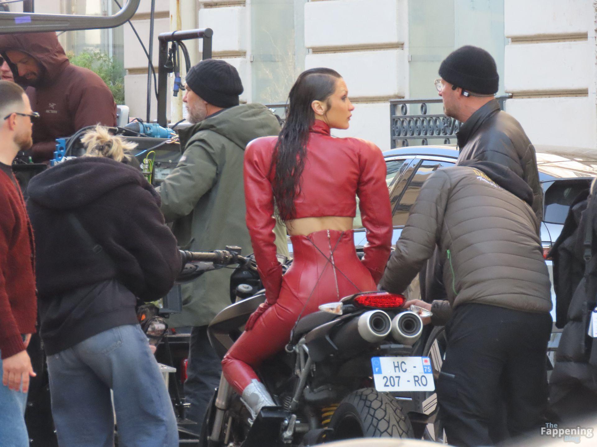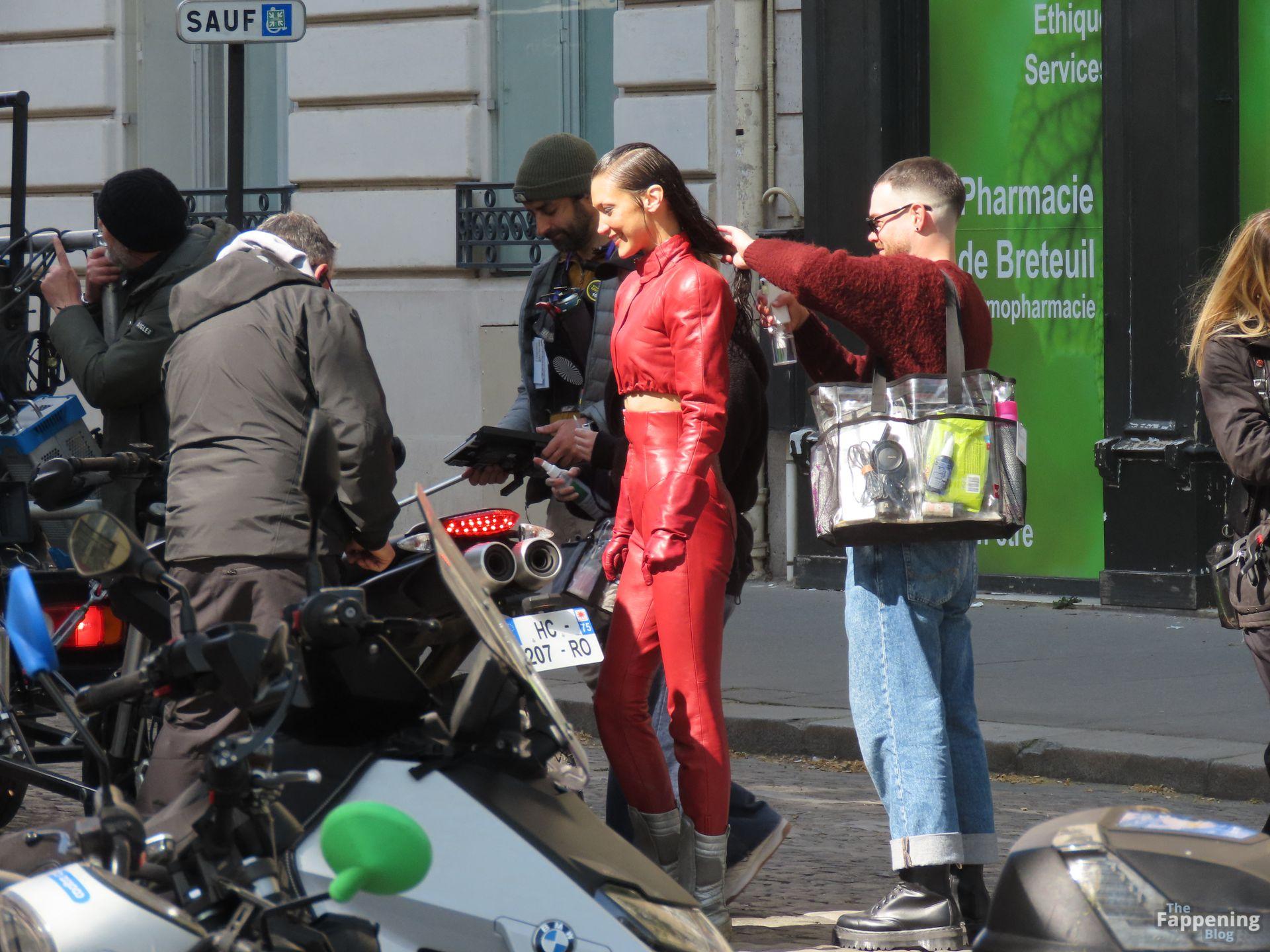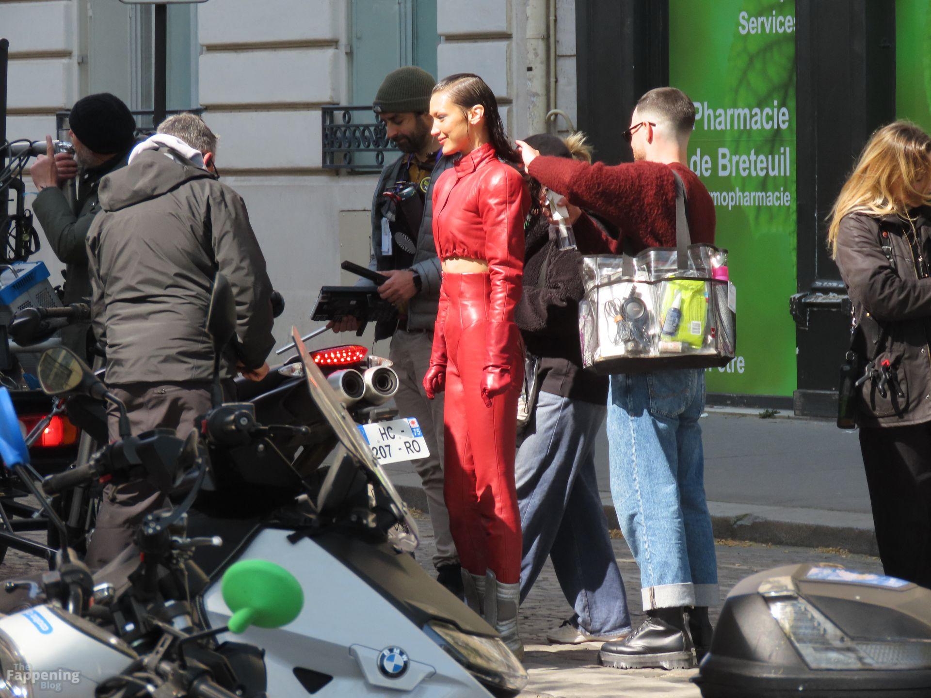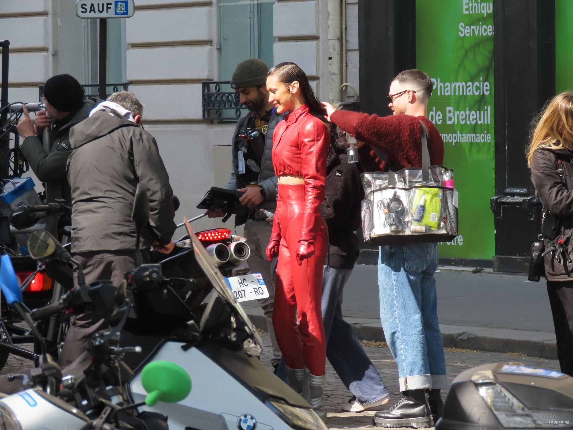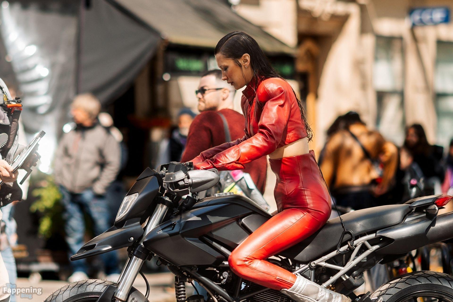 Белла Хадид запечатлена в Париже в огненно-красном кожаном комбинезоне, оседлав мотоцикл. После того дикого трюка с манекеном и аварии, она играет крутую девушку с серьёзной травмой ноги для сцены в сериале «Красота» в Париже, Франция.
