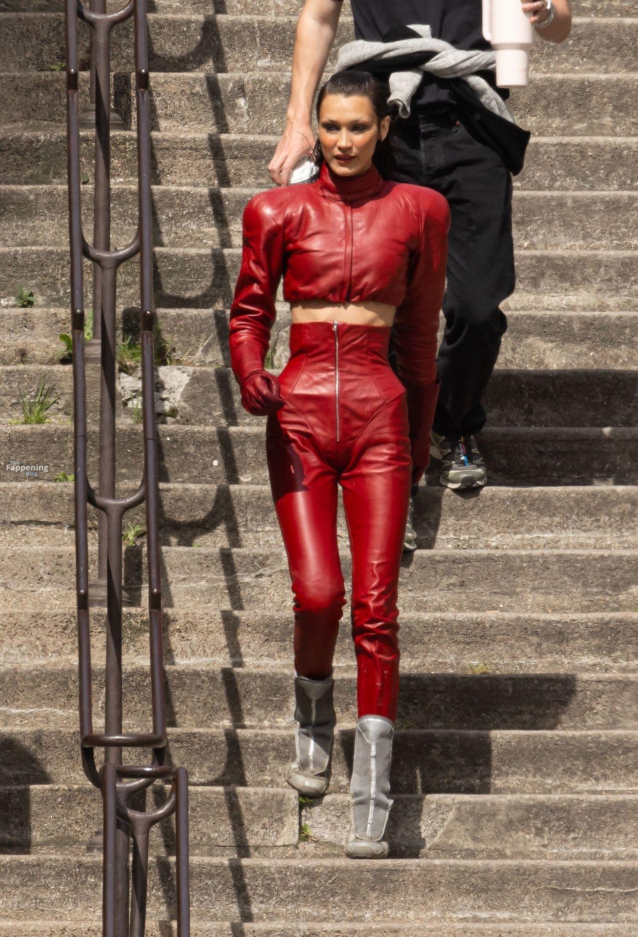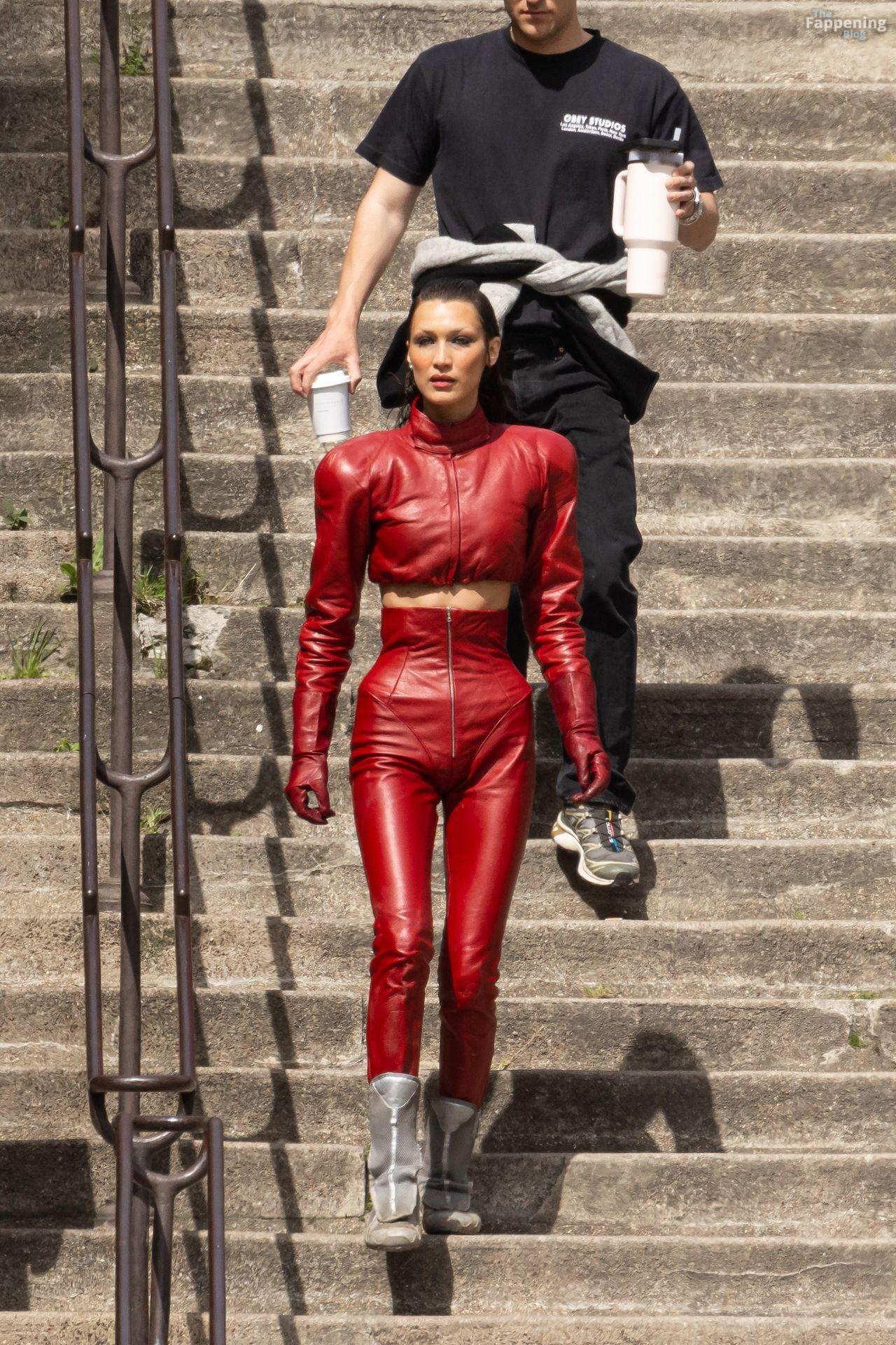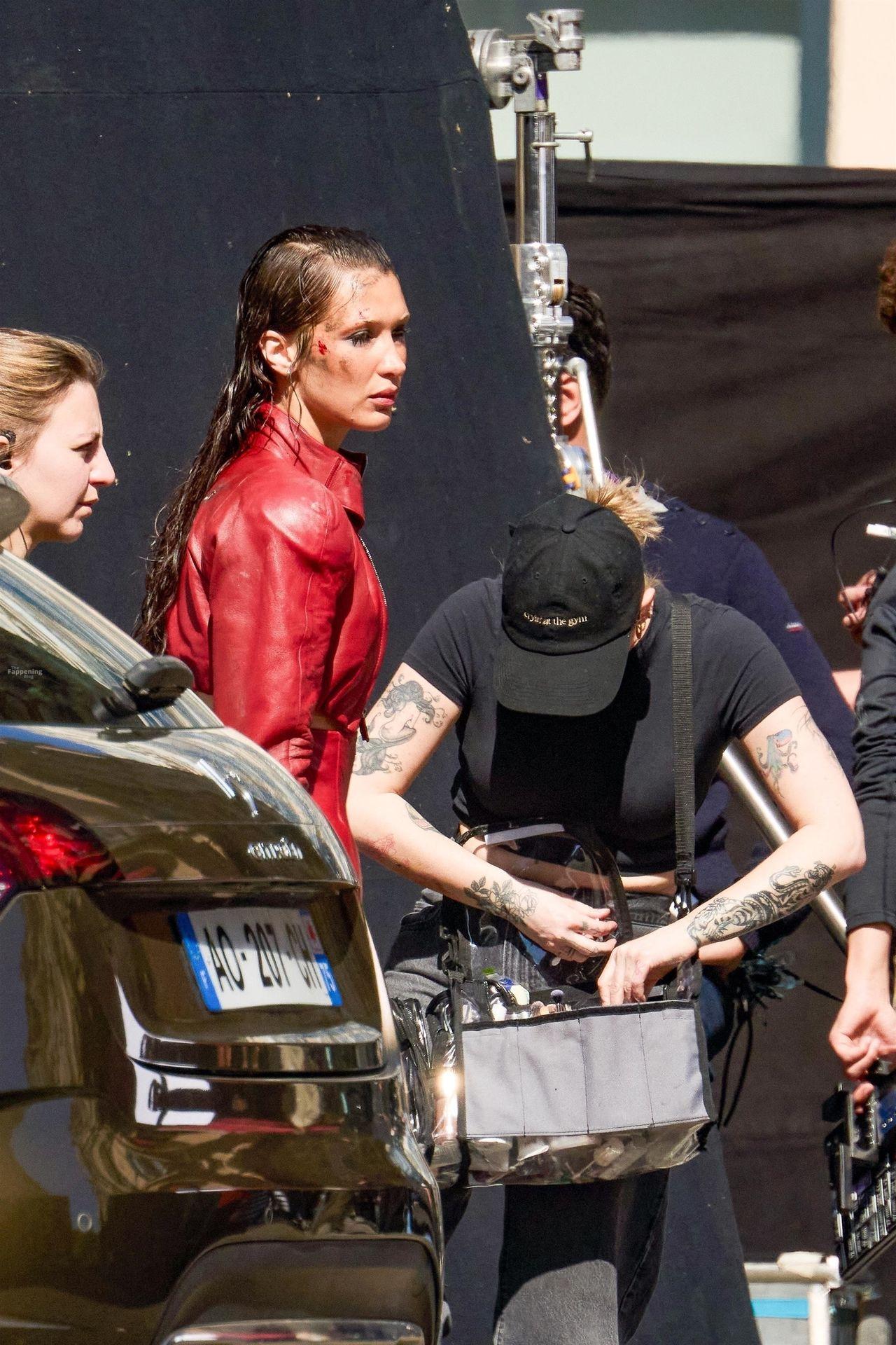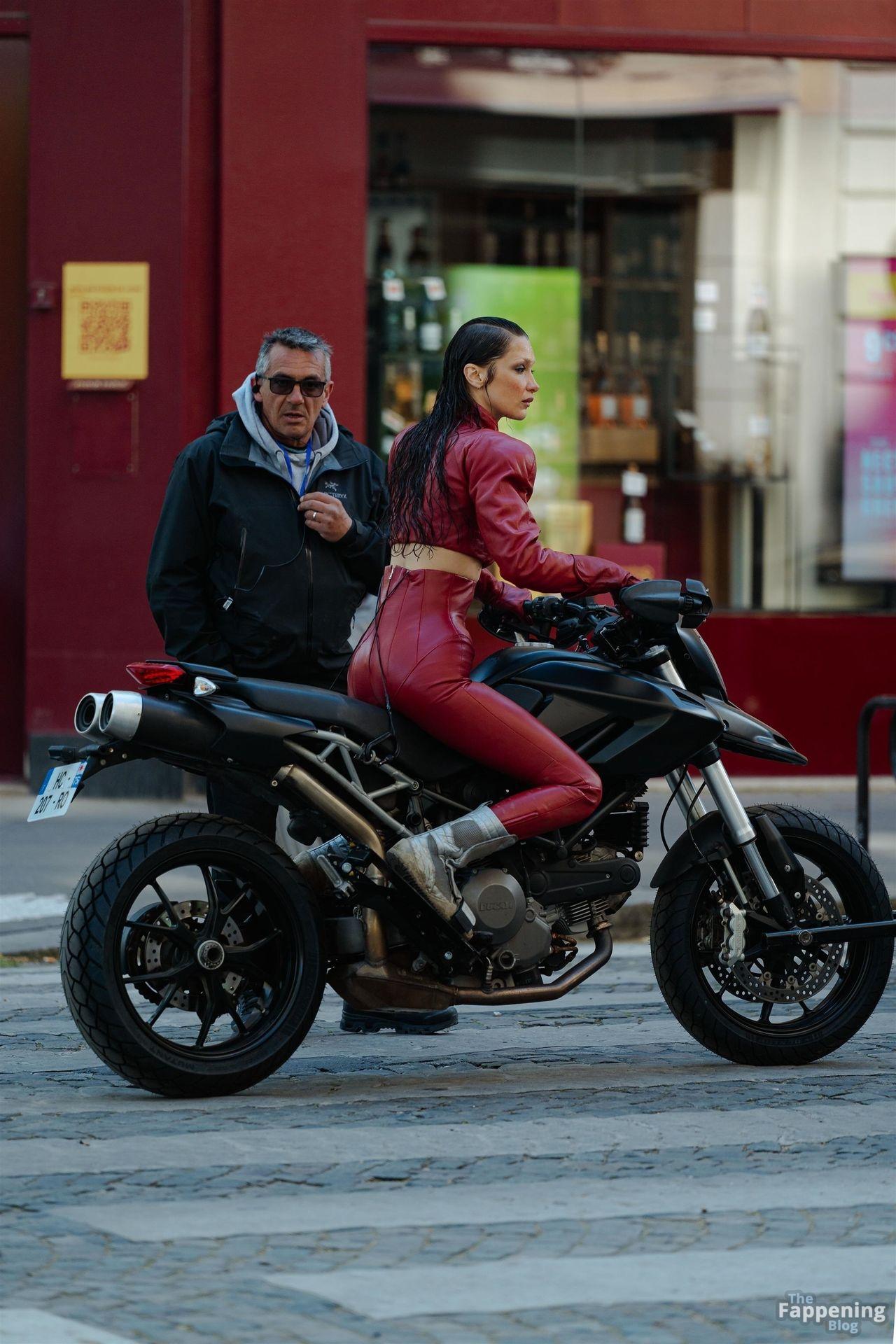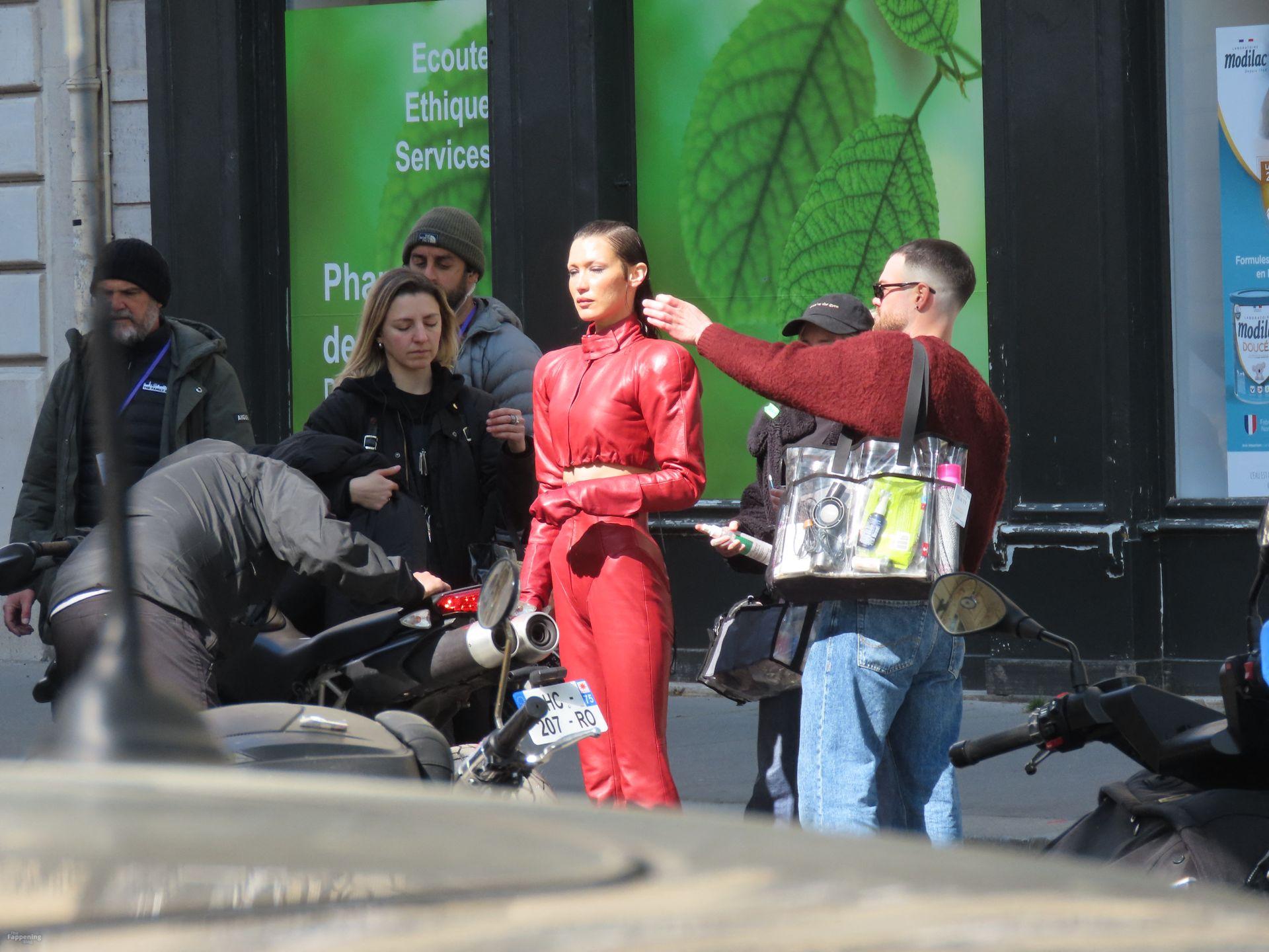 Белла Хадид запечатлена в Париже в огненно-красном кожаном комбинезоне, оседлав мотоцикл. После того дикого трюка с манекеном и аварии, она играет крутую девушку с серьёзной травмой ноги для сцены в сериале «Красота» в Париже, Франция.