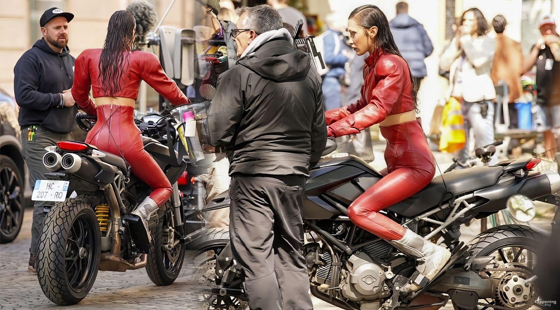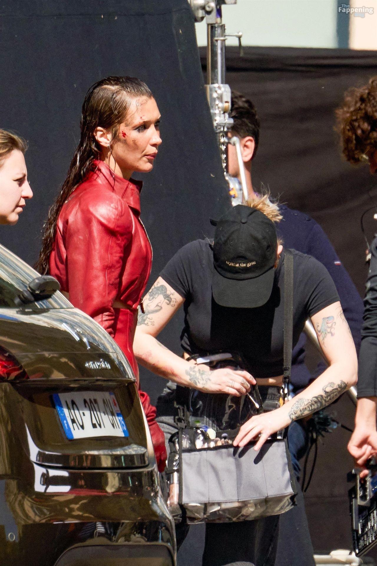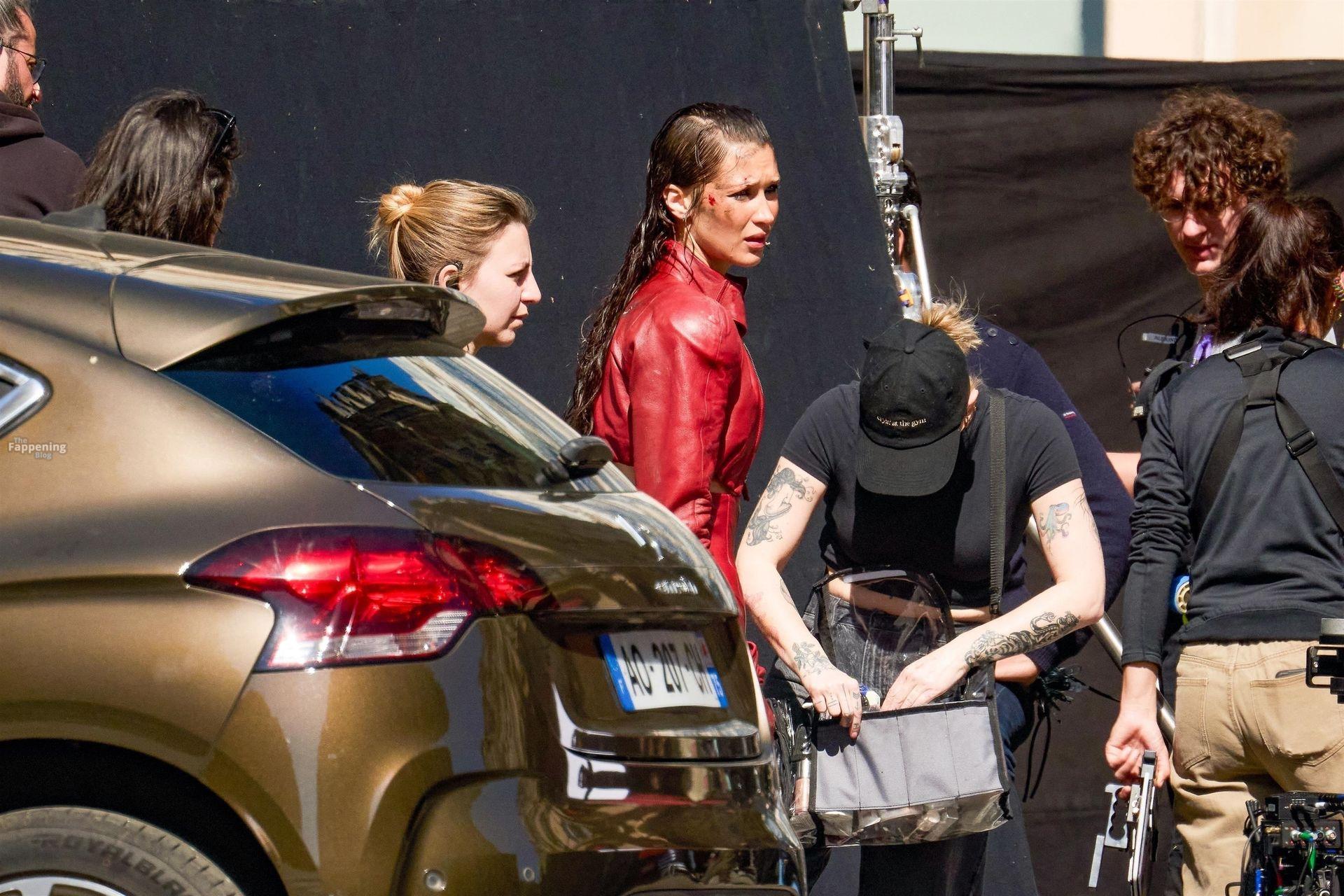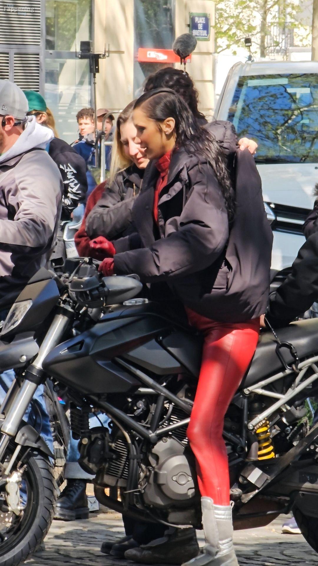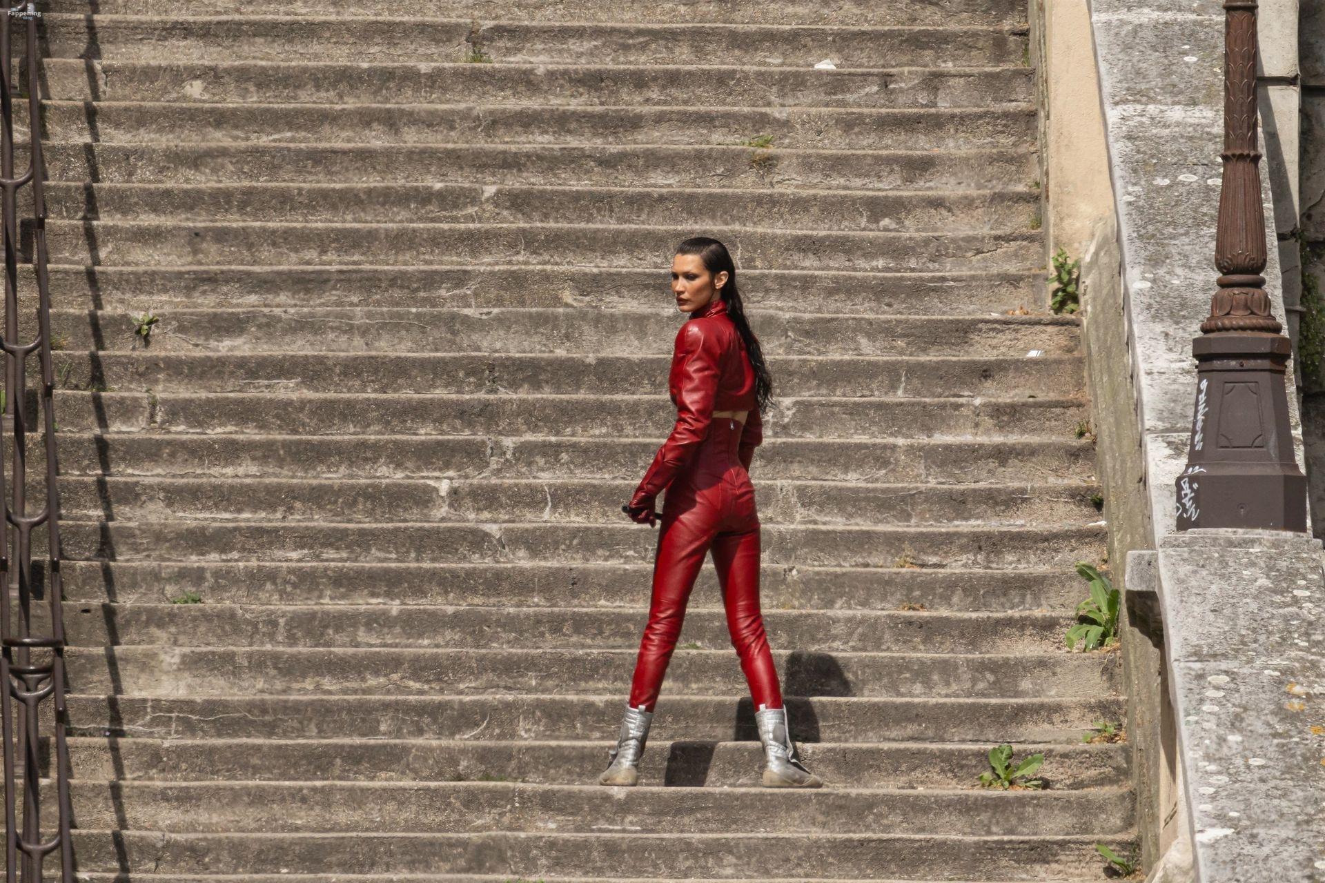 Белла Хадид запечатлена в Париже в огненно-красном кожаном комбинезоне, оседлав мотоцикл. После того дикого трюка с манекеном и аварии, она играет крутую девушку с серьёзной травмой ноги для сцены в сериале «Красота» в Париже, Франция.