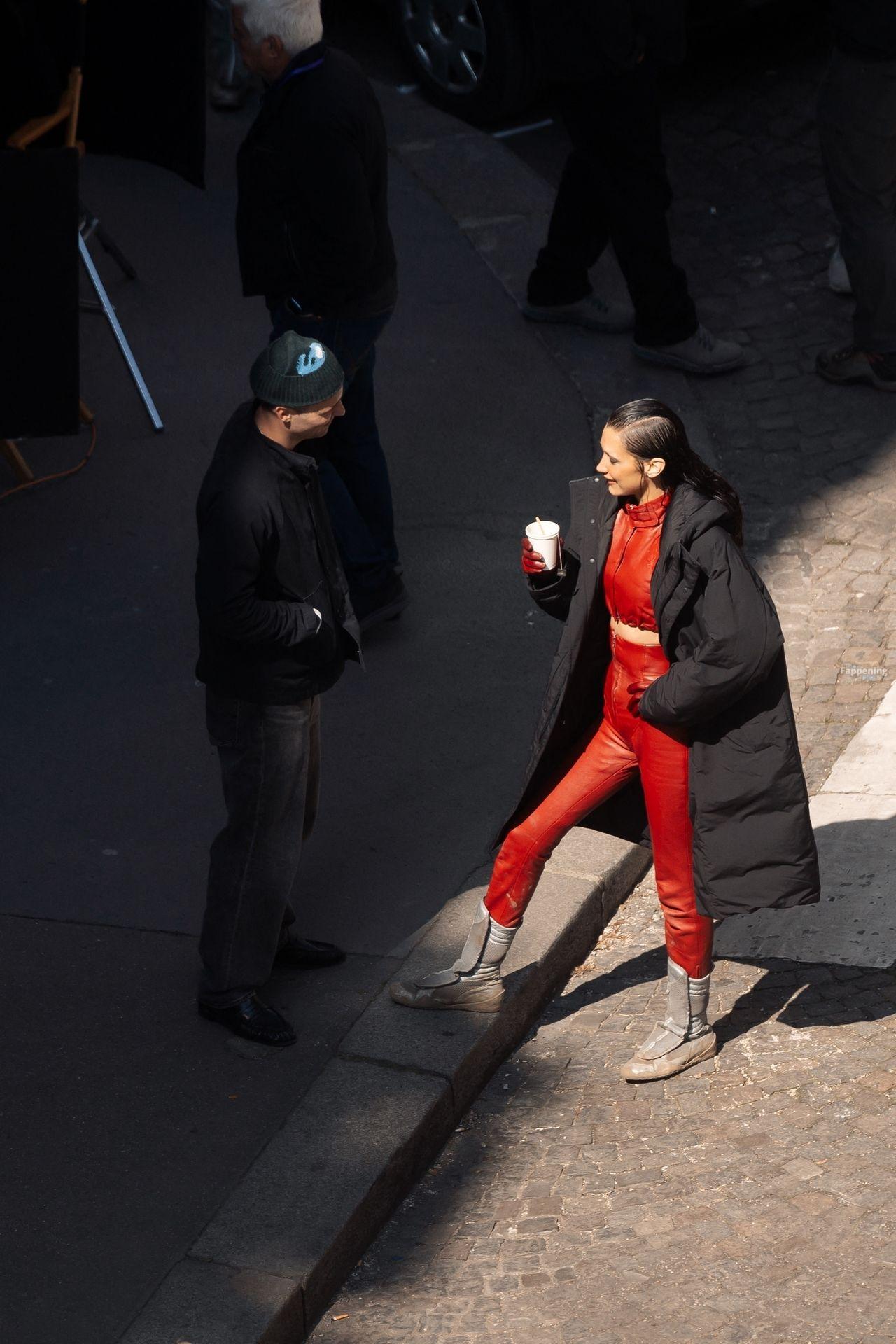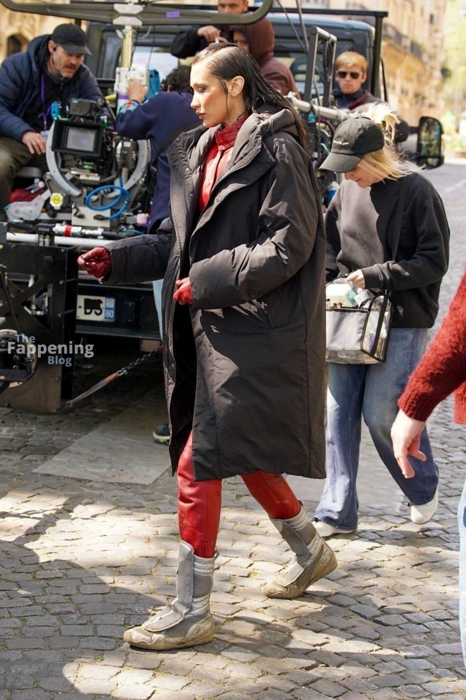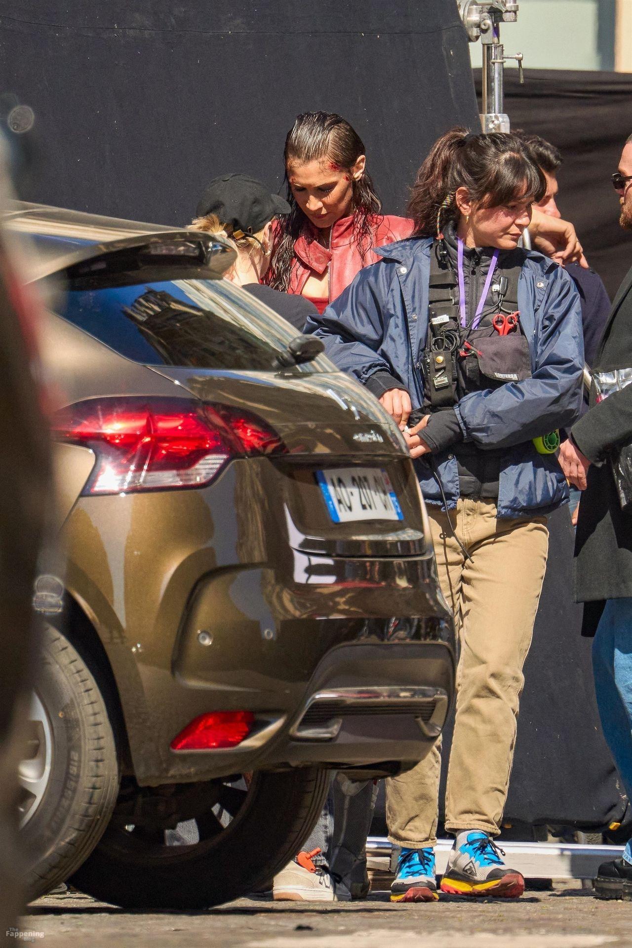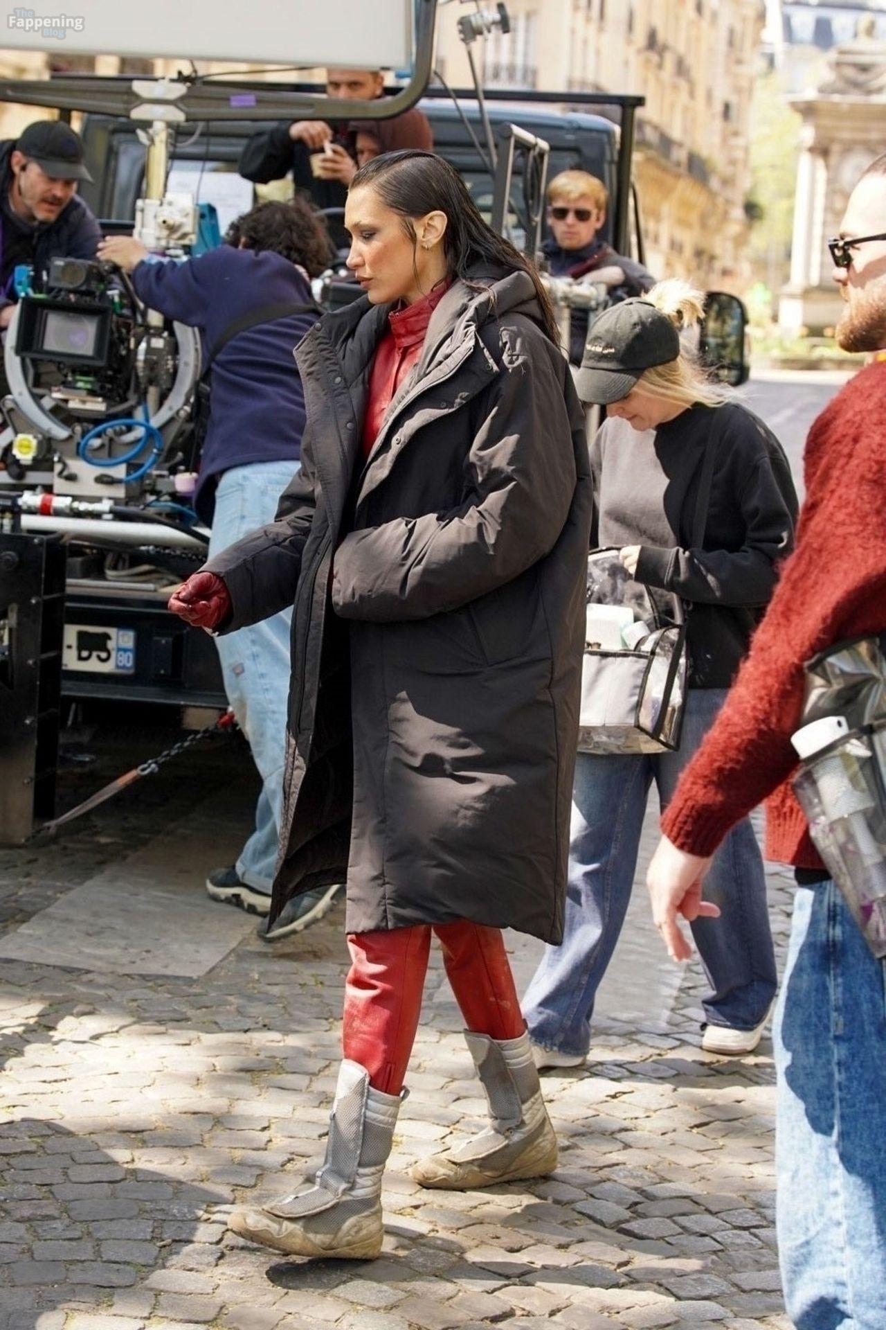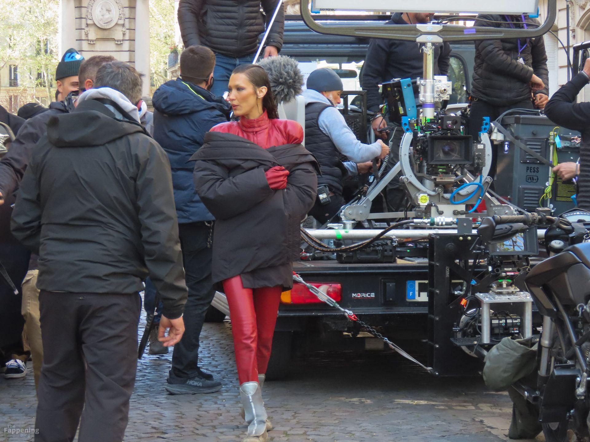 Белла Хадид запечатлена в Париже в огненно-красном кожаном комбинезоне, оседлав мотоцикл. После того дикого трюка с манекеном и аварии, она играет крутую девушку с серьёзной травмой ноги для сцены в сериале «Красота» в Париже, Франция.