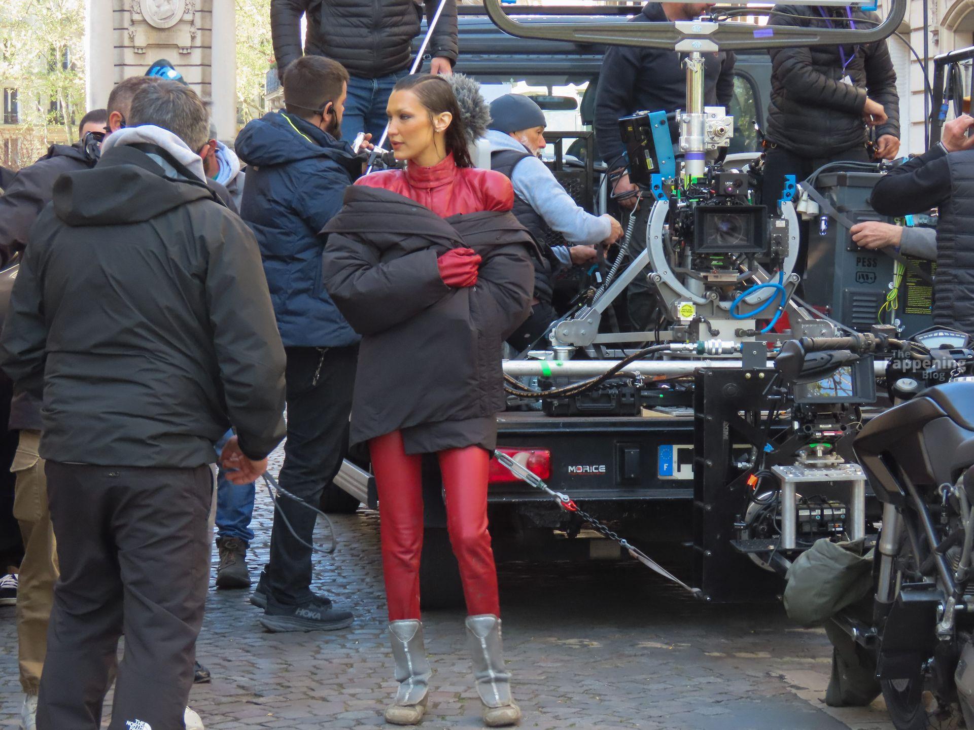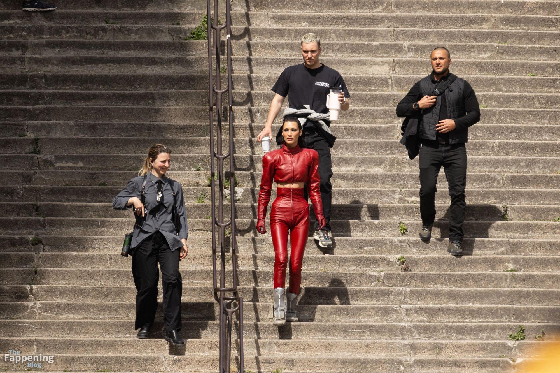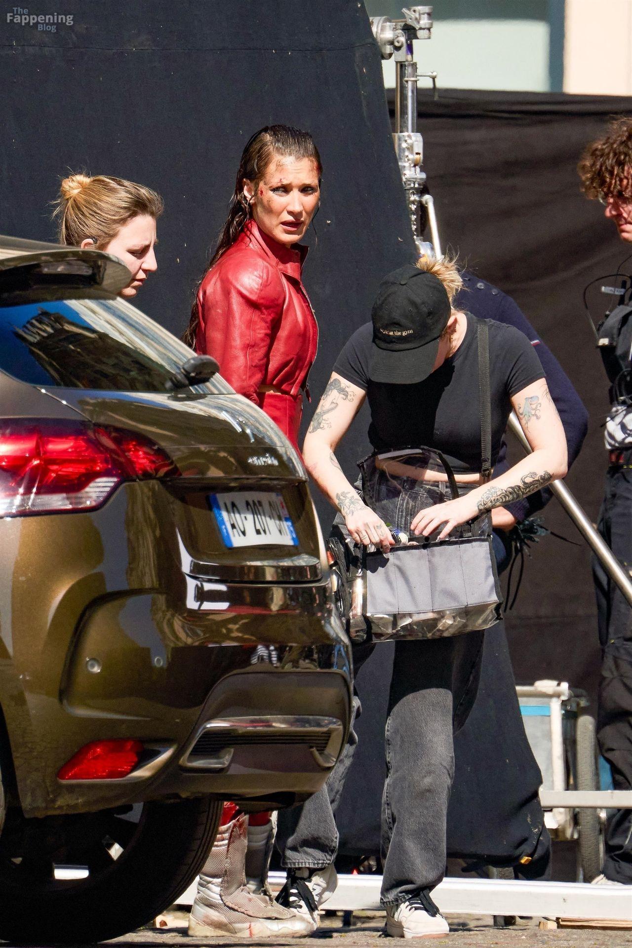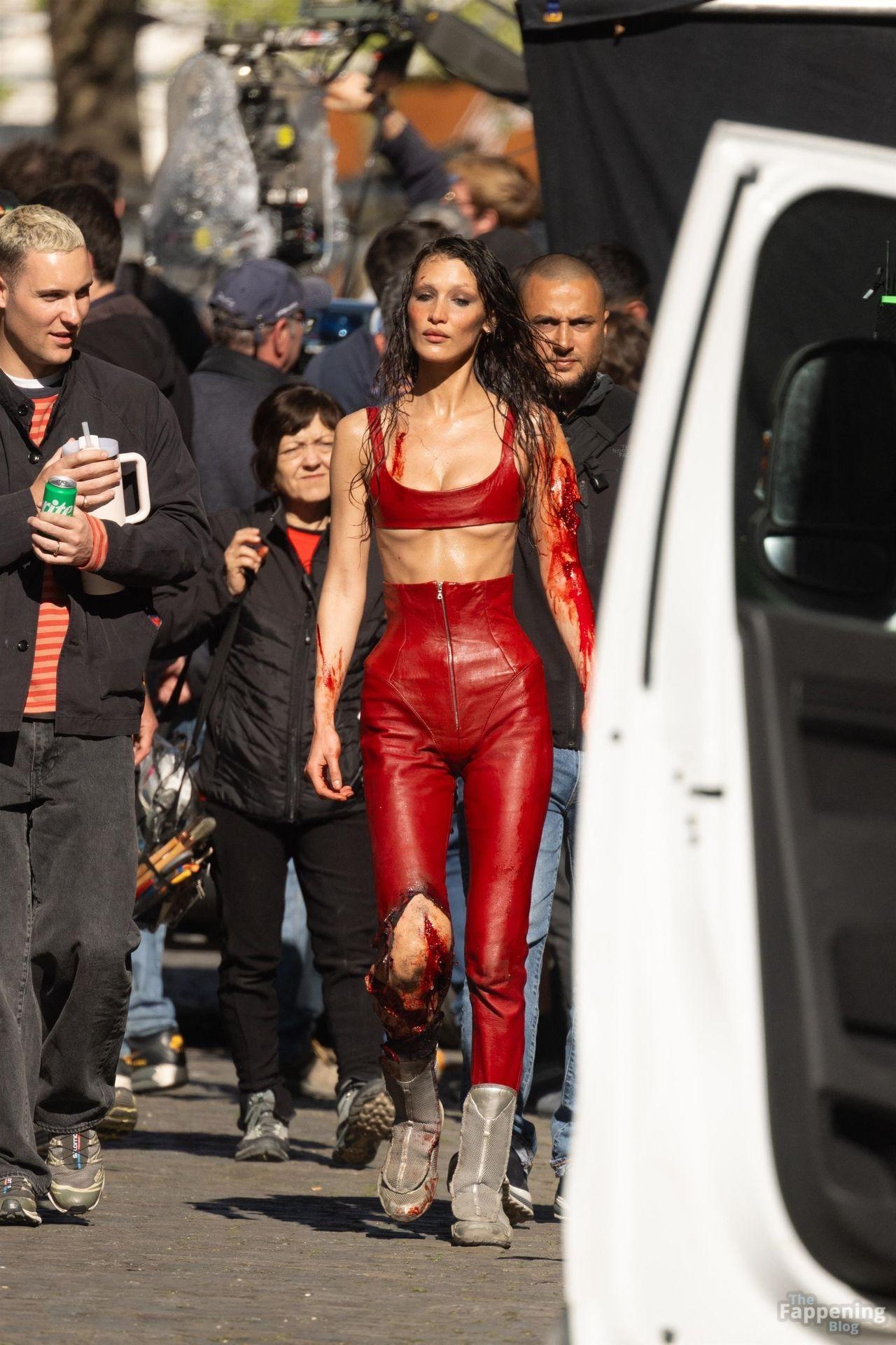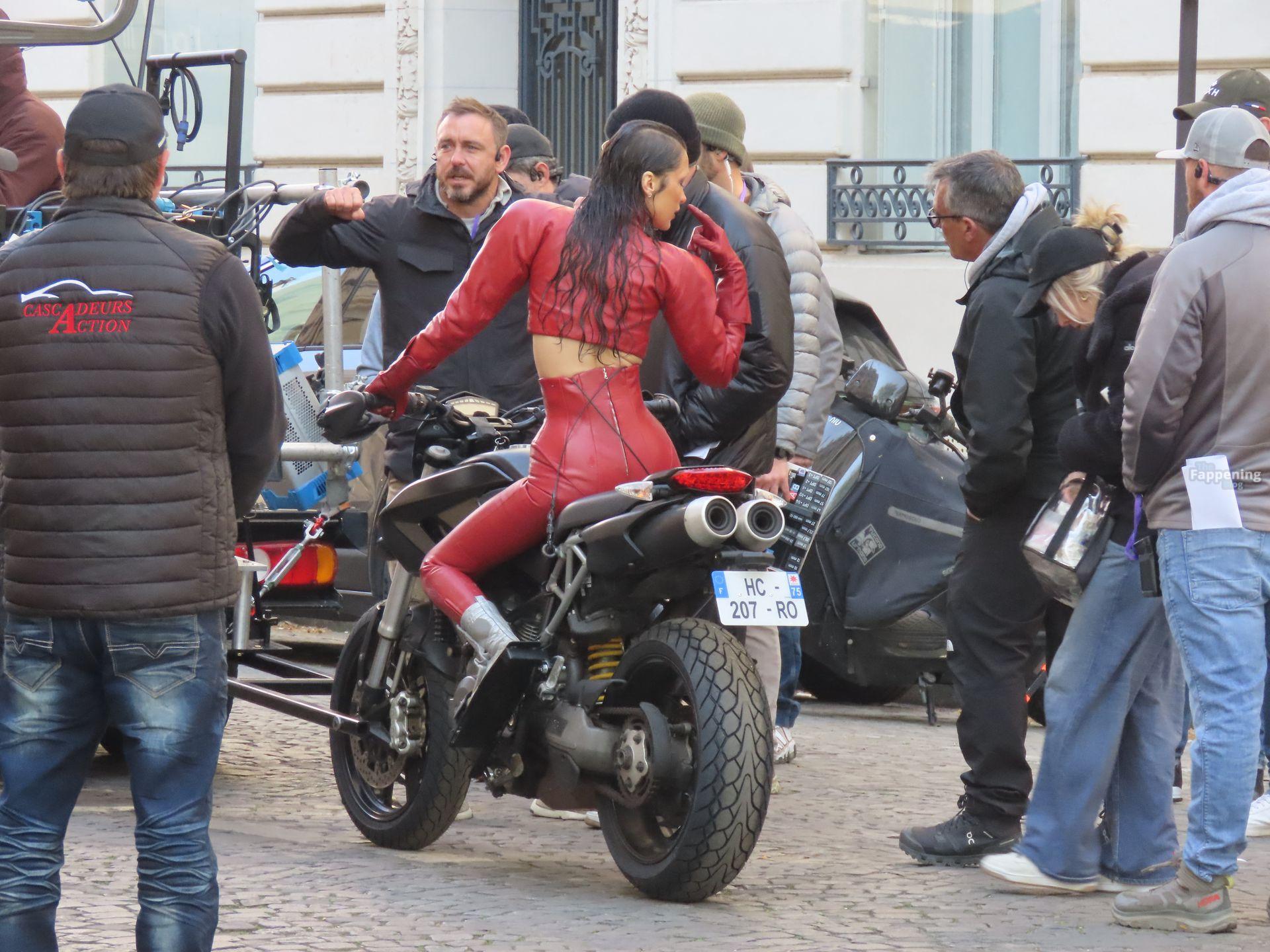 Белла Хадид запечатлена в Париже в огненно-красном кожаном комбинезоне, оседлав мотоцикл. После того дикого трюка с манекеном и аварии, она играет крутую девушку с серьёзной травмой ноги для сцены в сериале «Красота» в Париже, Франция.