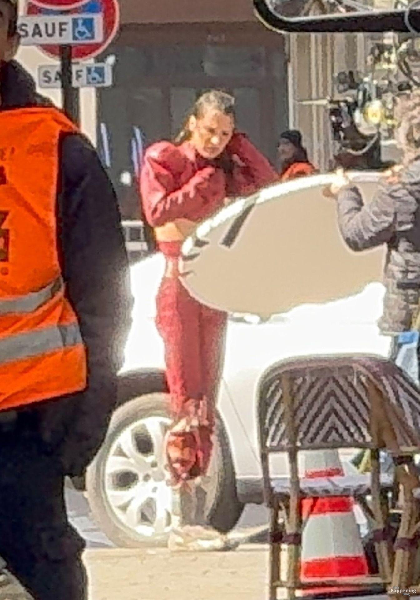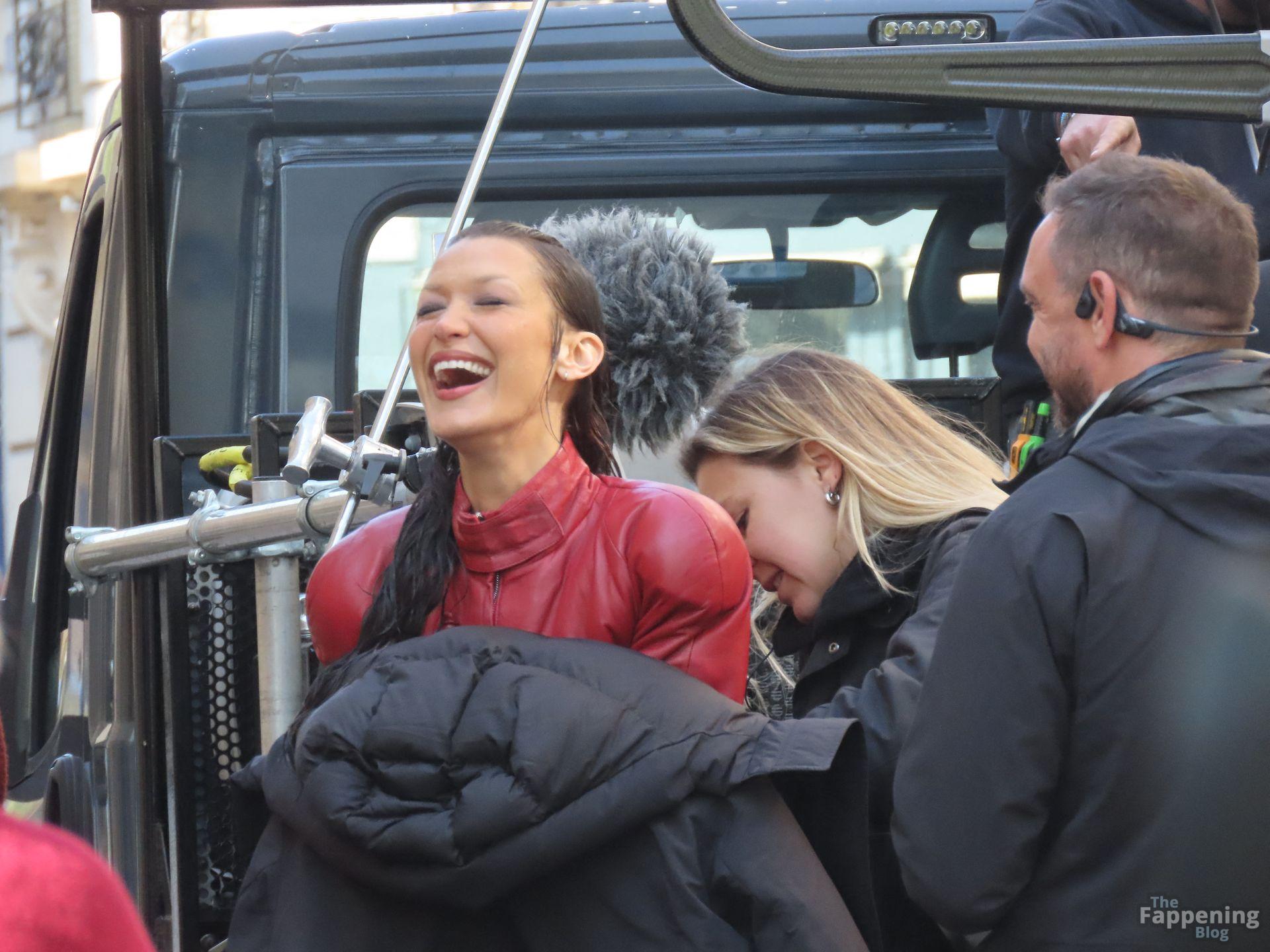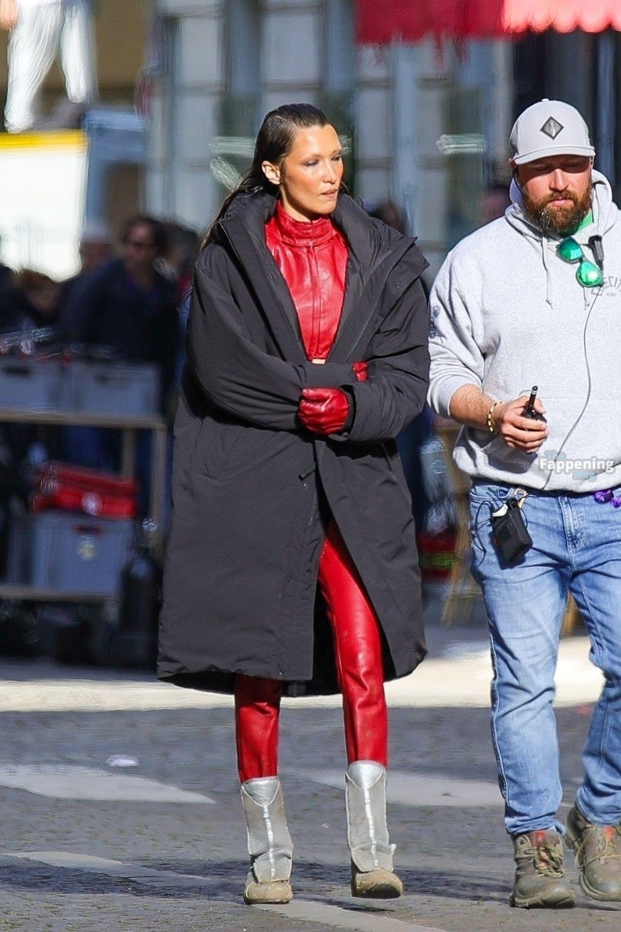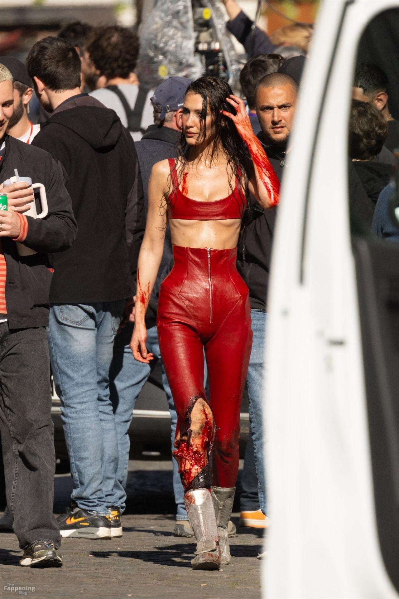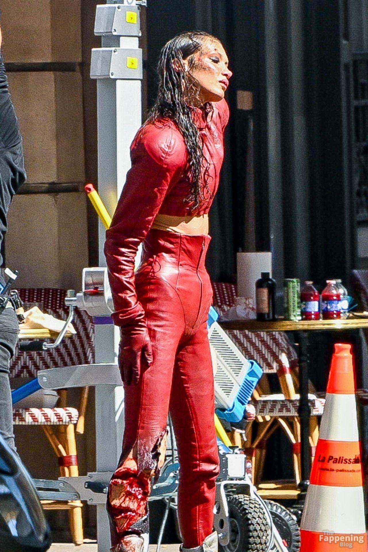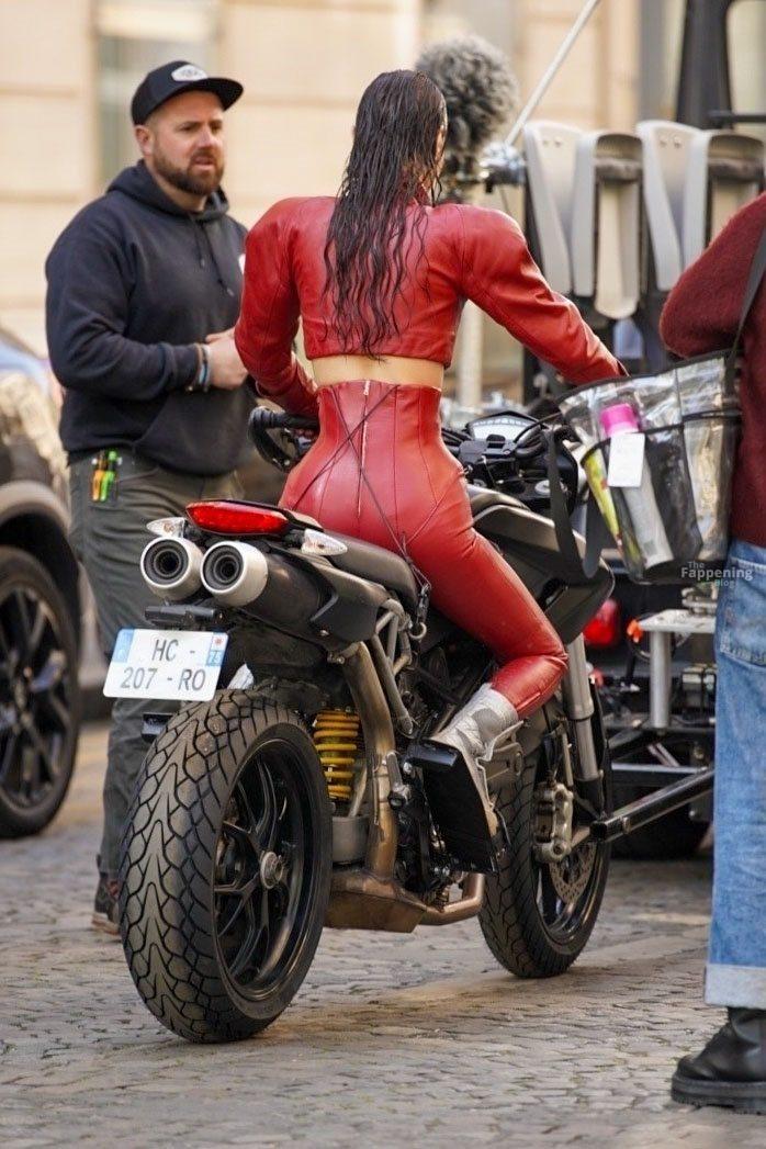 Белла Хадид запечатлена в Париже в огненно-красном кожаном комбинезоне, оседлав мотоцикл. После того дикого трюка с манекеном и аварии, она играет крутую девушку с серьёзной травмой ноги для сцены в сериале «Красота» в Париже, Франция.