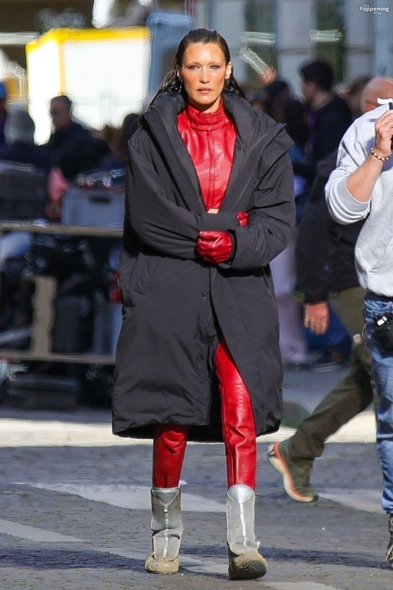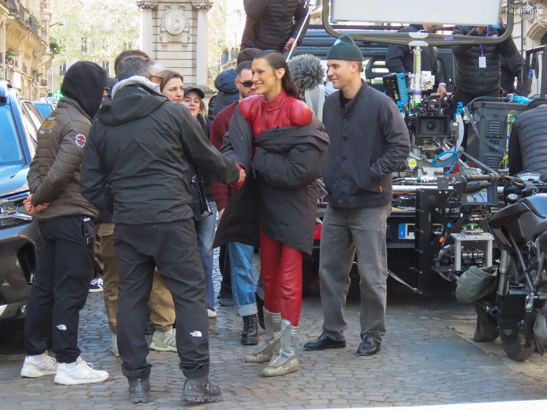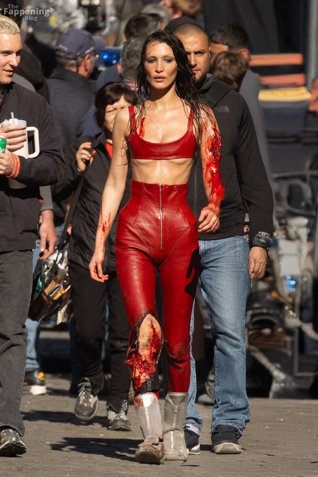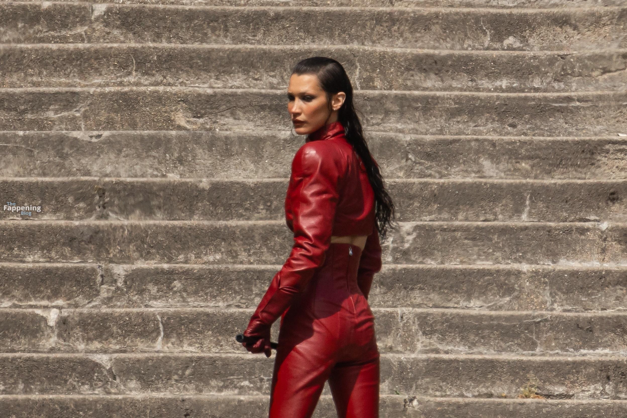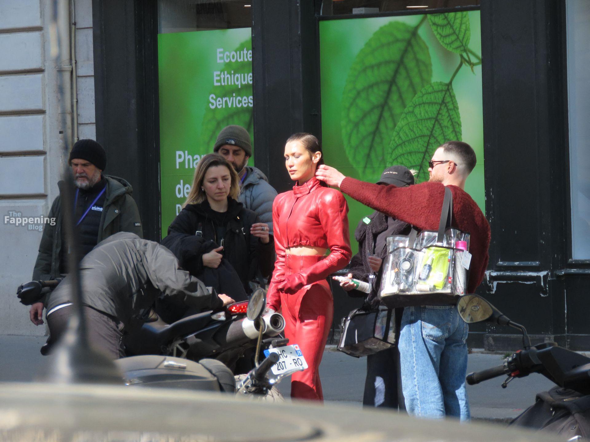 Белла Хадид запечатлена в Париже в огненно-красном кожаном комбинезоне, оседлав мотоцикл. После того дикого трюка с манекеном и аварии, она играет крутую девушку с серьёзной травмой ноги для сцены в сериале «Красота» в Париже, Франция.