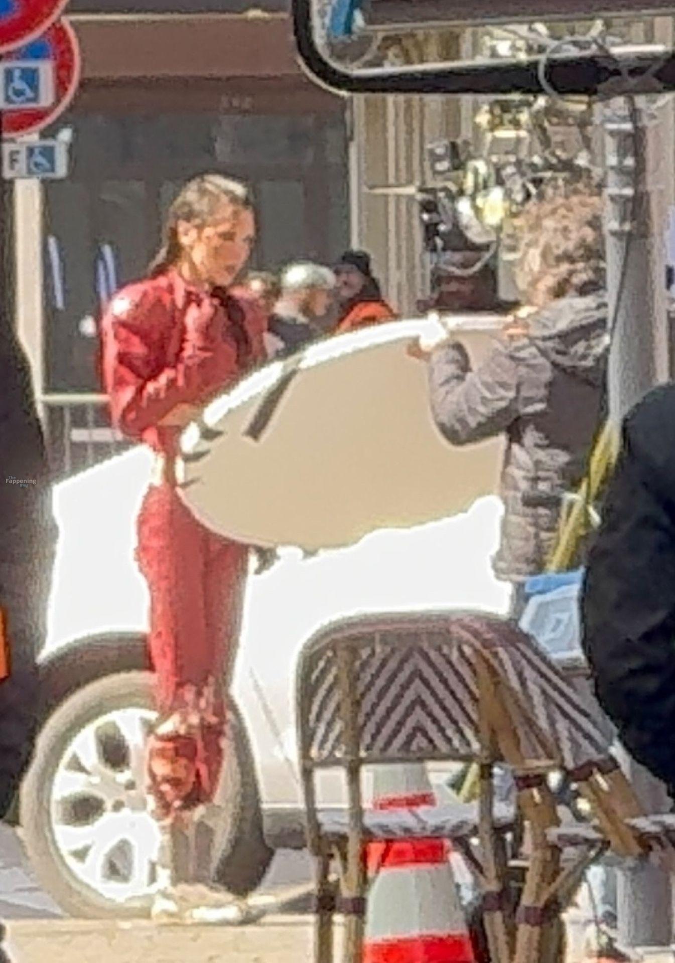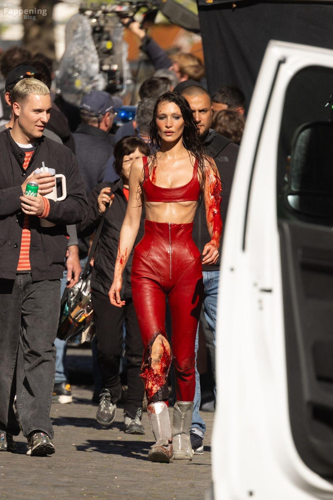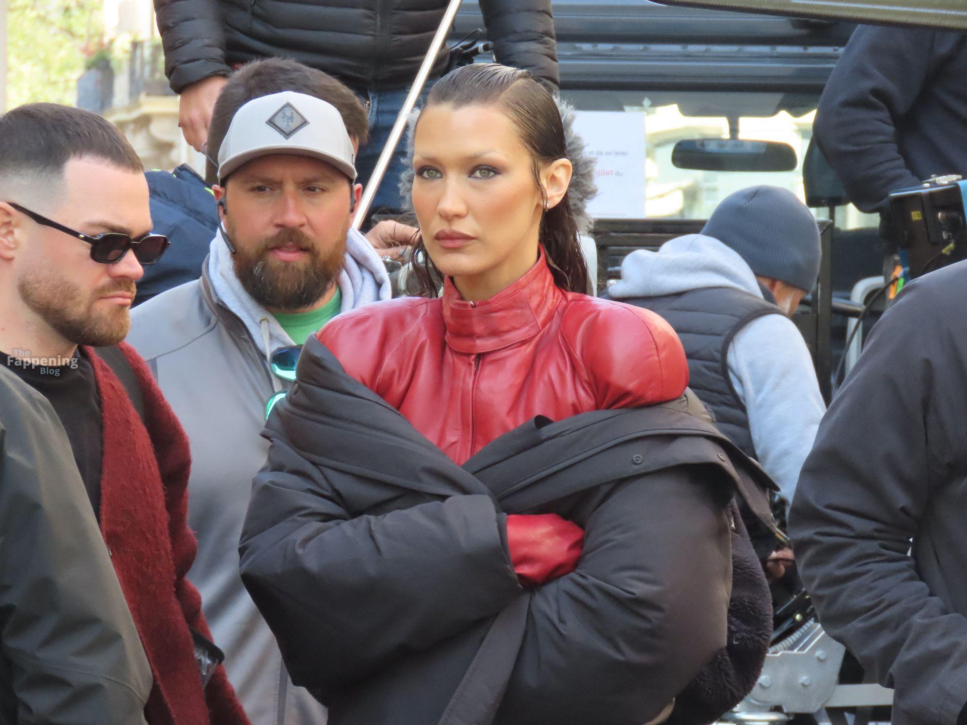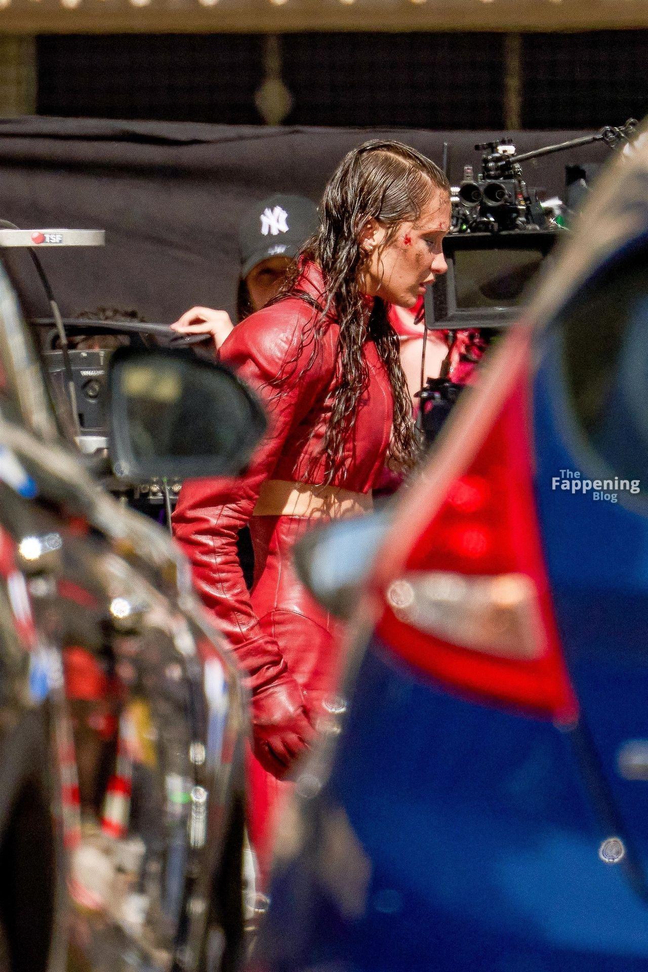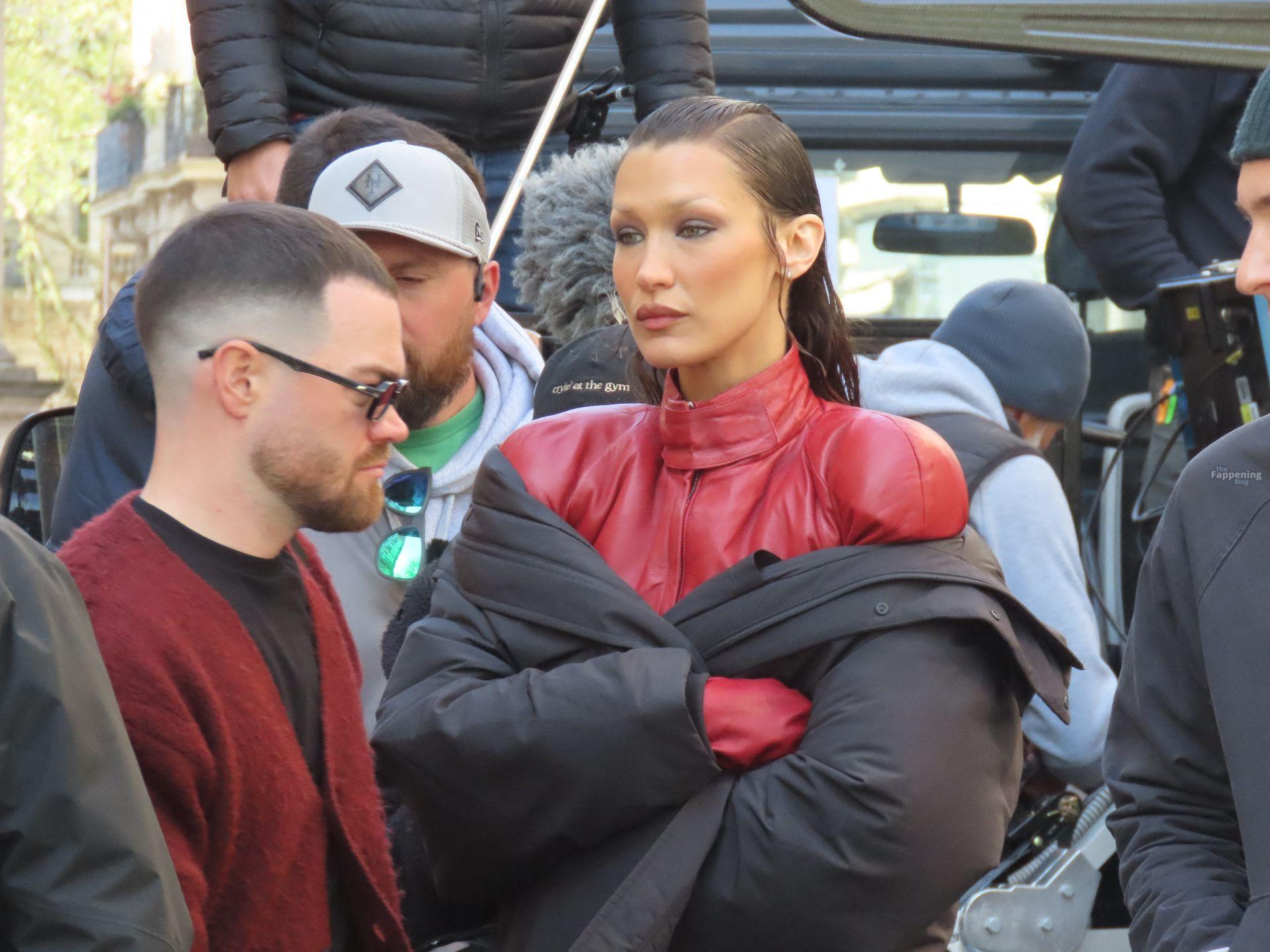 Белла Хадид запечатлена в Париже в огненно-красном кожаном комбинезоне, оседлав мотоцикл. После того дикого трюка с манекеном и аварии, она играет крутую девушку с серьёзной травмой ноги для сцены в сериале «Красота» в Париже, Франция.