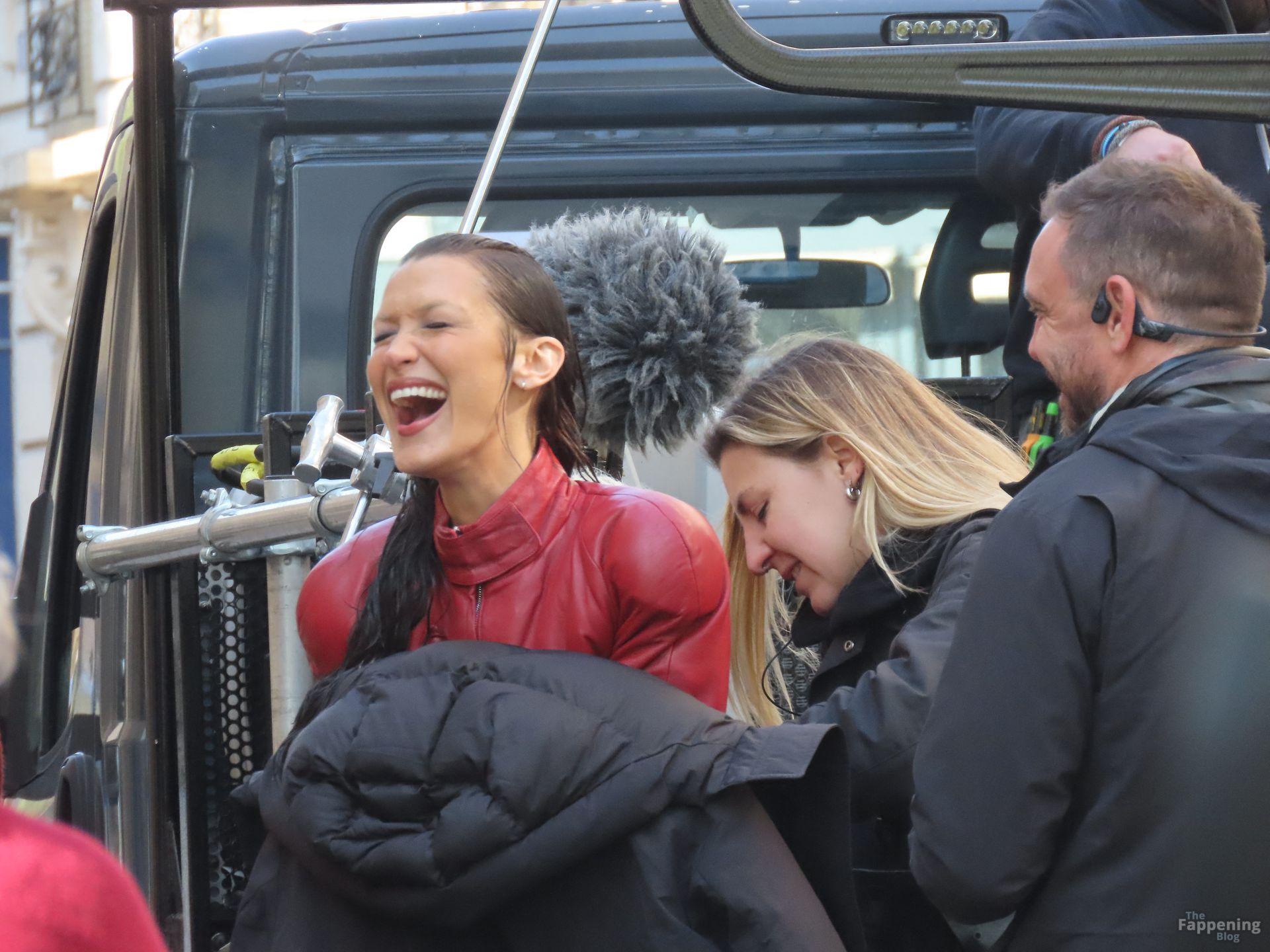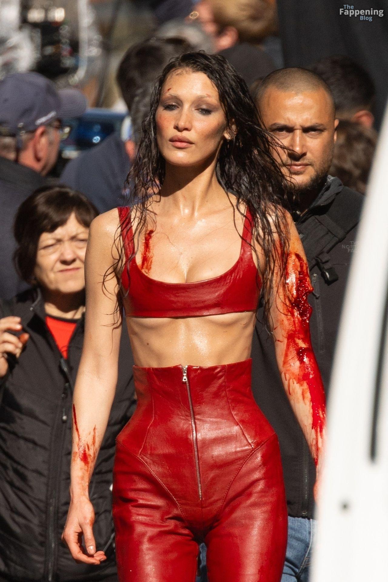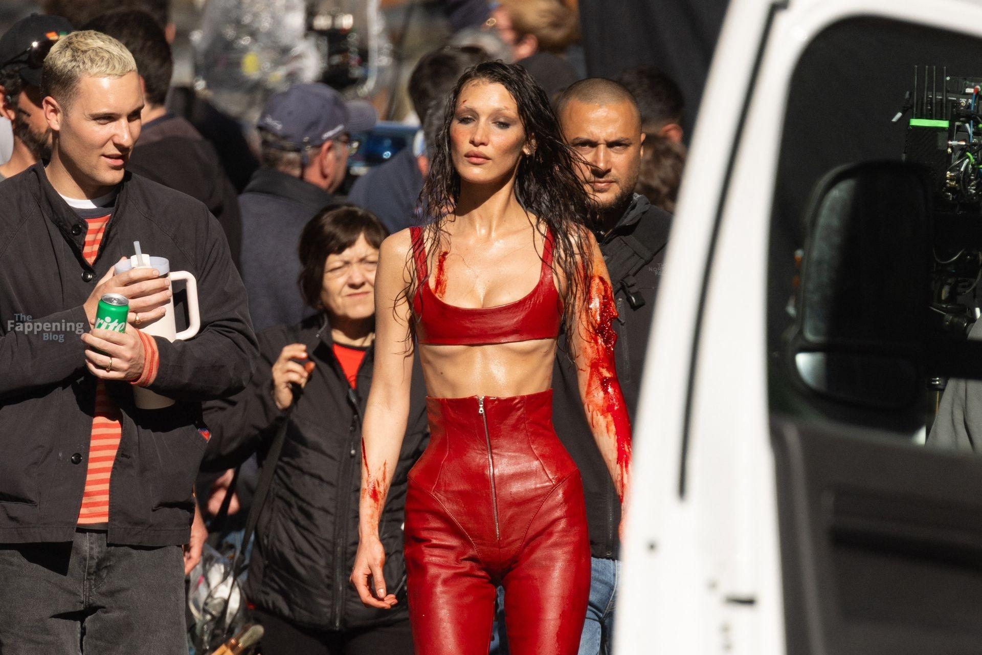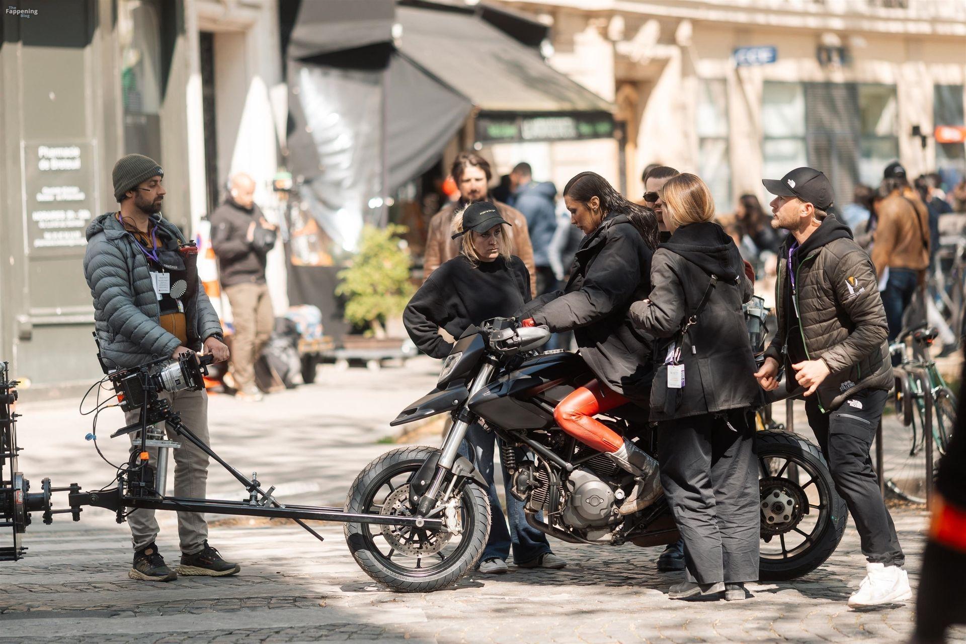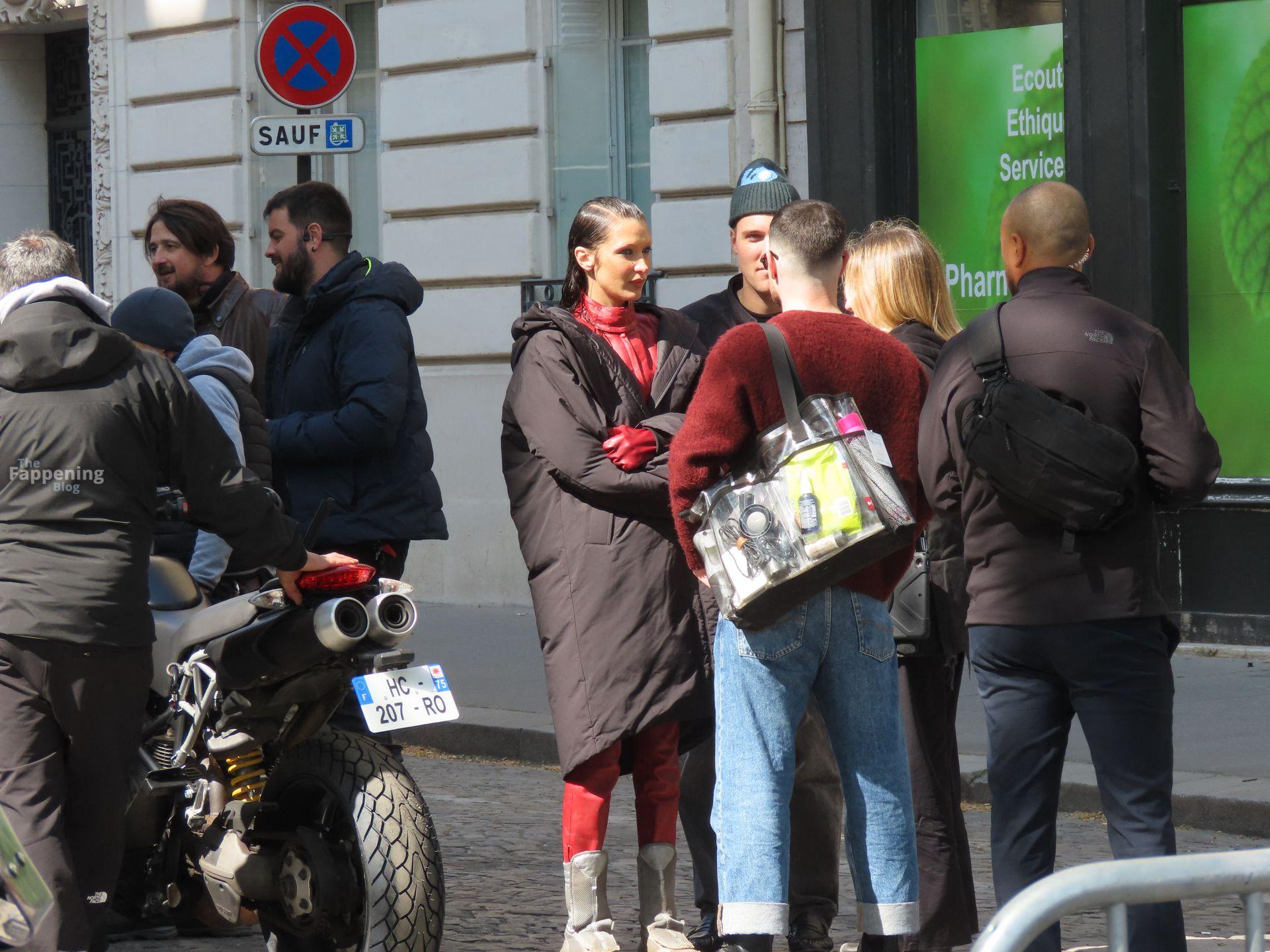 Белла Хадид запечатлена в Париже в огненно-красном кожаном комбинезоне, оседлав мотоцикл. После того дикого трюка с манекеном и аварии, она играет крутую девушку с серьёзной травмой ноги для сцены в сериале «Красота» в Париже, Франция.