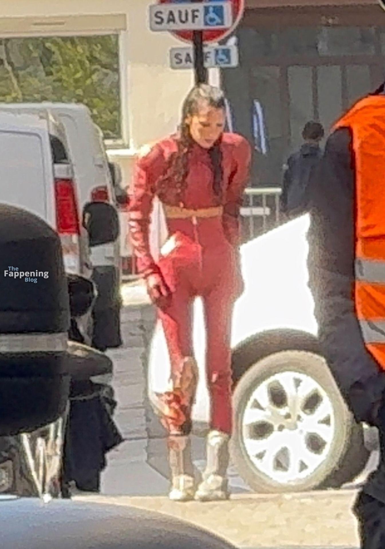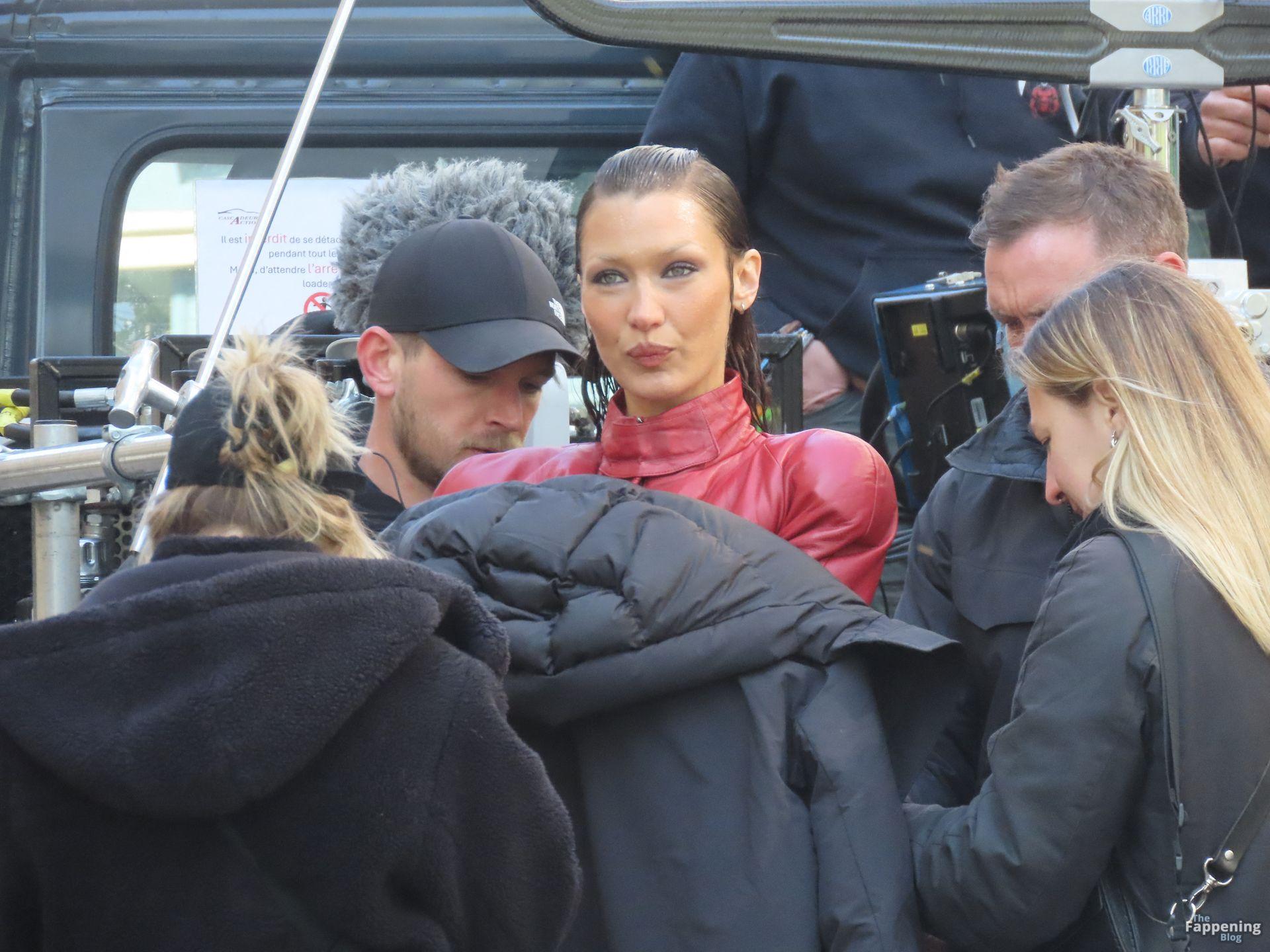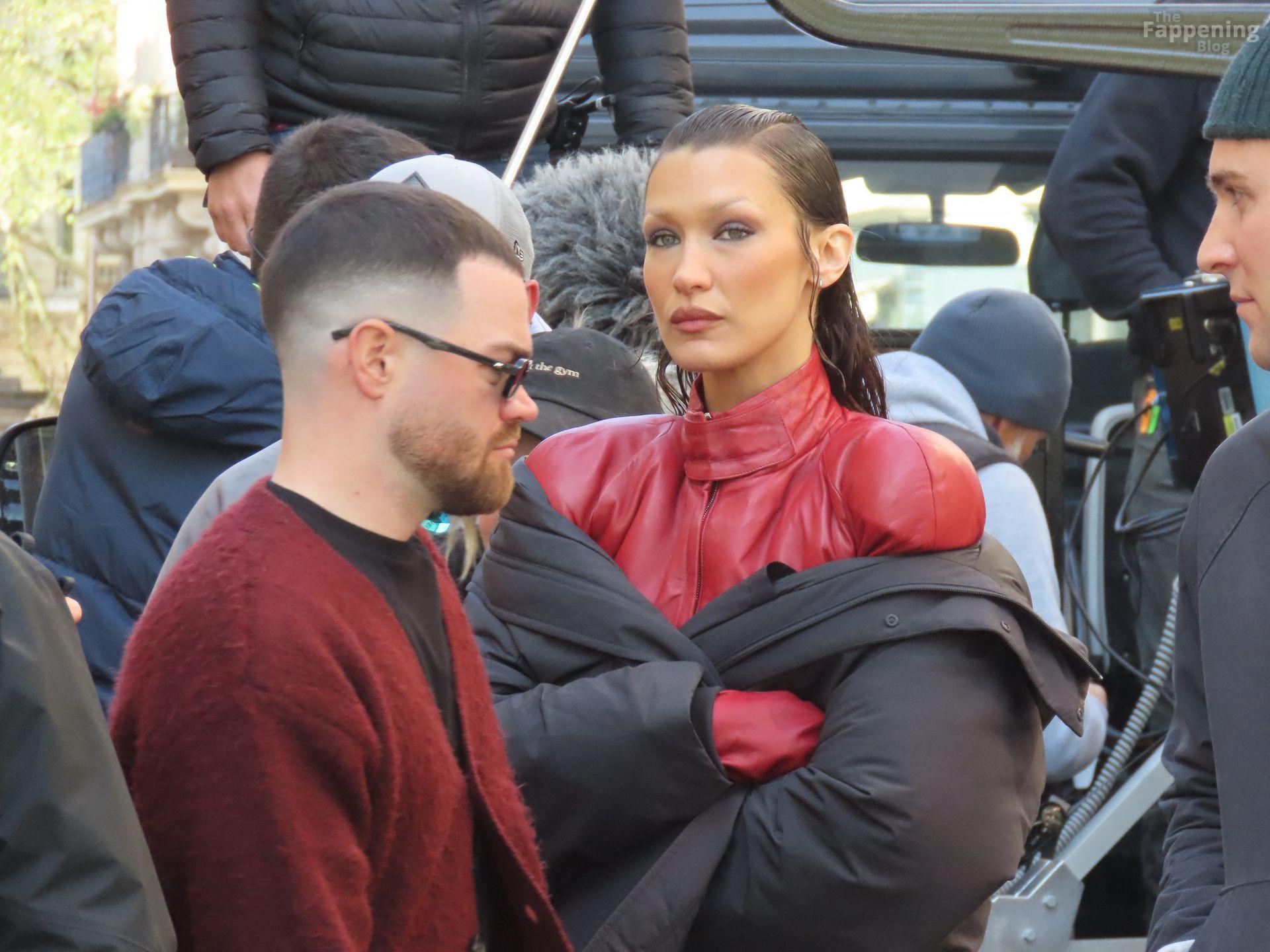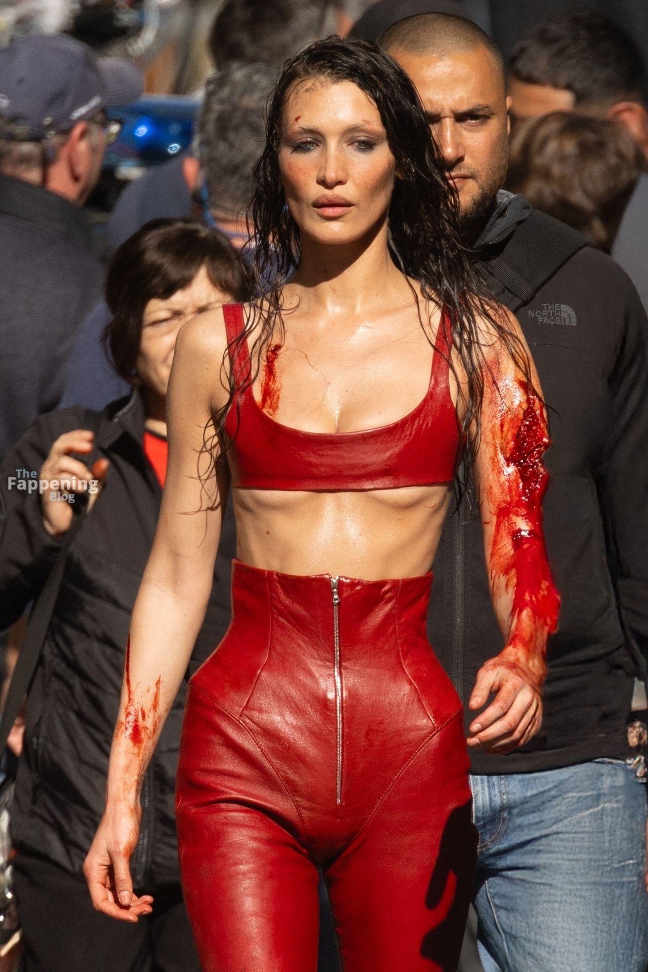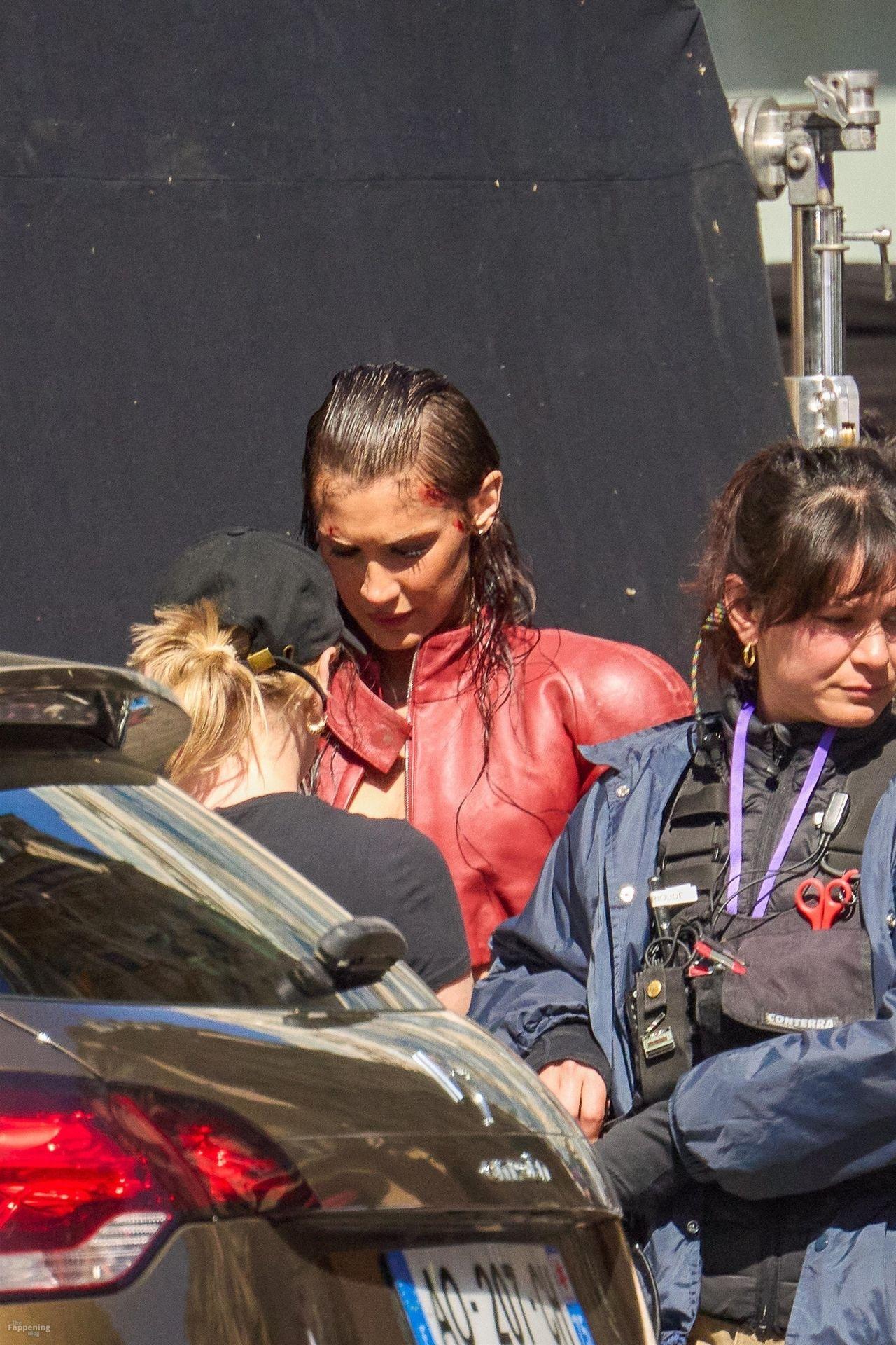 Белла Хадид запечатлена в Париже в огненно-красном кожаном комбинезоне, оседлав мотоцикл. После того дикого трюка с манекеном и аварии, она играет крутую девушку с серьёзной травмой ноги для сцены в сериале «Красота» в Париже, Франция.