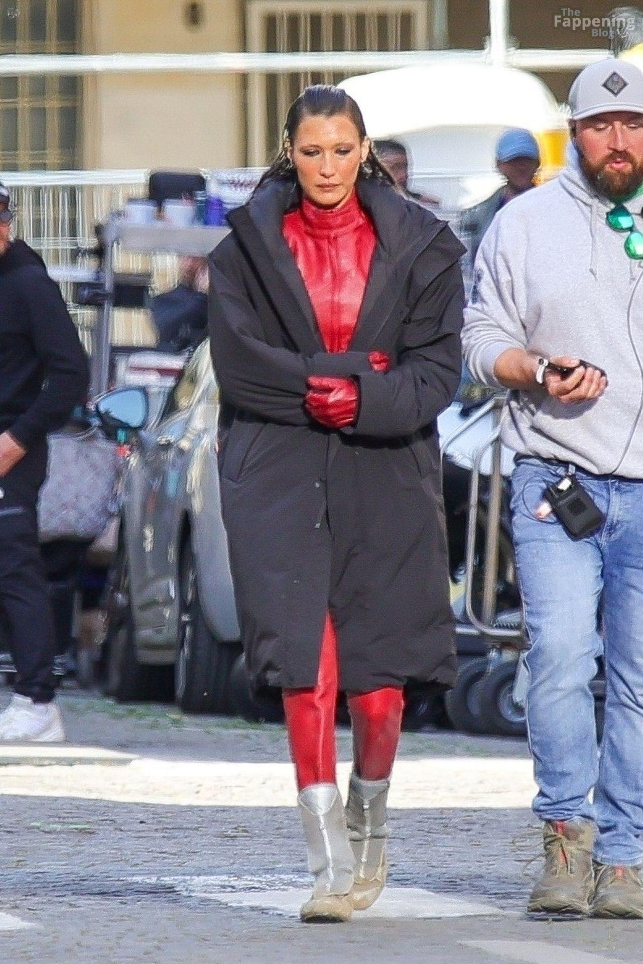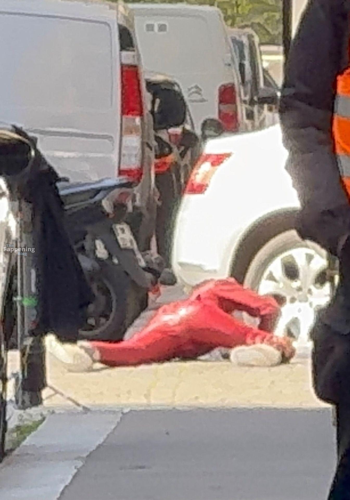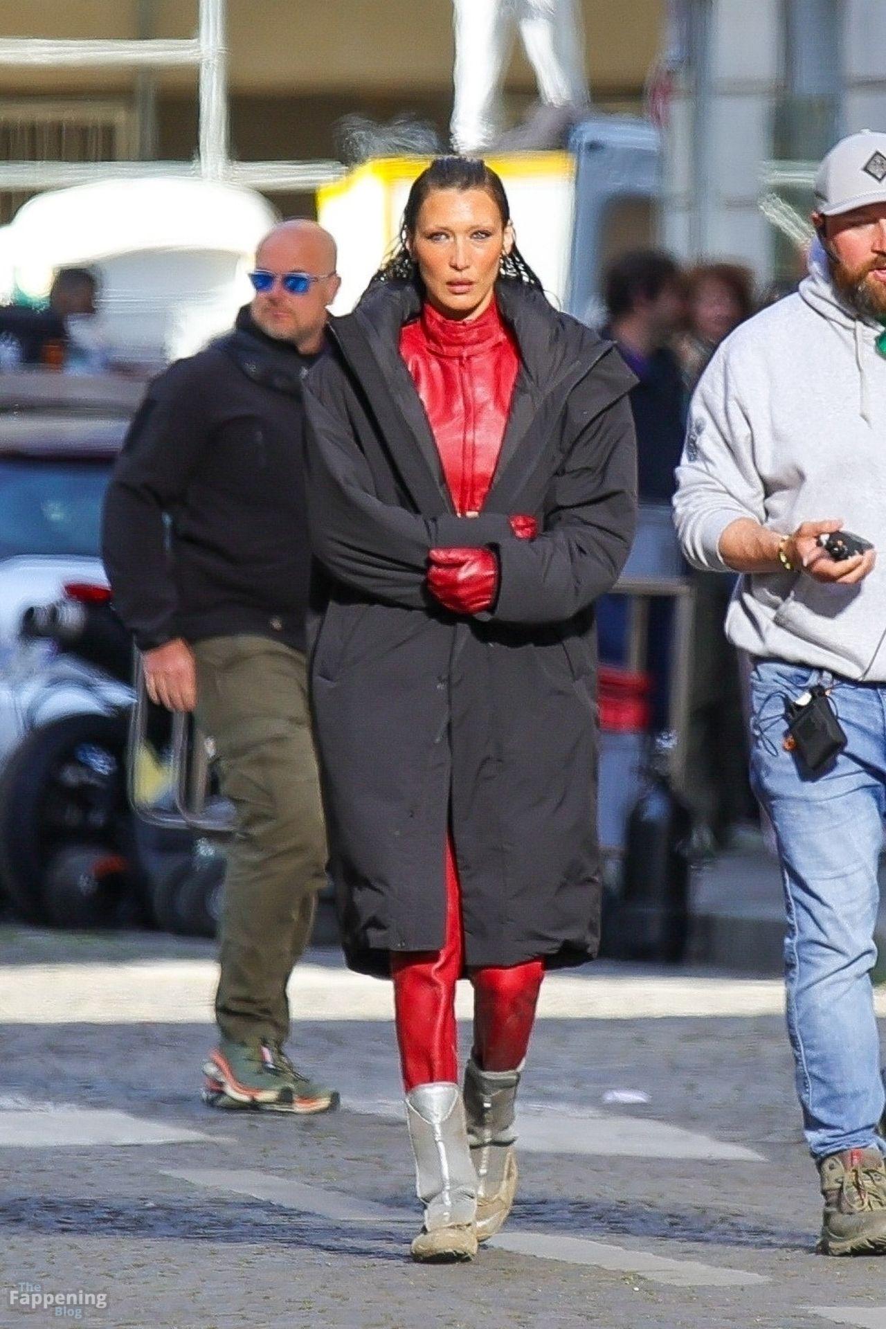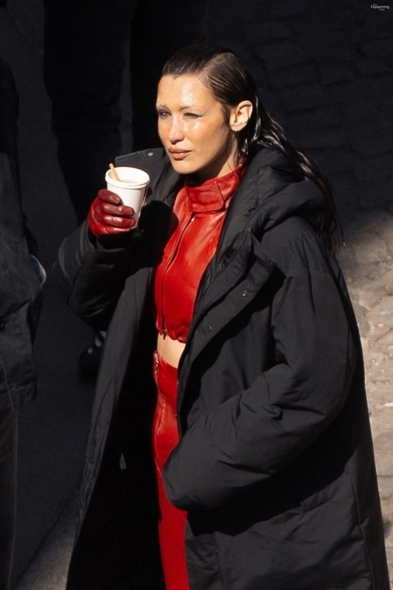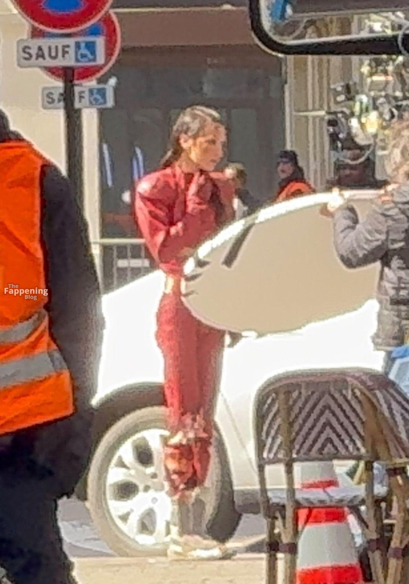 Белла Хадид запечатлена в Париже в огненно-красном кожаном комбинезоне, оседлав мотоцикл. После того дикого трюка с манекеном и аварии, она играет крутую девушку с серьёзной травмой ноги для сцены в сериале «Красота» в Париже, Франция.