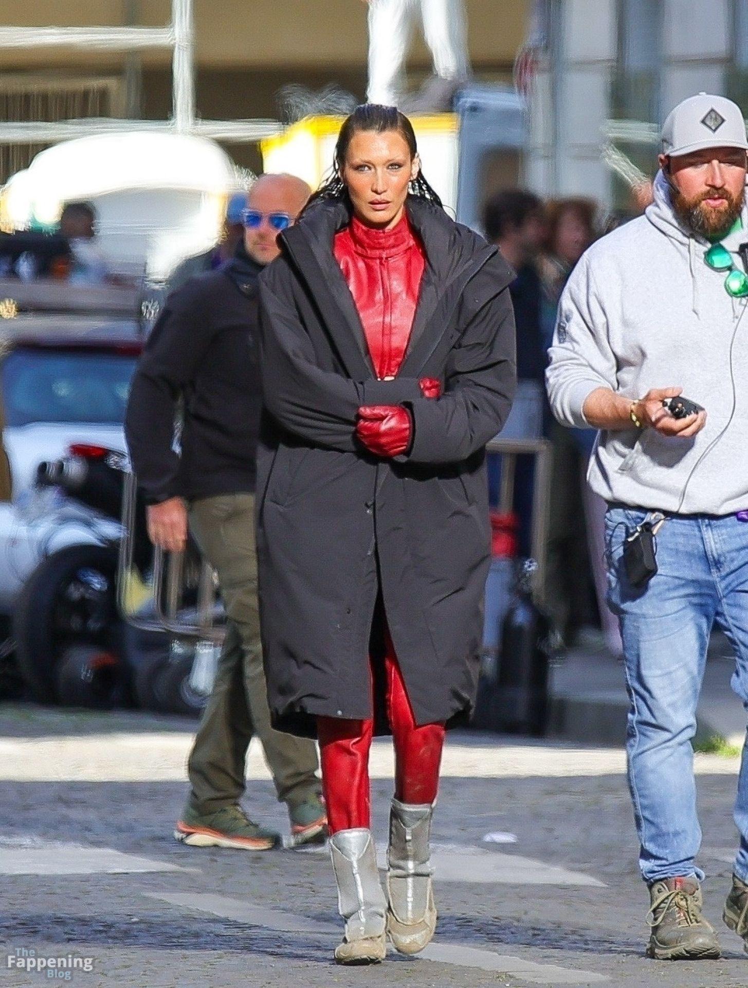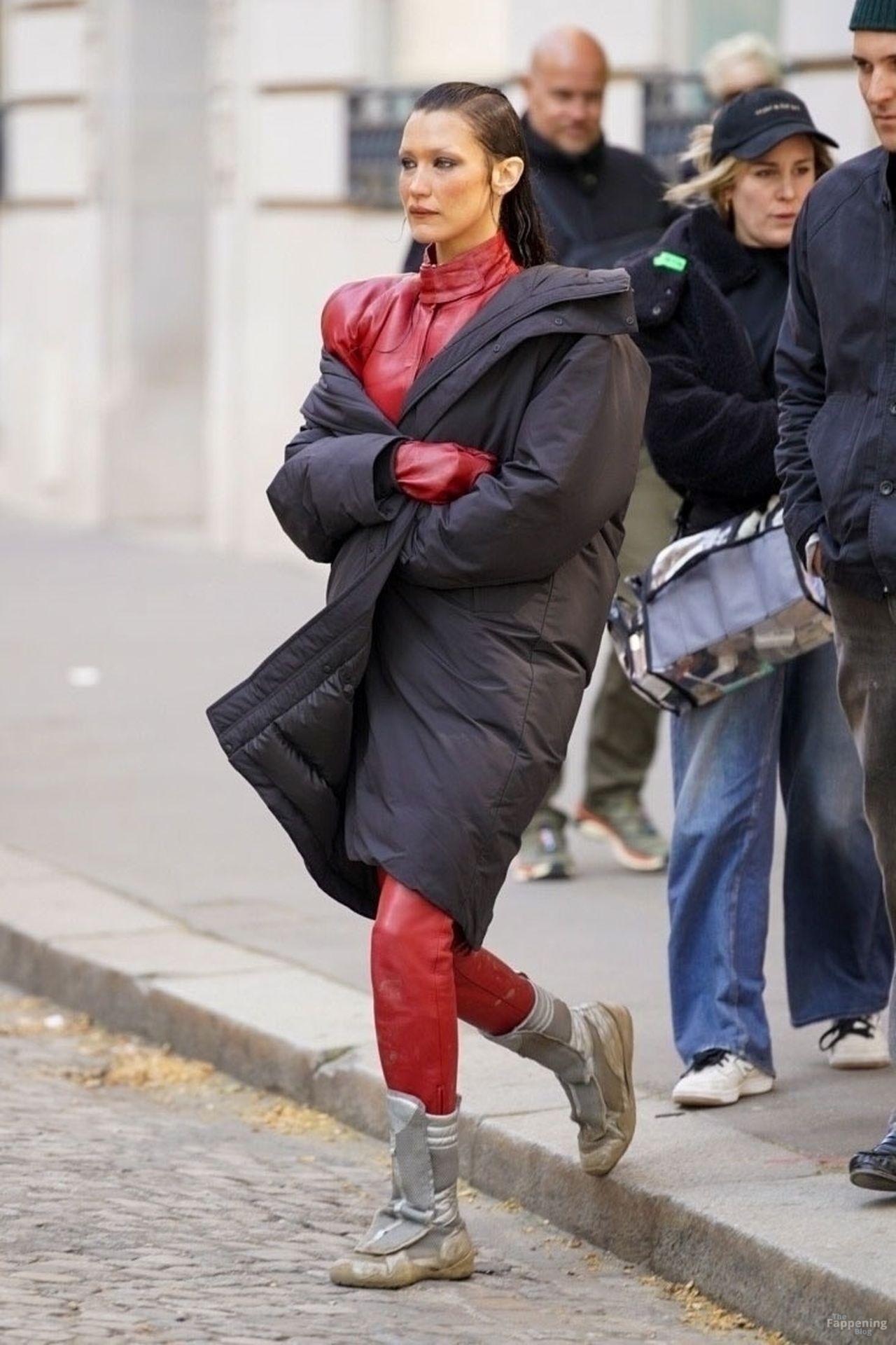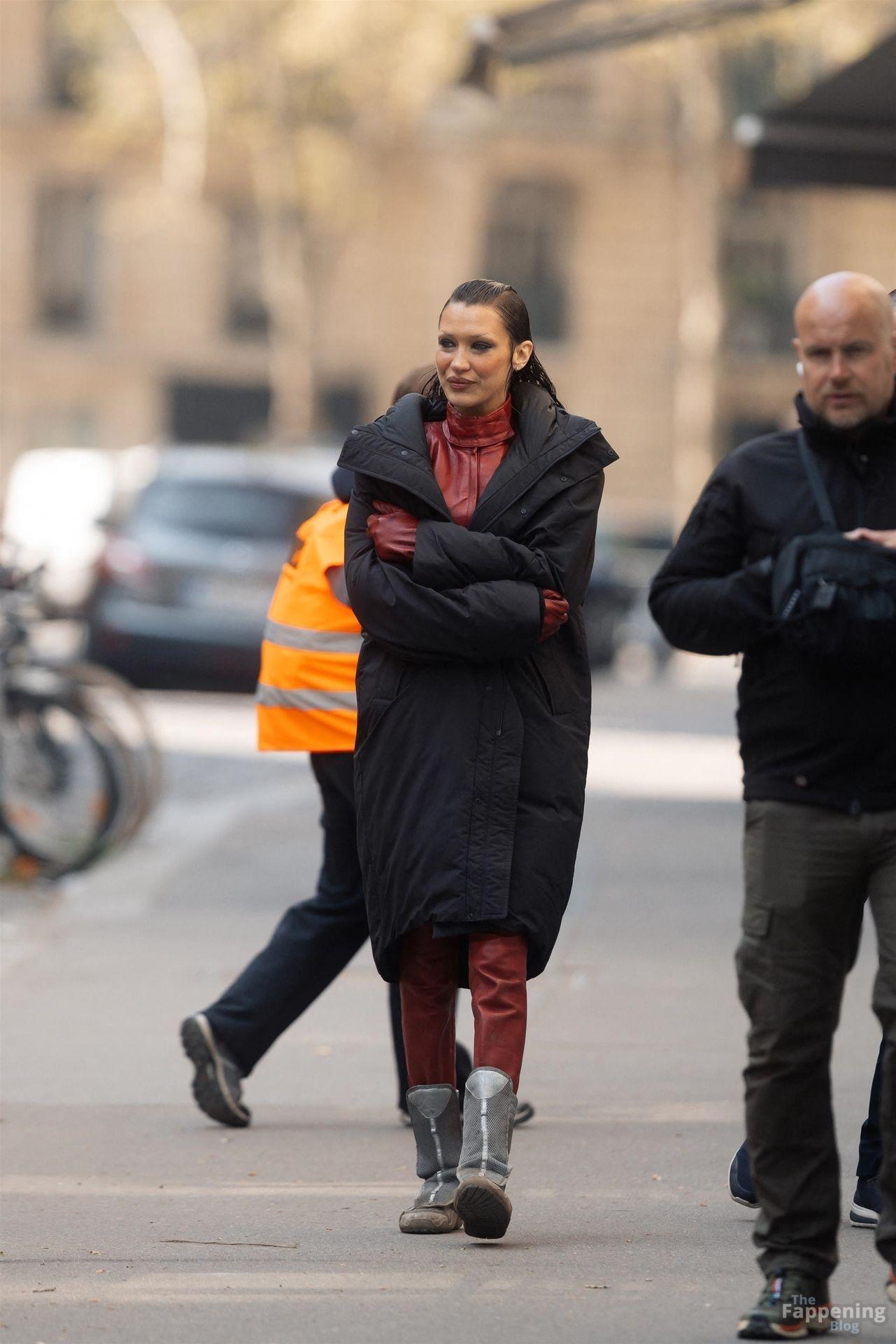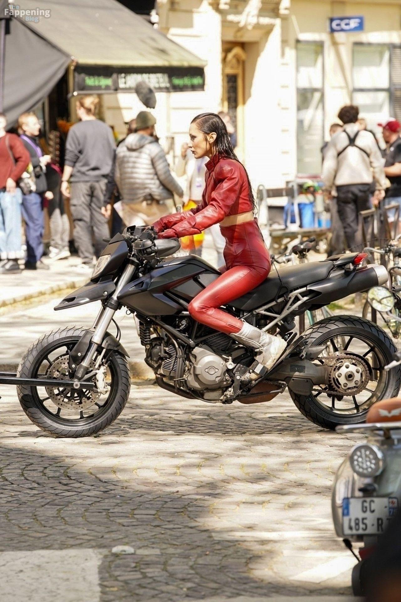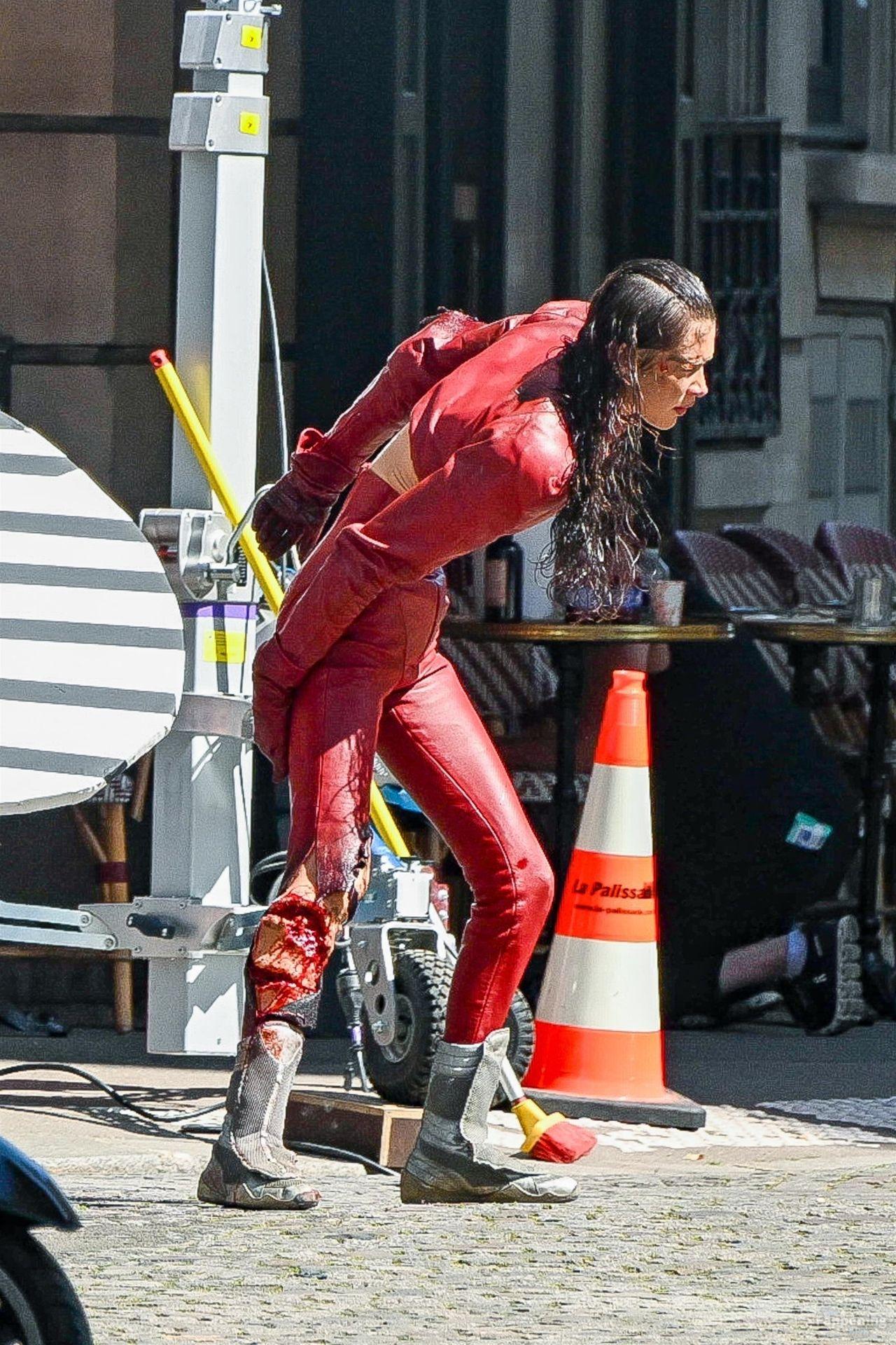Белла Хадид запечатлена в Париже в огненно-красном кожаном комбинезоне, оседлав мотоцикл. После того дикого трюка с манекеном и аварии, она играет крутую девушку с серьёзной травмой ноги для сцены в сериале «Красота» в Париже, Франция.