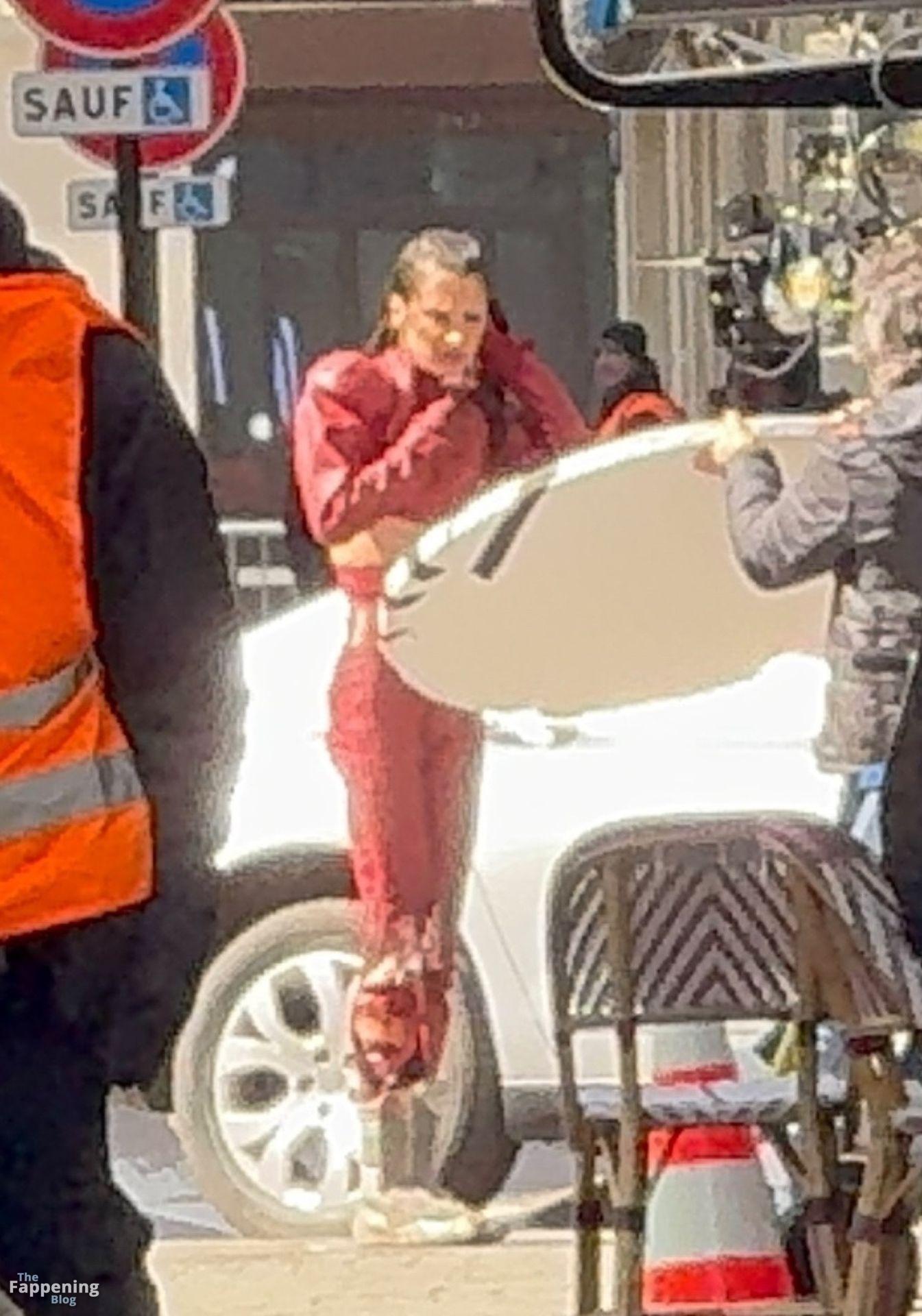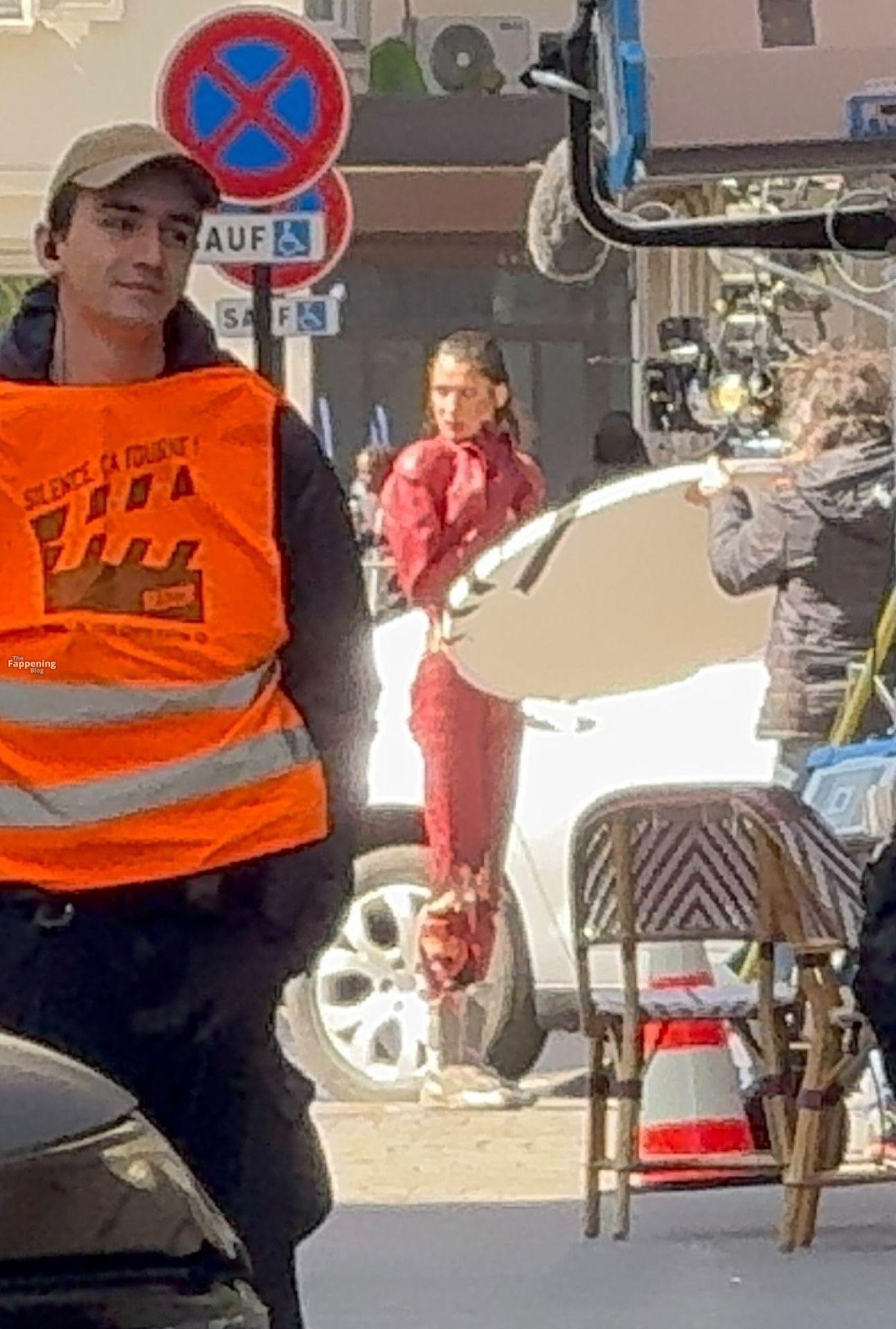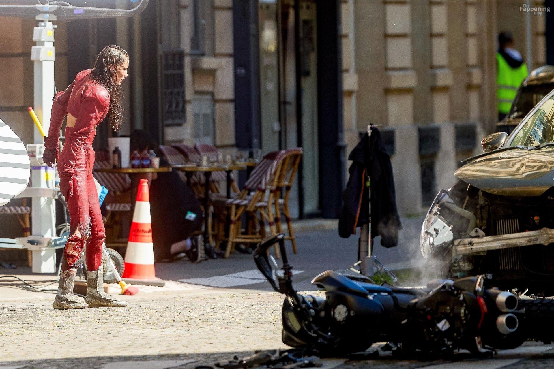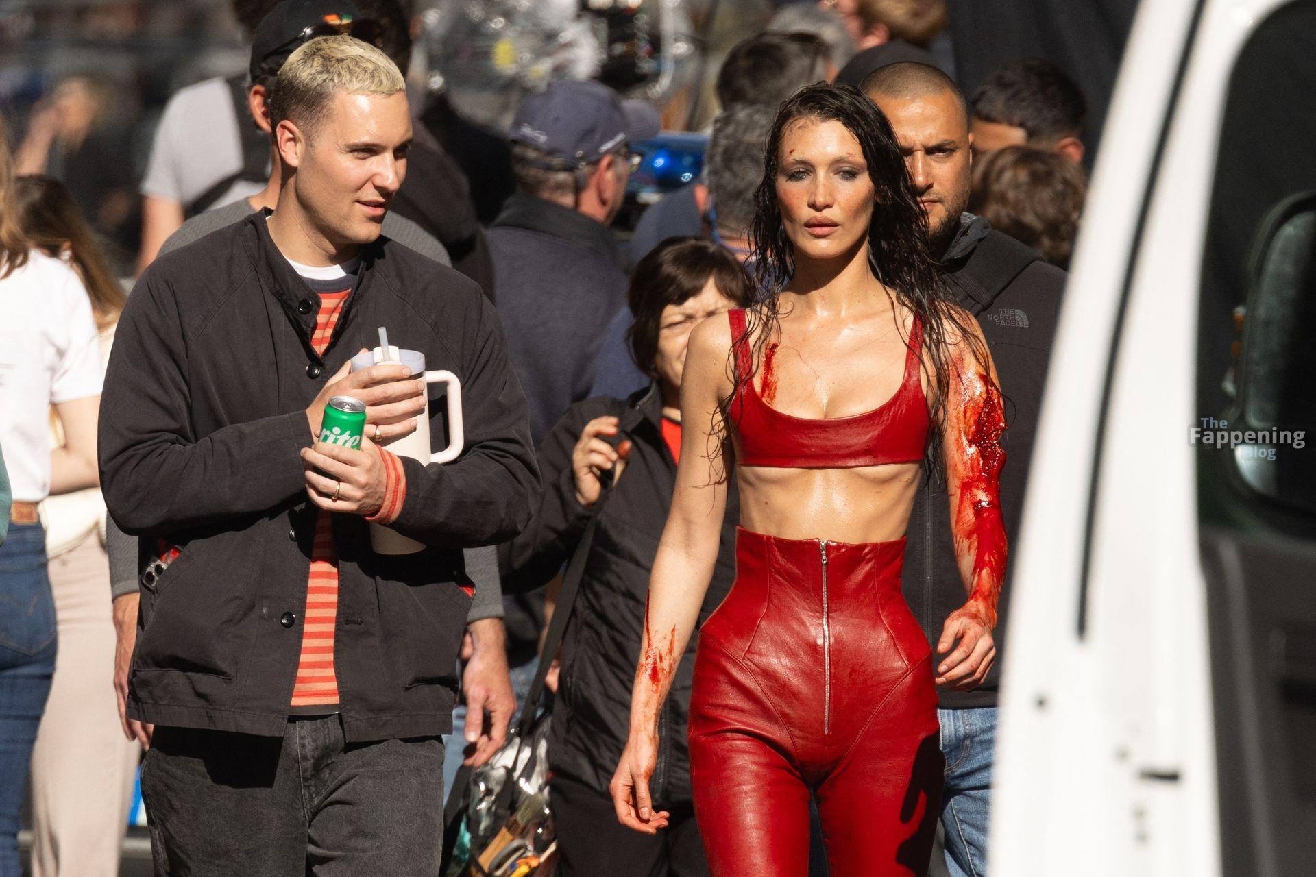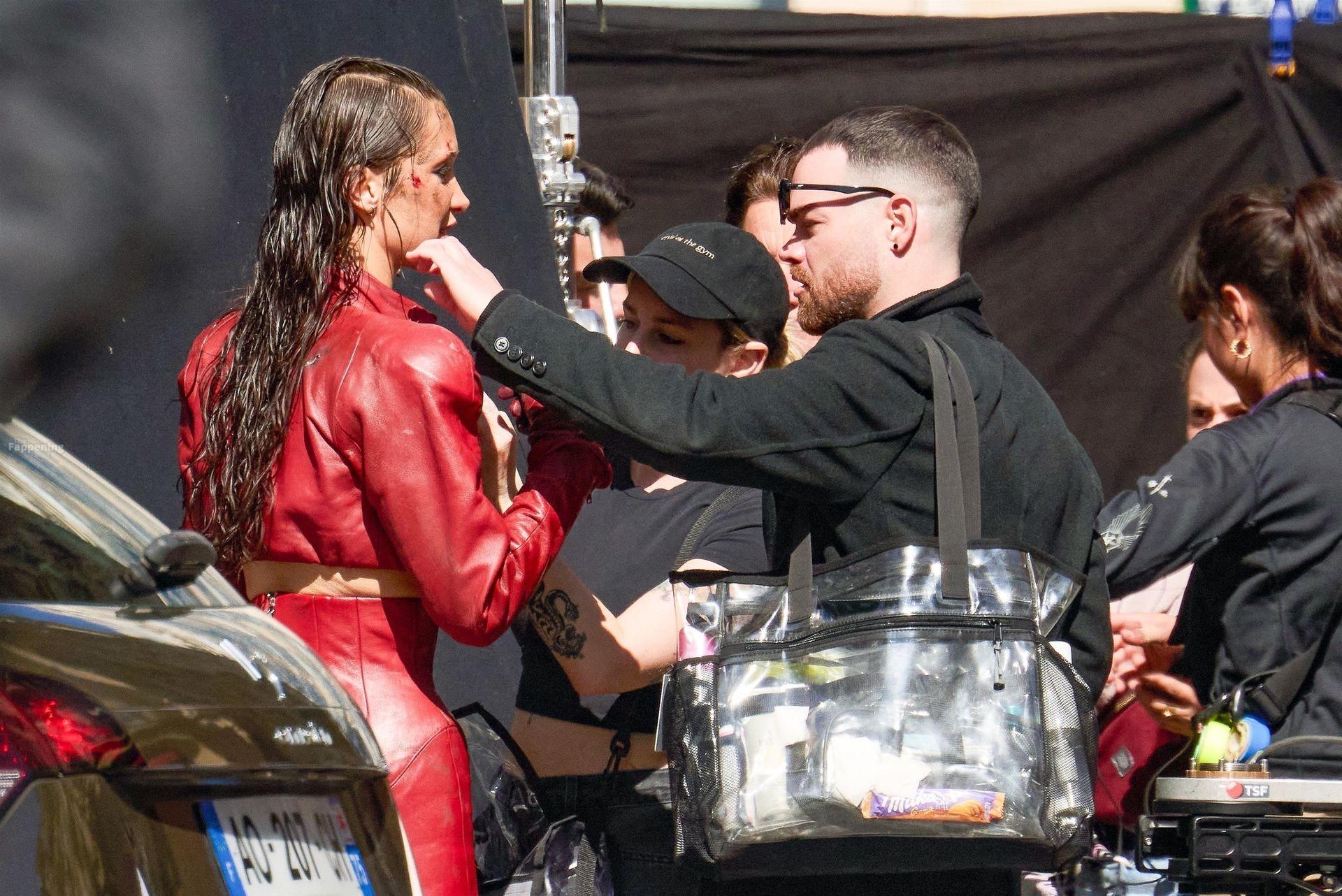 Белла Хадид запечатлена в Париже в огненно-красном кожаном комбинезоне, оседлав мотоцикл. После того дикого трюка с манекеном и аварии, она играет крутую девушку с серьёзной травмой ноги для сцены в сериале «Красота» в Париже, Франция.