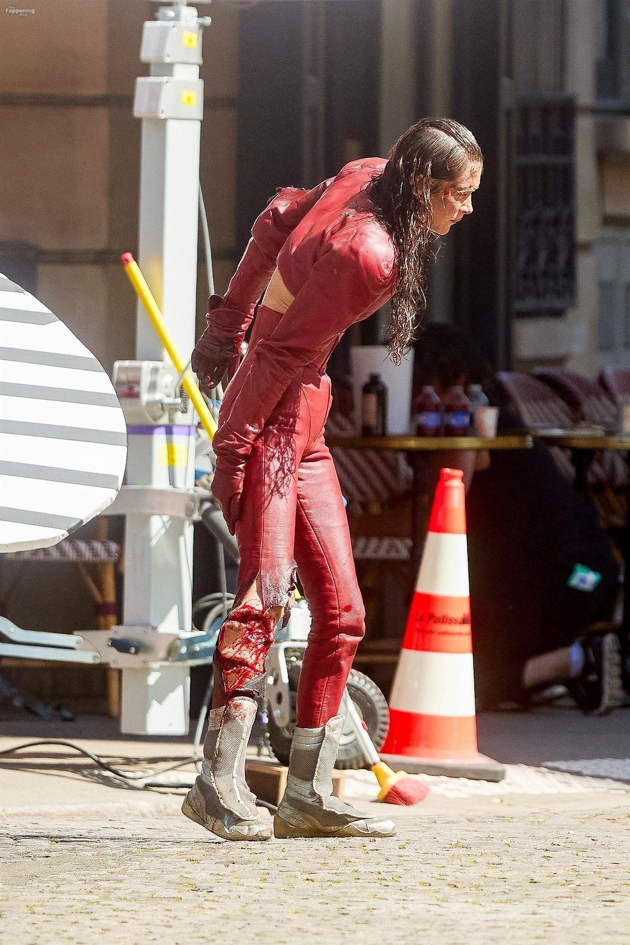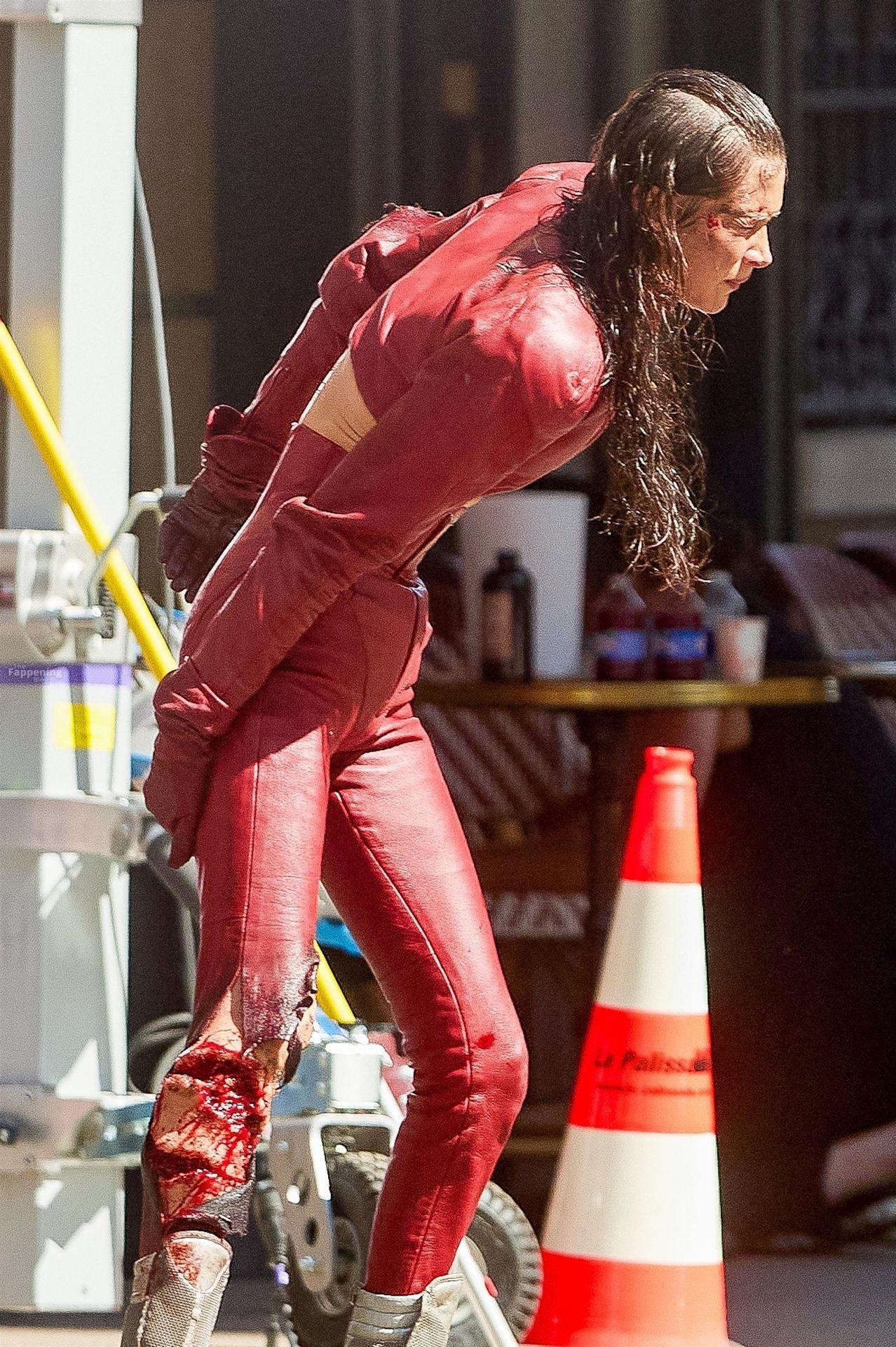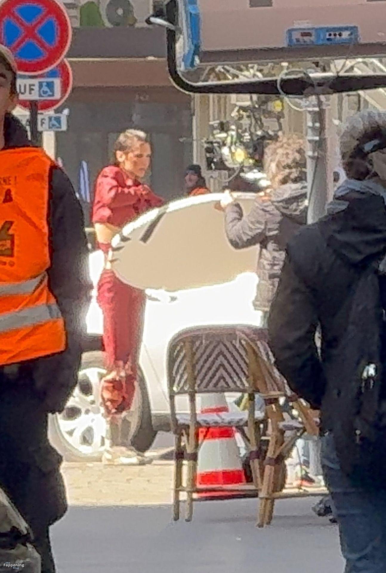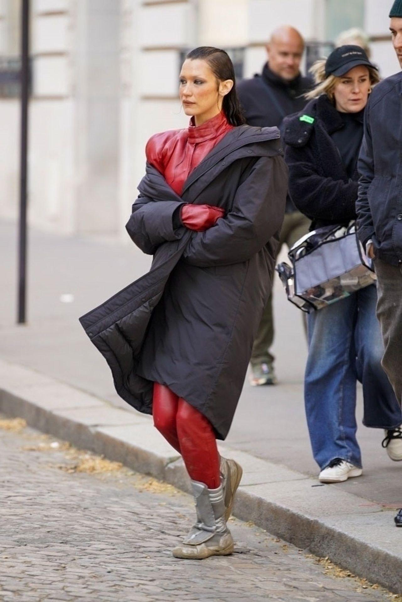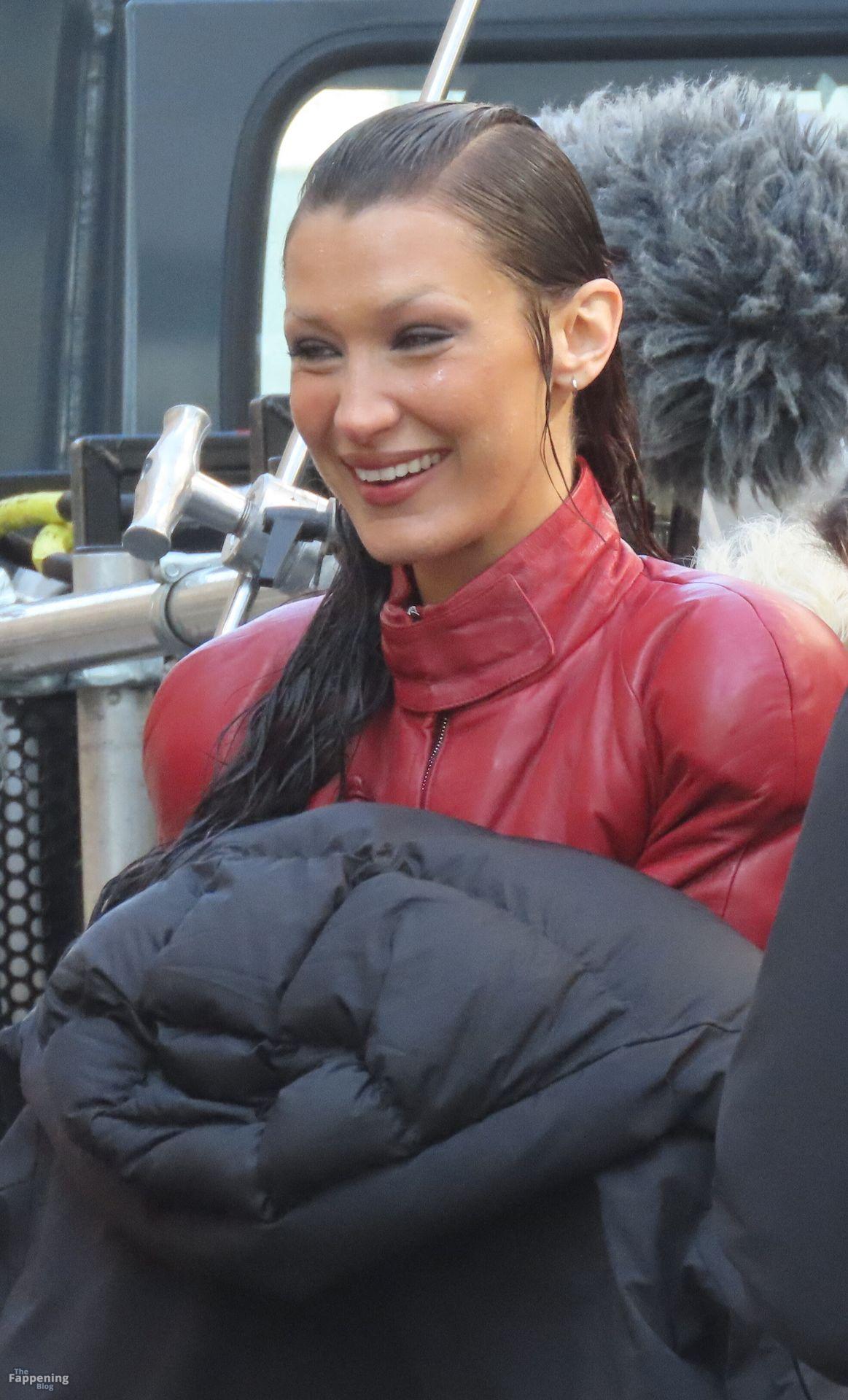 Белла Хадид запечатлена в Париже в огненно-красном кожаном комбинезоне, оседлав мотоцикл. После того дикого трюка с манекеном и аварии, она играет крутую девушку с серьёзной травмой ноги для сцены в сериале «Красота» в Париже, Франция.