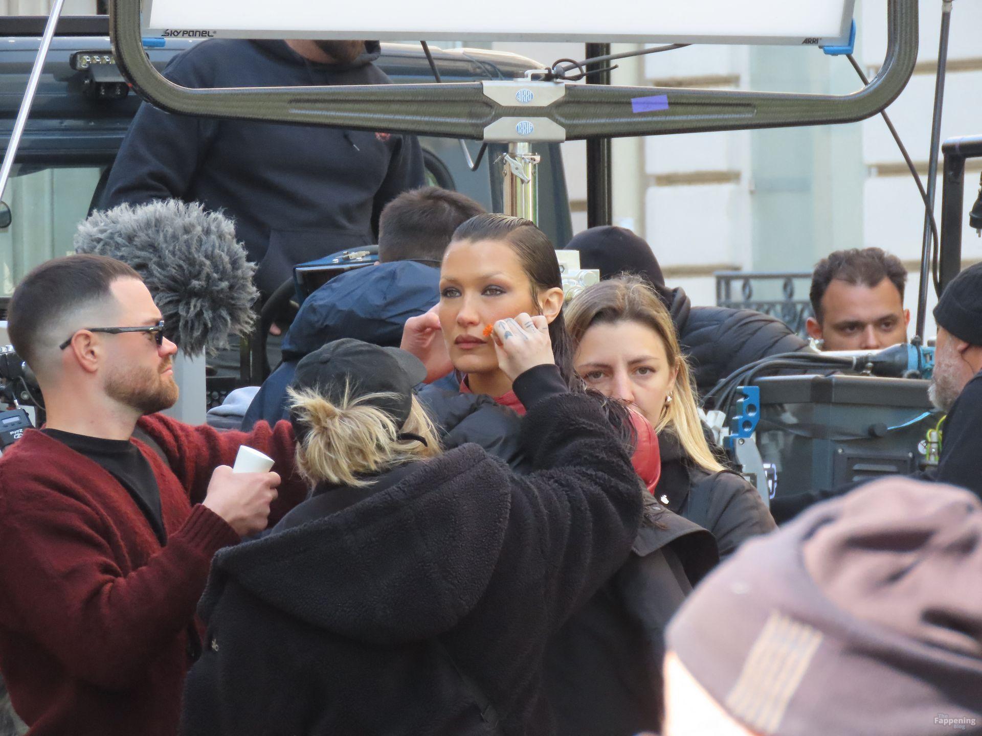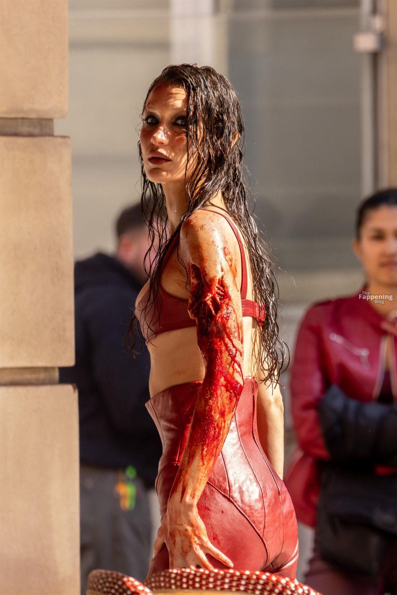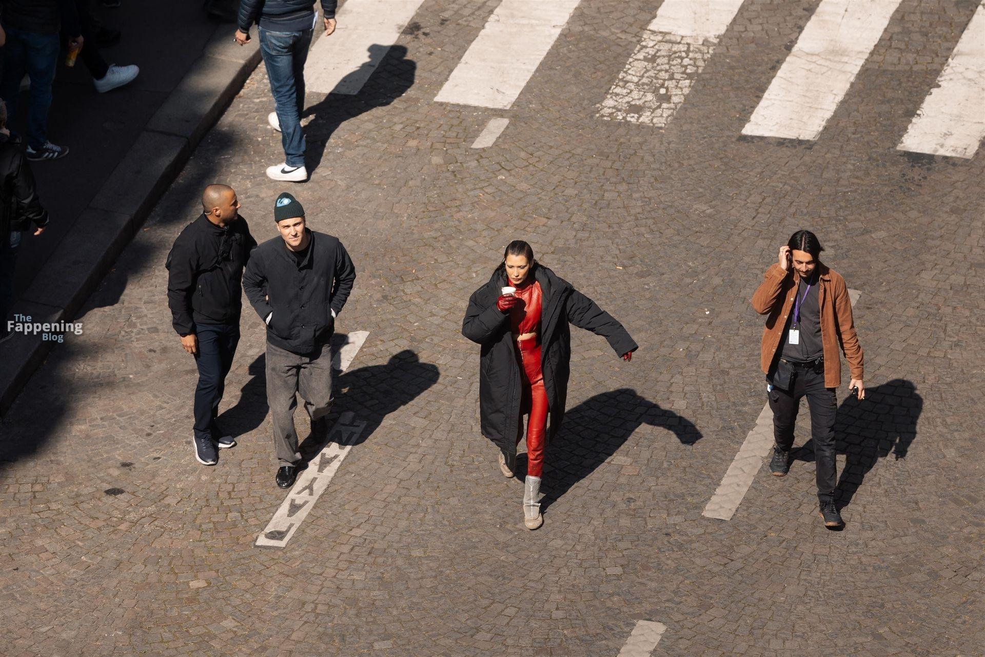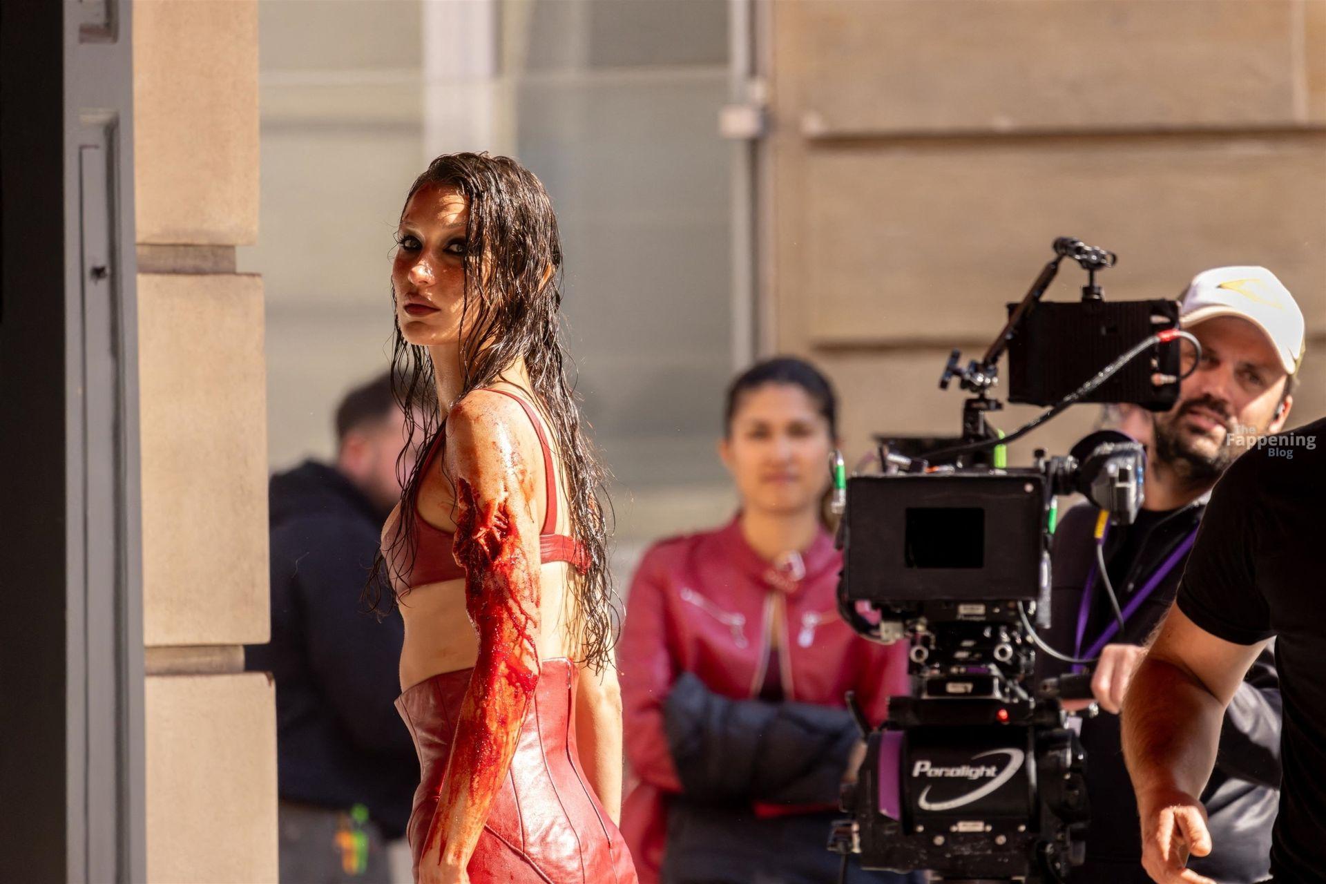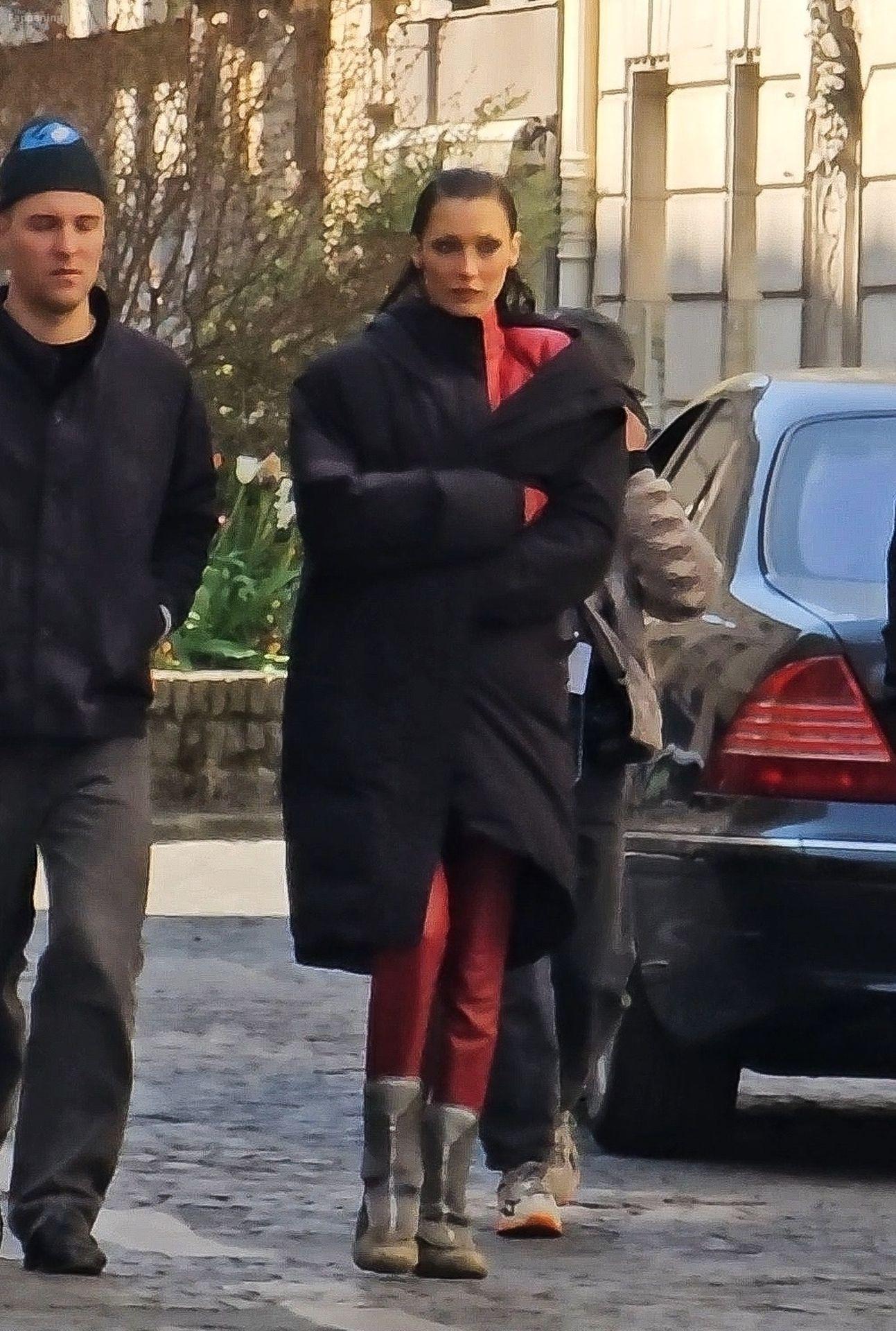 Белла Хадид запечатлена в Париже в огненно-красном кожаном комбинезоне, оседлав мотоцикл. После того дикого трюка с манекеном и аварии, она играет крутую девушку с серьёзной травмой ноги для сцены в сериале «Красота» в Париже, Франция.