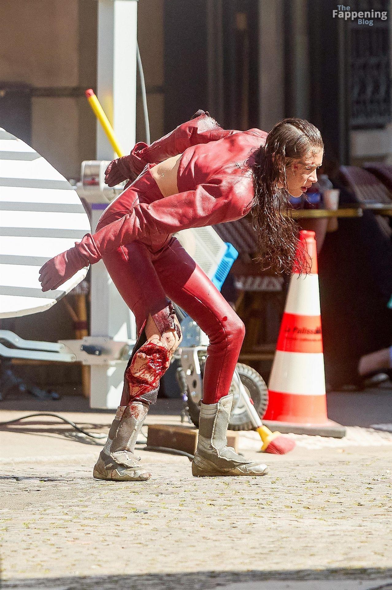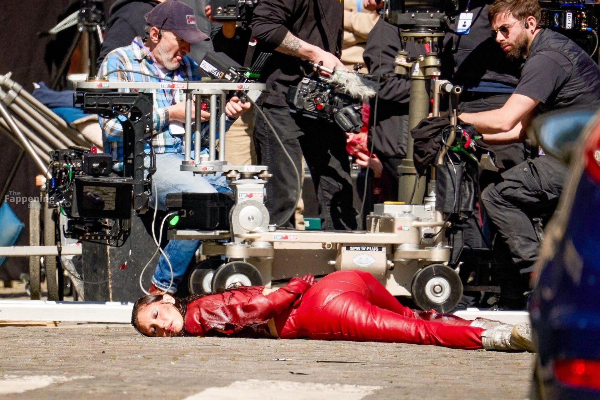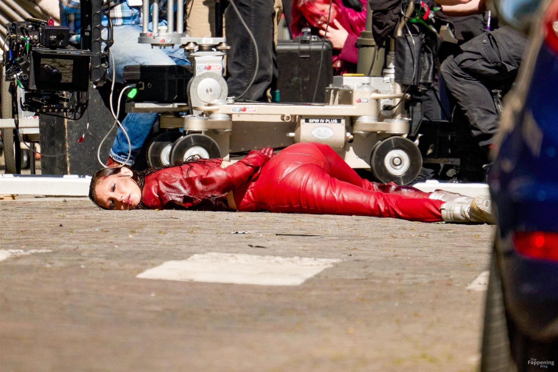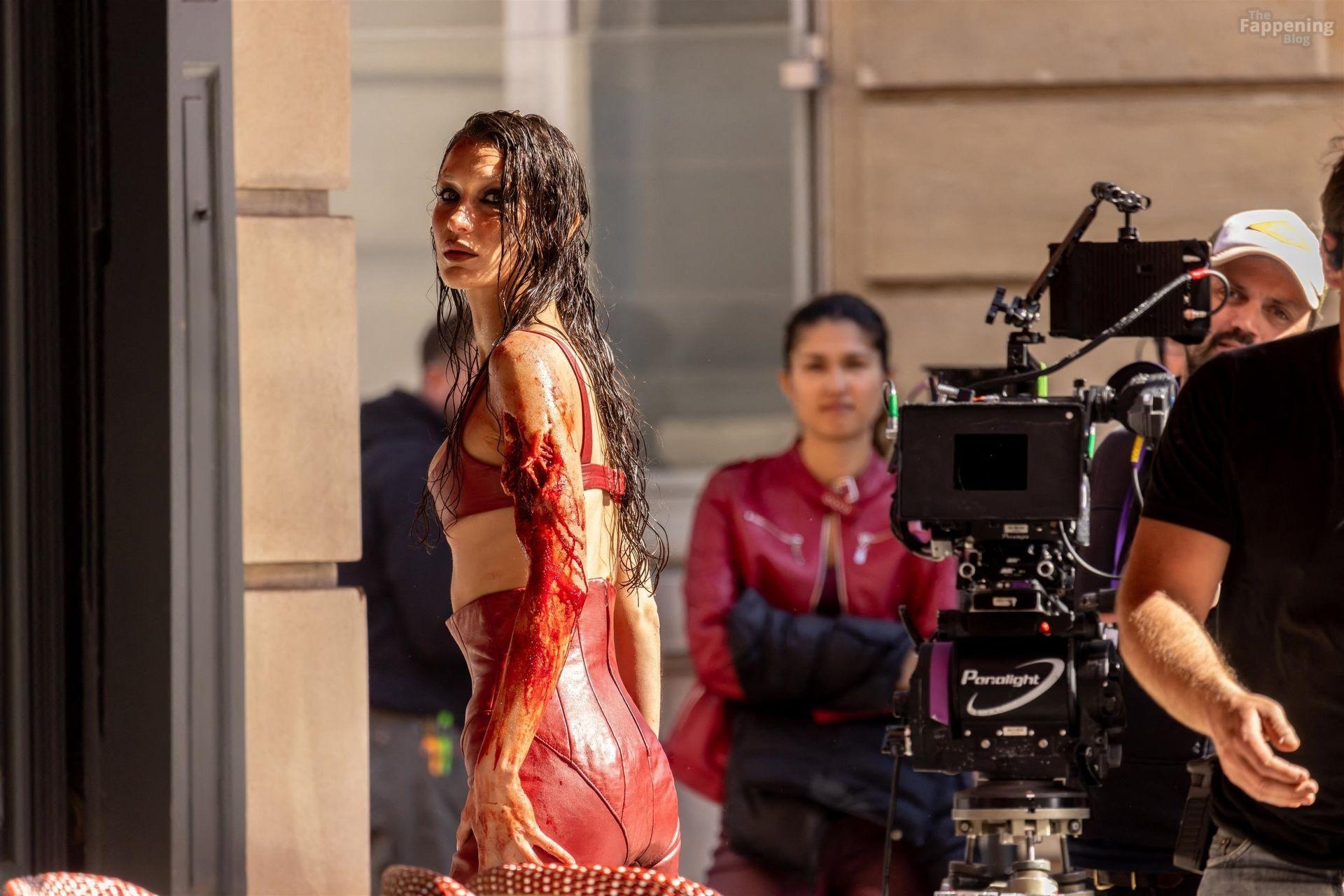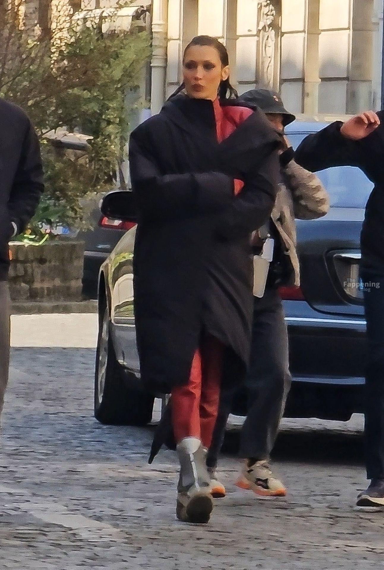 Белла Хадид запечатлена в Париже в огненно-красном кожаном комбинезоне, оседлав мотоцикл. После того дикого трюка с манекеном и аварии, она играет крутую девушку с серьёзной травмой ноги для сцены в сериале «Красота» в Париже, Франция.