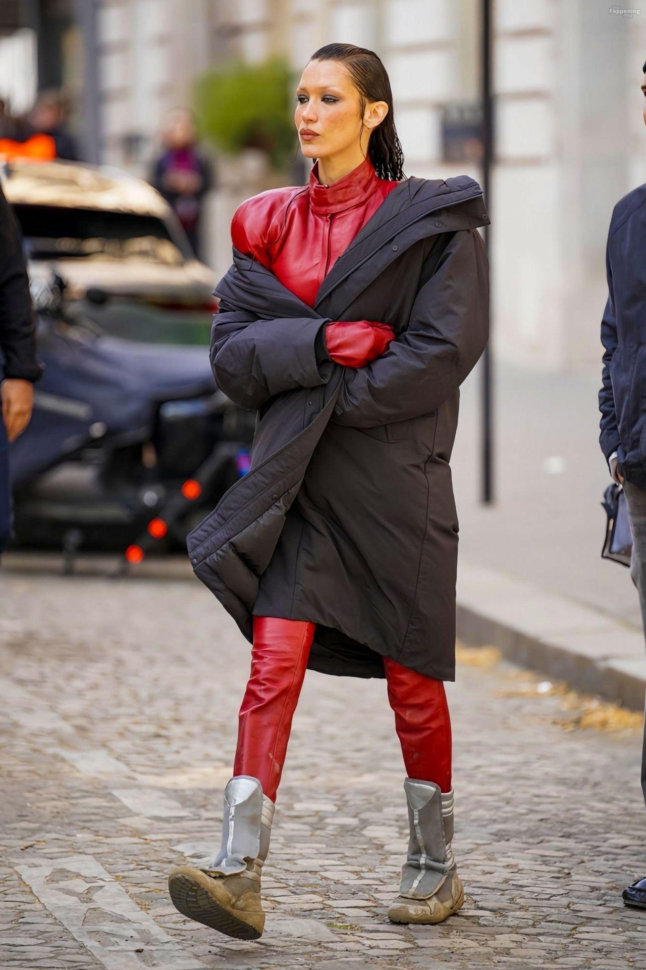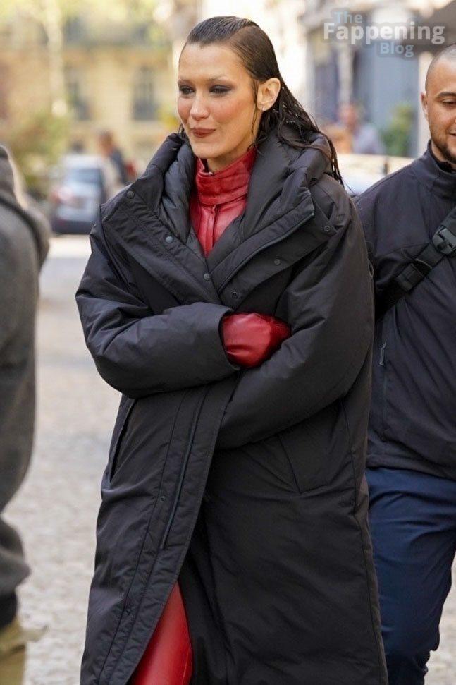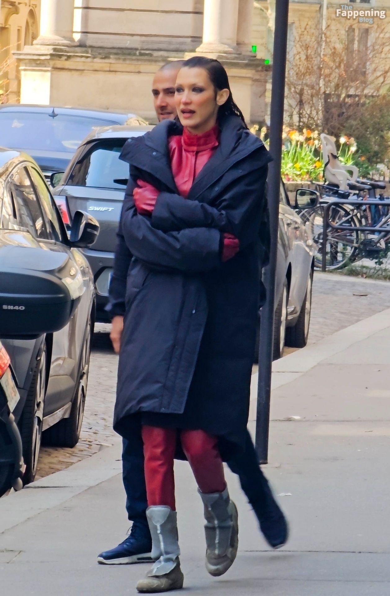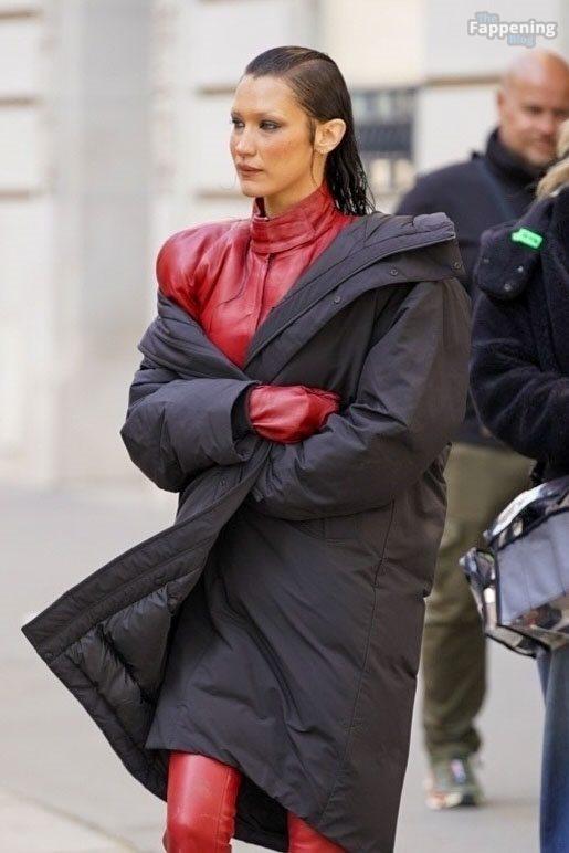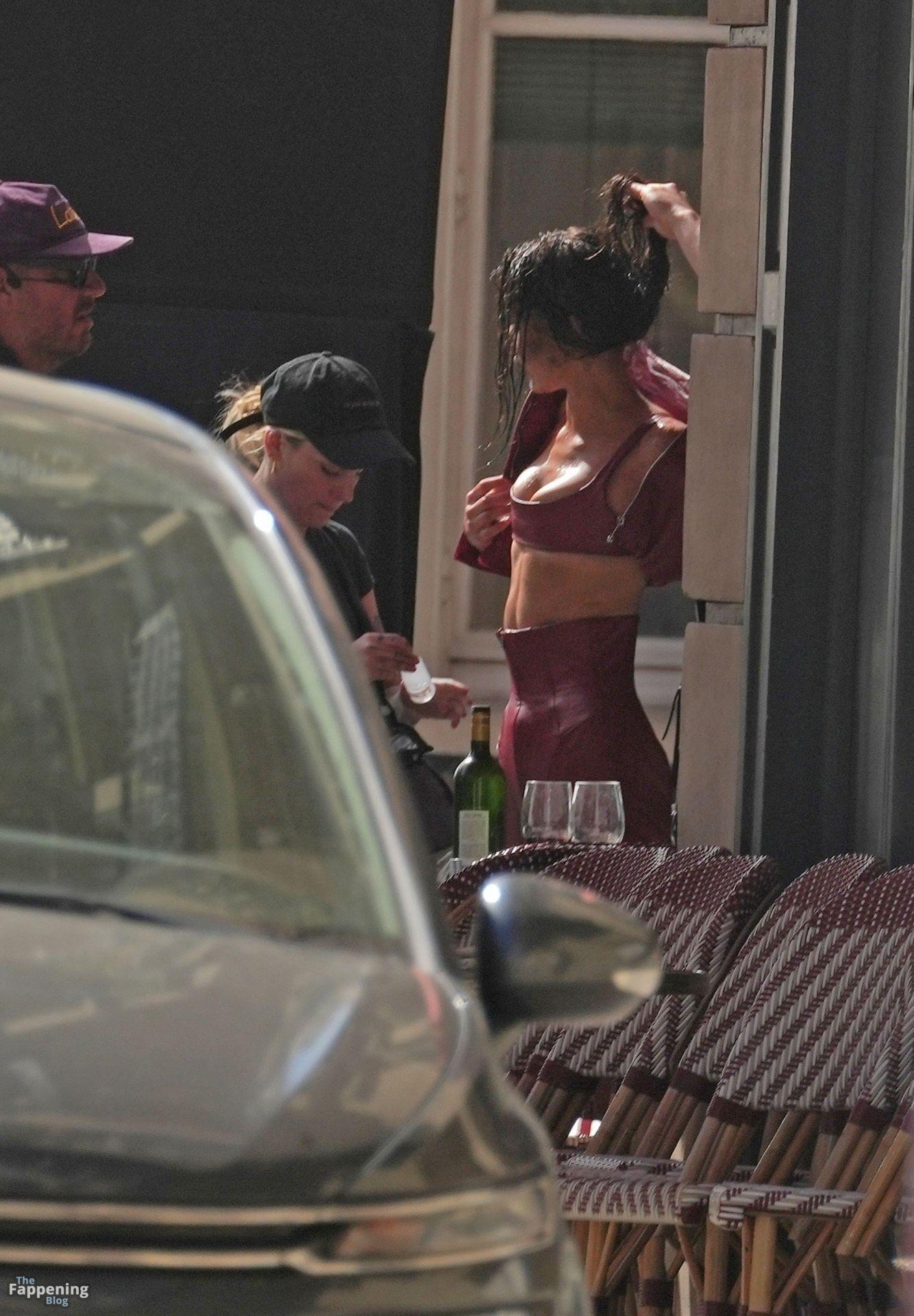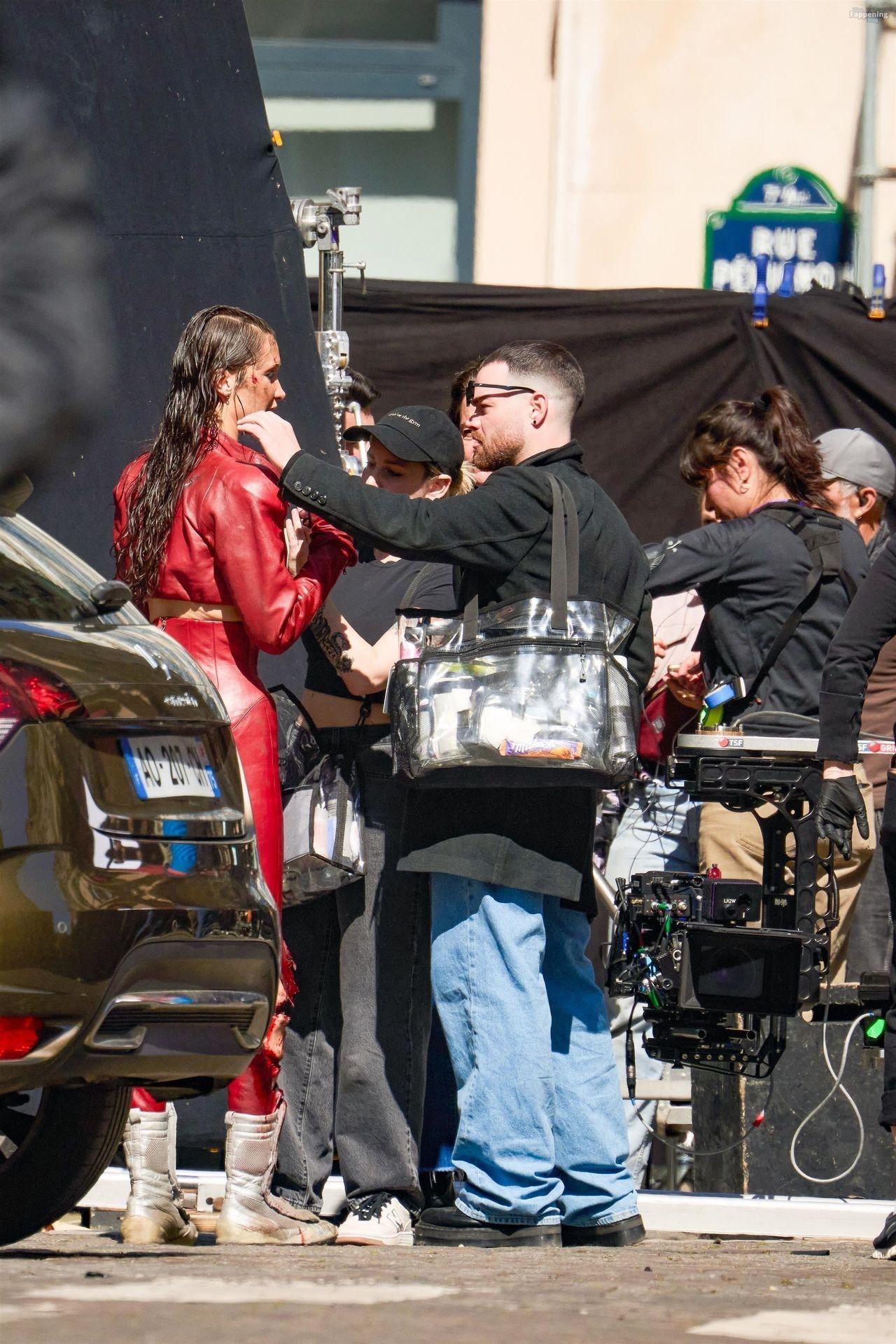 Белла Хадид запечатлена в Париже в огненно-красном кожаном комбинезоне, оседлав мотоцикл. После того дикого трюка с манекеном и аварии, она играет крутую девушку с серьёзной травмой ноги для сцены в сериале «Красота» в Париже, Франция.