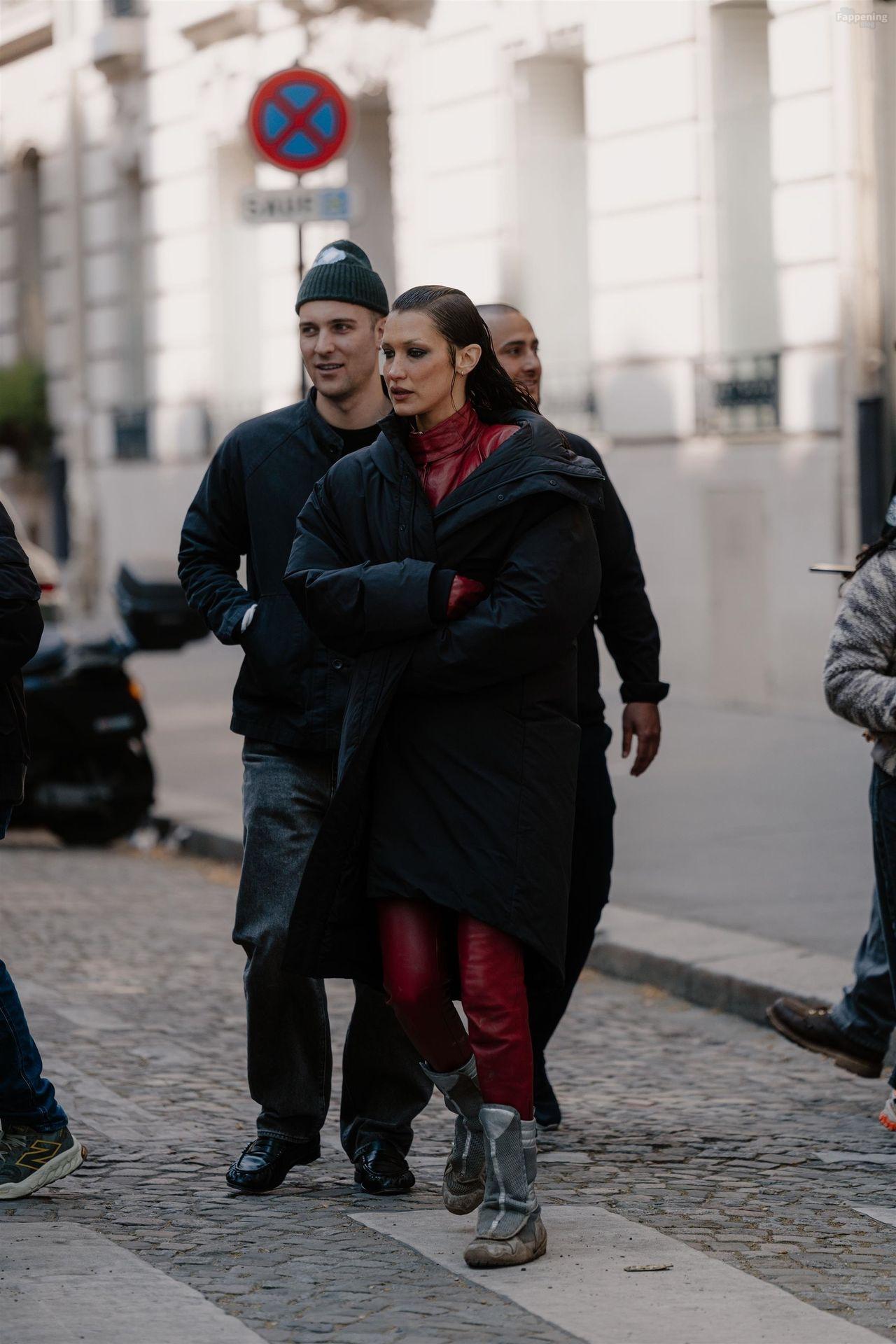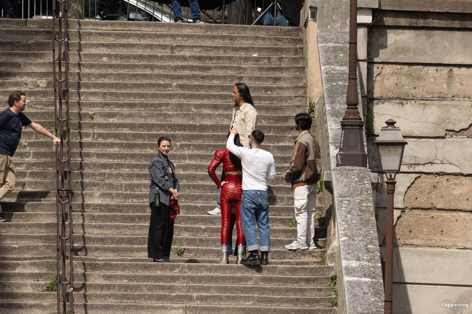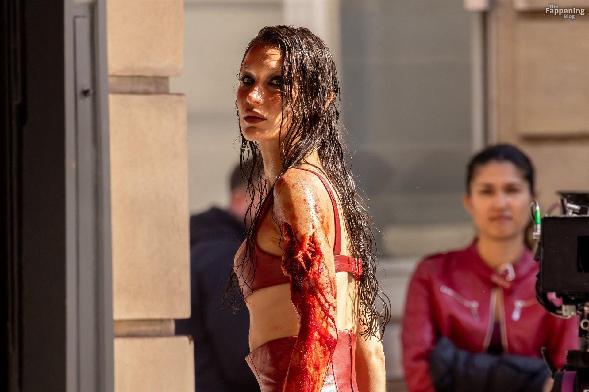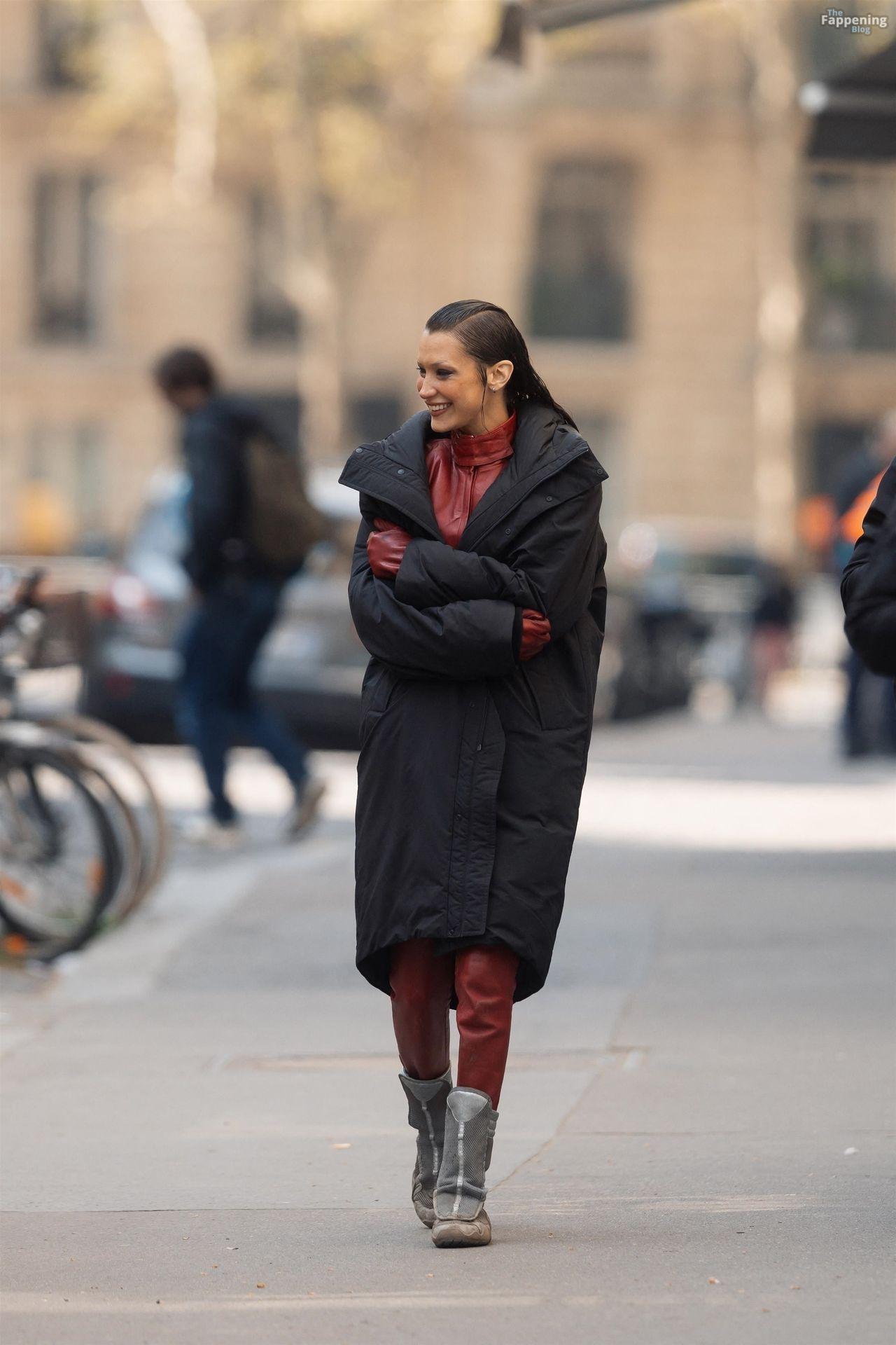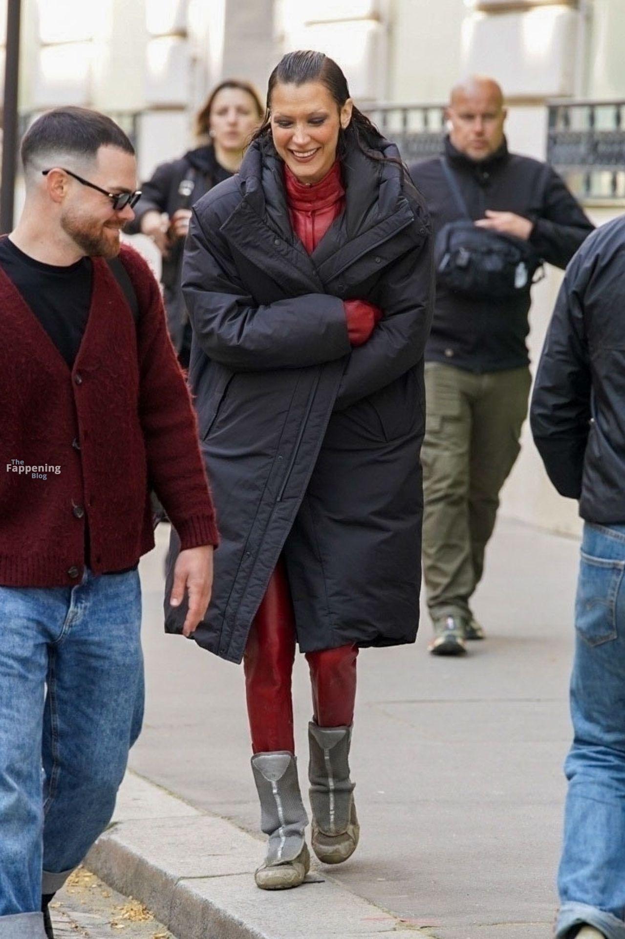 Белла Хадид запечатлена в Париже в огненно-красном кожаном комбинезоне, оседлав мотоцикл. После того дикого трюка с манекеном и аварии, она играет крутую девушку с серьёзной травмой ноги для сцены в сериале «Красота» в Париже, Франция.
