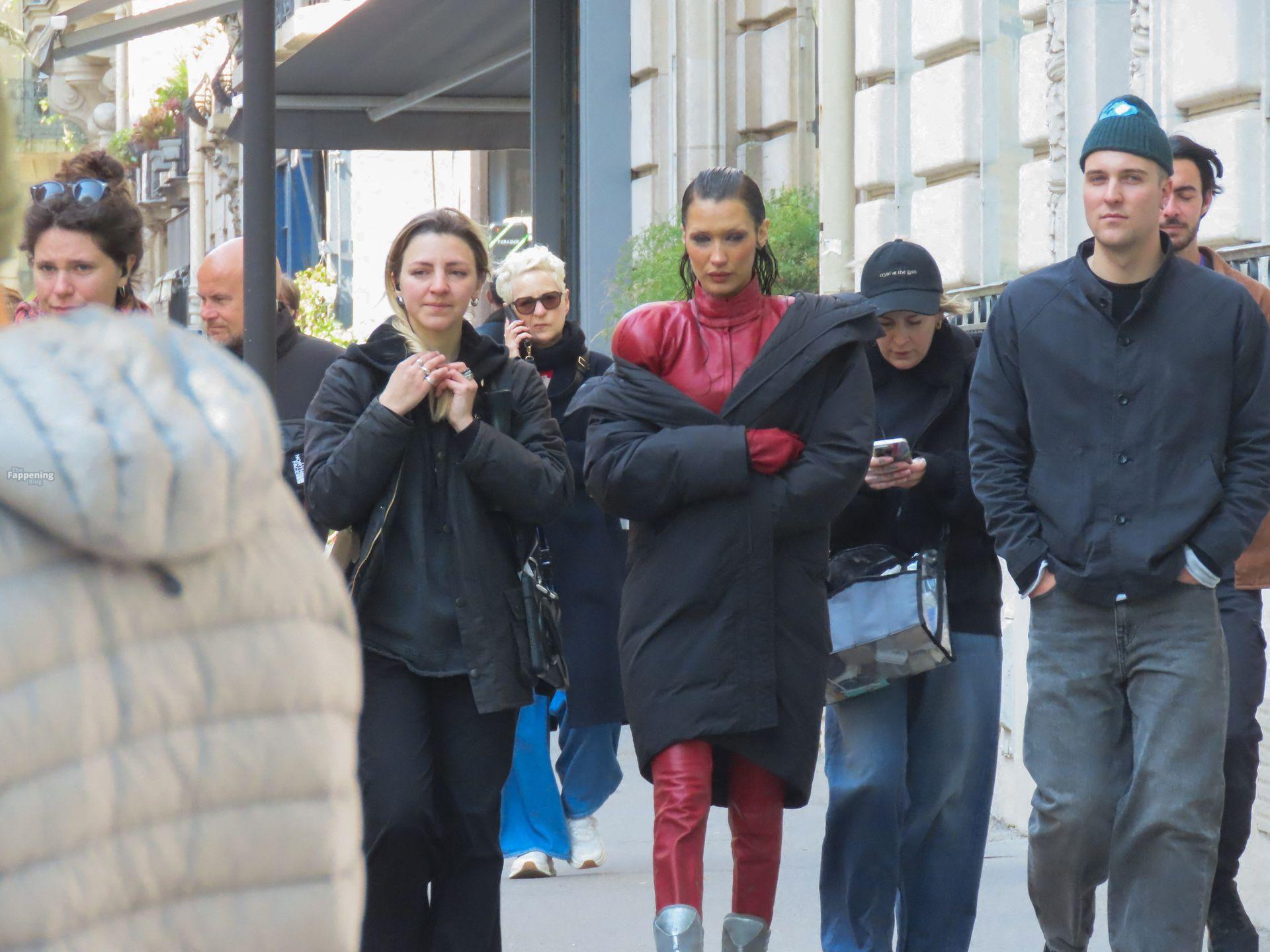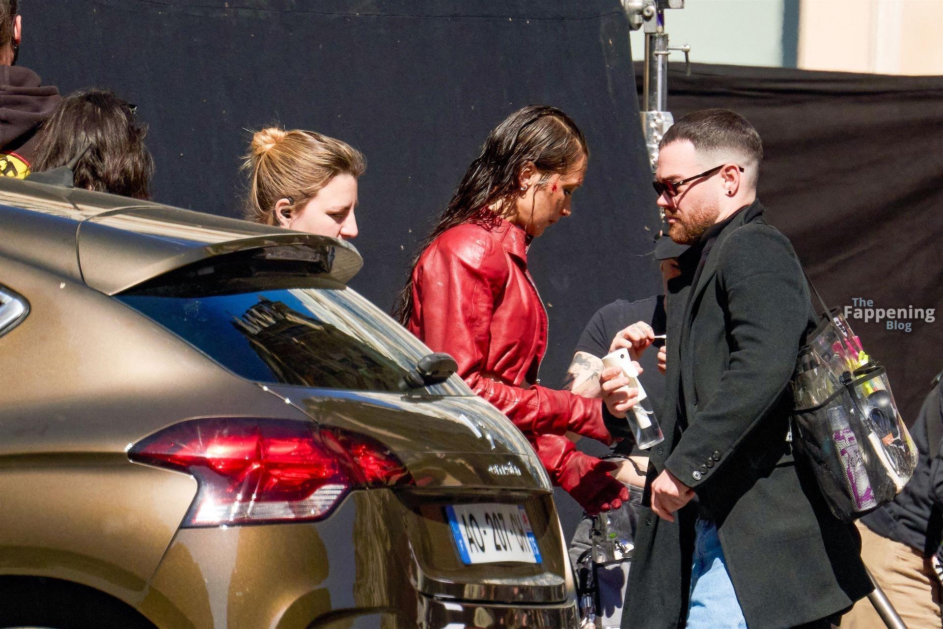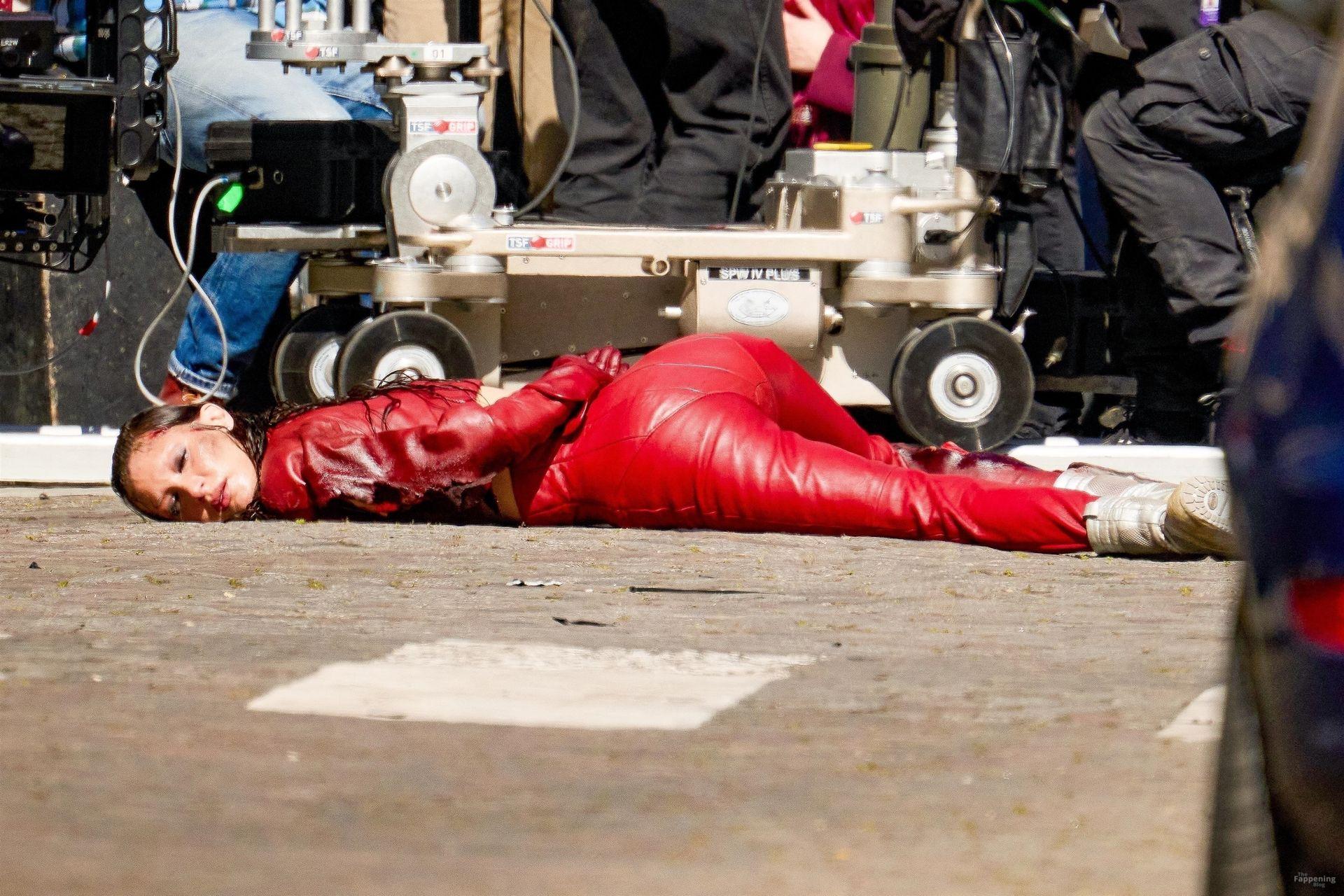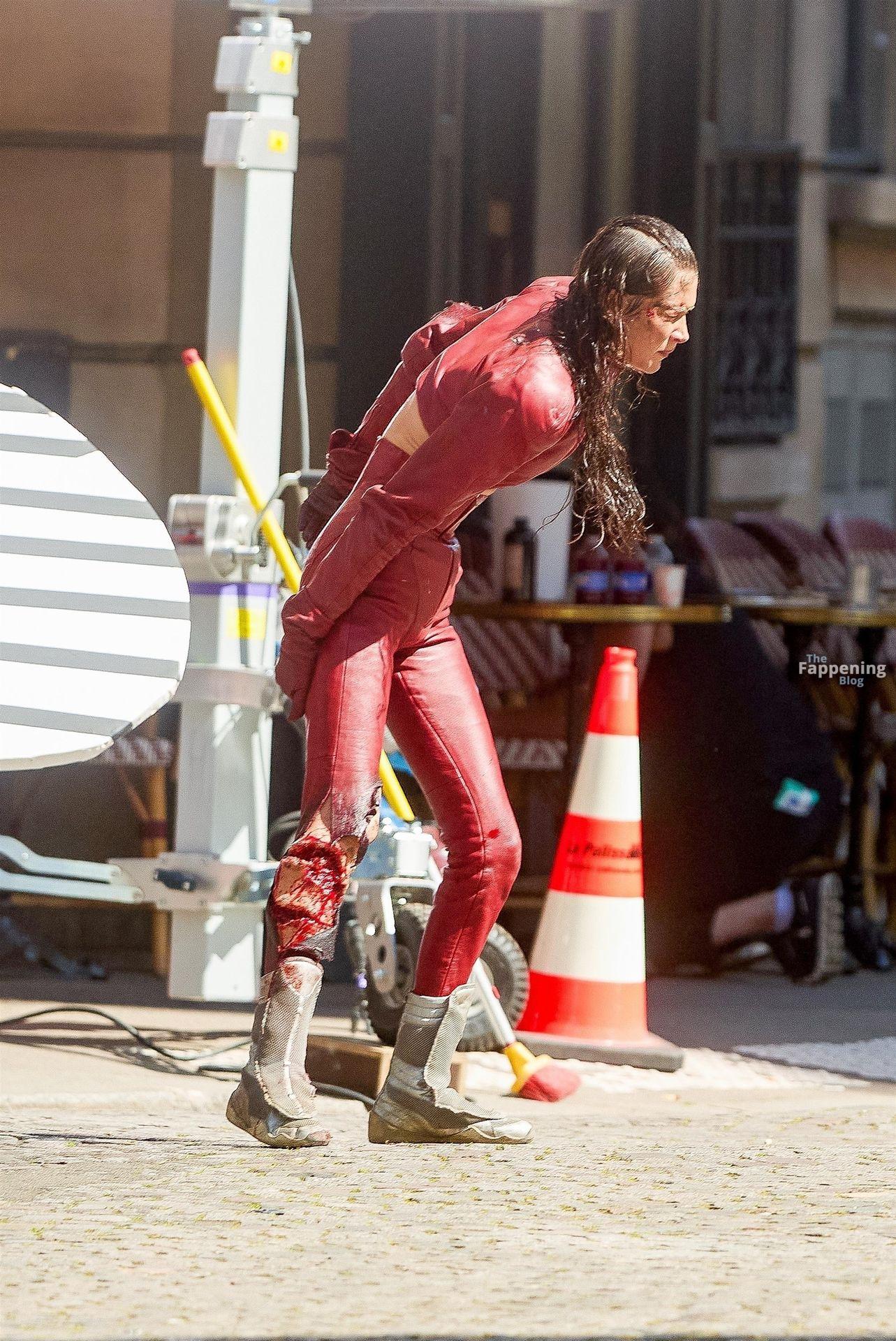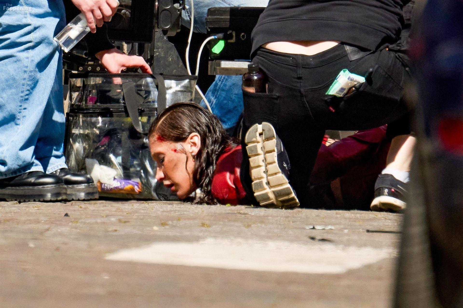 Белла Хадид запечатлена в Париже в огненно-красном кожаном комбинезоне, оседлав мотоцикл. После того дикого трюка с манекеном и аварии, она играет крутую девушку с серьёзной травмой ноги для сцены в сериале «Красота» в Париже, Франция.