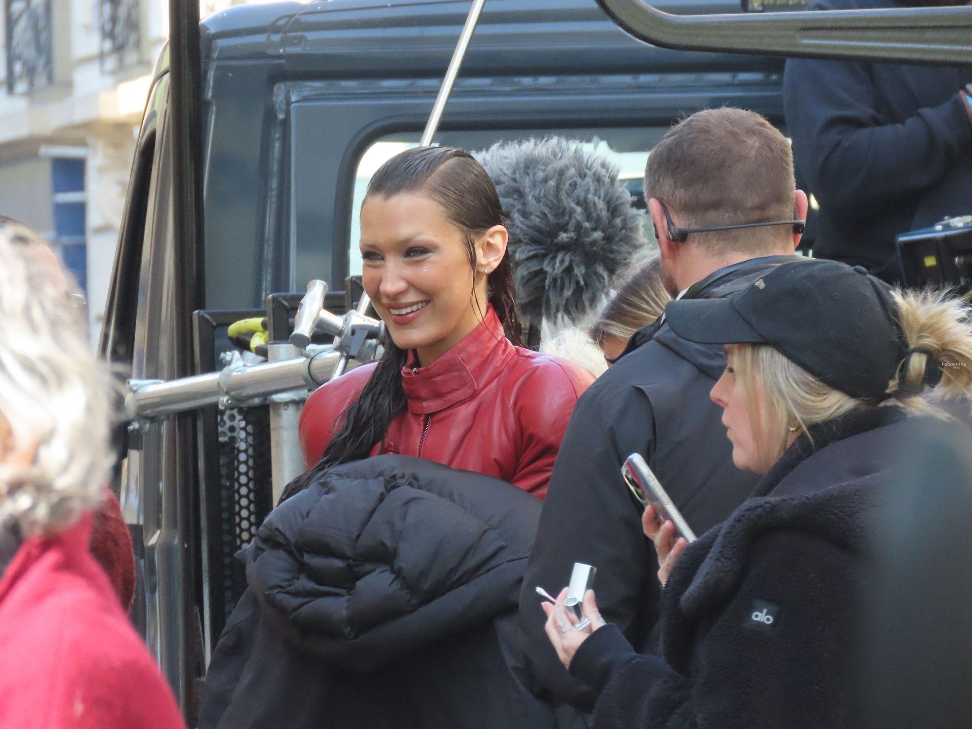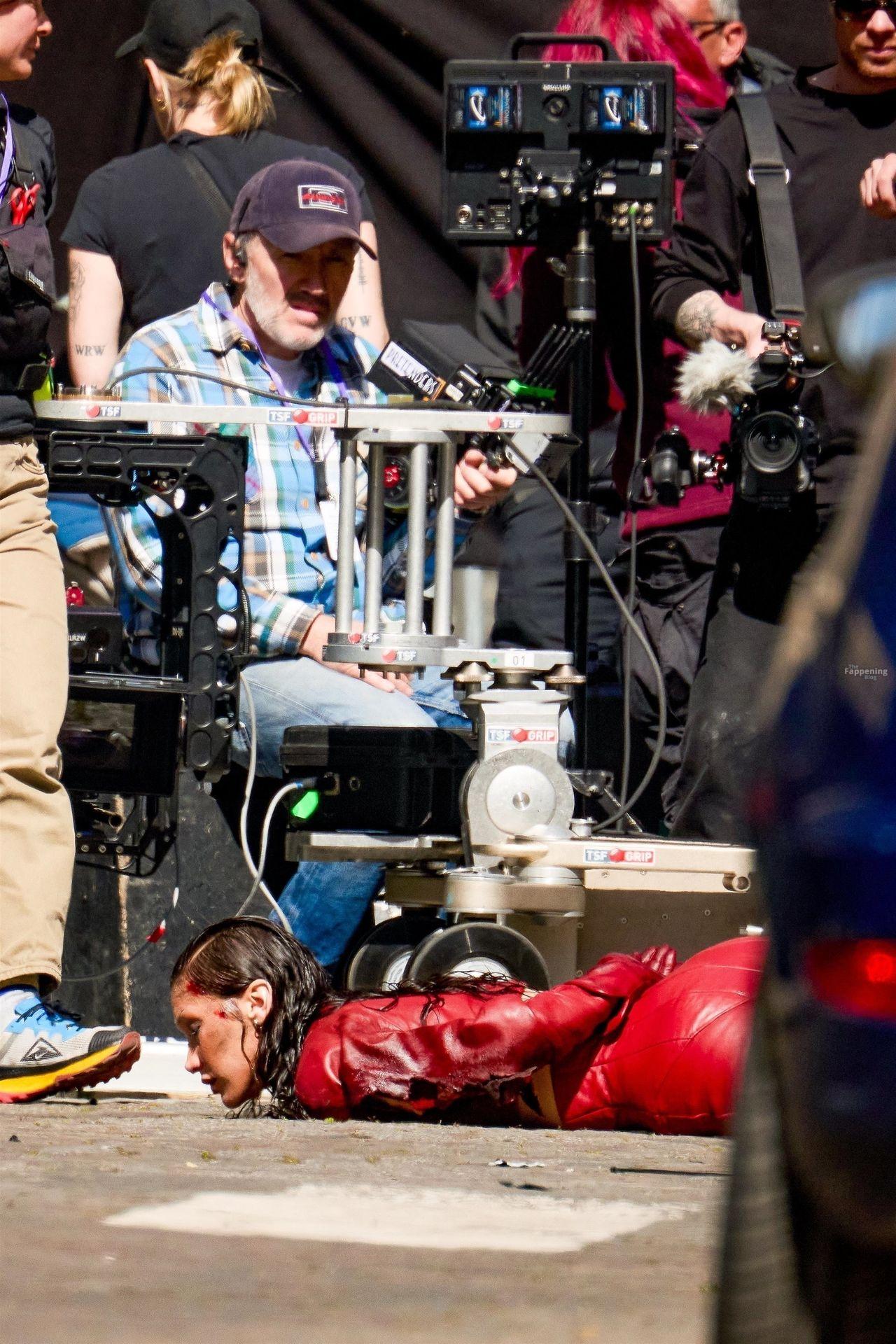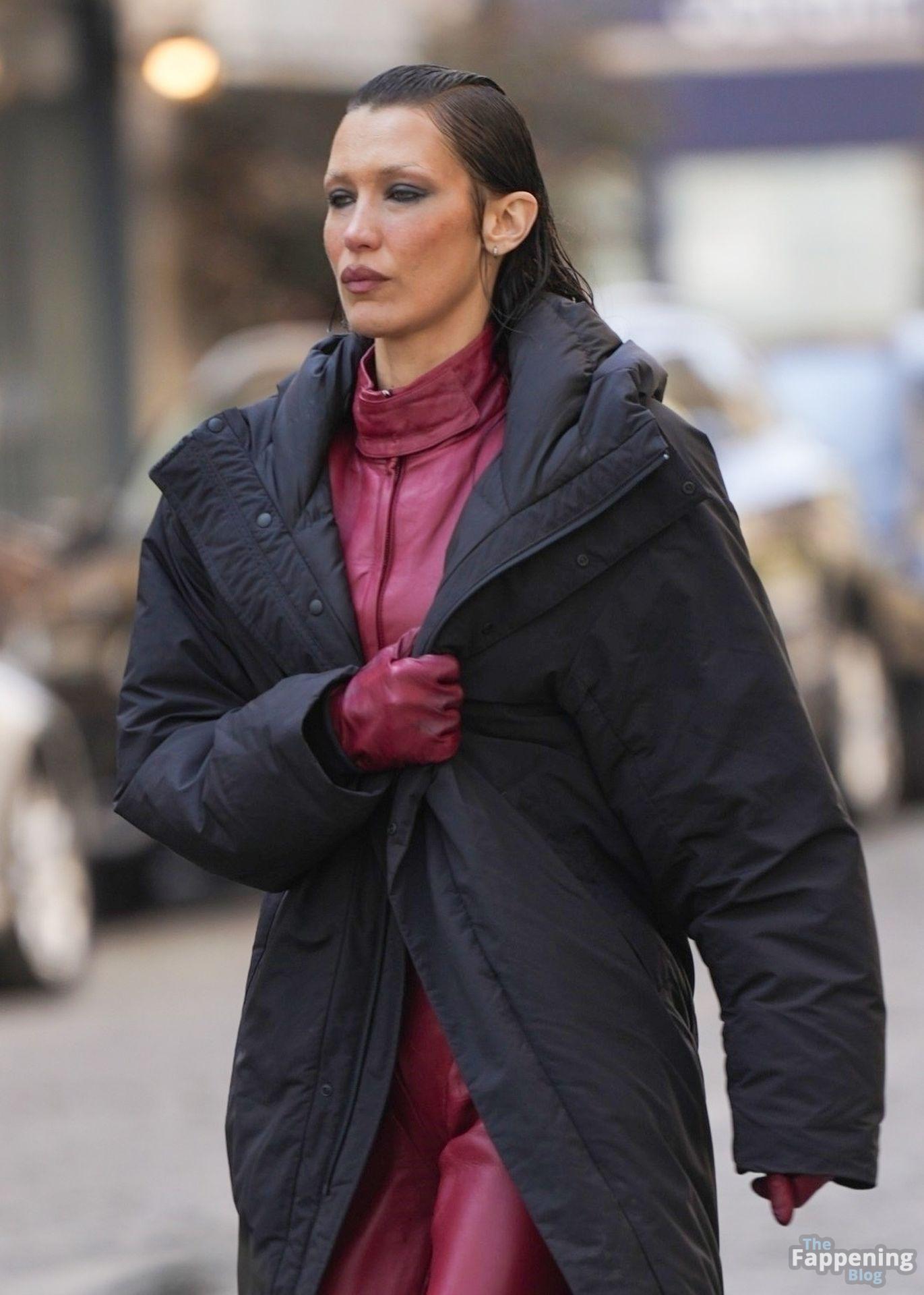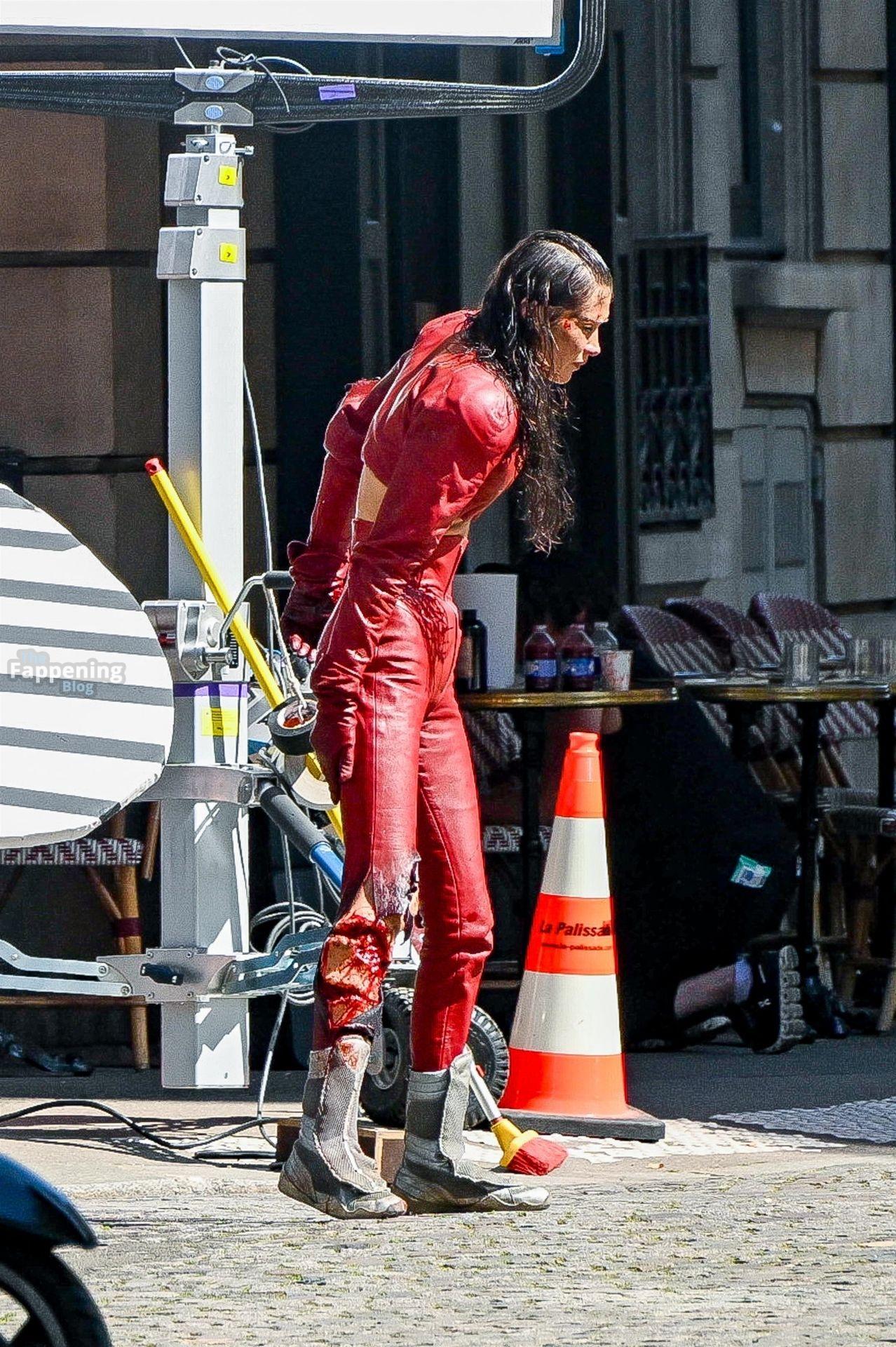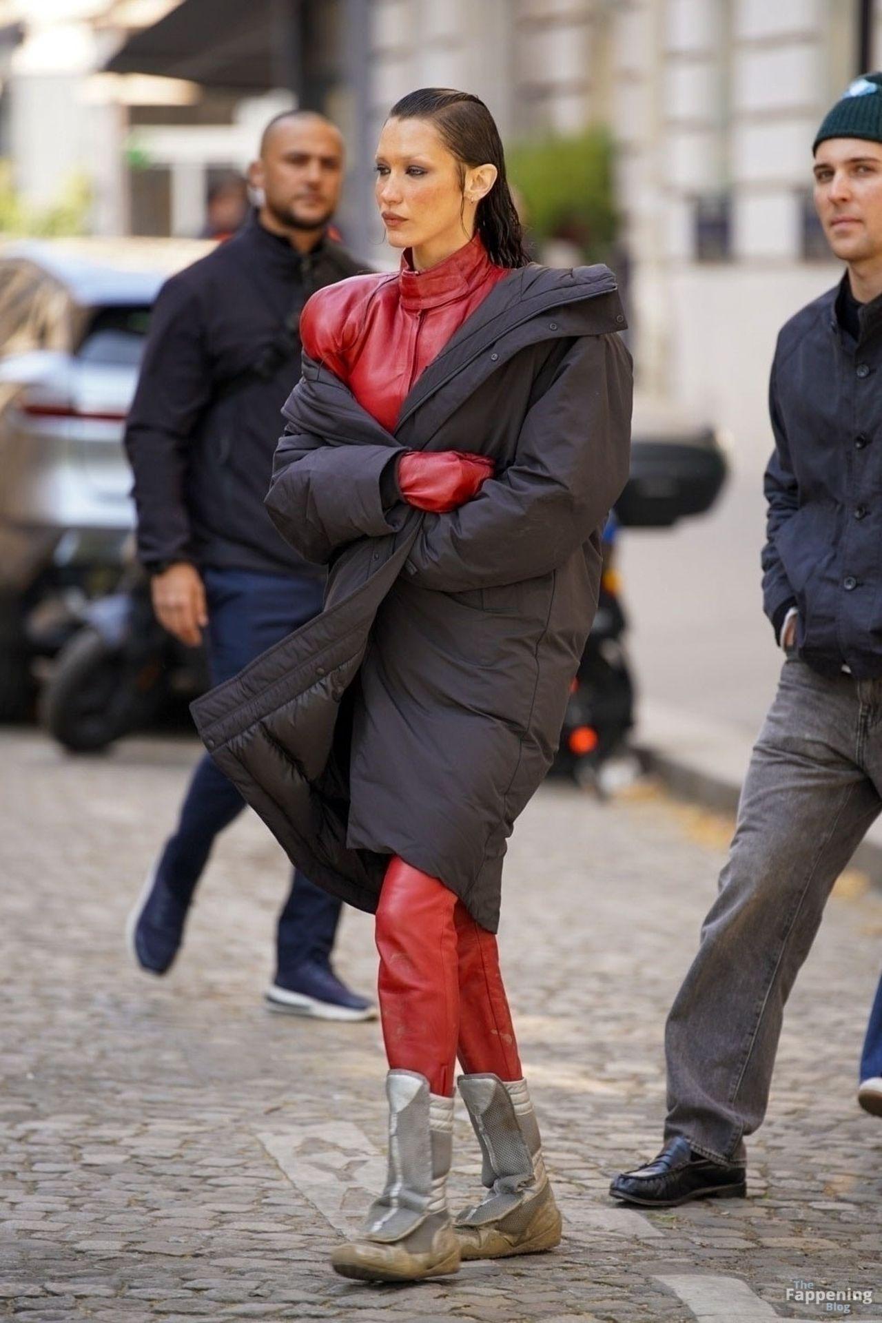 Белла Хадид запечатлена в Париже в огненно-красном кожаном комбинезоне, оседлав мотоцикл. После того дикого трюка с манекеном и аварии, она играет крутую девушку с серьёзной травмой ноги для сцены в сериале «Красота» в Париже, Франция.