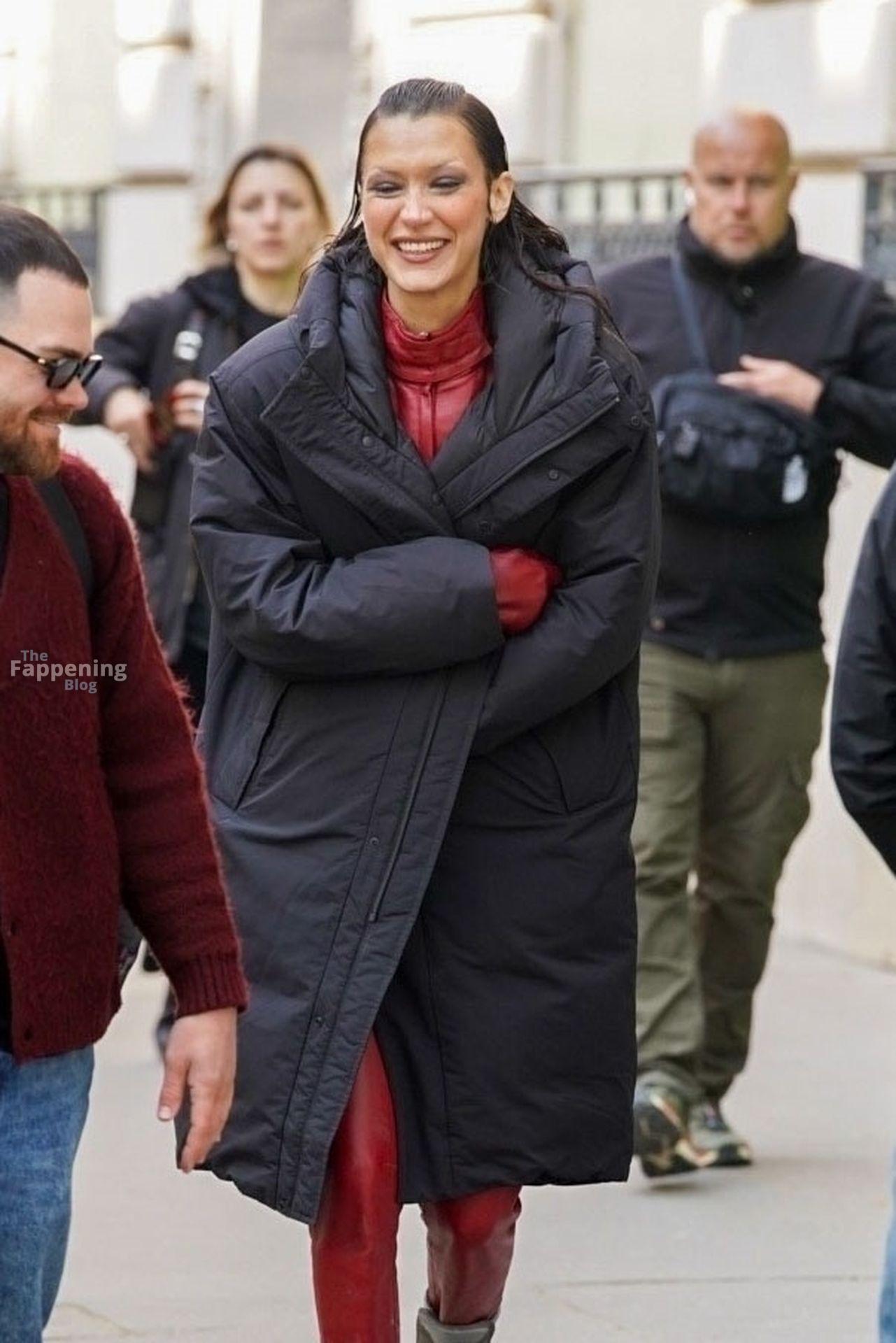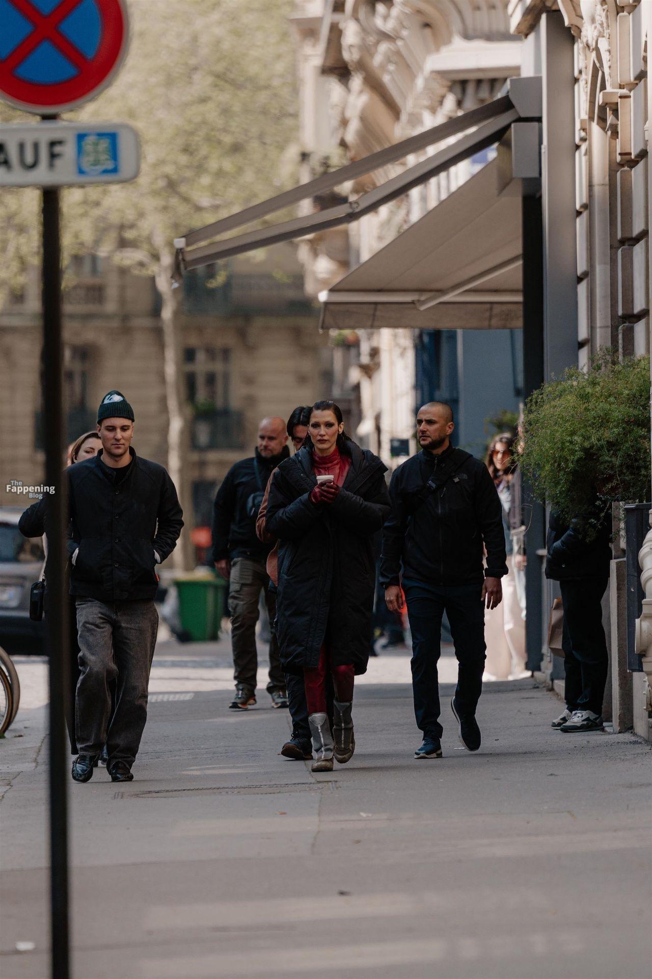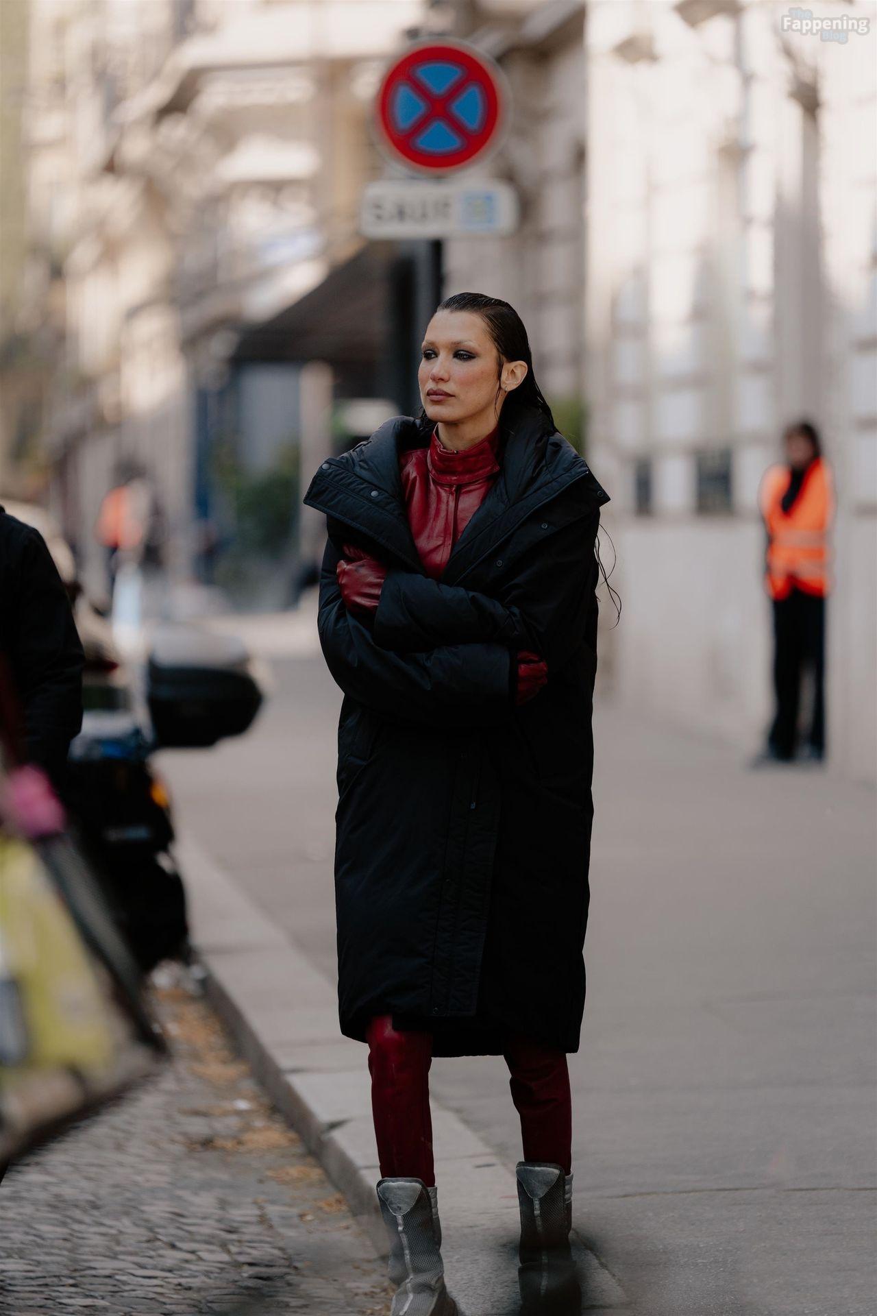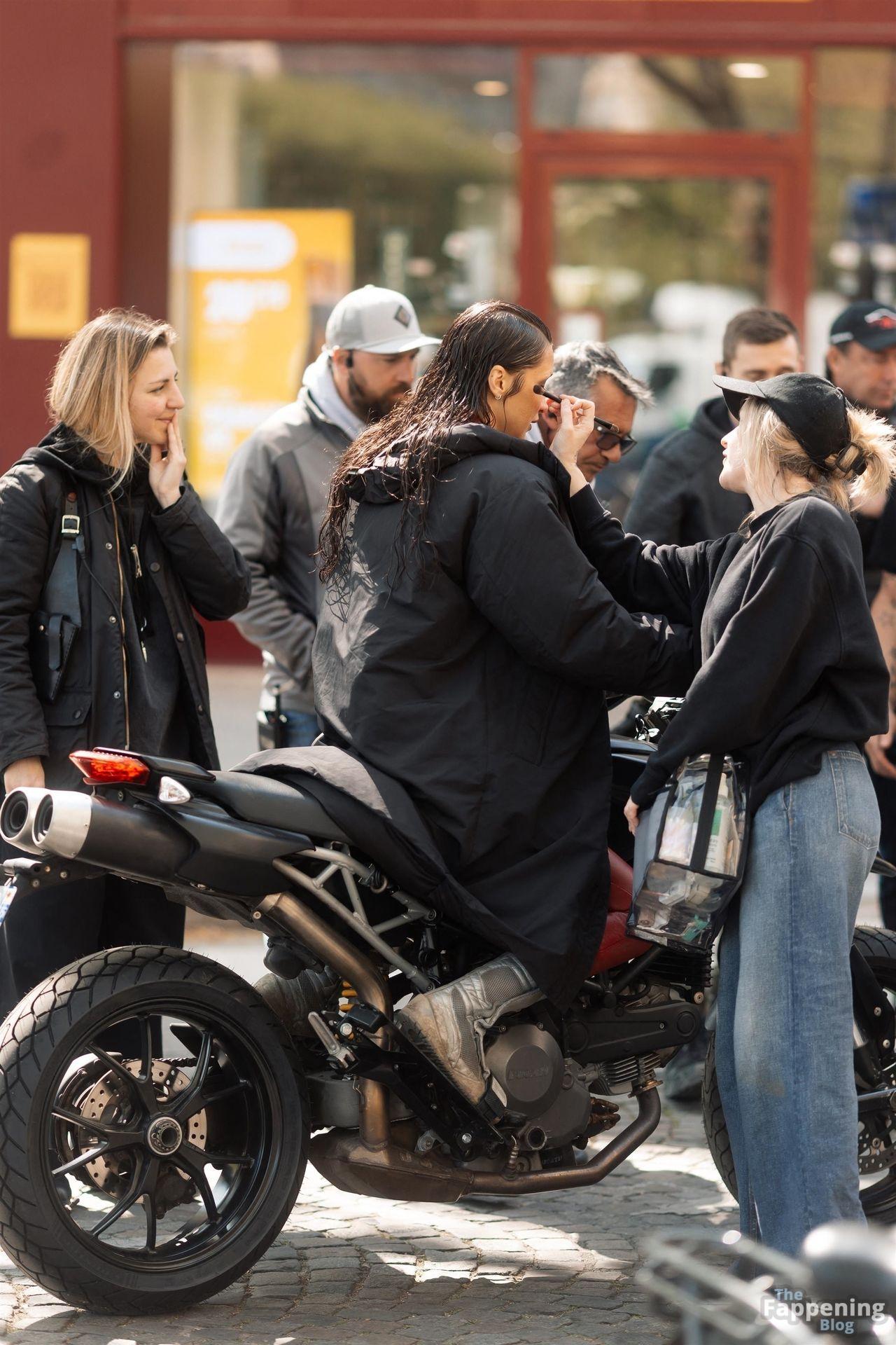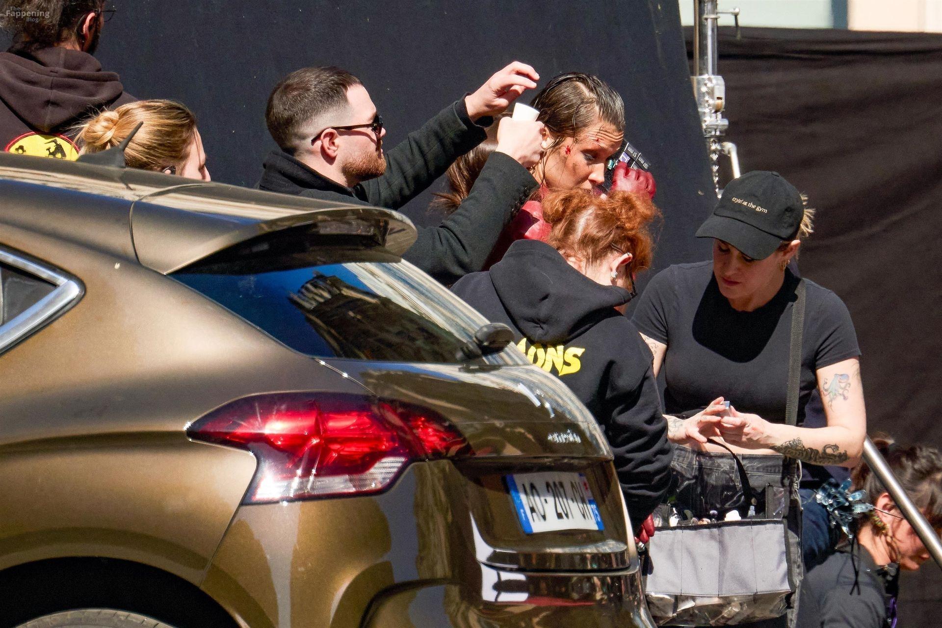 Белла Хадид запечатлена в Париже в огненно-красном кожаном комбинезоне, оседлав мотоцикл. После того дикого трюка с манекеном и аварии, она играет крутую девушку с серьёзной травмой ноги для сцены в сериале «Красота» в Париже, Франция.