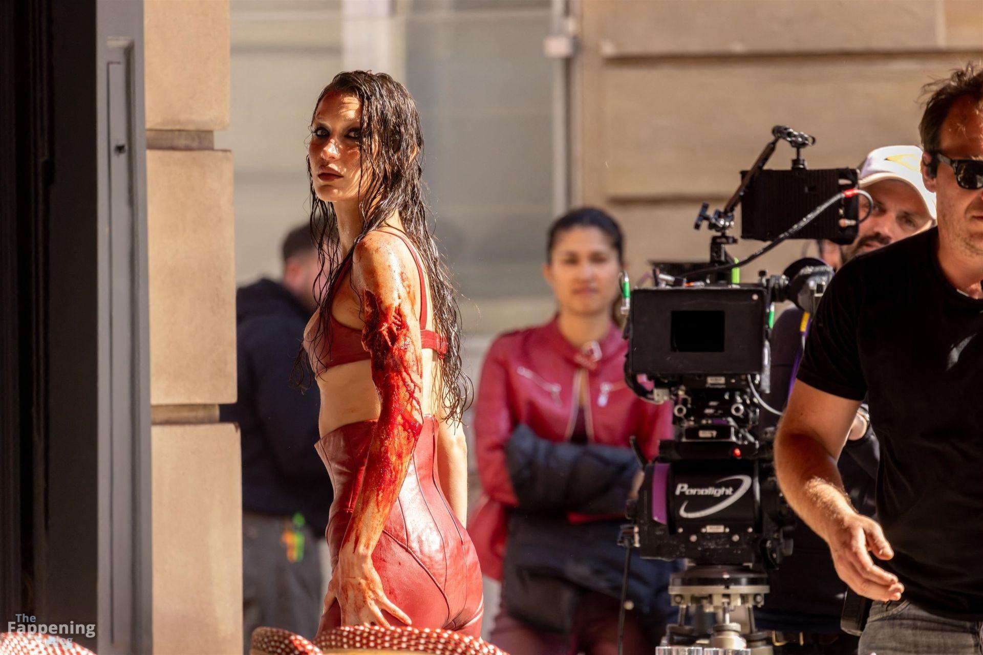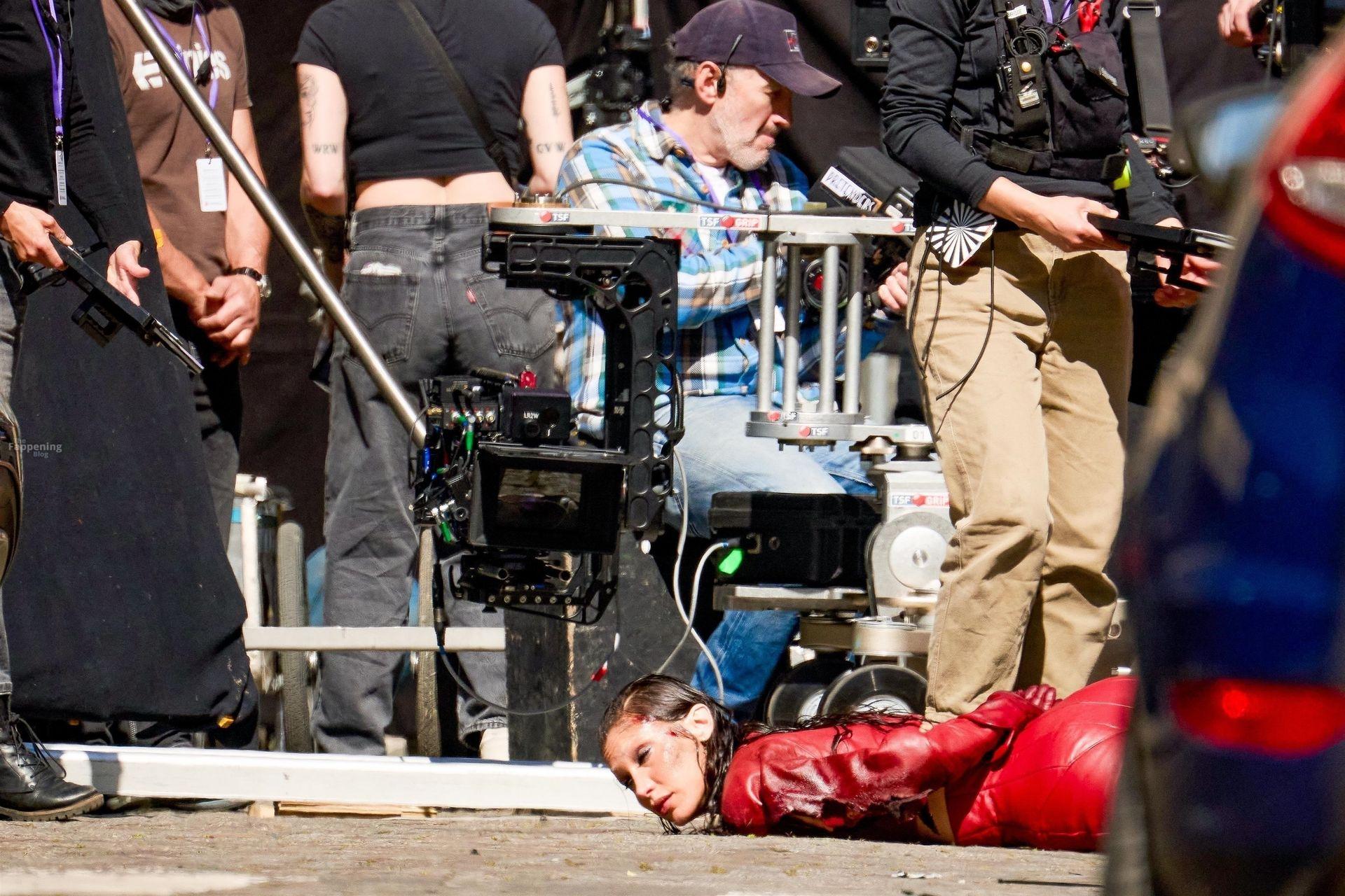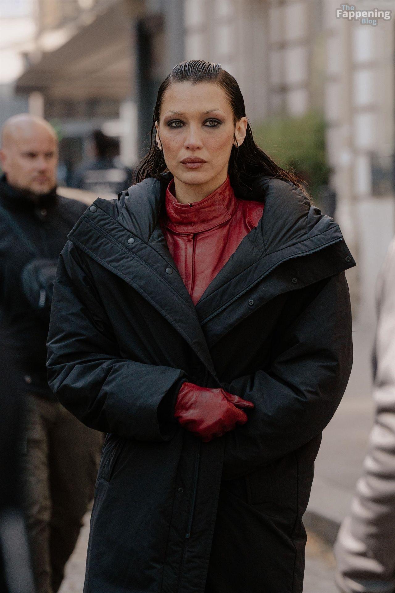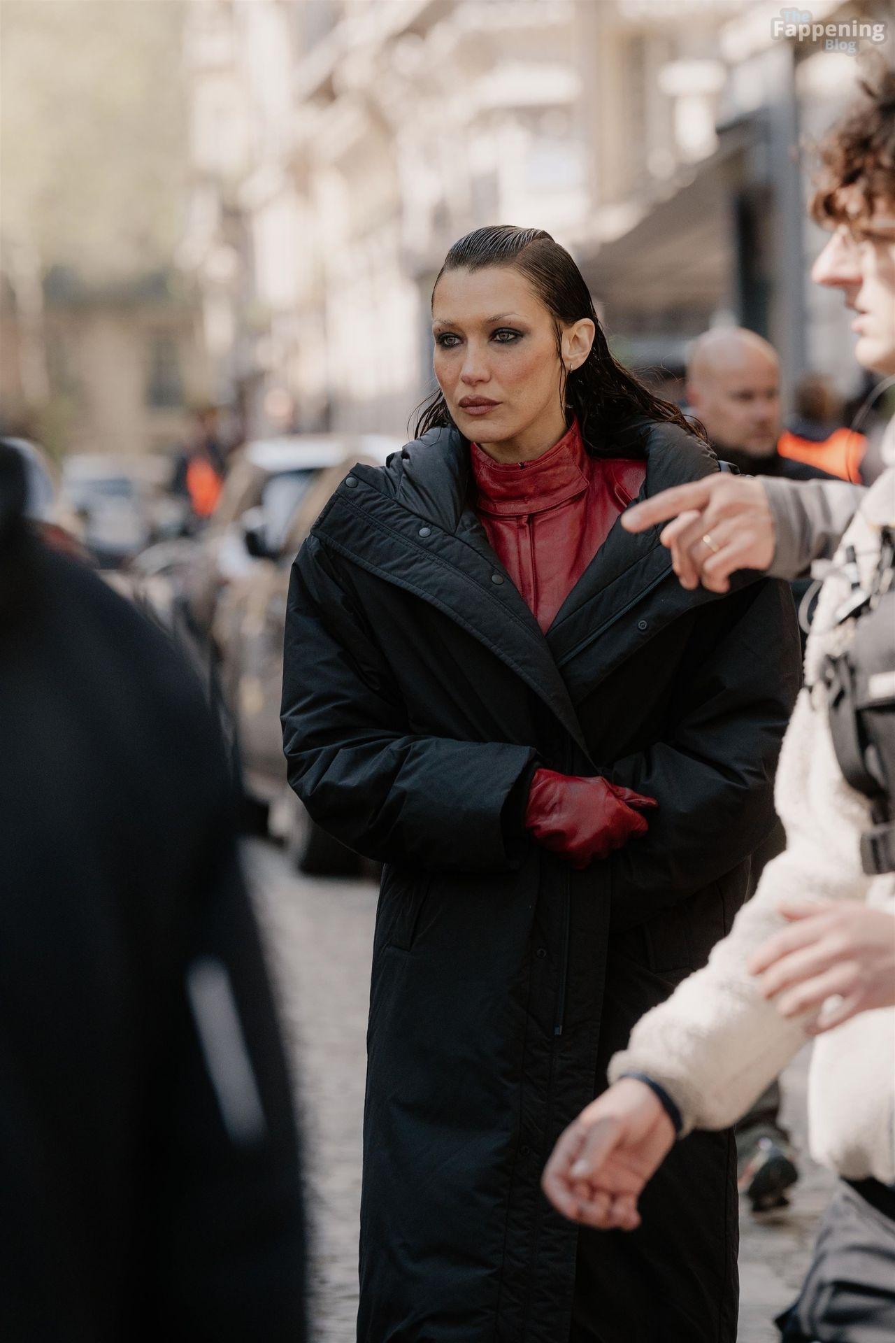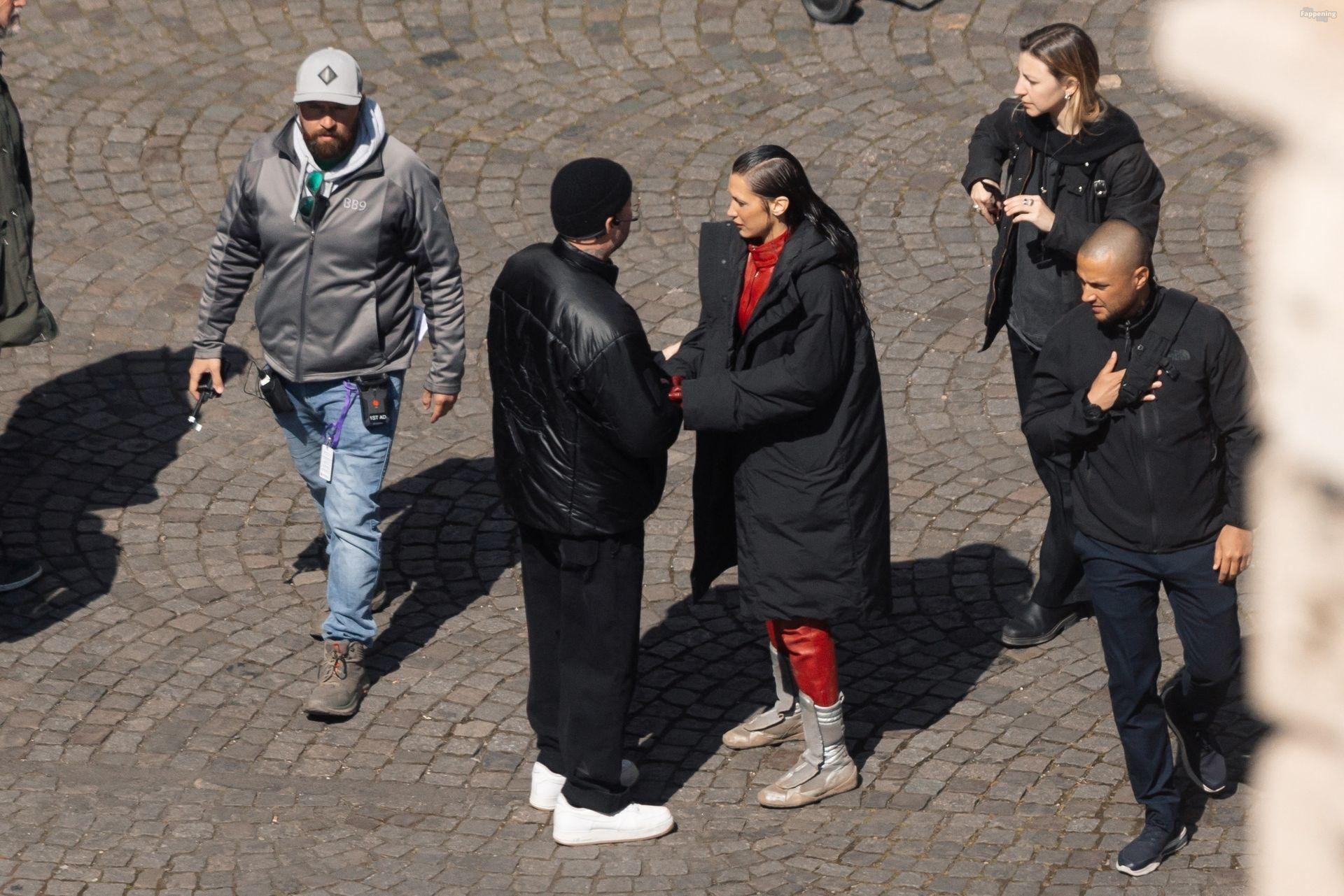 Белла Хадид запечатлена в Париже в огненно-красном кожаном комбинезоне, оседлав мотоцикл. После того дикого трюка с манекеном и аварии, она играет крутую девушку с серьёзной травмой ноги для сцены в сериале «Красота» в Париже, Франция.