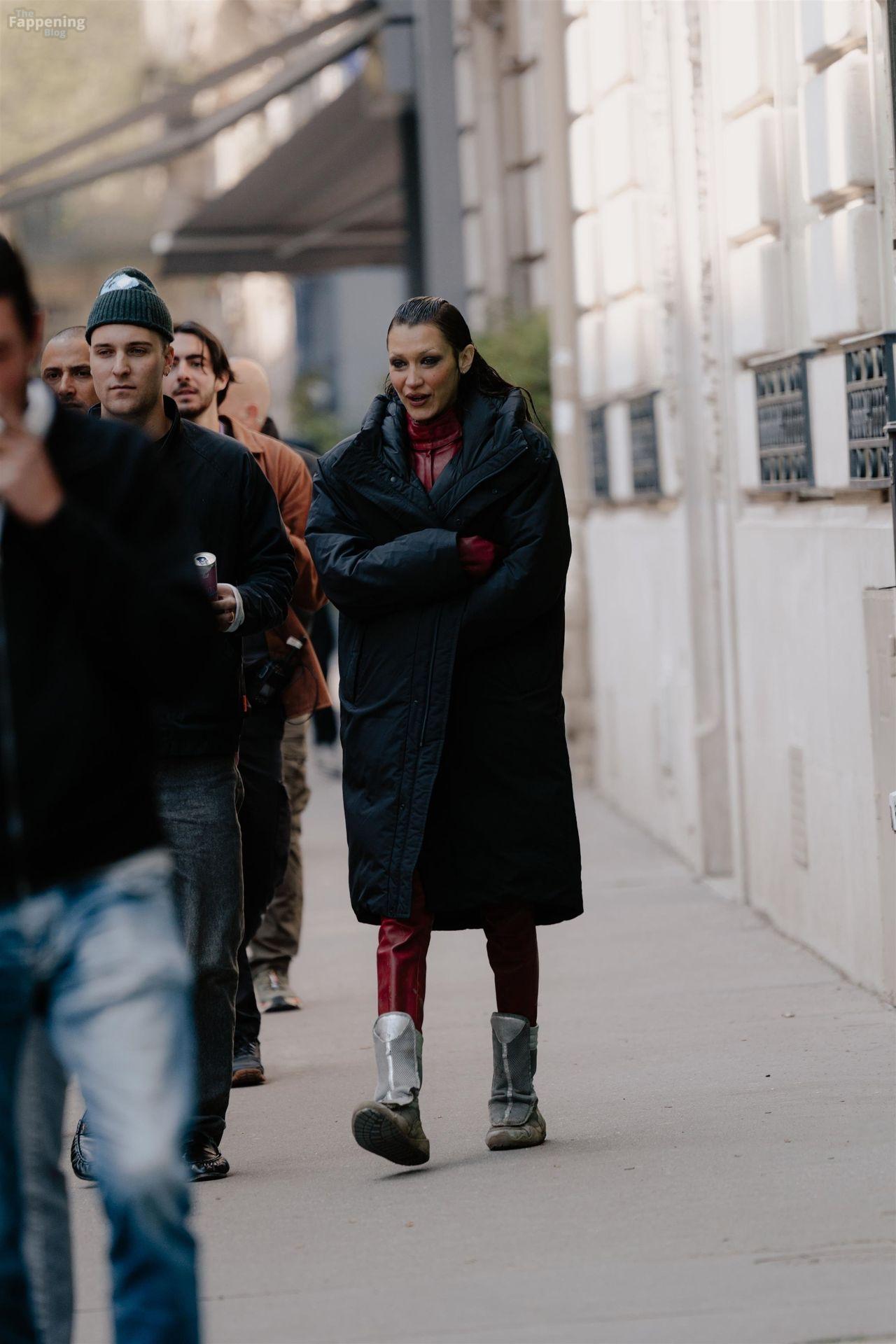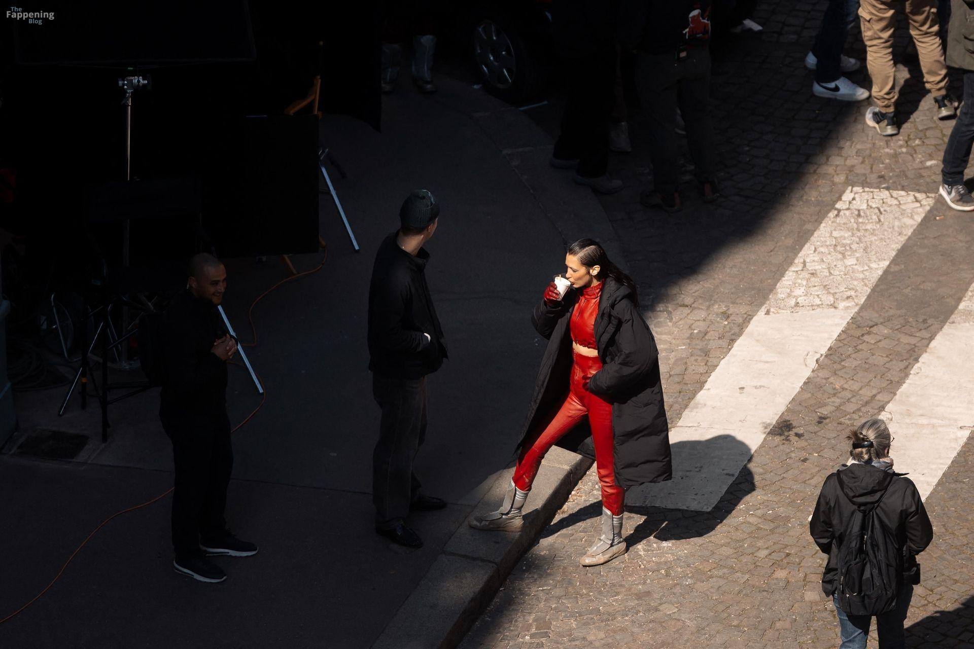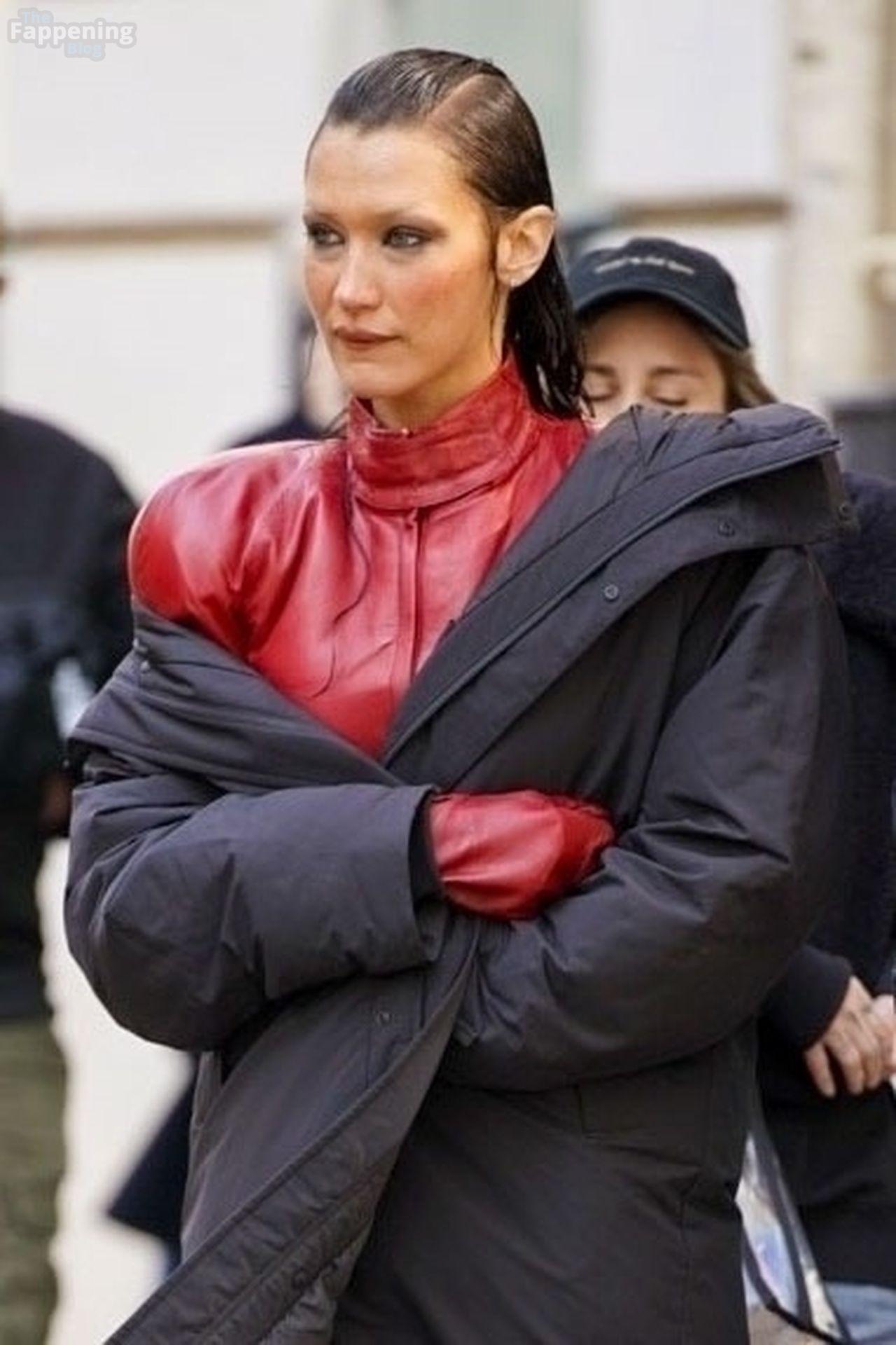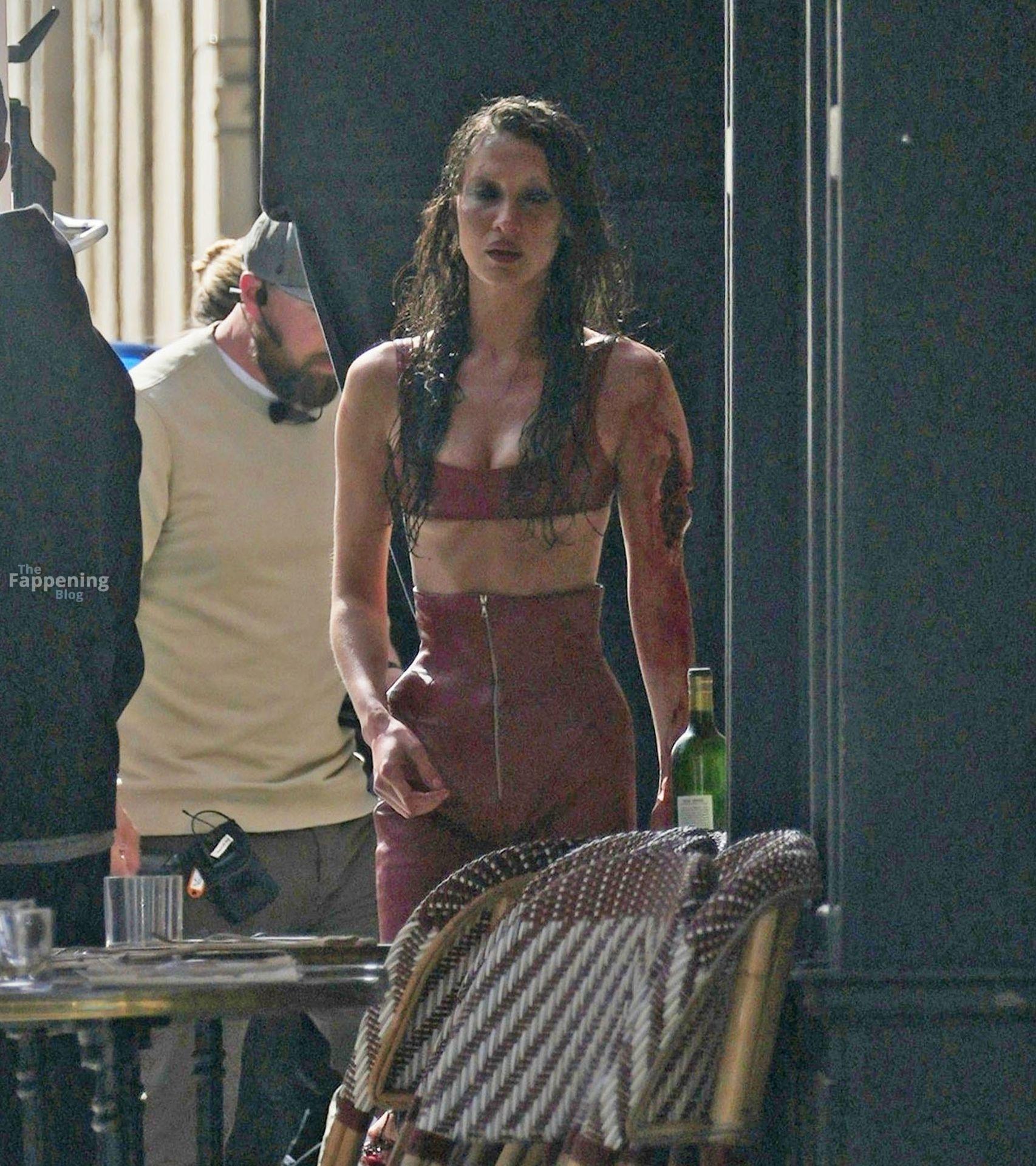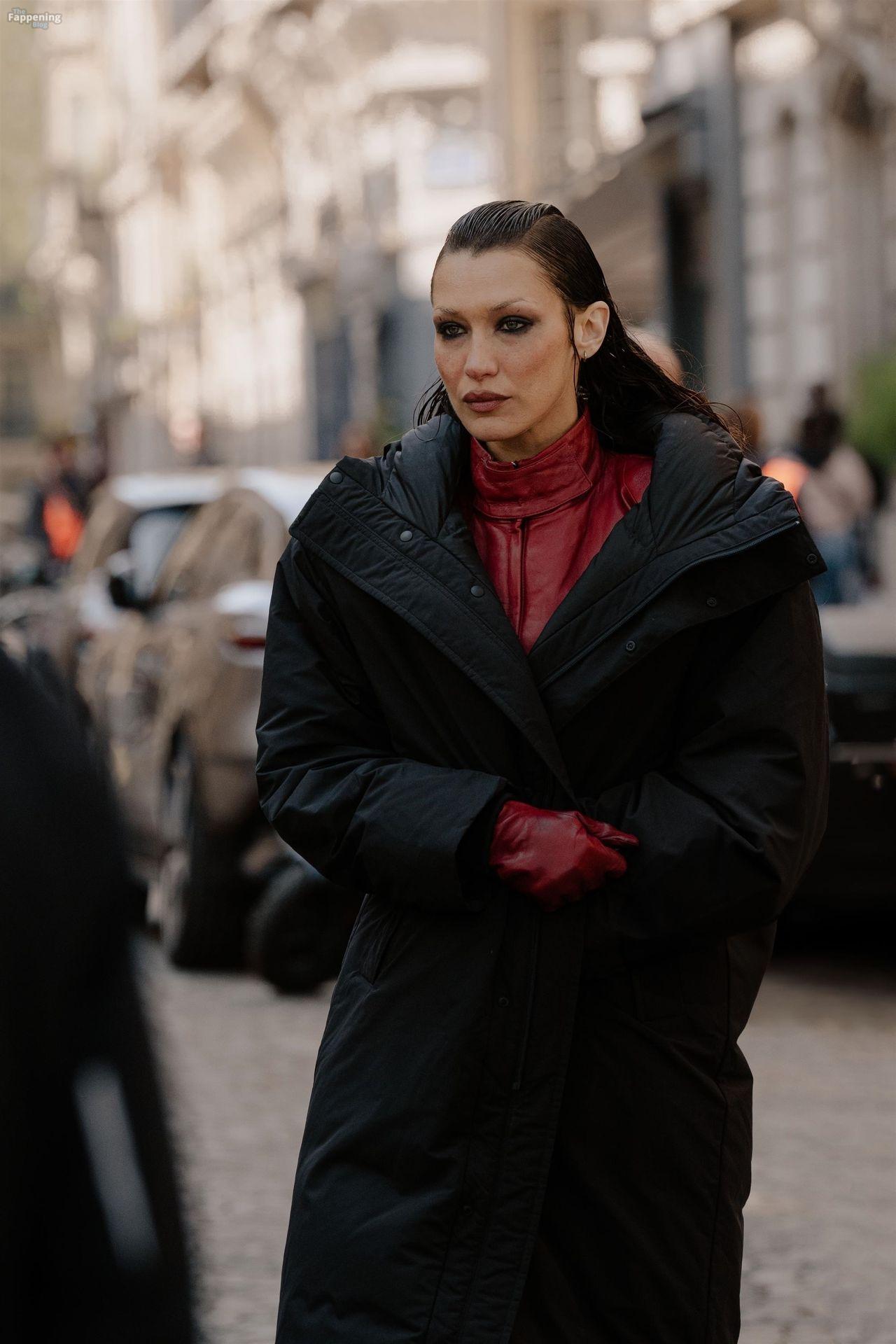 Белла Хадид запечатлена в Париже в огненно-красном кожаном комбинезоне, оседлав мотоцикл. После того дикого трюка с манекеном и аварии, она играет крутую девушку с серьёзной травмой ноги для сцены в сериале «Красота» в Париже, Франция.