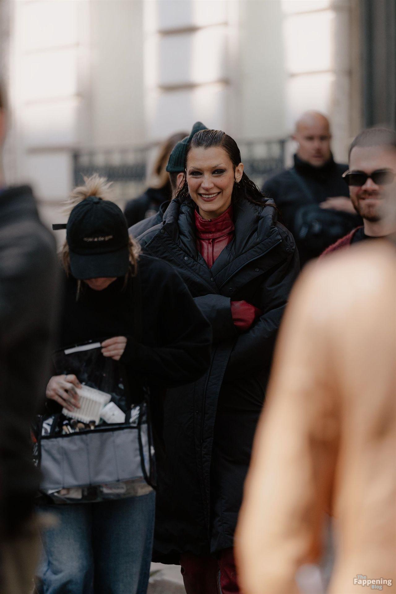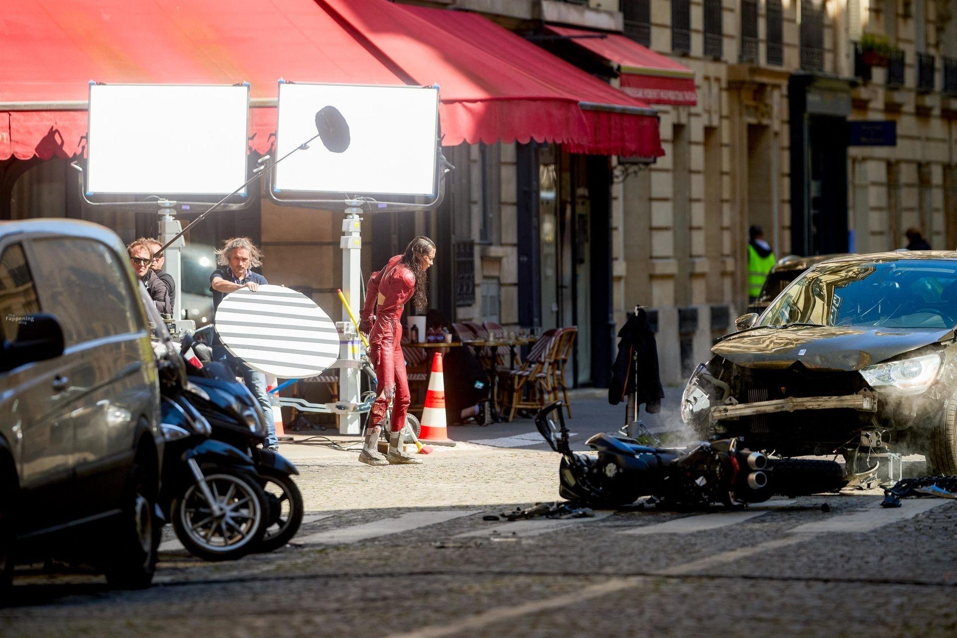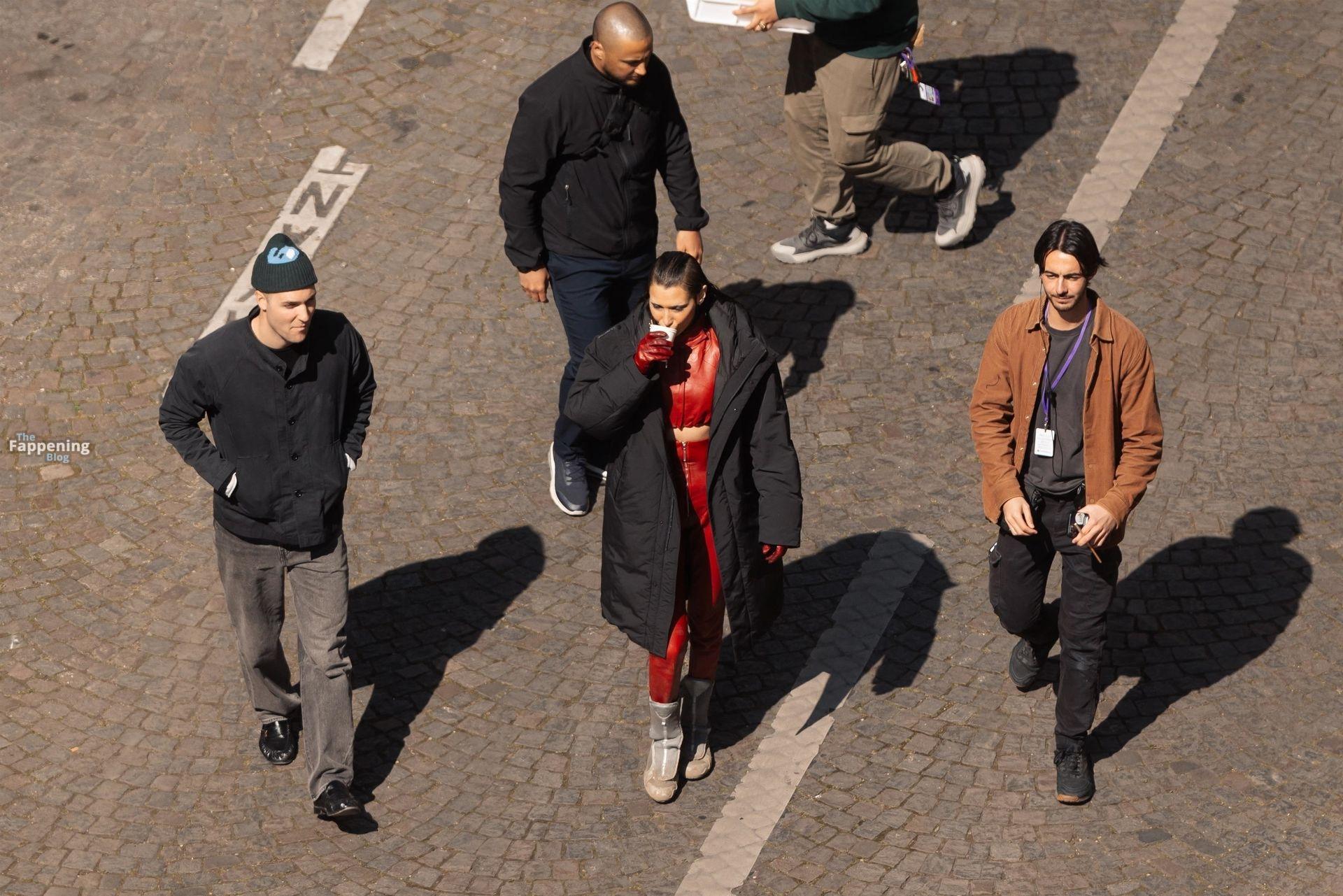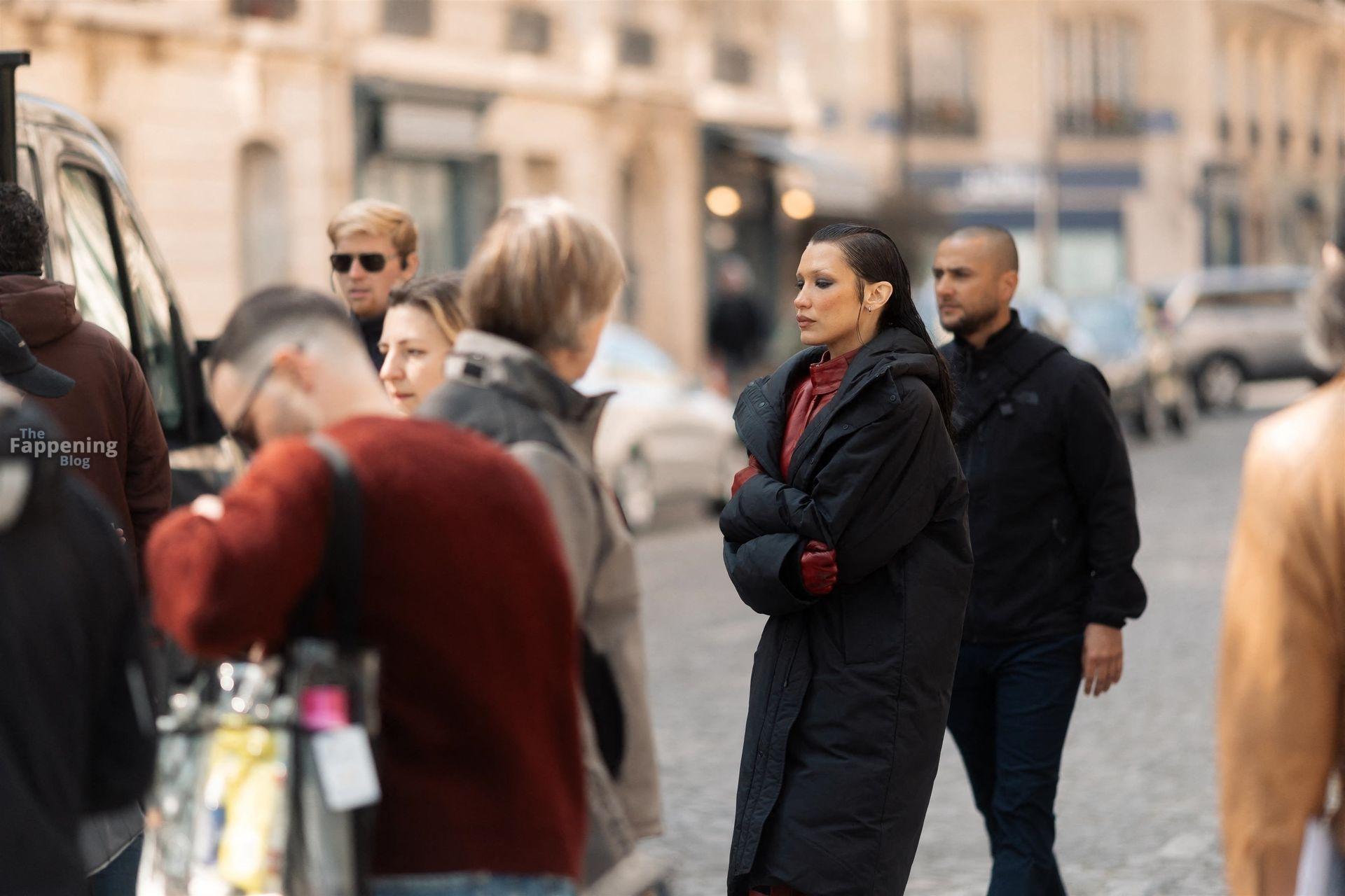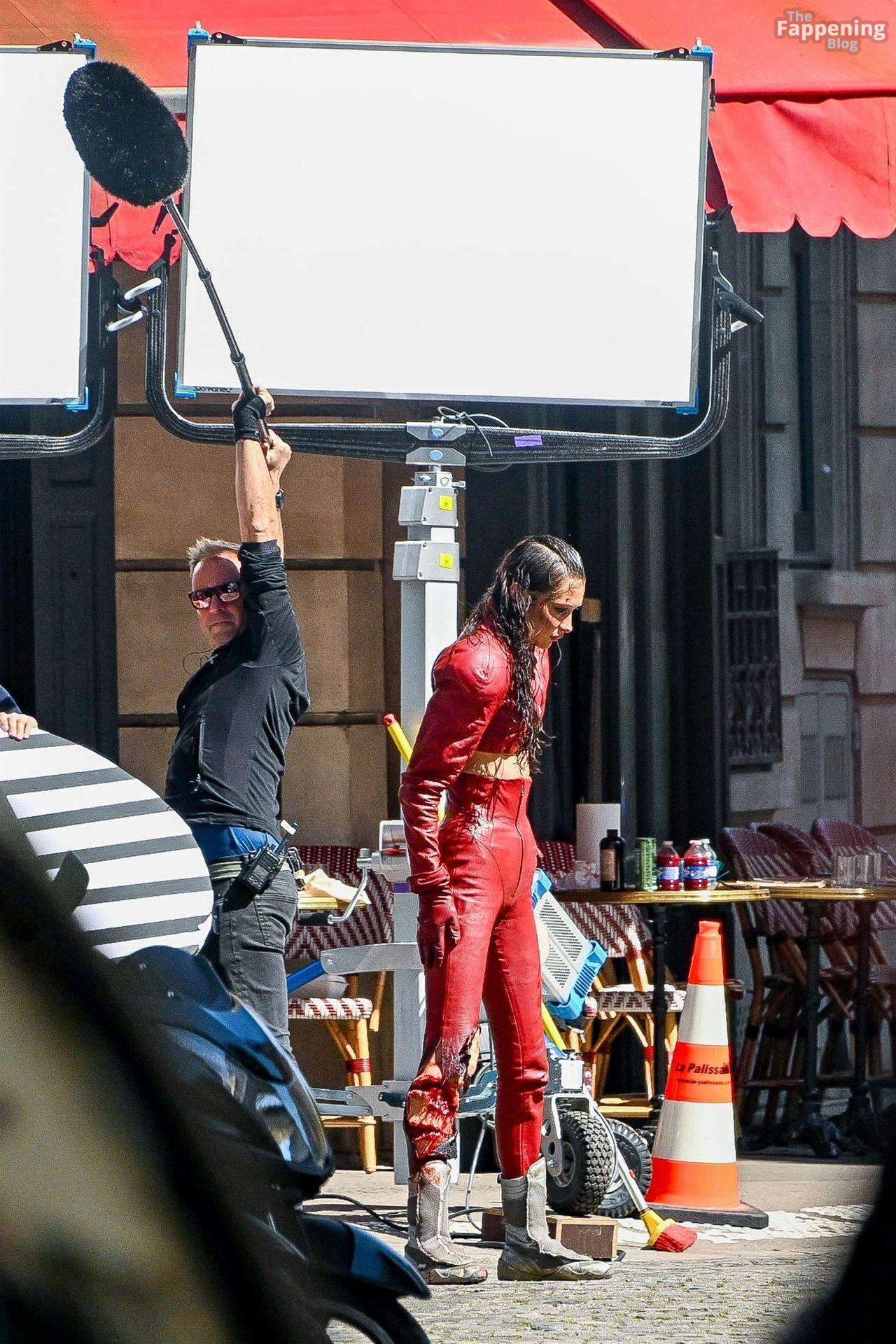 Белла Хадид запечатлена в Париже в огненно-красном кожаном комбинезоне, оседлав мотоцикл. После того дикого трюка с манекеном и аварии, она играет крутую девушку с серьёзной травмой ноги для сцены в сериале «Красота» в Париже, Франция.