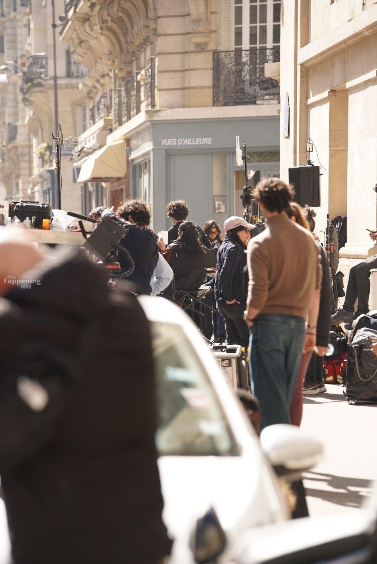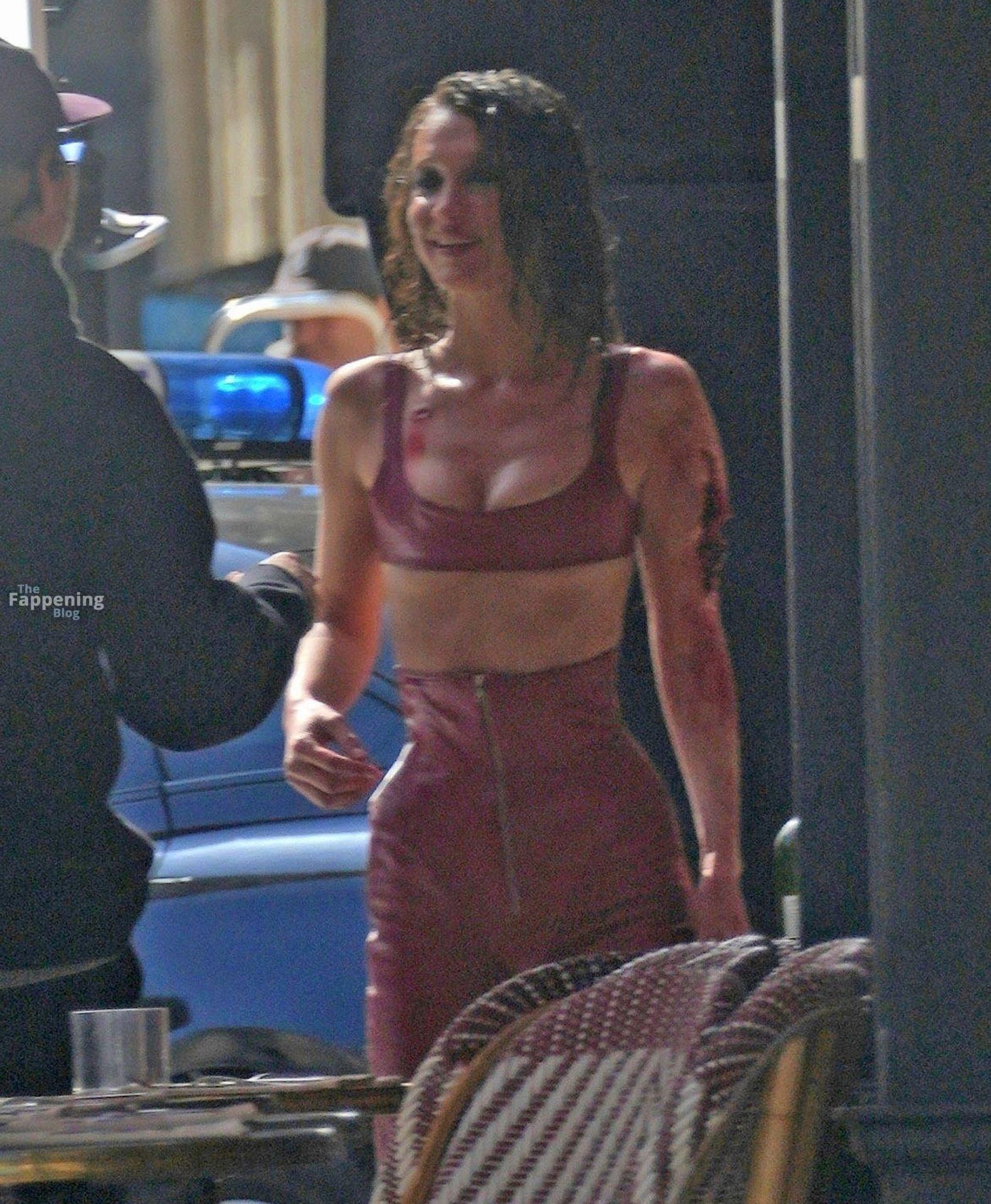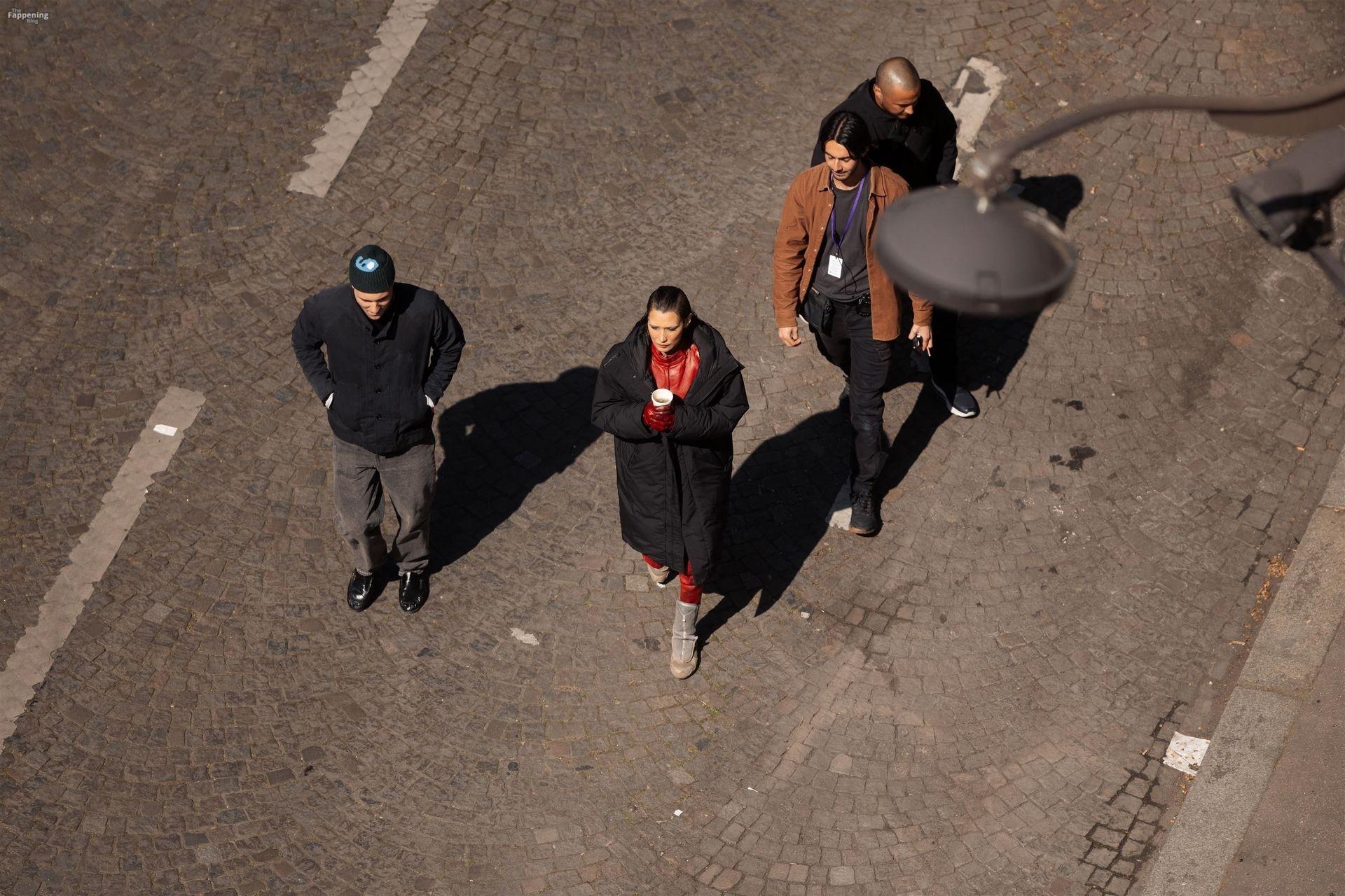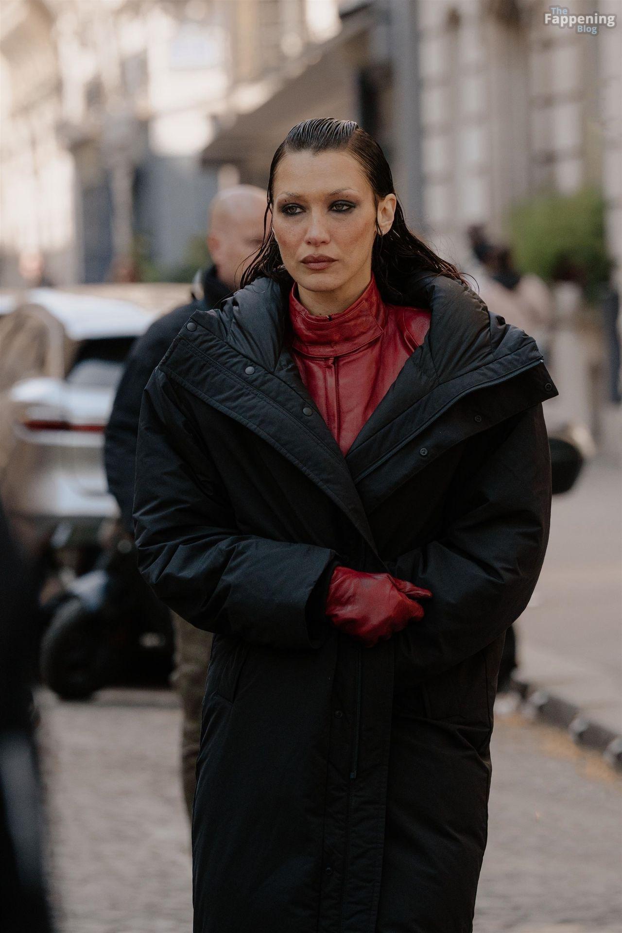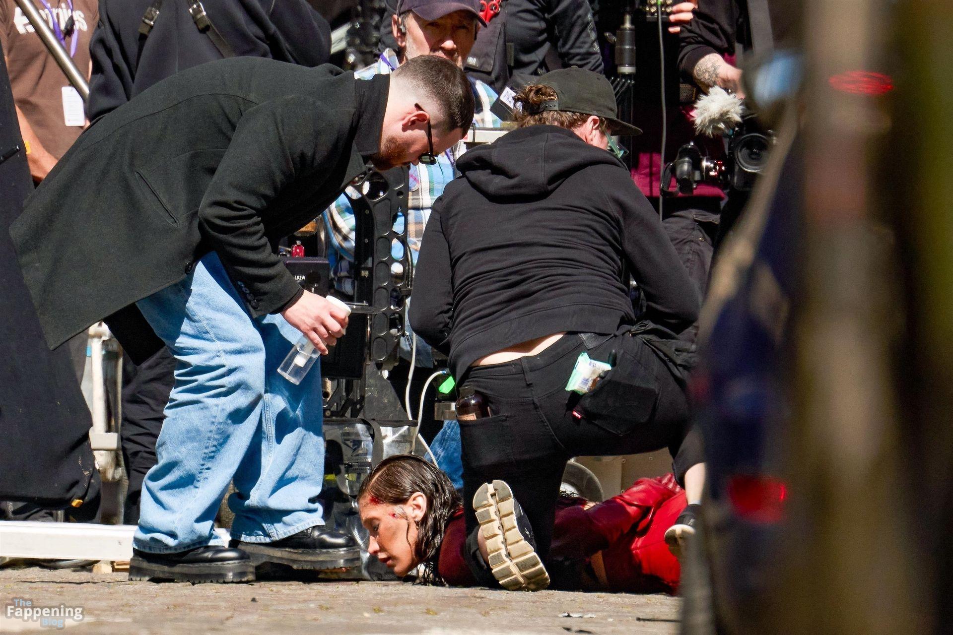 Белла Хадид запечатлена в Париже в огненно-красном кожаном комбинезоне, оседлав мотоцикл. После того дикого трюка с манекеном и аварии, она играет крутую девушку с серьёзной травмой ноги для сцены в сериале «Красота» в Париже, Франция.