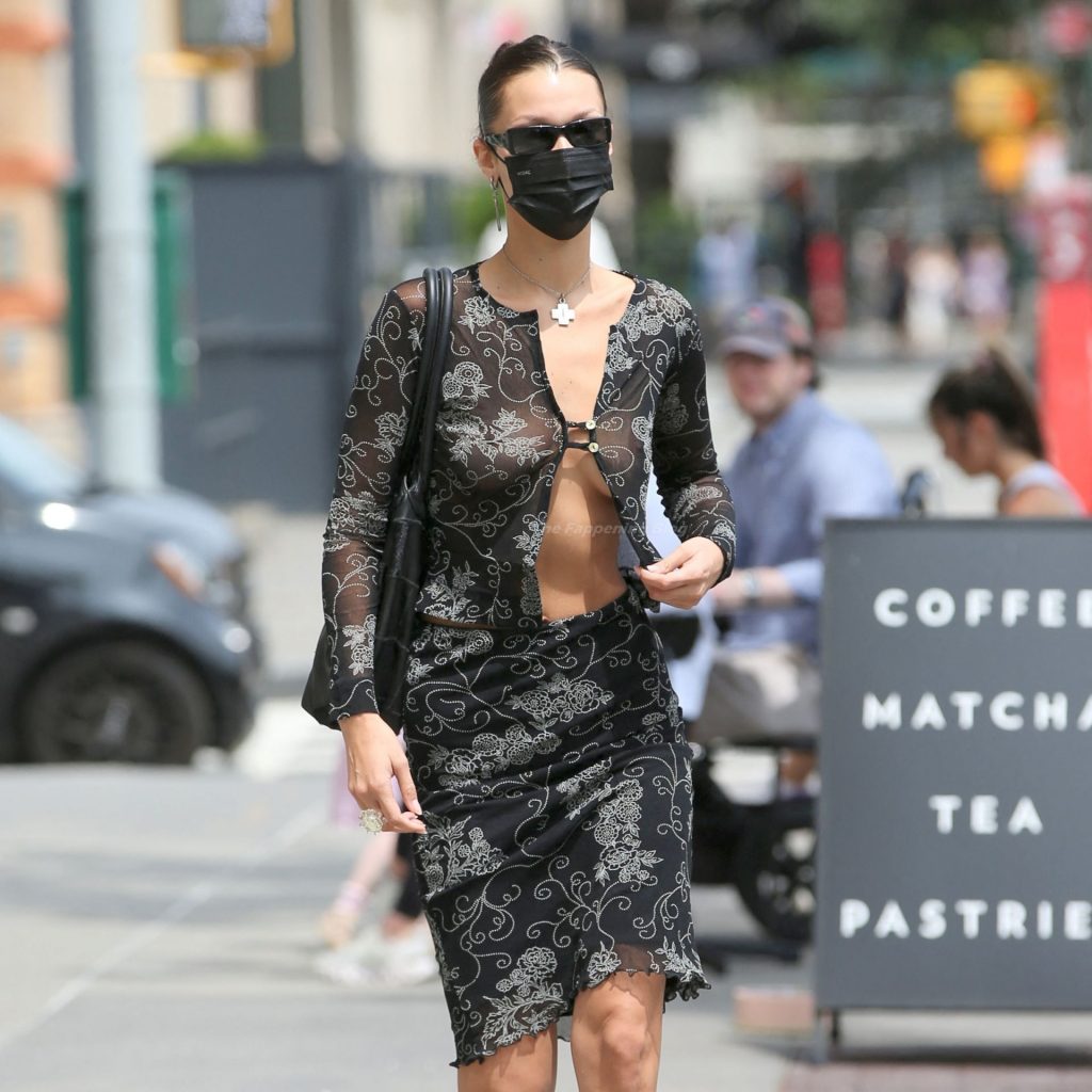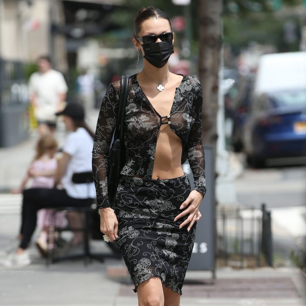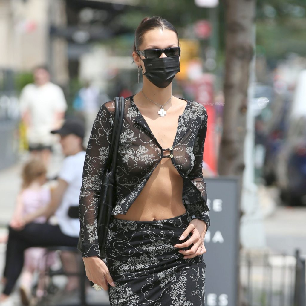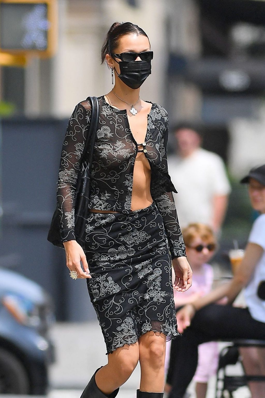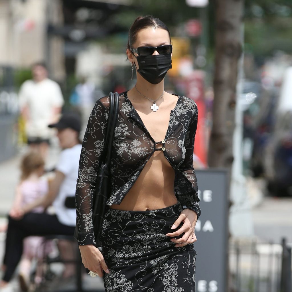 Модель Белла Хадид отправляется в аэропорт в Нью-Йорке, 01.08.2021. Она показывает не только живот, отказавшись от бюстгальтера в комплекте из узорчатой сетки.