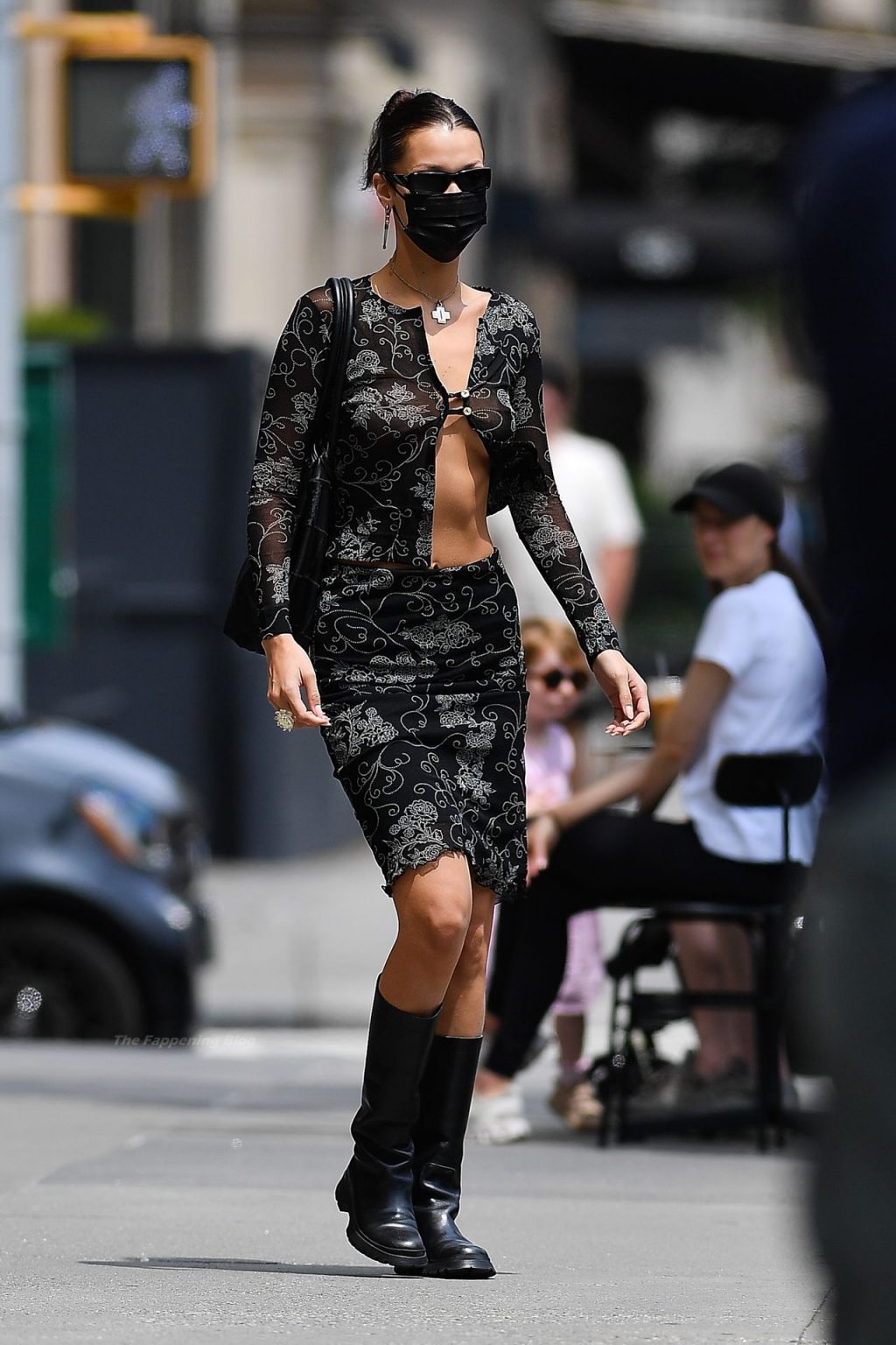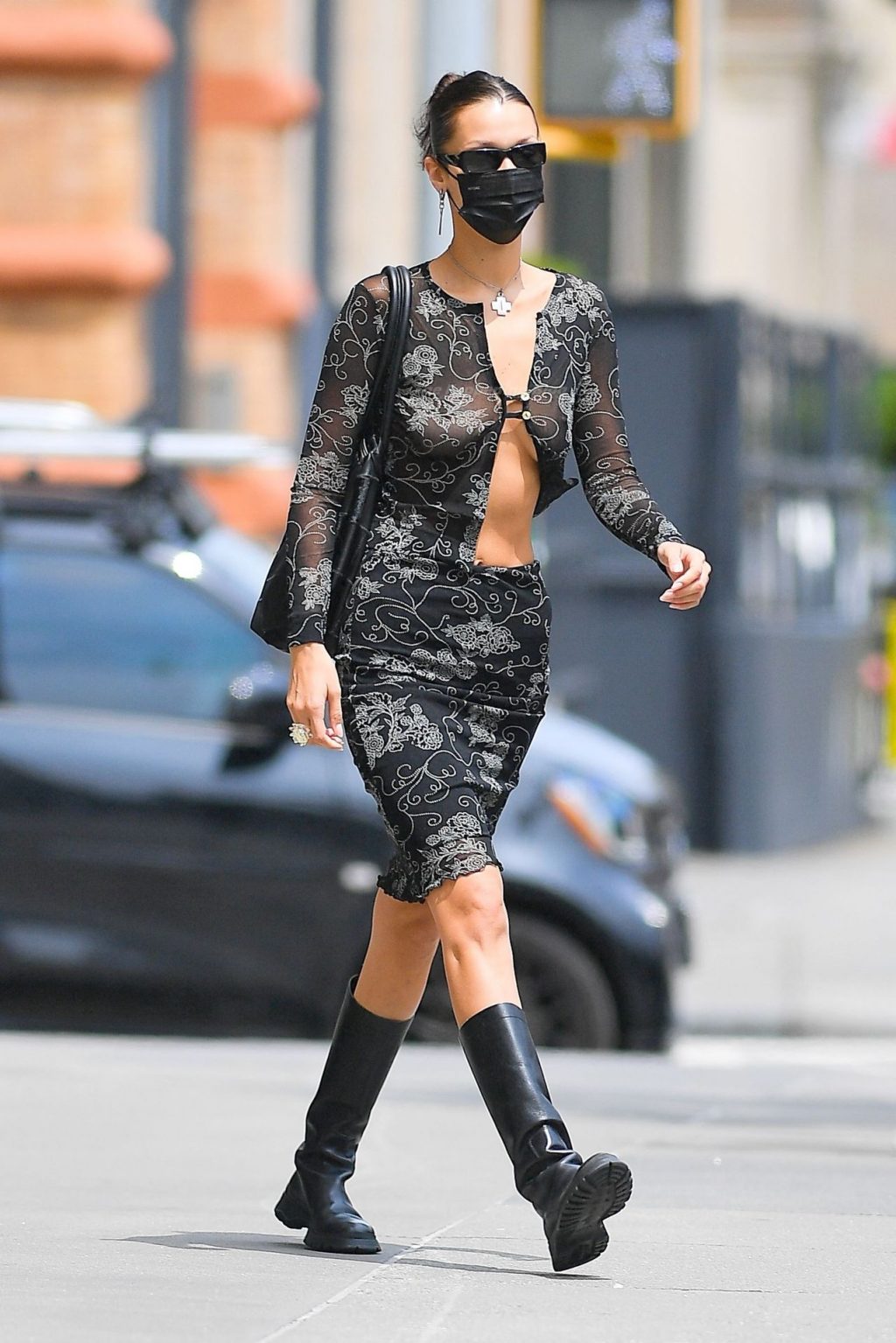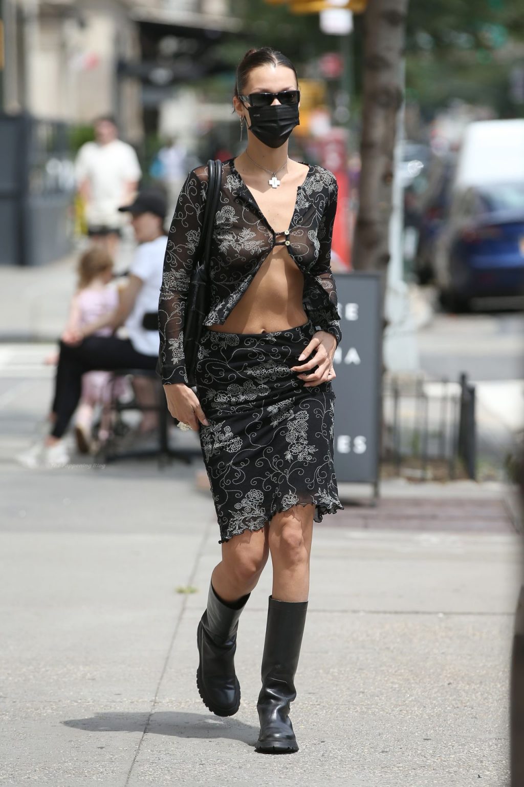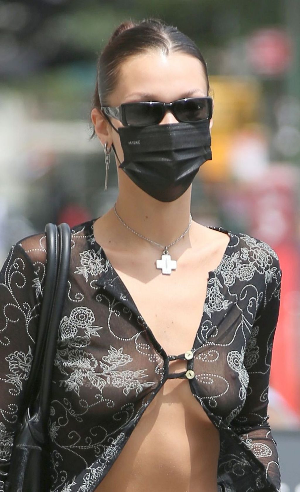 Модель Белла Хадид отправляется в аэропорт в Нью-Йорке, 01.08.2021. Она показывает не только живот, отказавшись от бюстгальтера в комплекте из узорчатой сетки.