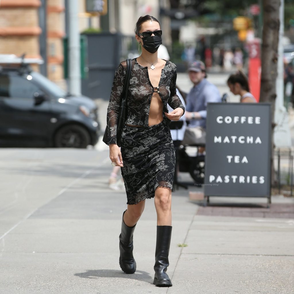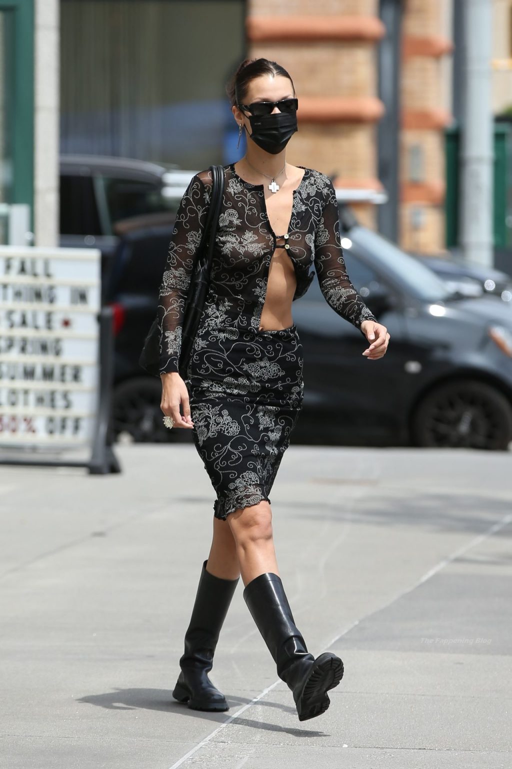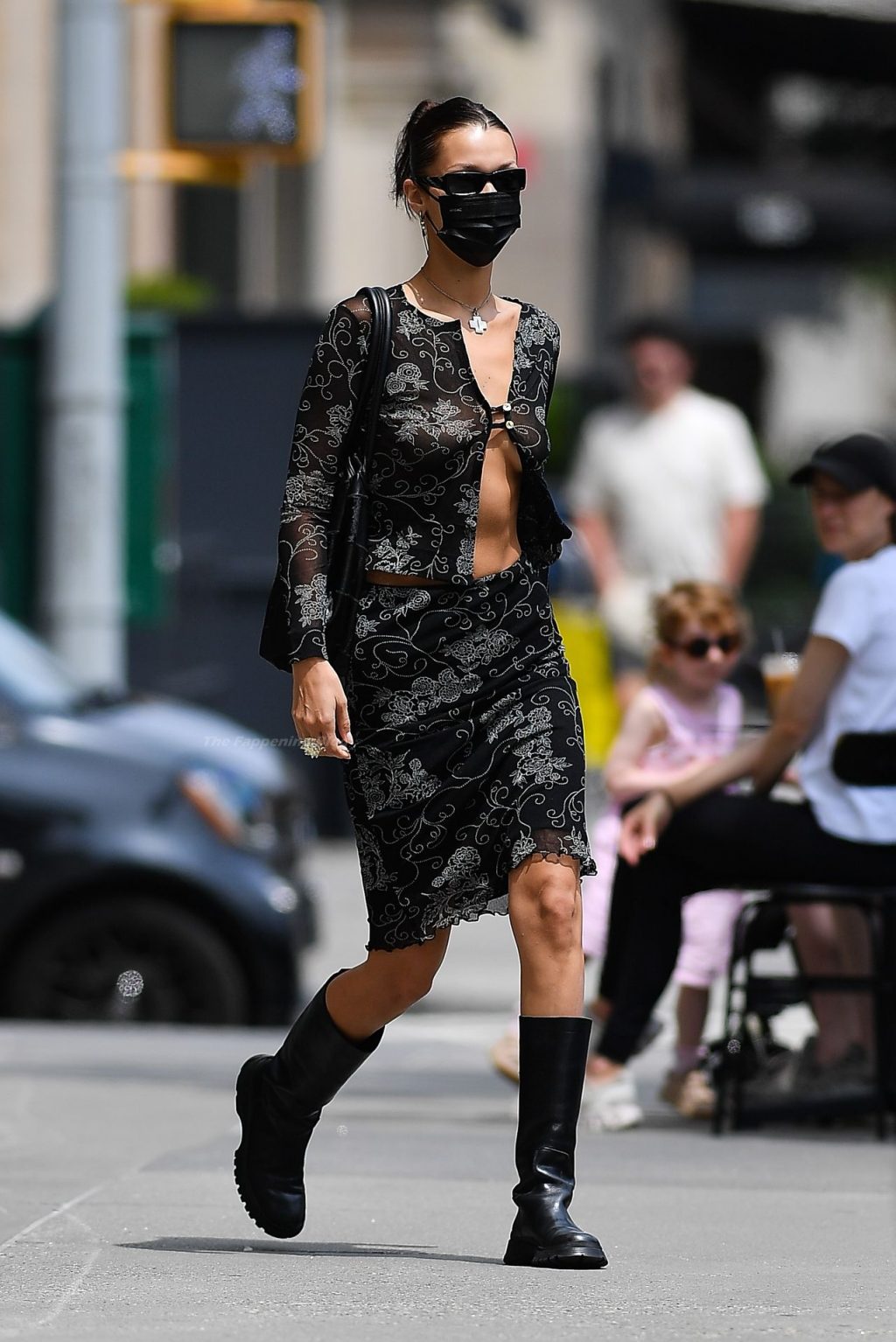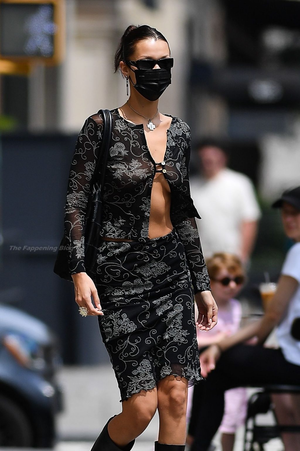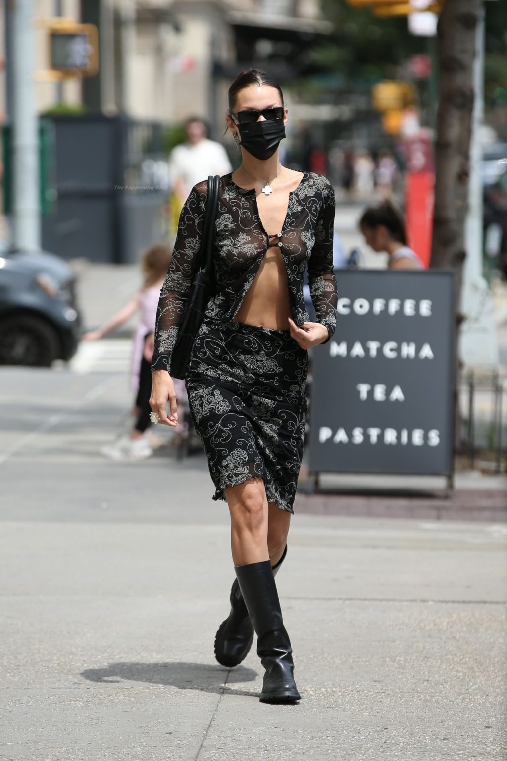 Модель Белла Хадид отправляется в аэропорт в Нью-Йорке, 01.08.2021. Она показывает не только живот, отказавшись от бюстгальтера в комплекте из узорчатой сетки.