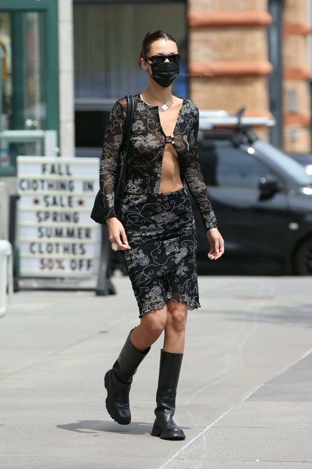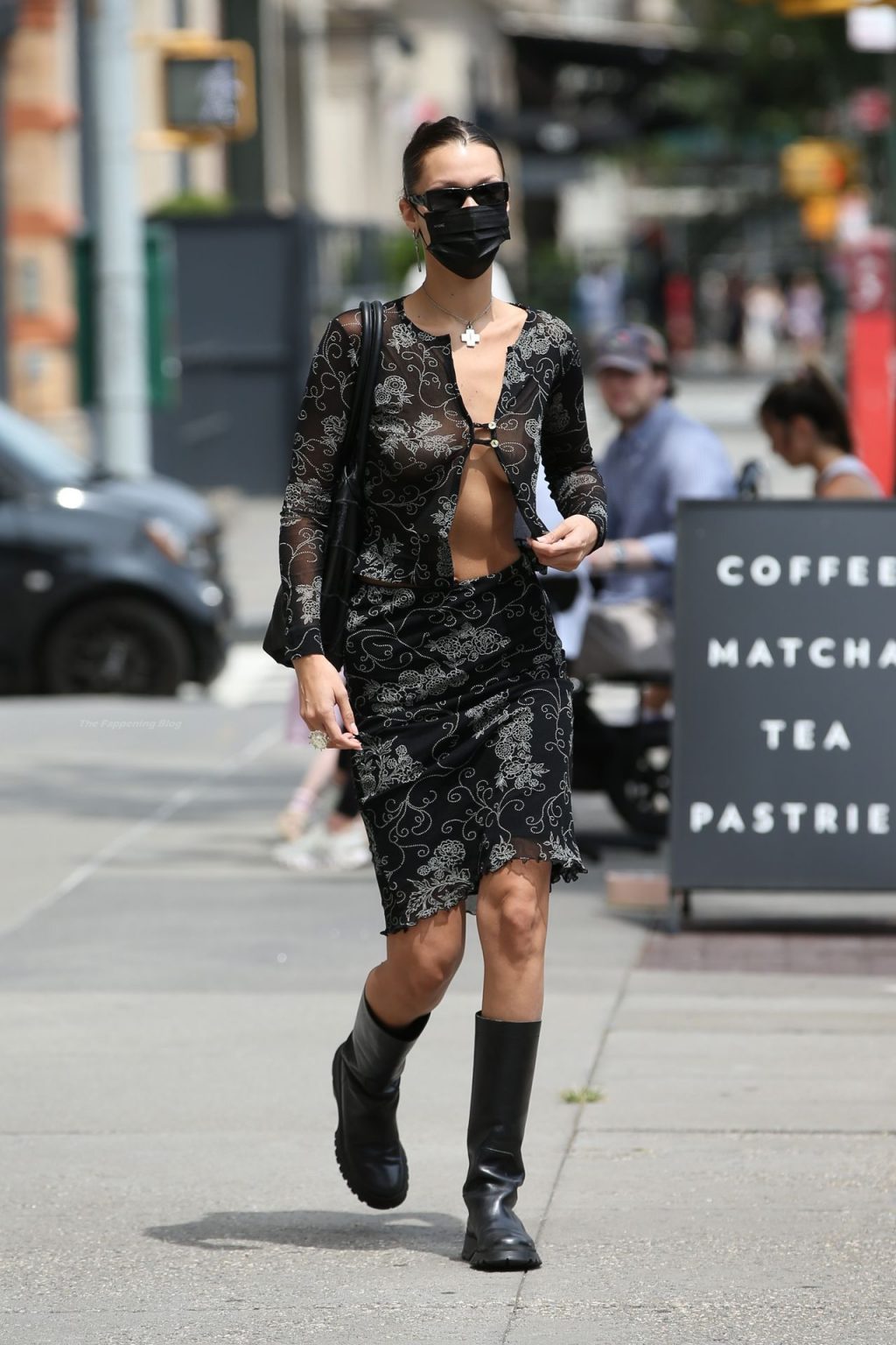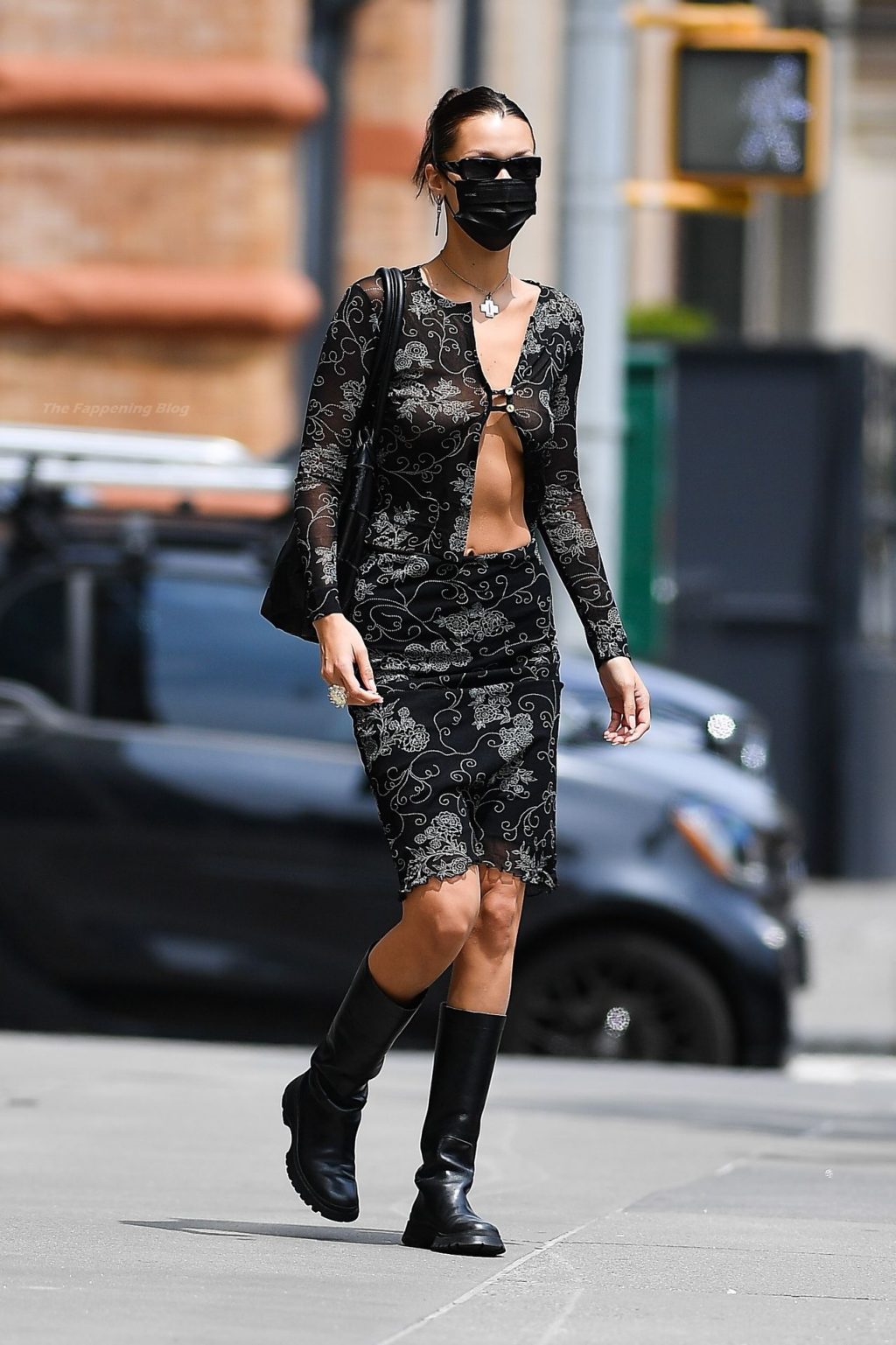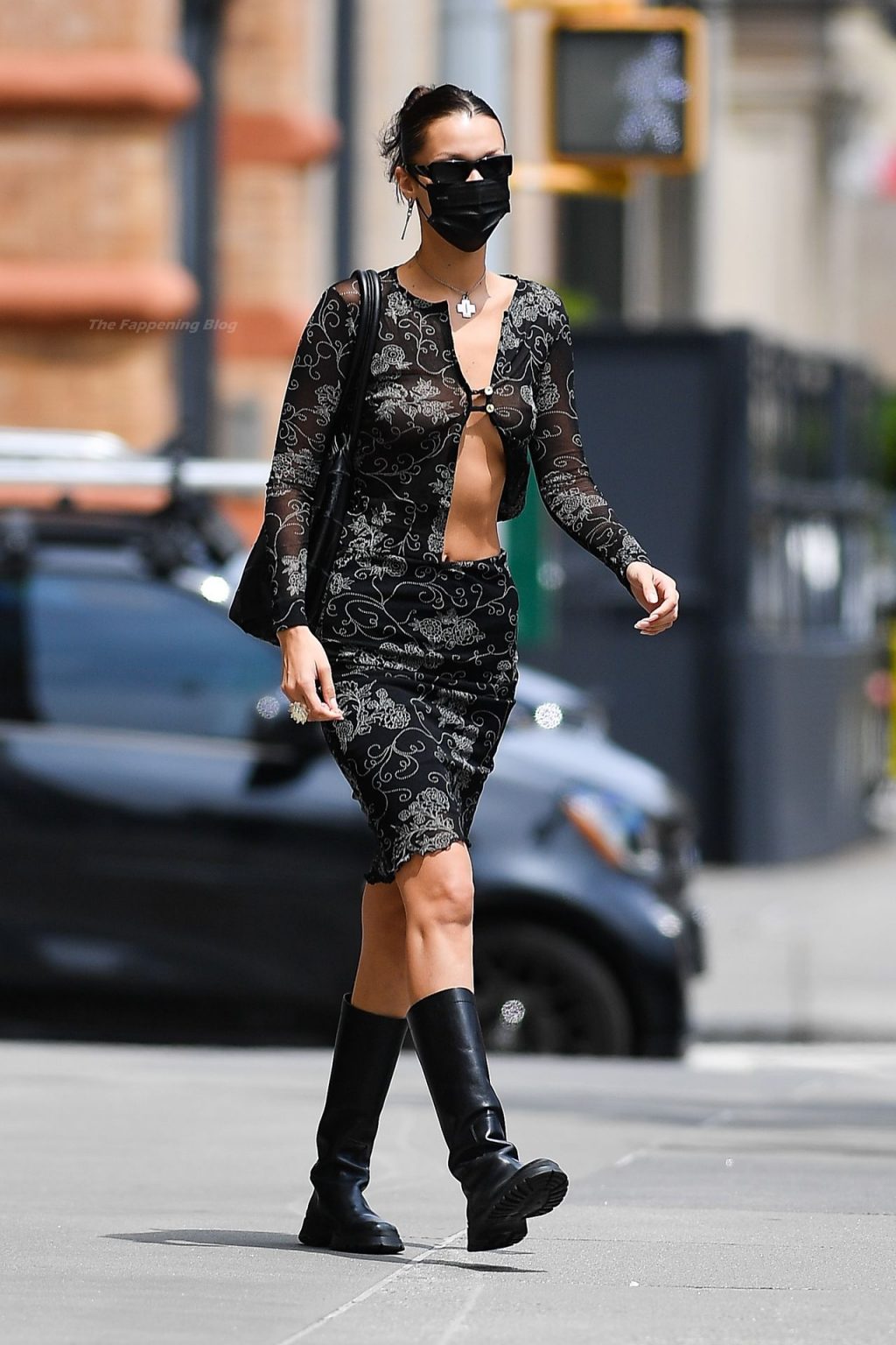 Модель Белла Хадид отправляется в аэропорт в Нью-Йорке, 01.08.2021. Она показывает не только живот, отказавшись от бюстгальтера в комплекте из узорчатой сетки.