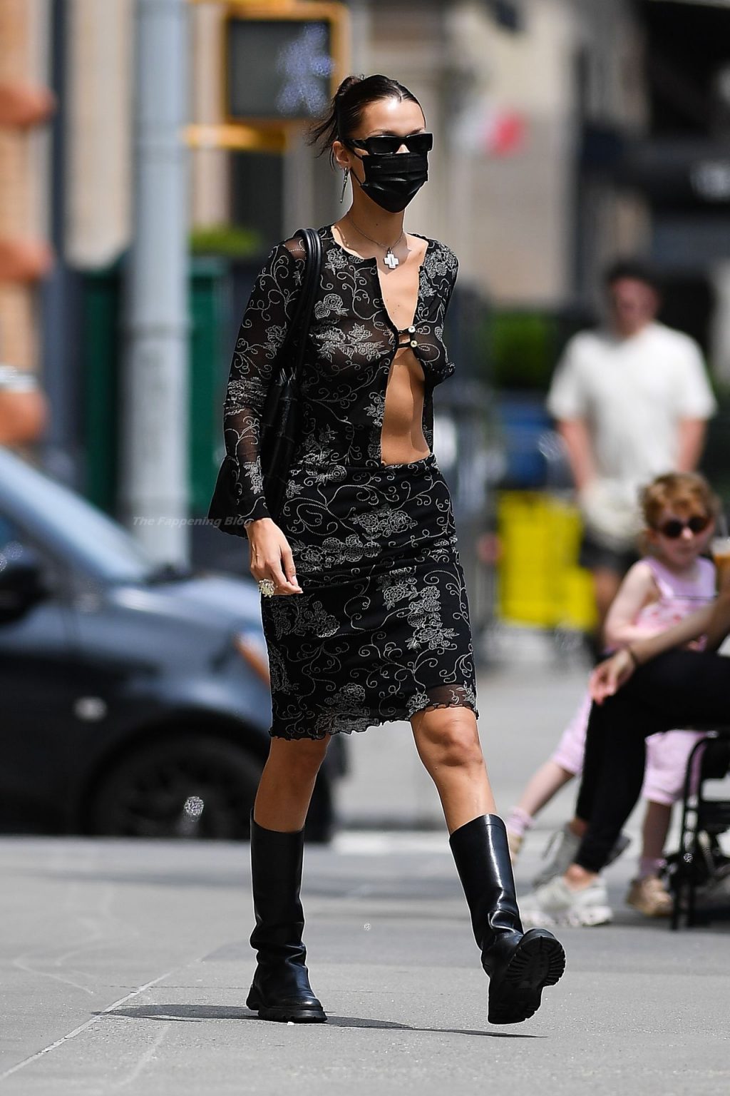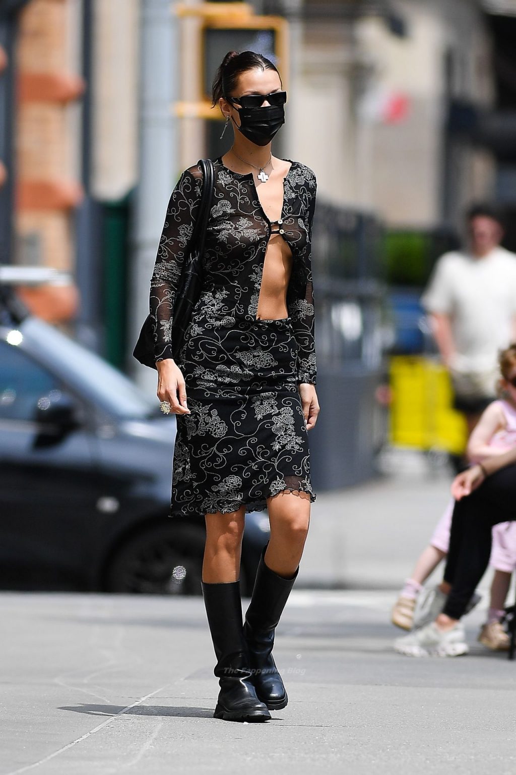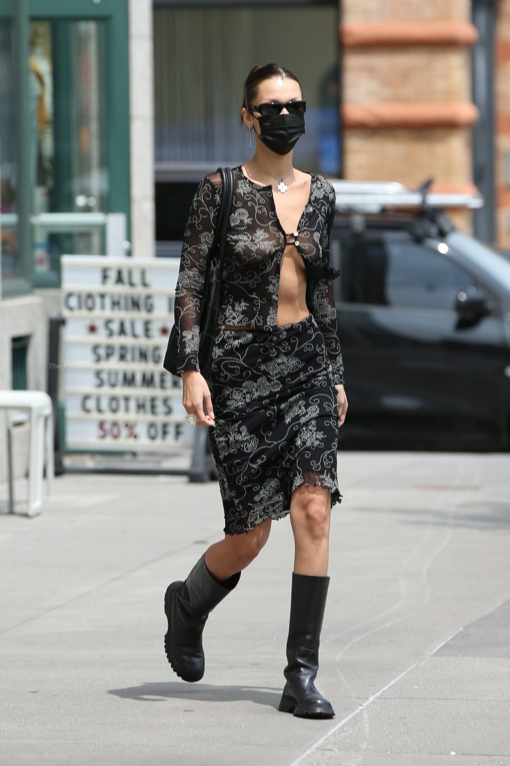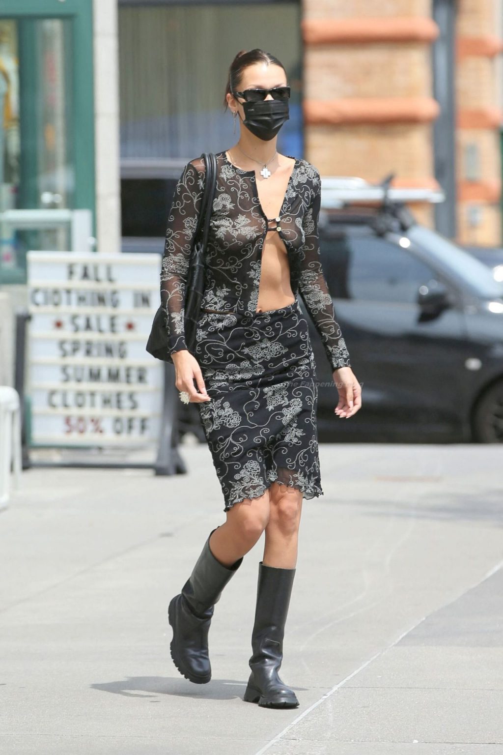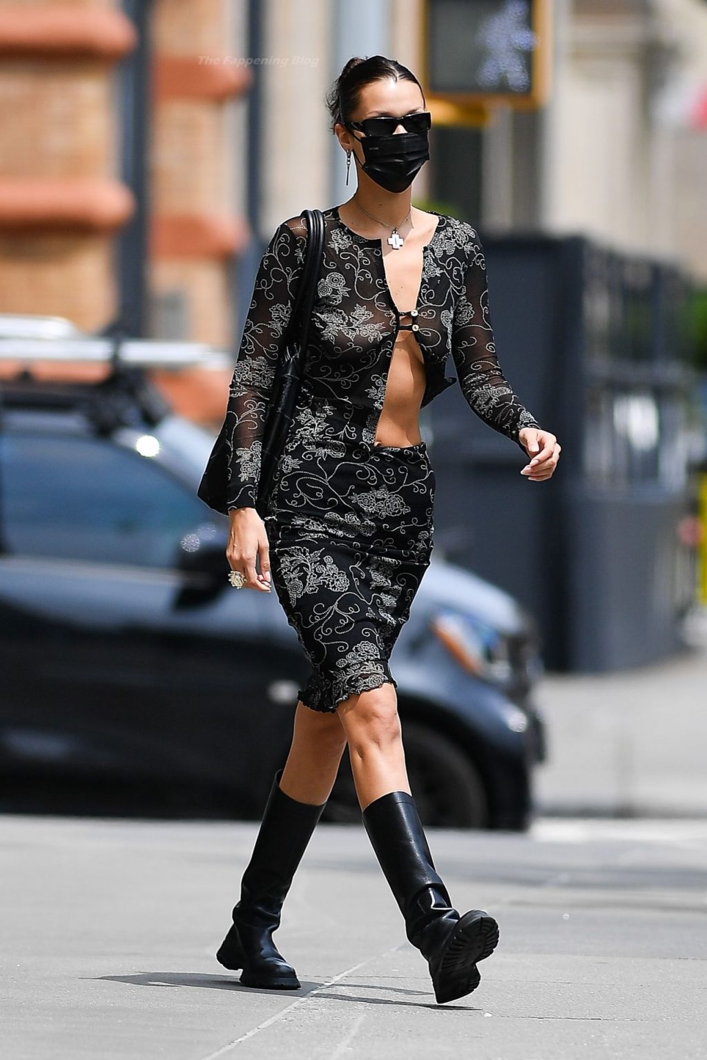 Модель Белла Хадид отправляется в аэропорт в Нью-Йорке, 01.08.2021. Она показывает не только живот, отказавшись от бюстгальтера в комплекте из узорчатой сетки.