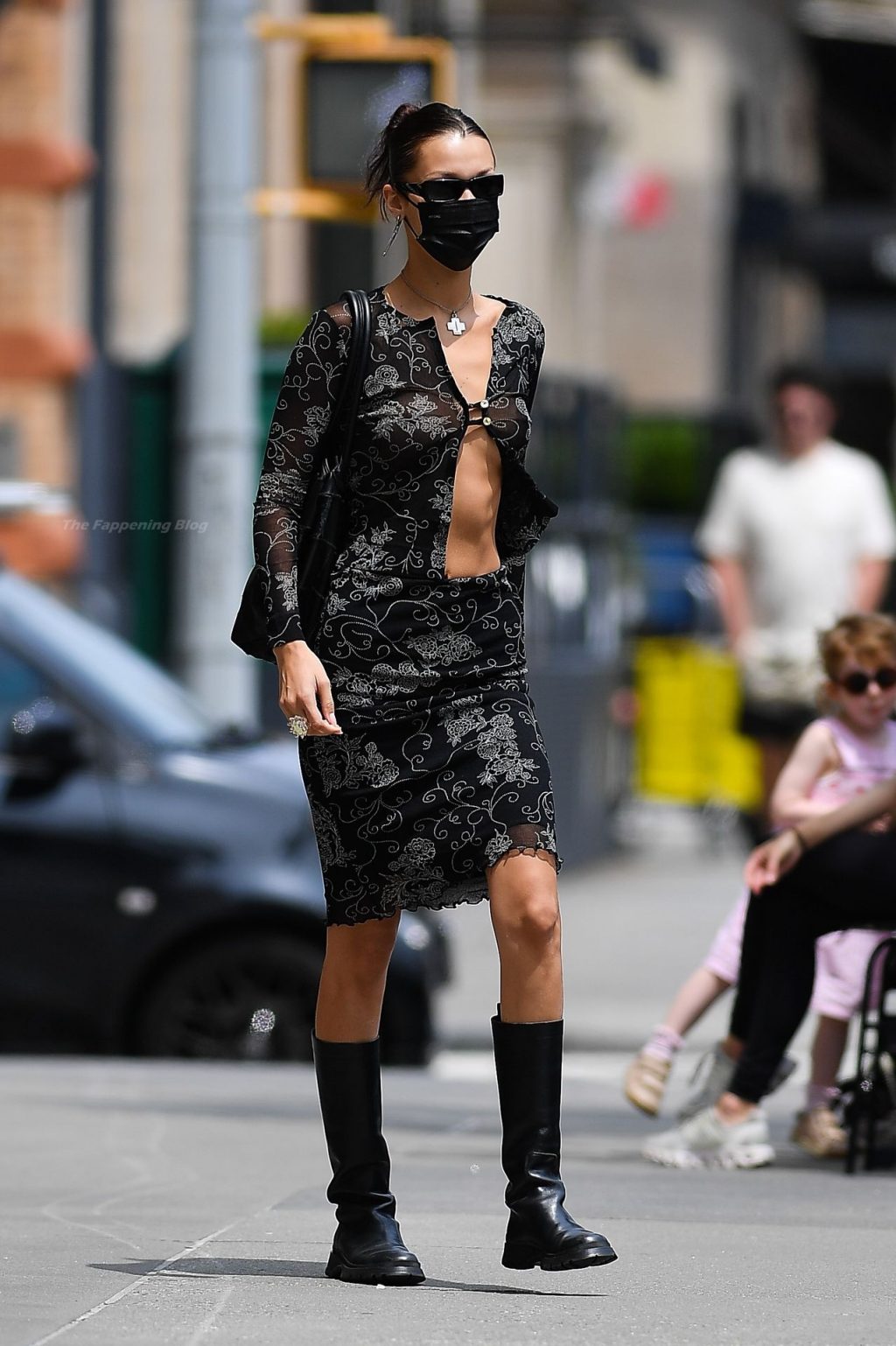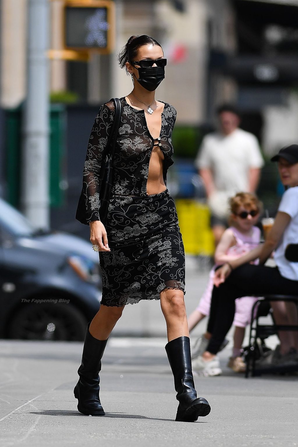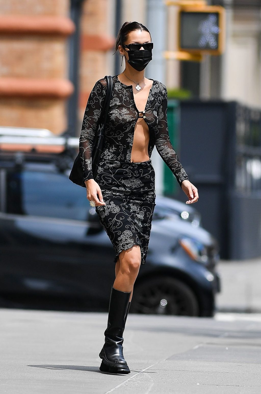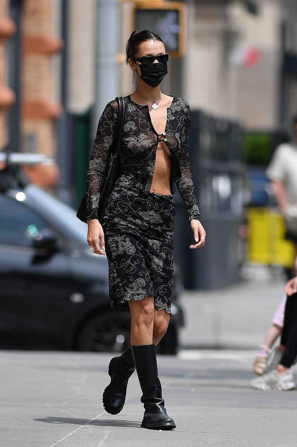 Модель Белла Хадид отправляется в аэропорт в Нью-Йорке, 01.08.2021. Она показывает не только живот, отказавшись от бюстгальтера в комплекте из узорчатой сетки.