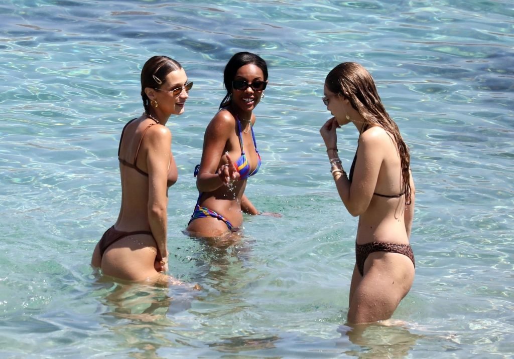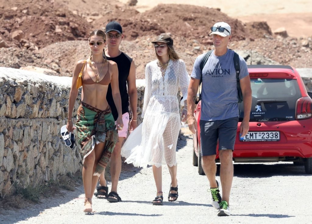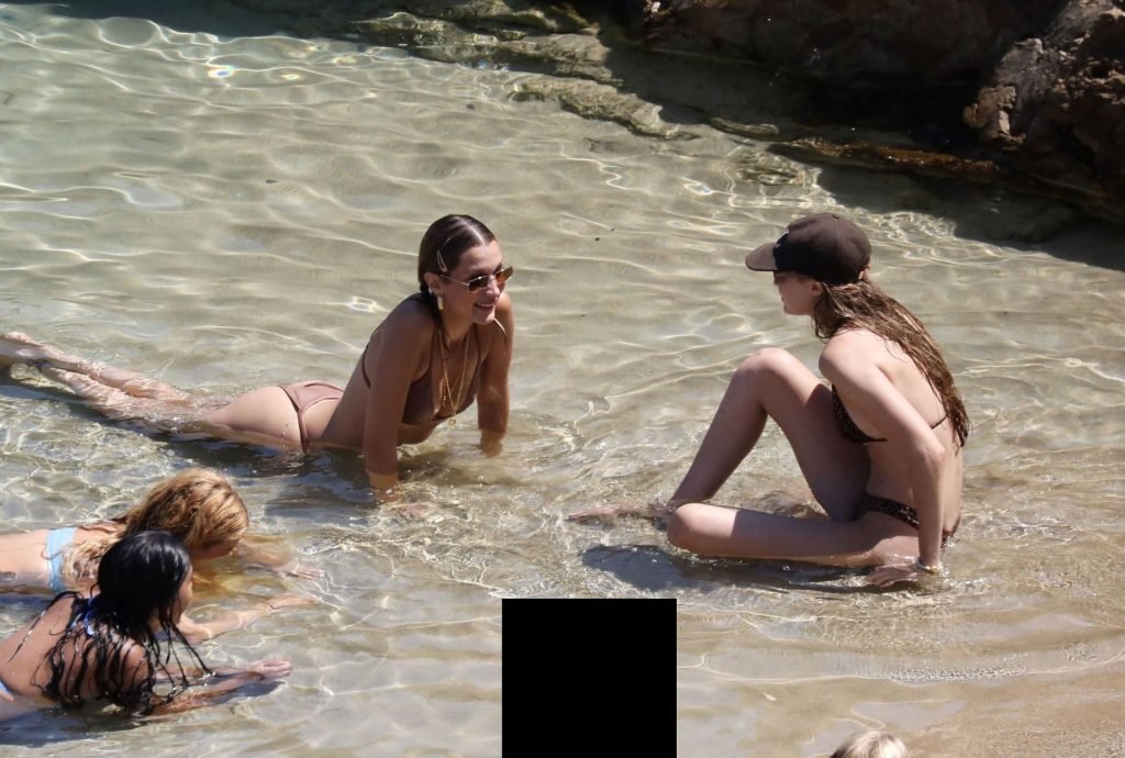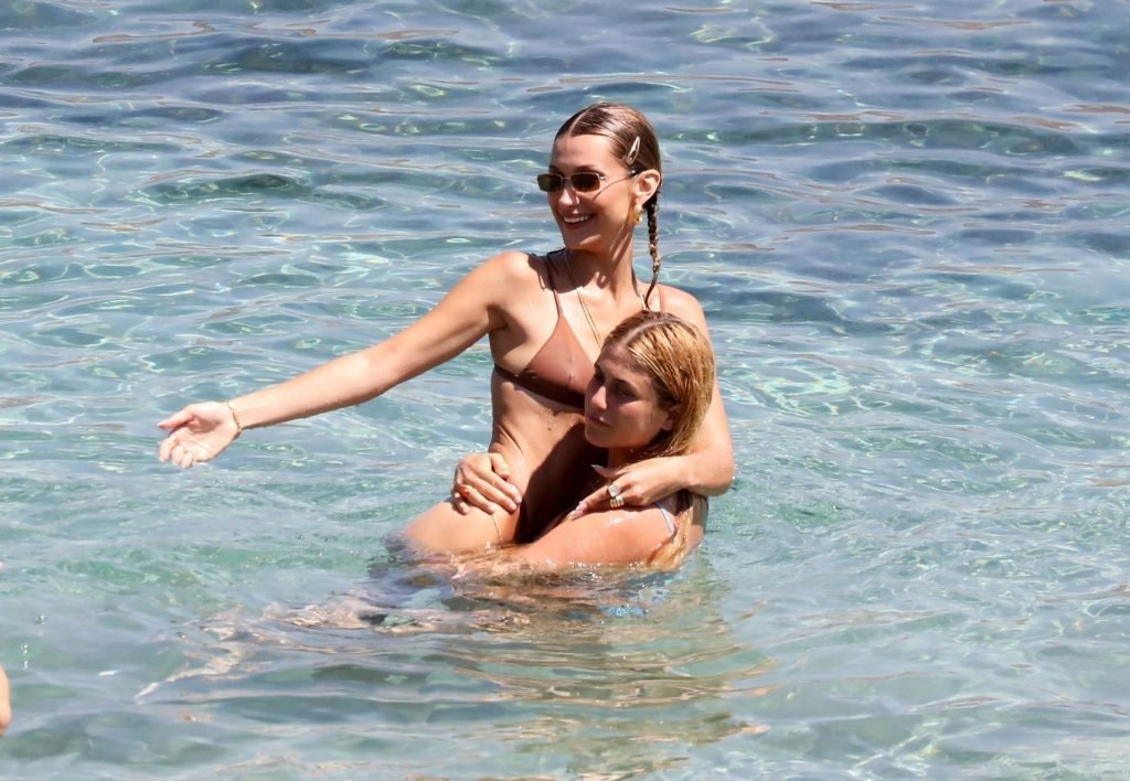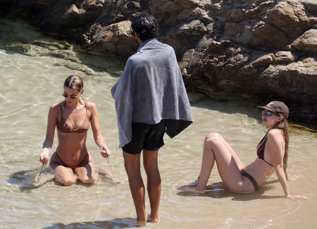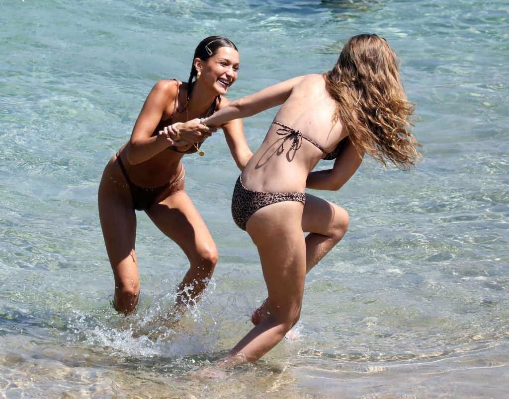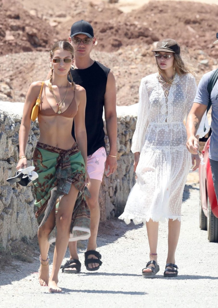 Сестры Белла Хадид и Джиджи Хадид были замечены с друзьями, проводящими время на пляже во время отпуска на Миконосе, 29.07.2019.
