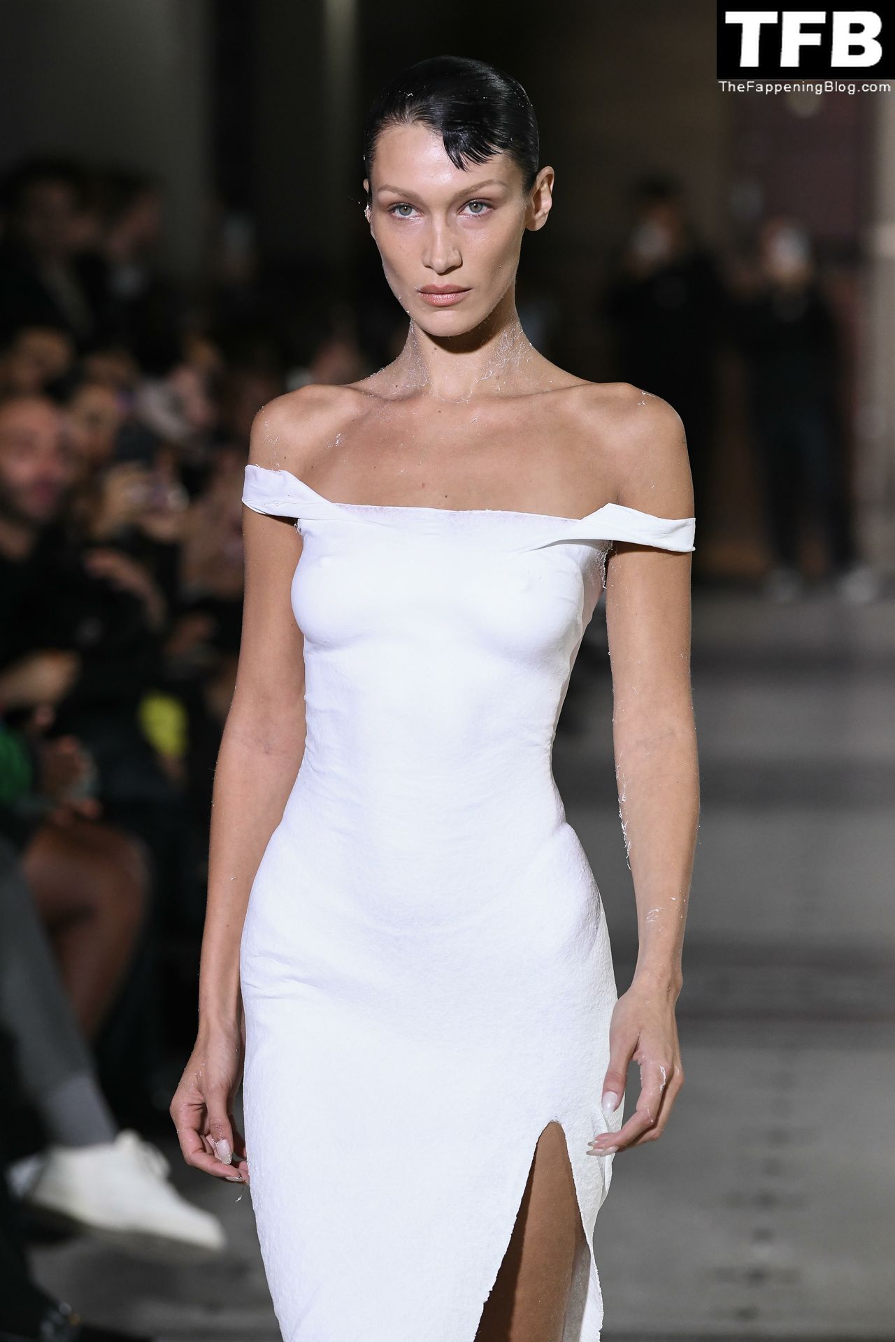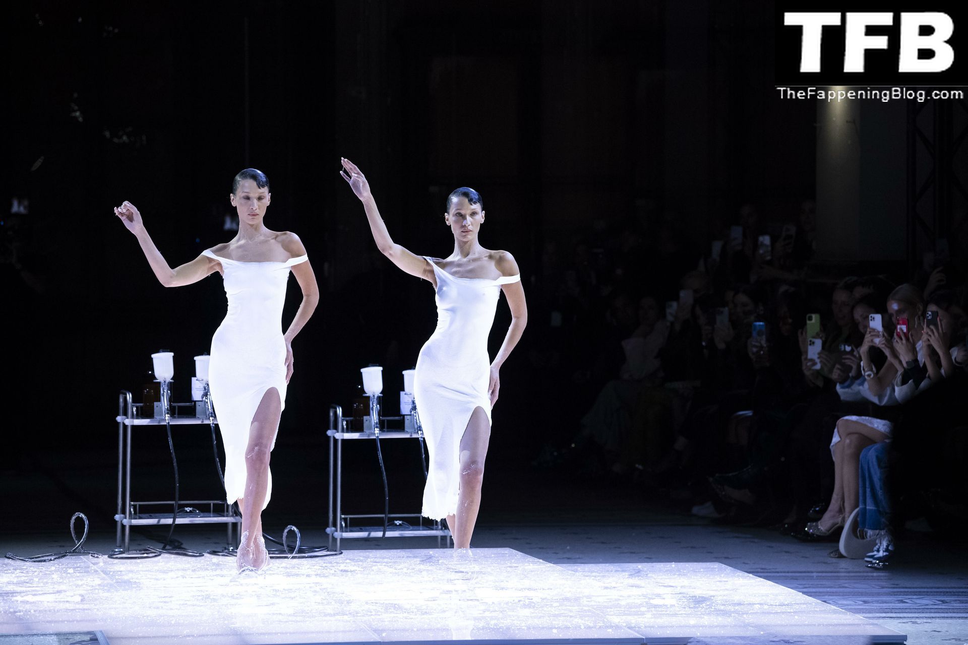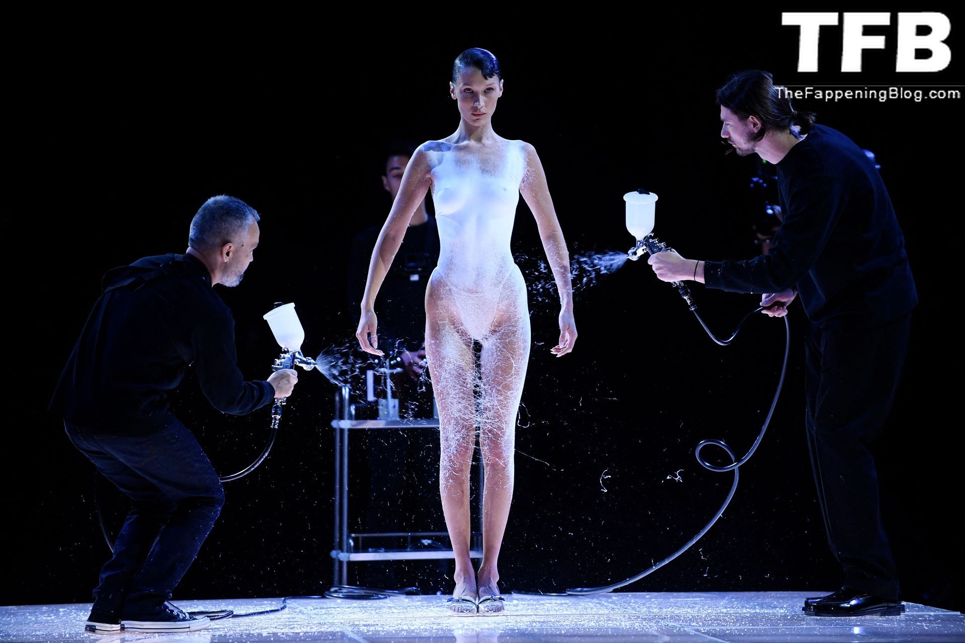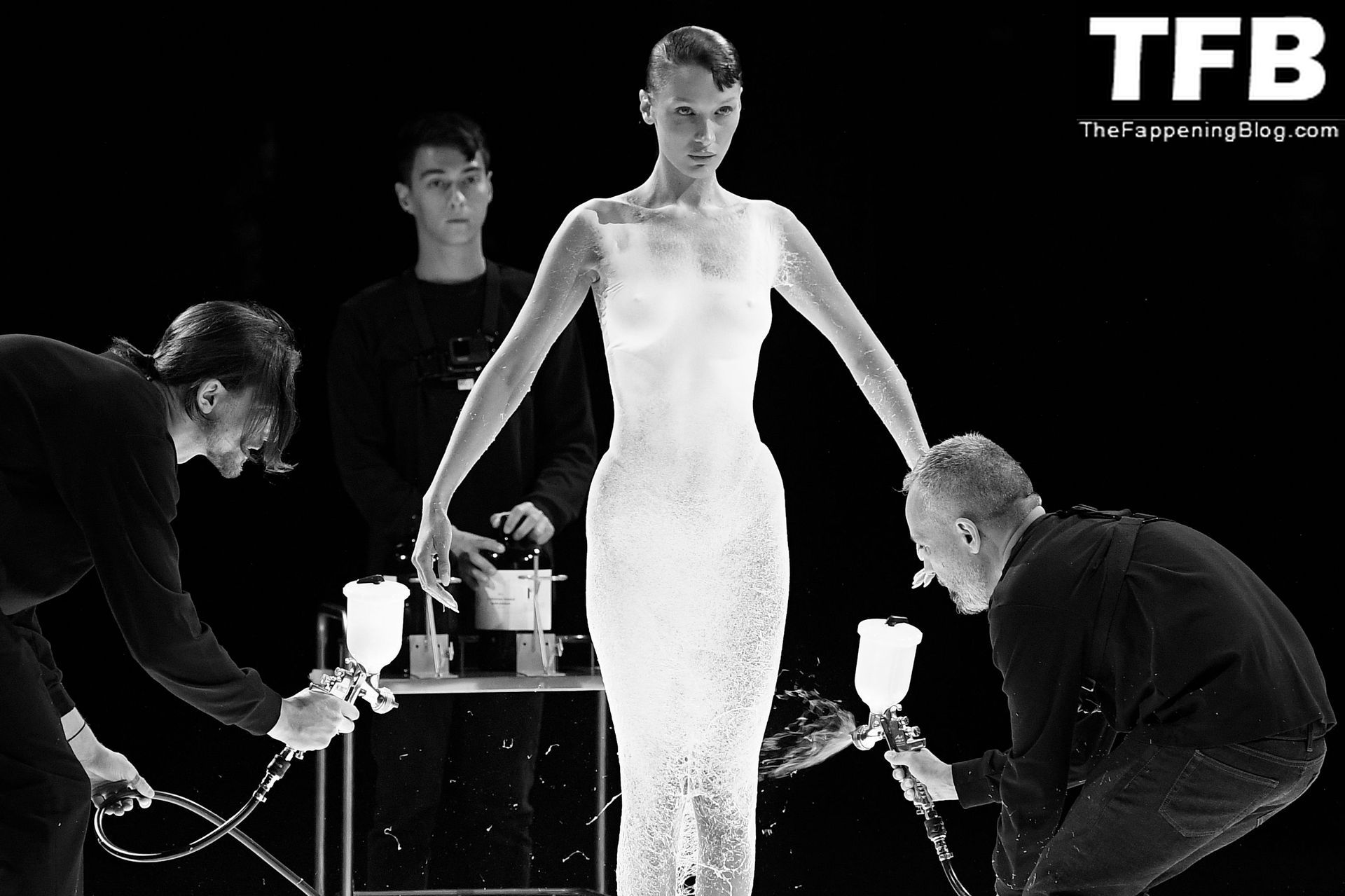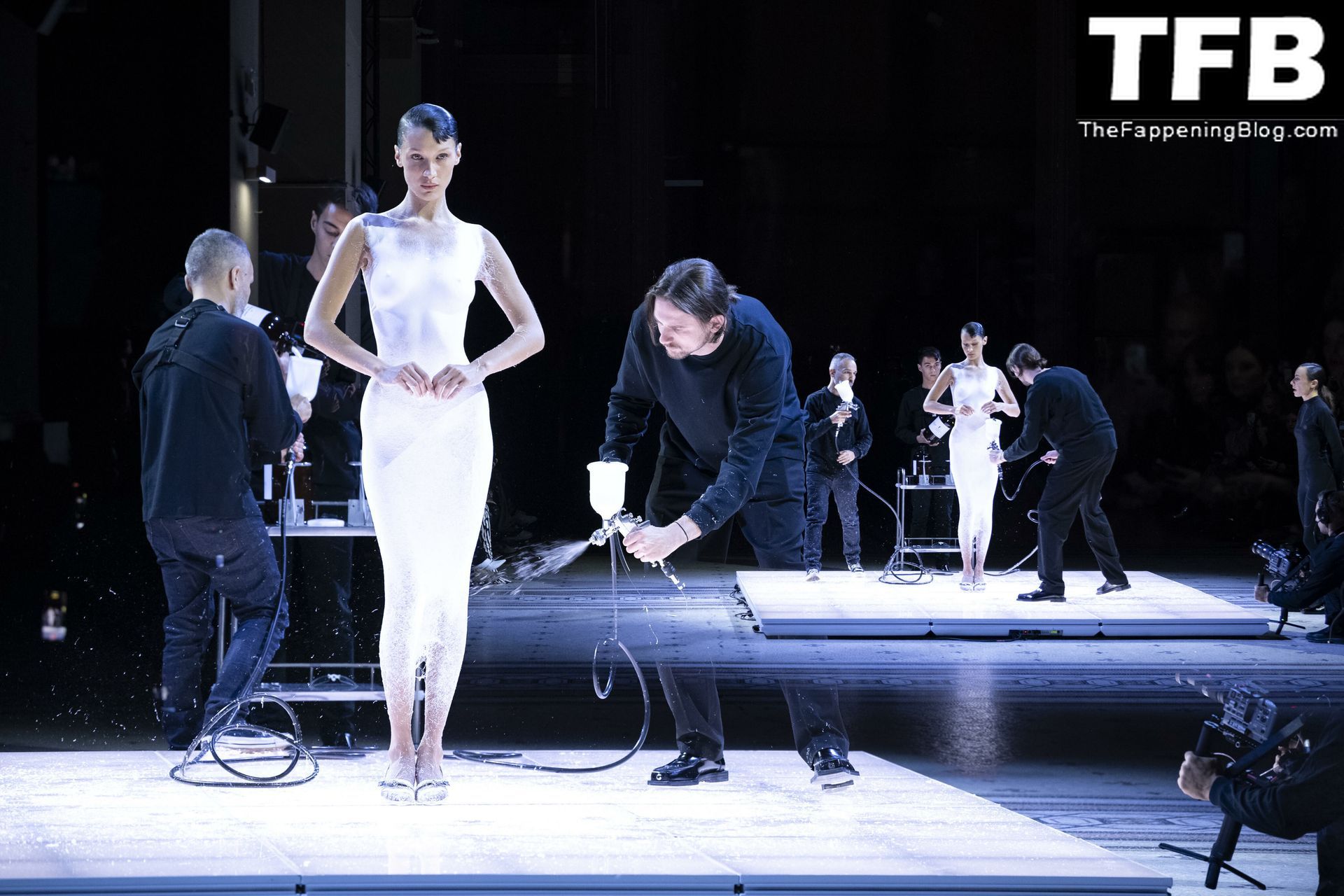Белла Хадид появляется на показе мод Coperni во время Парижской недели моды, 30.09.2022. Модель получает платье, распылённое краской, прямо во время показа.