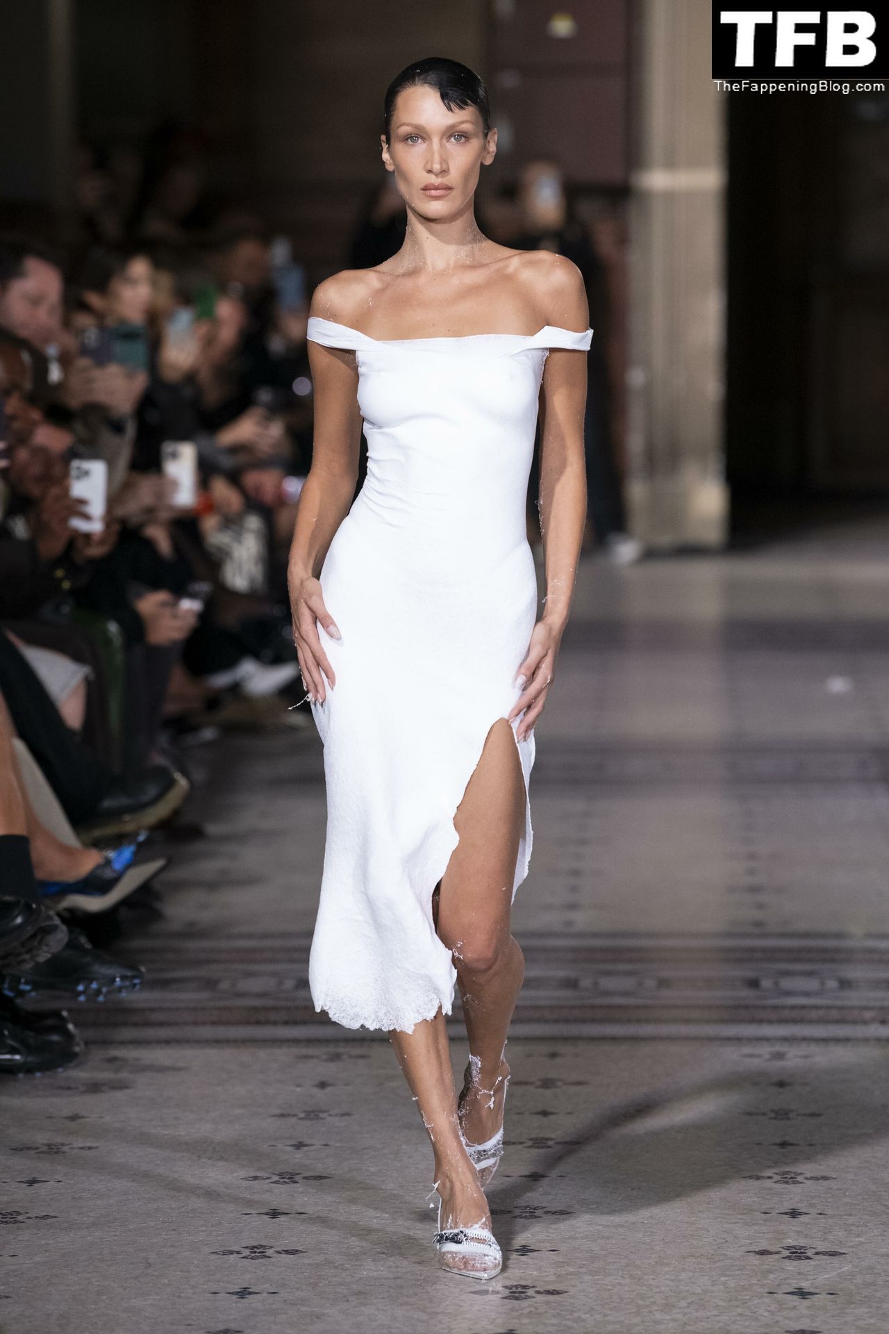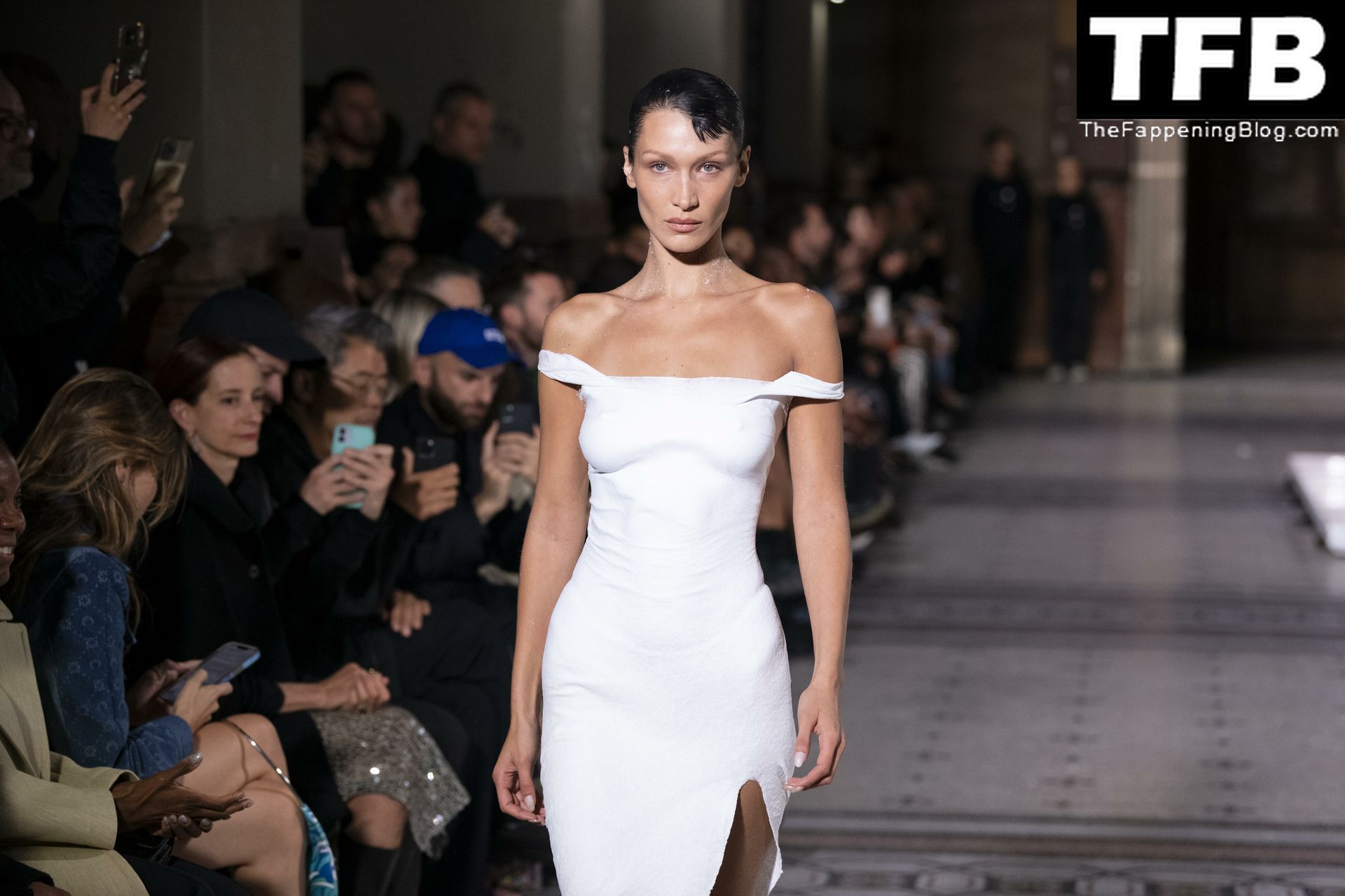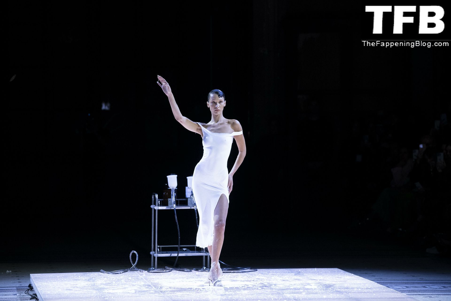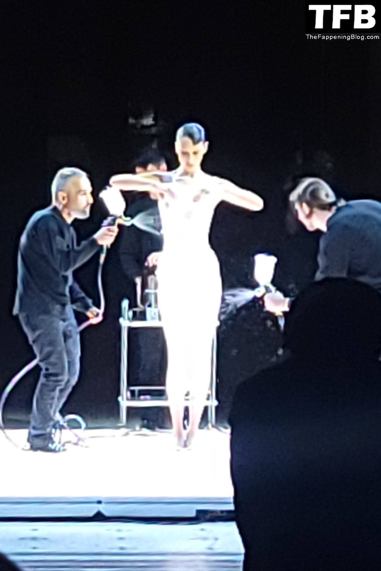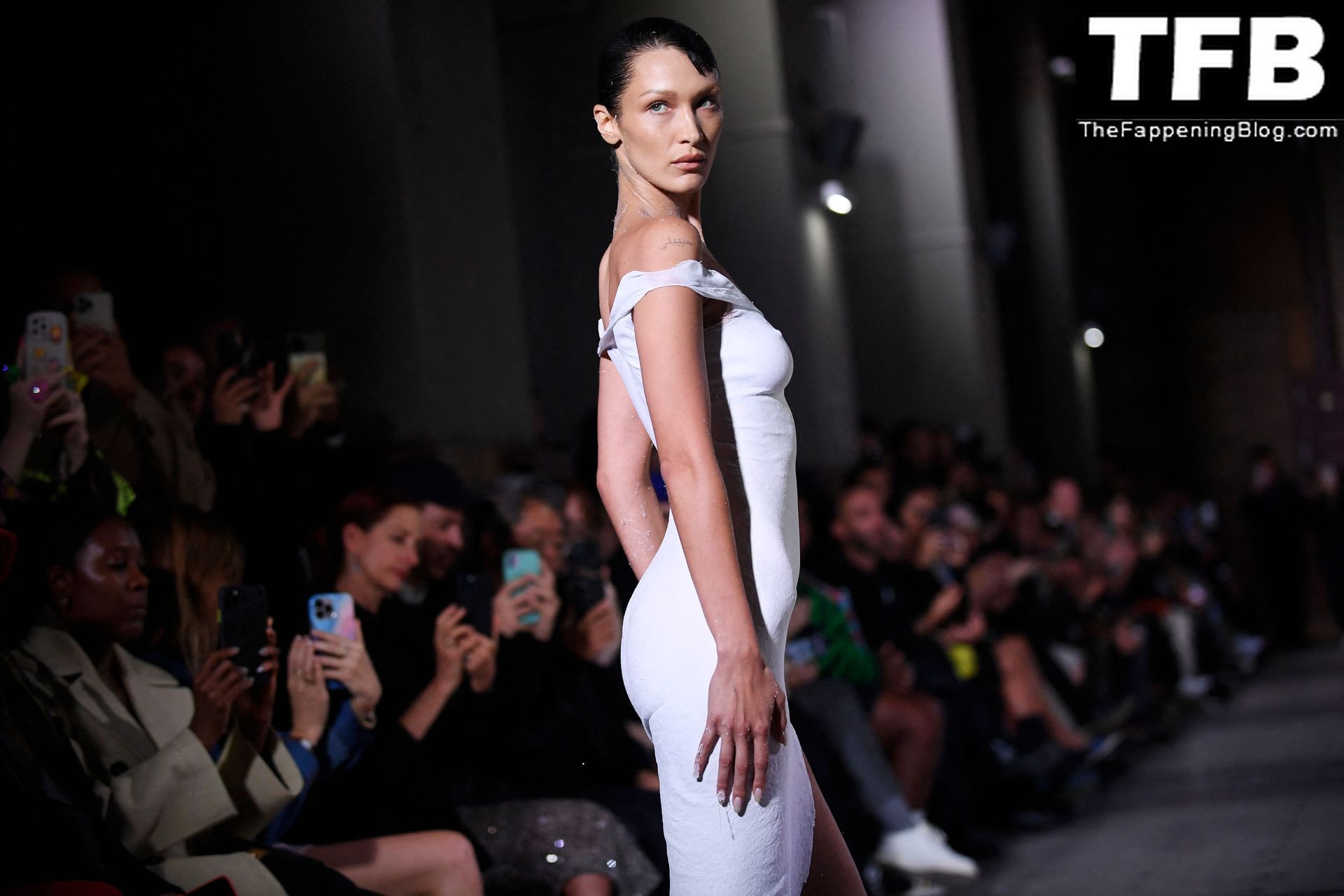 Белла Хадид появляется на показе мод Coperni во время Парижской недели моды, 30.09.2022. Модель получает платье, распылённое краской, прямо во время показа.