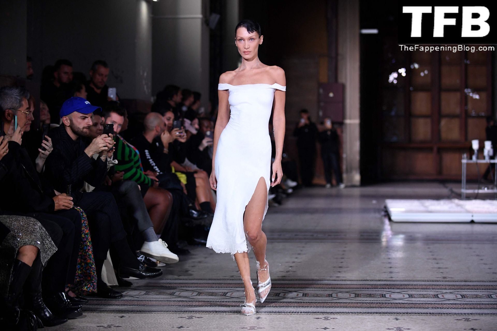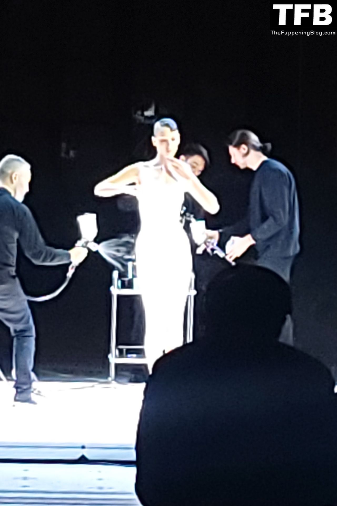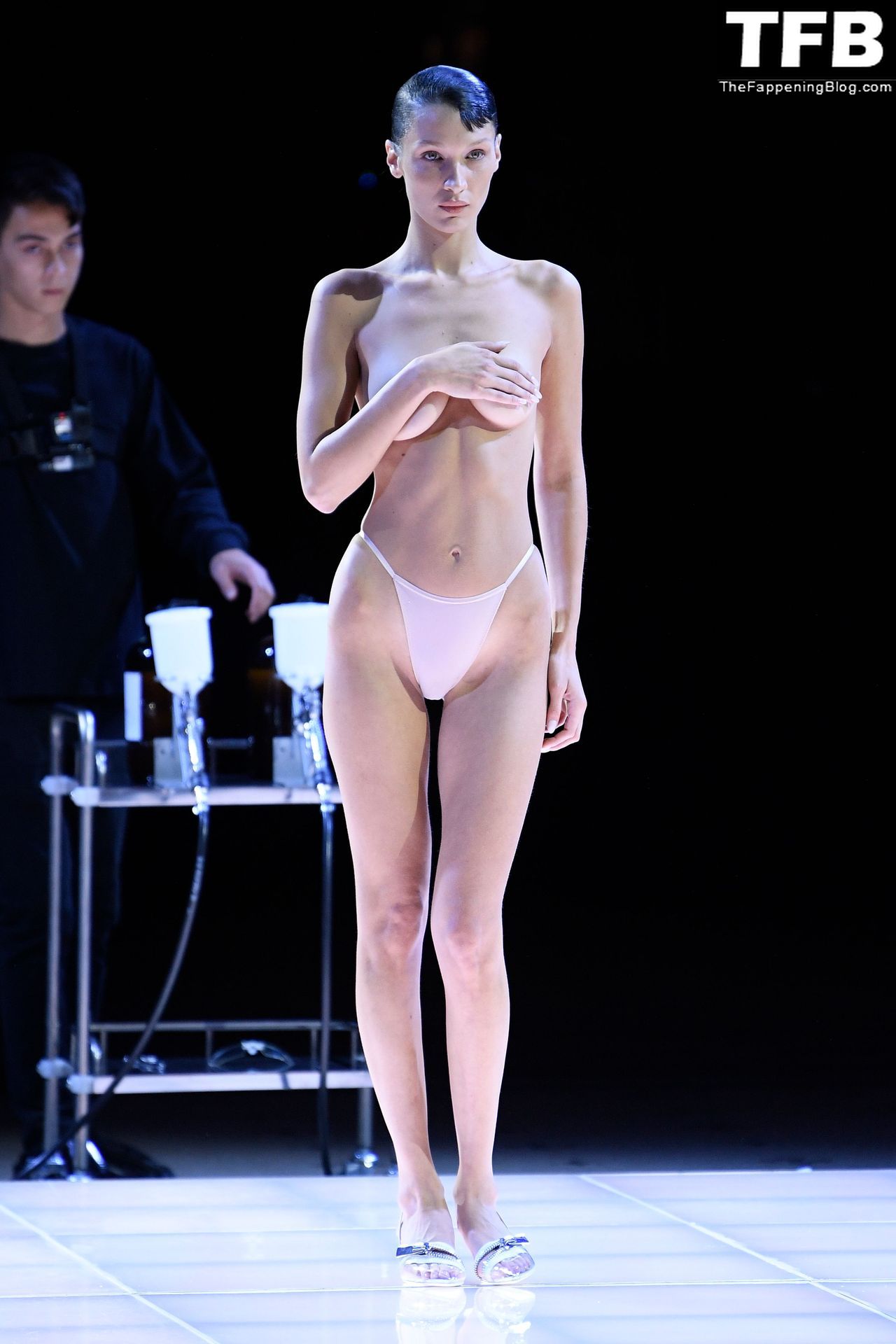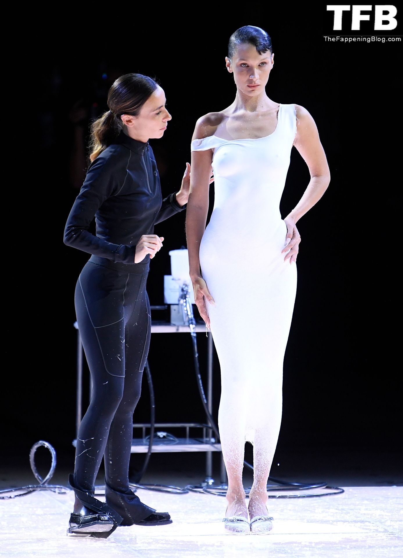 Белла Хадид появляется на показе мод Coperni во время Парижской недели моды, 30.09.2022. Модель получает платье, распылённое краской, прямо во время показа.