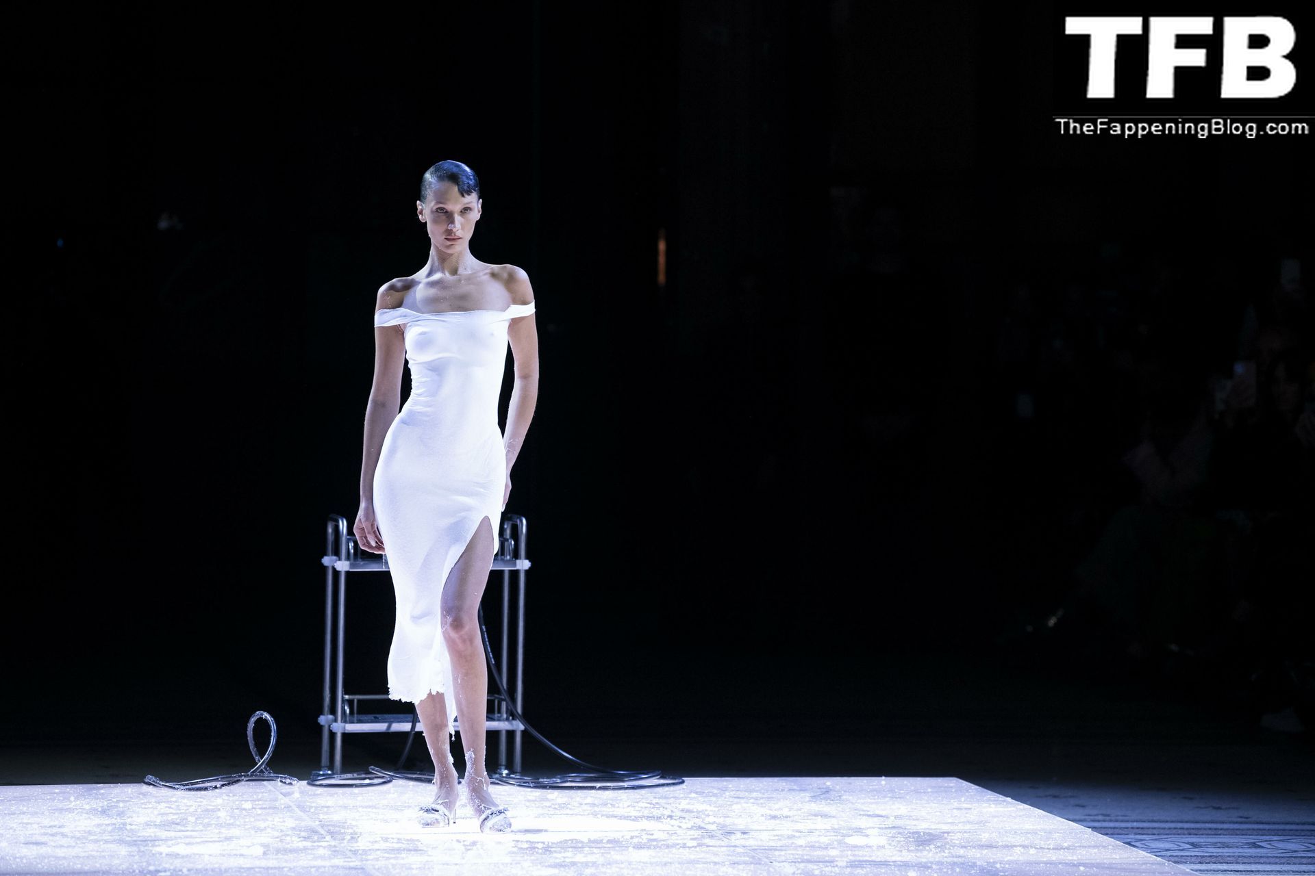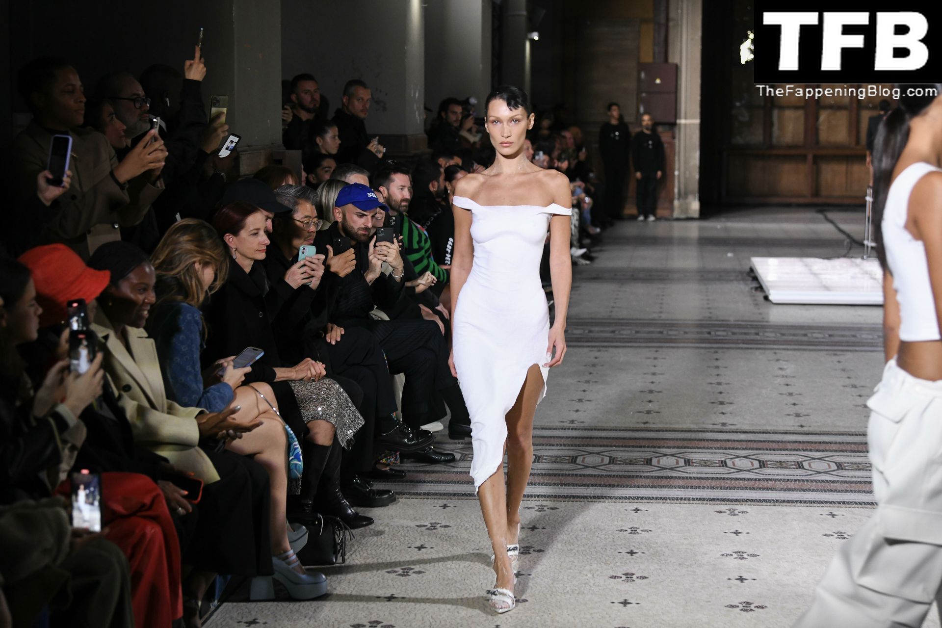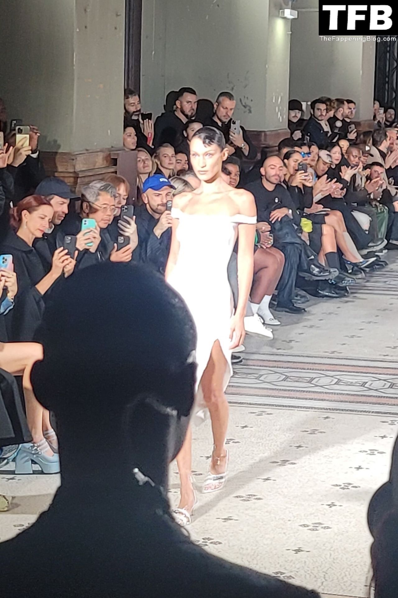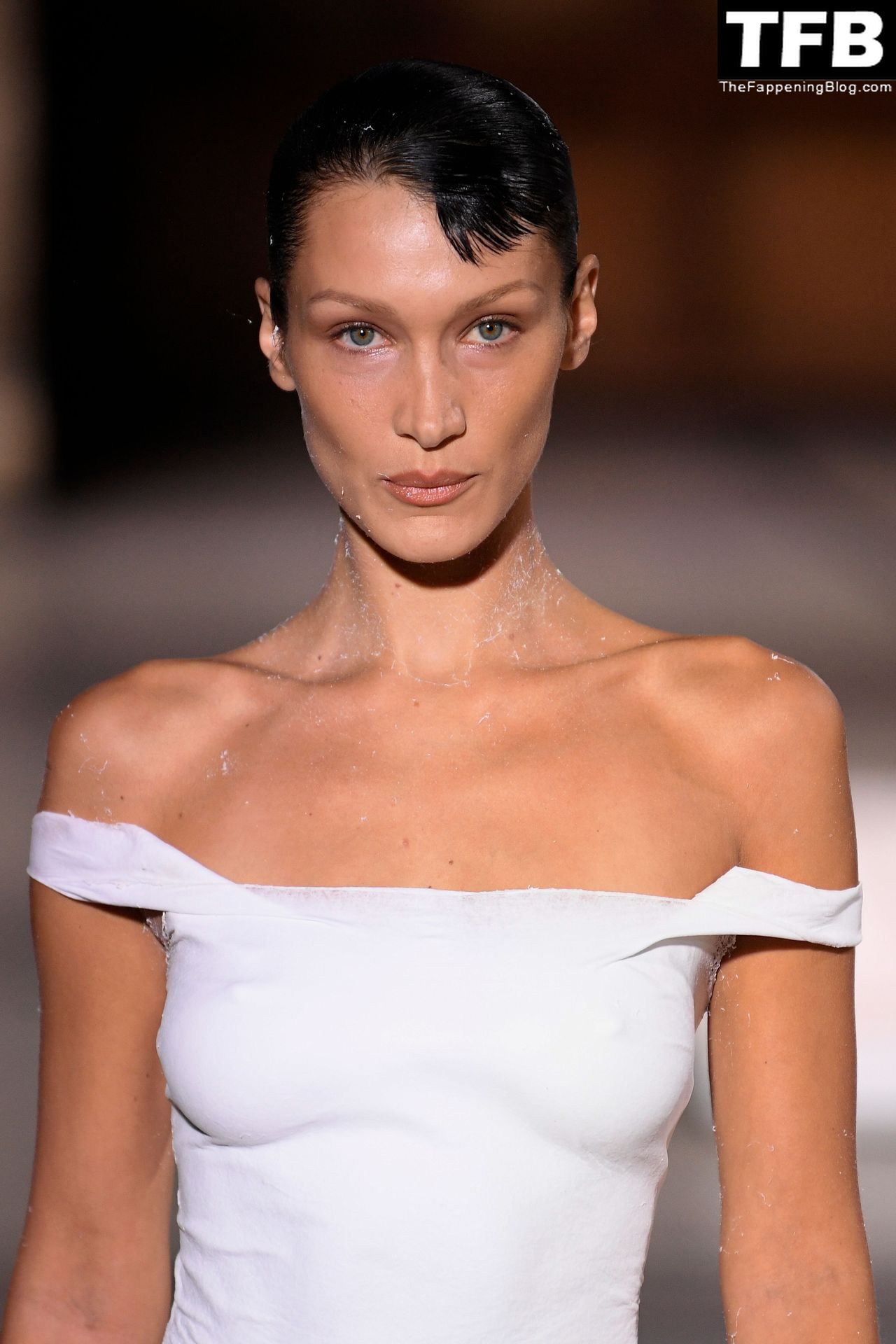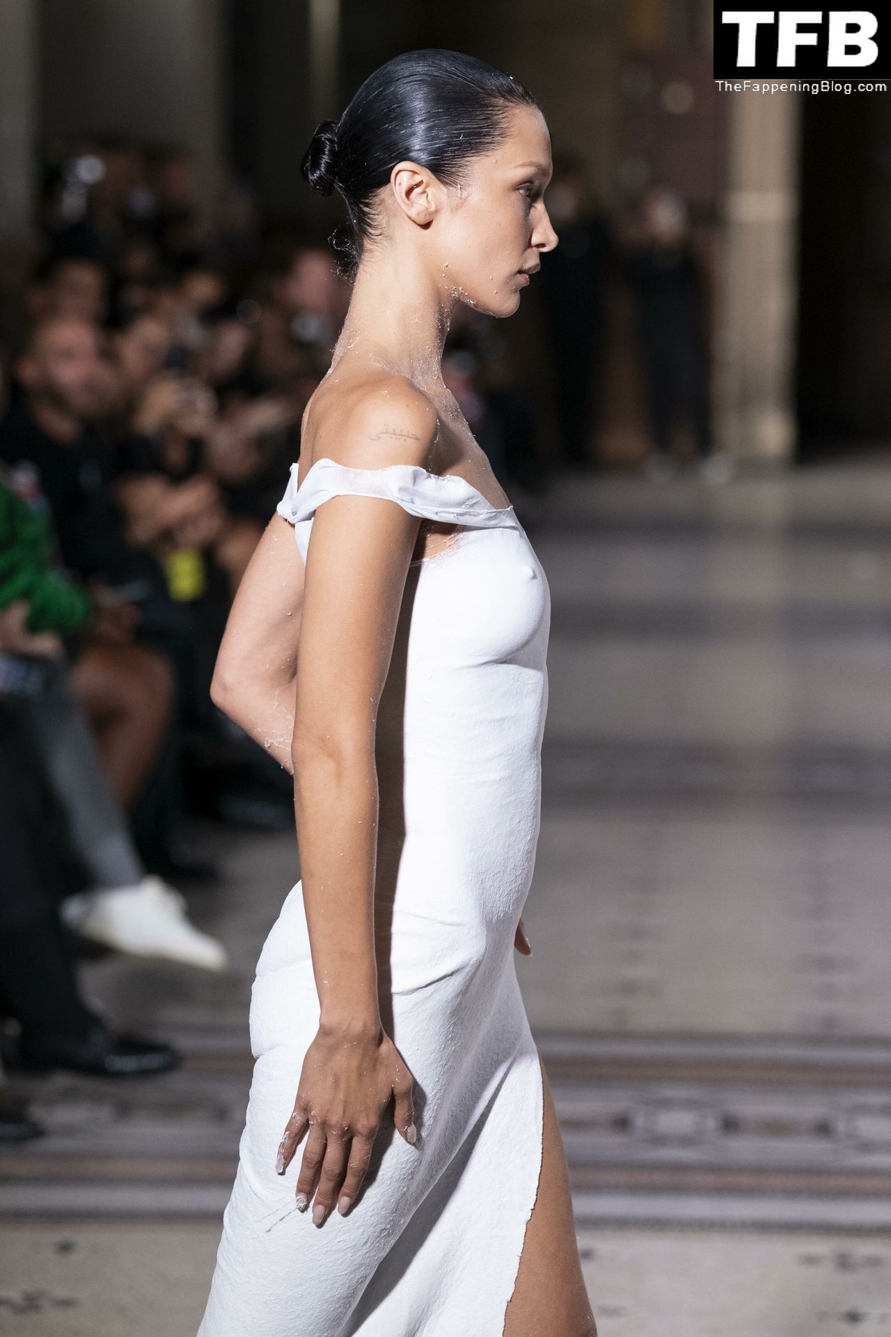 Белла Хадид появляется на показе мод Coperni во время Парижской недели моды, 30.09.2022. Модель получает платье, распылённое краской, прямо во время показа.