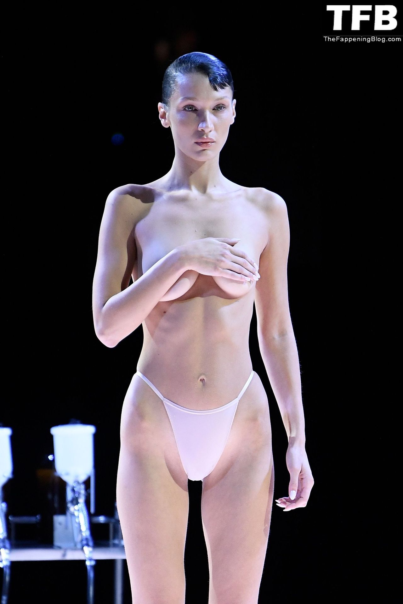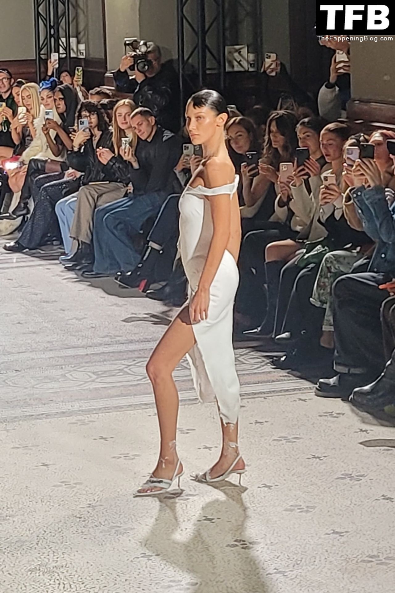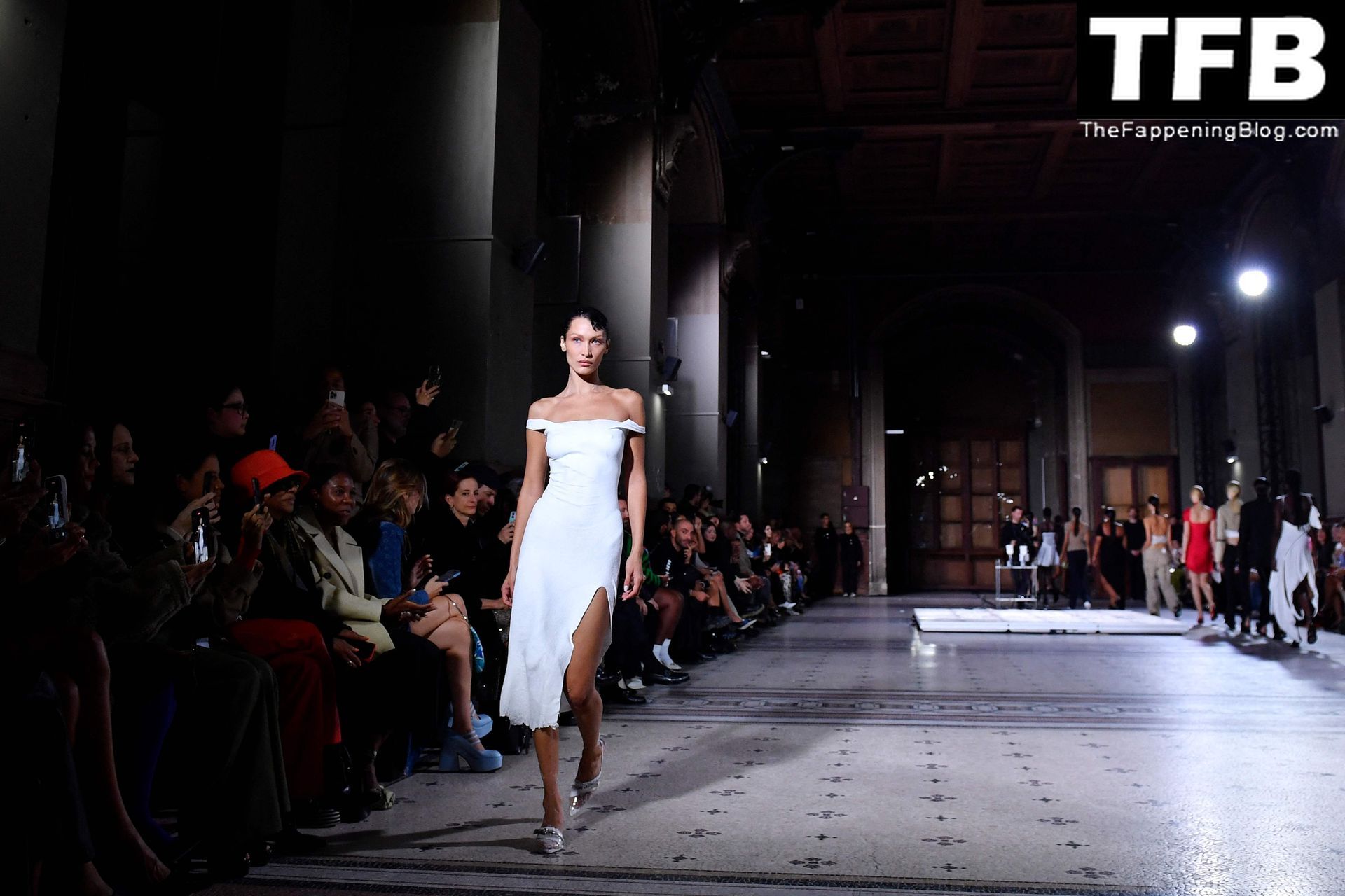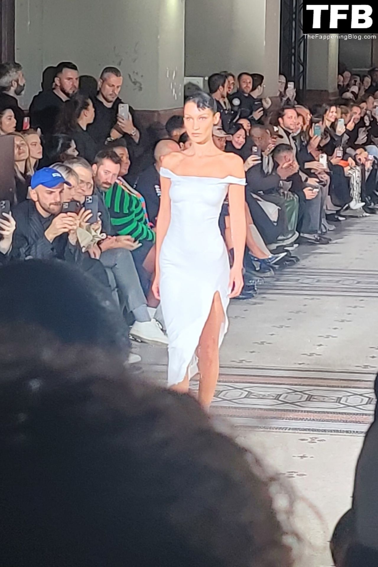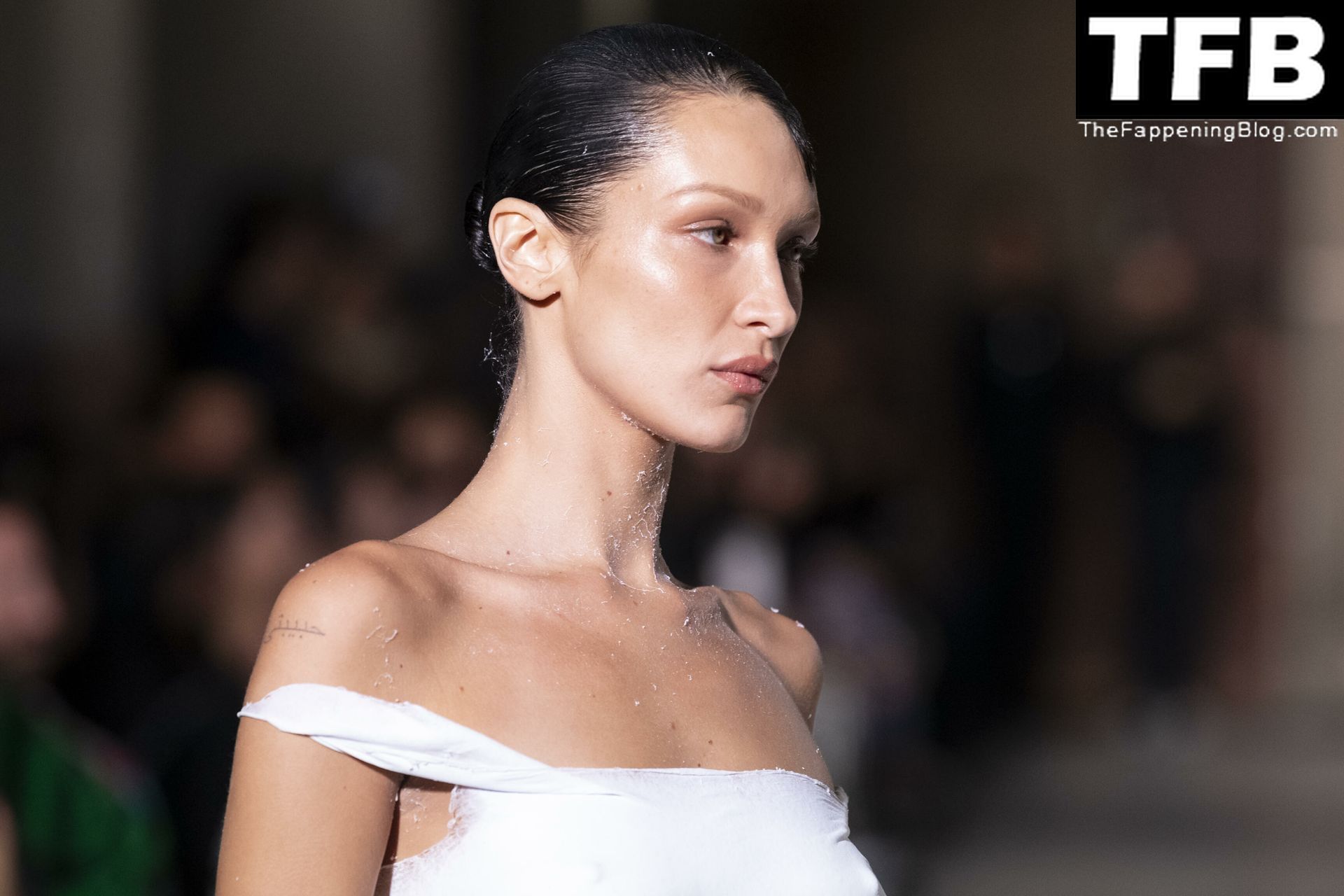 Белла Хадид появляется на показе мод Coperni во время Парижской недели моды, 30.09.2022. Модель получает платье, распылённое краской, прямо во время показа.