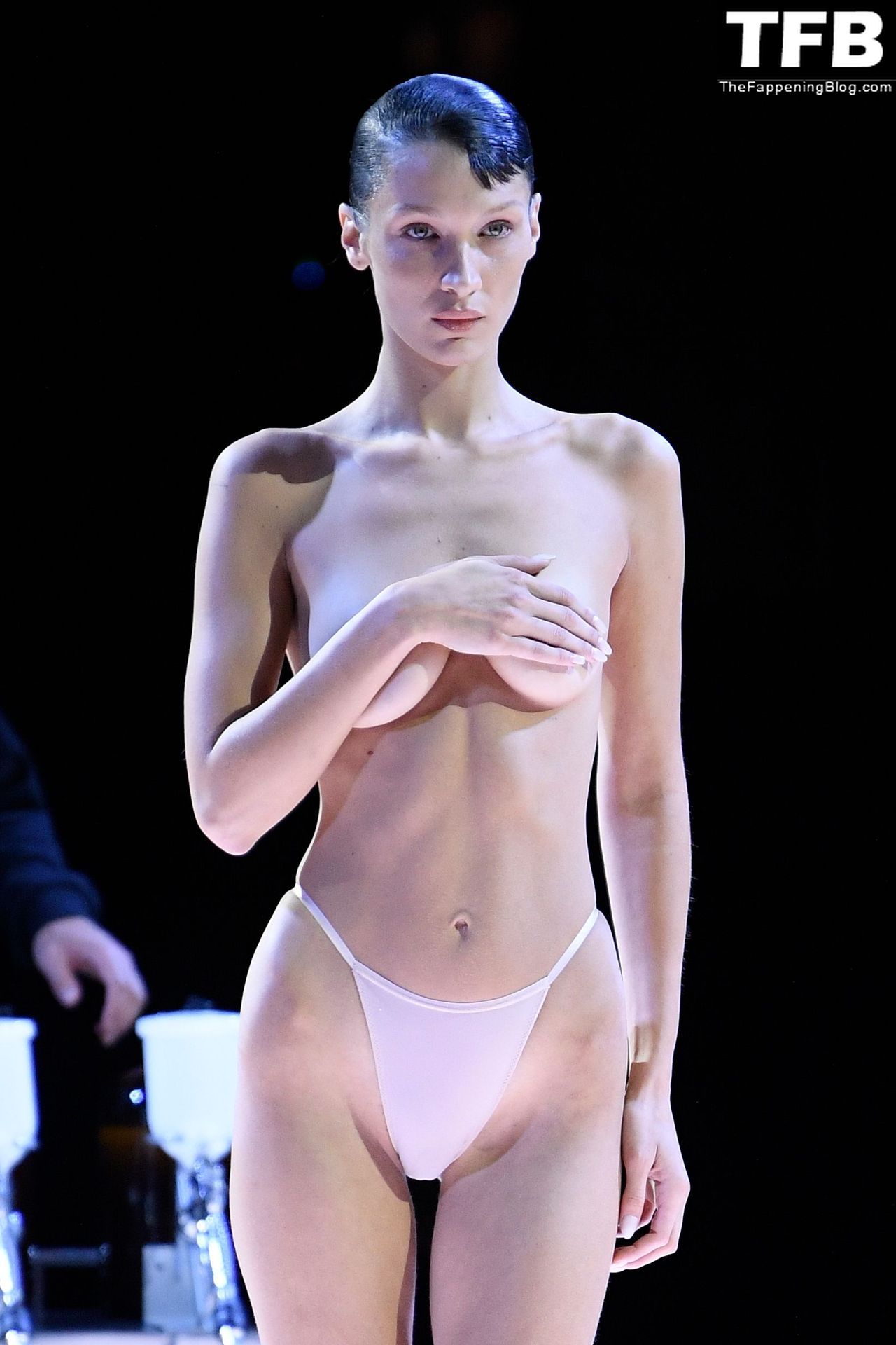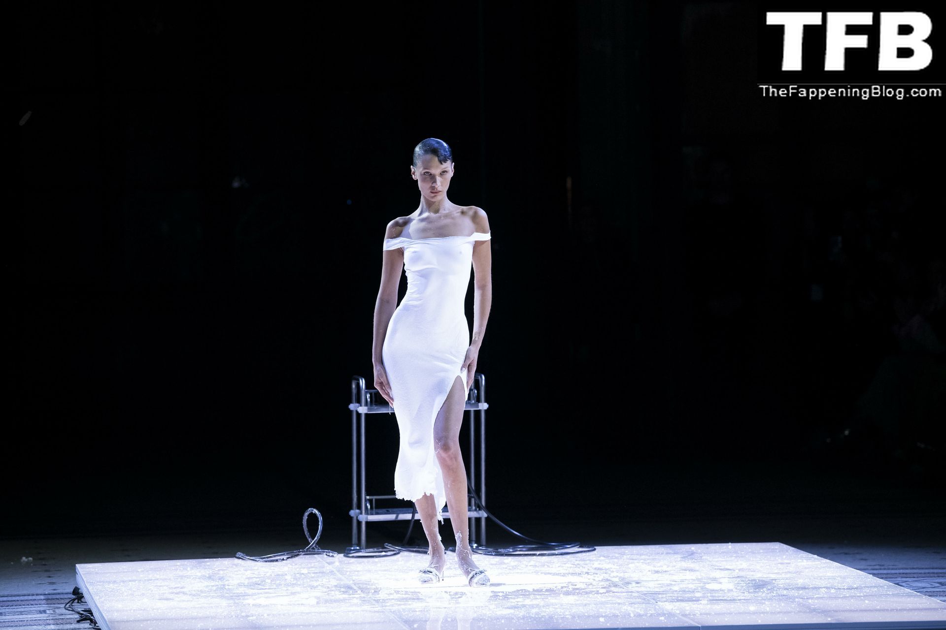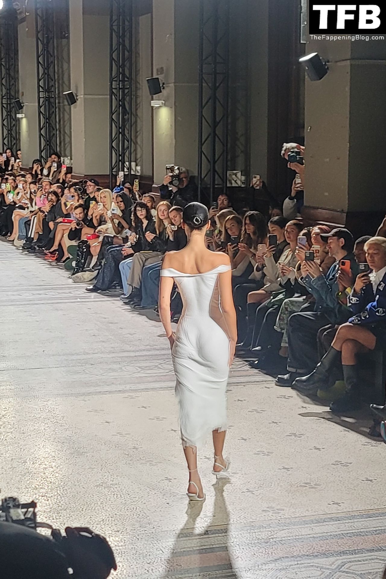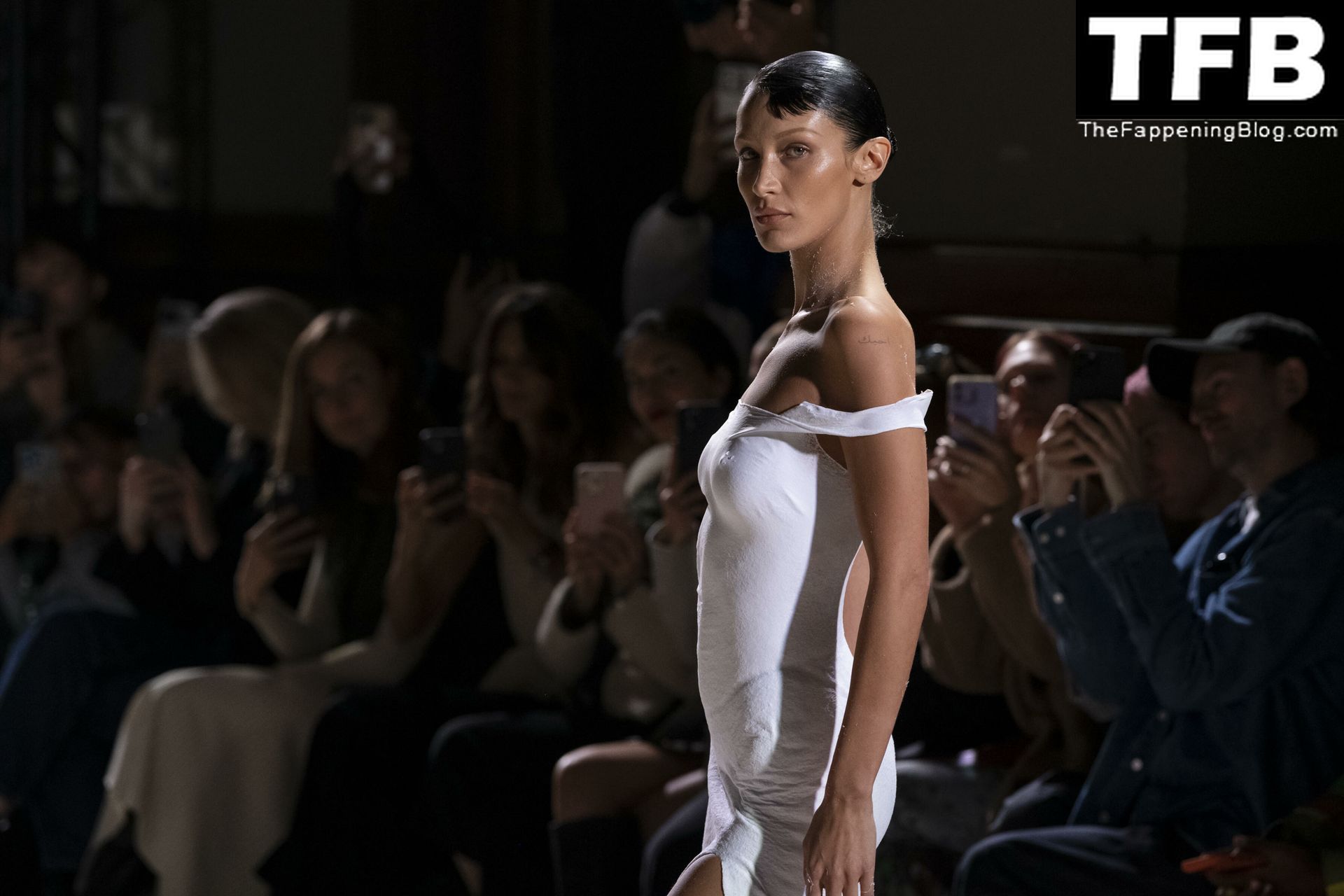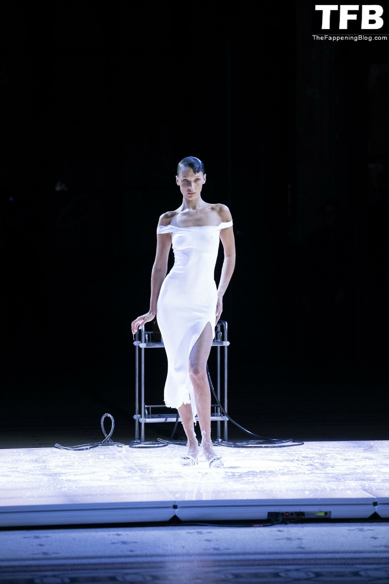 Белла Хадид появляется на показе мод Coperni во время Парижской недели моды, 30.09.2022. Модель получает платье, распылённое краской, прямо во время показа.