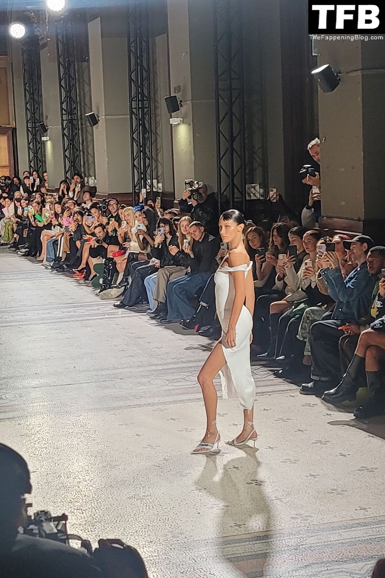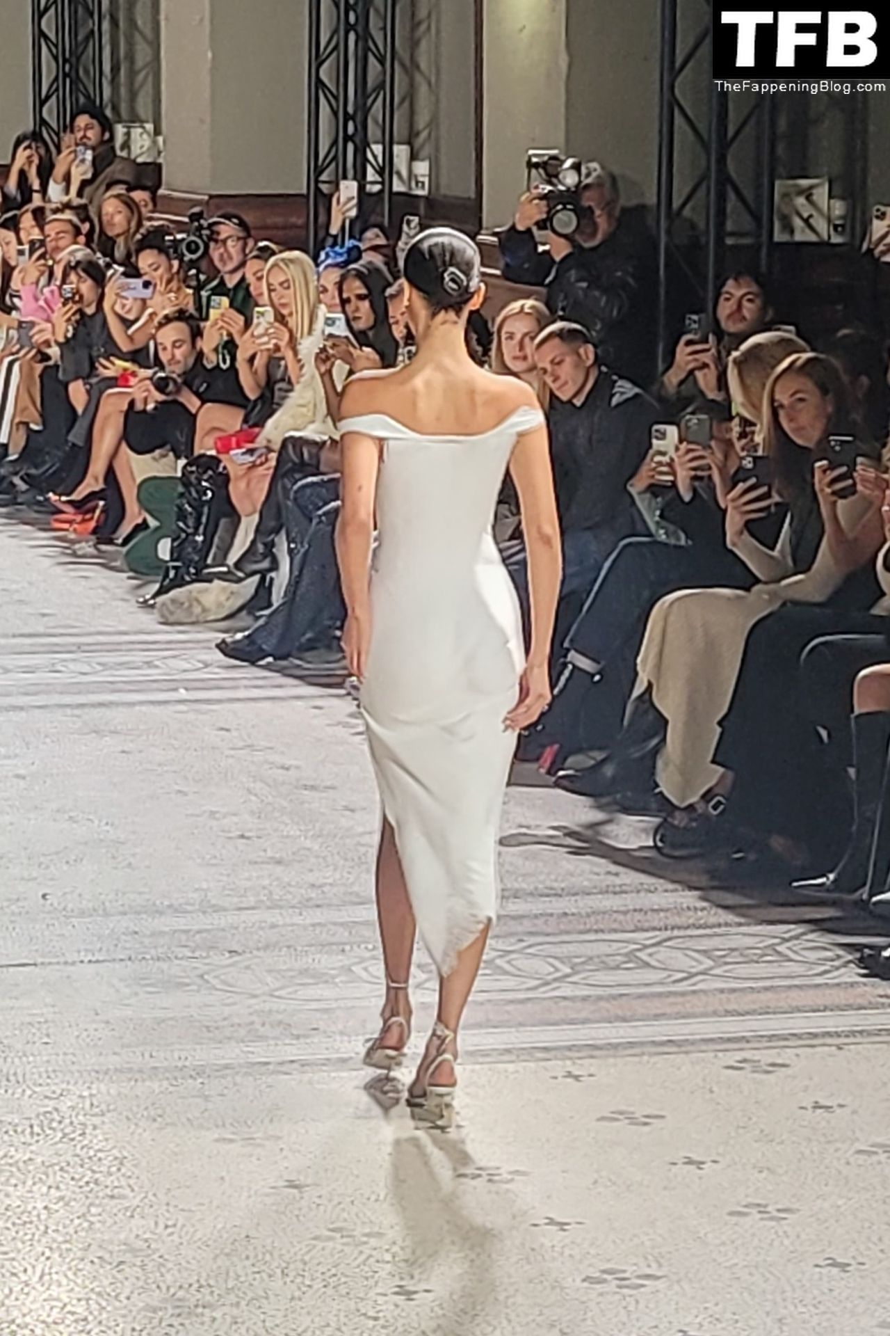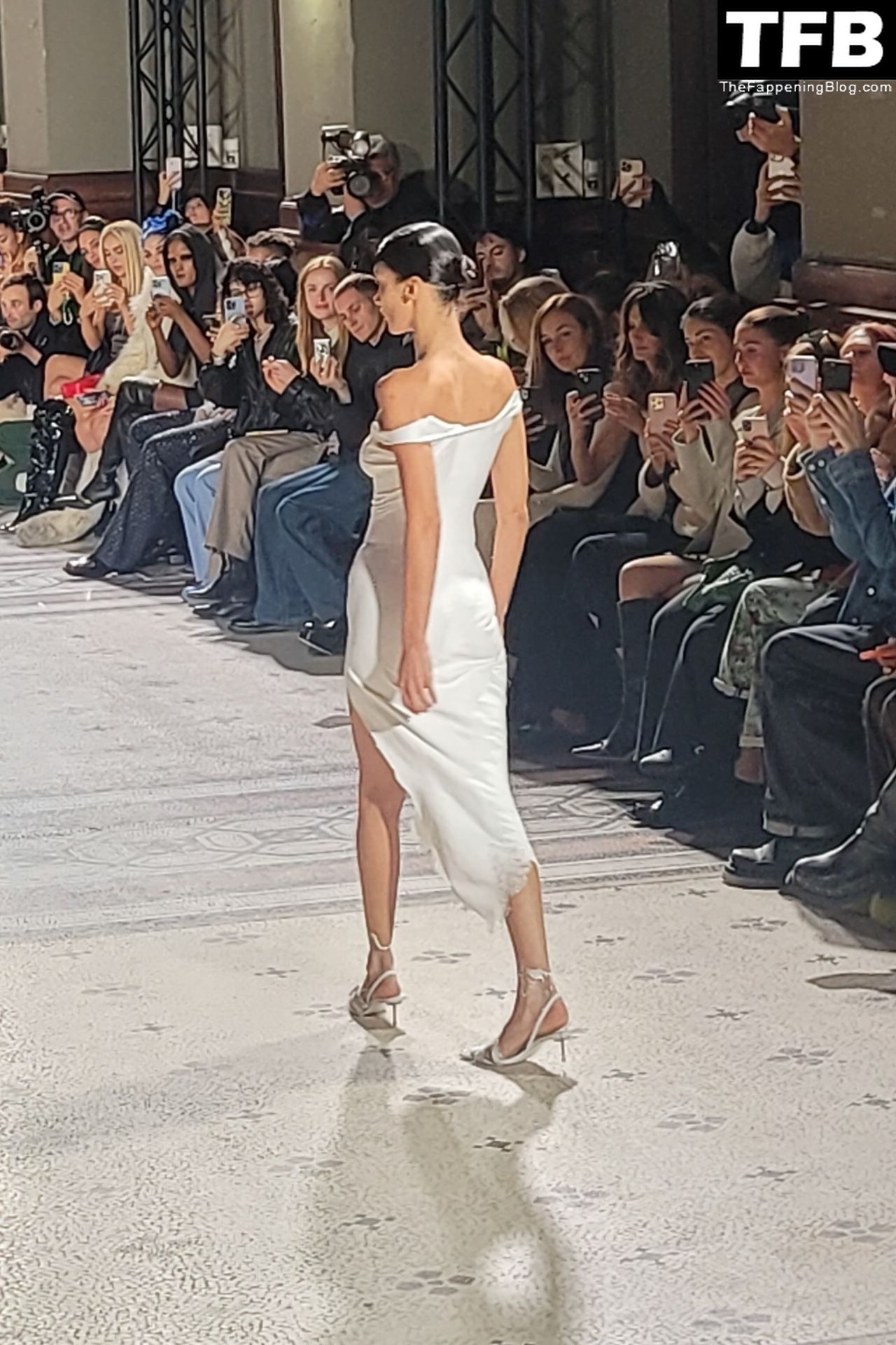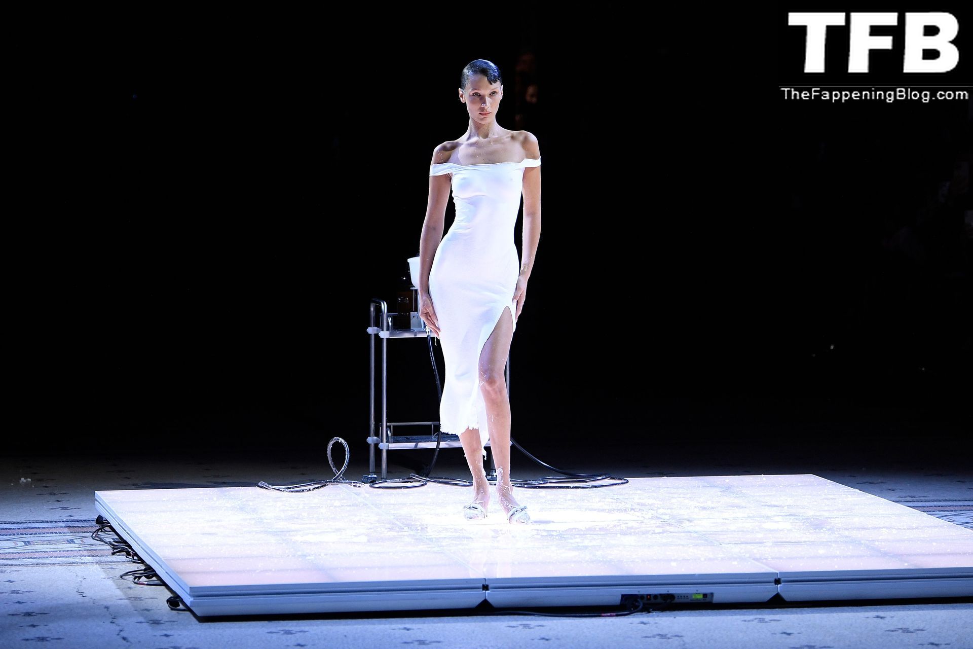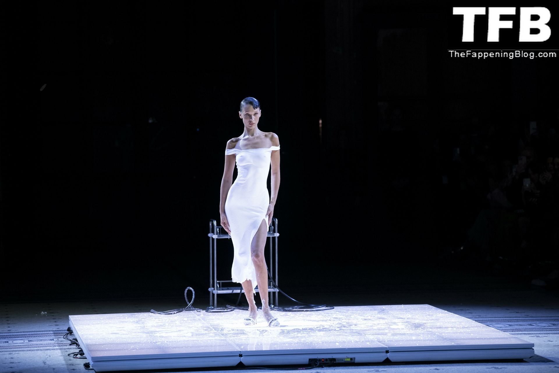 Белла Хадид появляется на показе мод Coperni во время Парижской недели моды, 30.09.2022. Модель получает платье, распылённое краской, прямо во время показа.