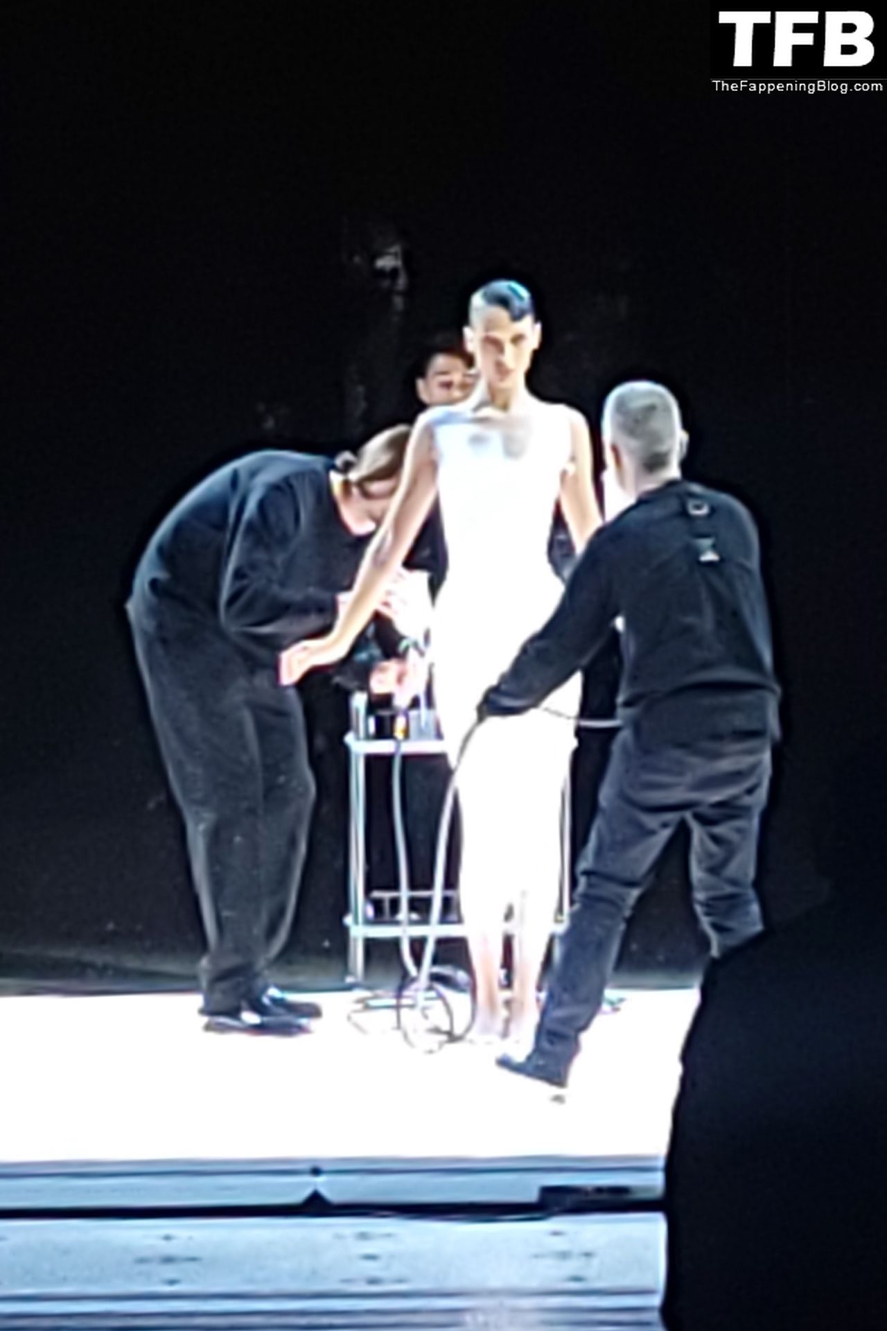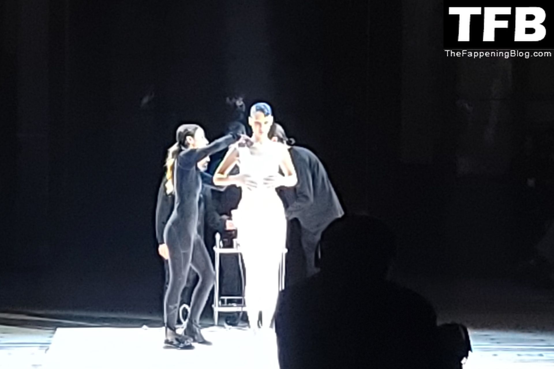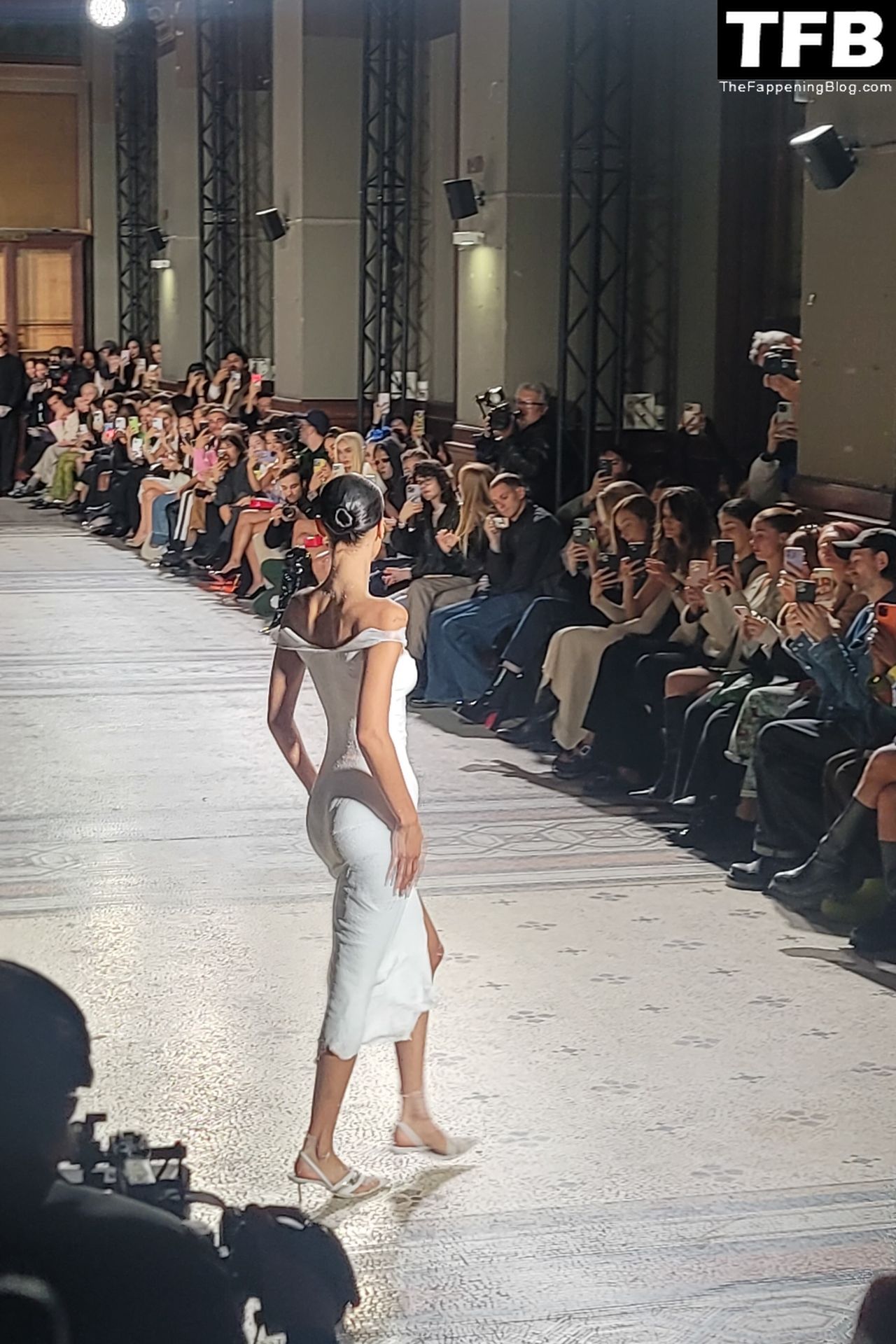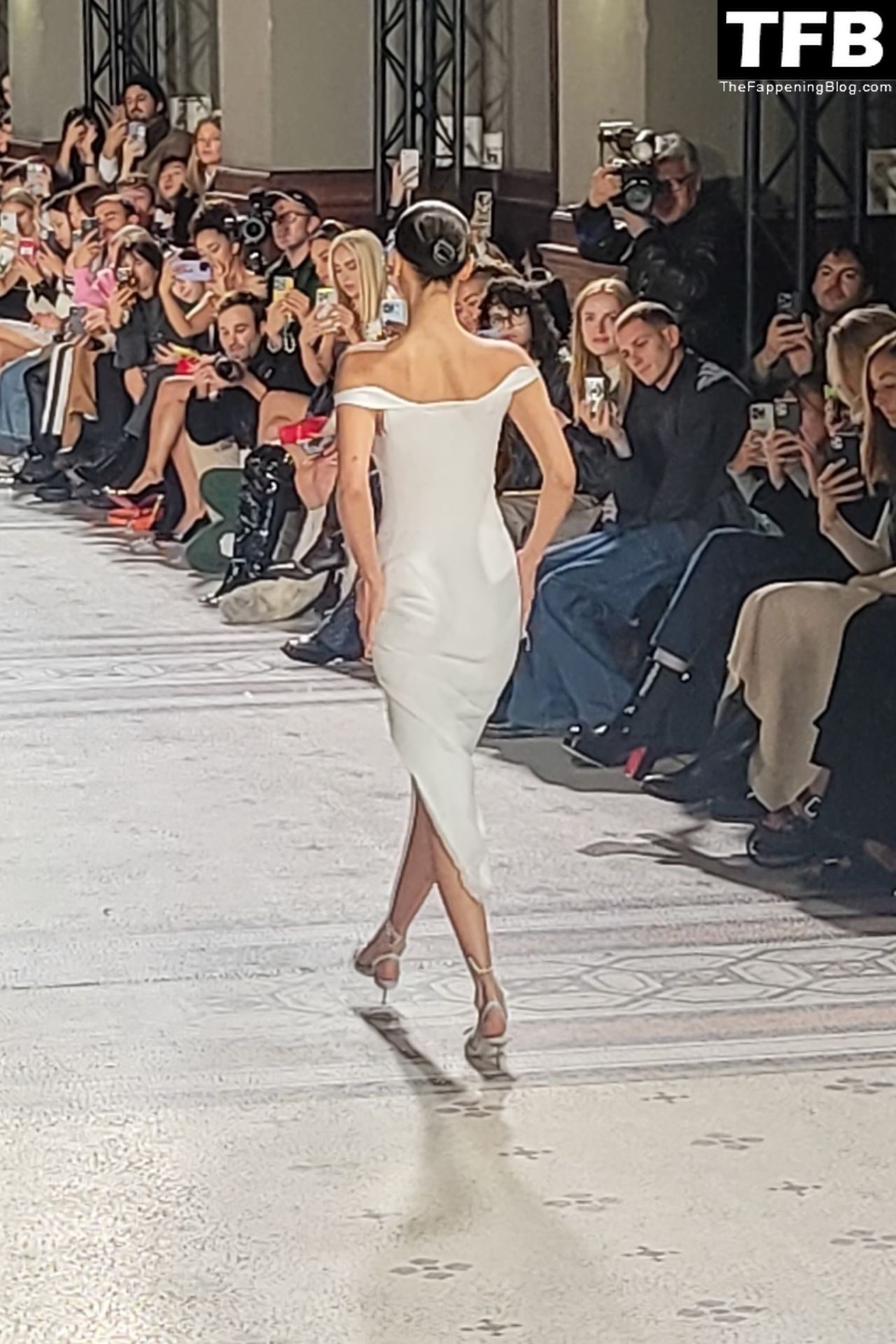 Белла Хадид появляется на показе мод Coperni во время Парижской недели моды, 30.09.2022. Модель получает платье, распылённое краской, прямо во время показа.