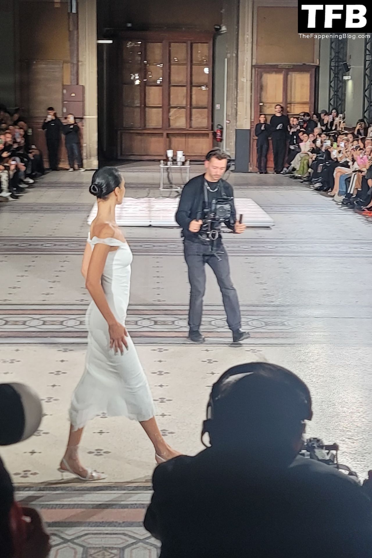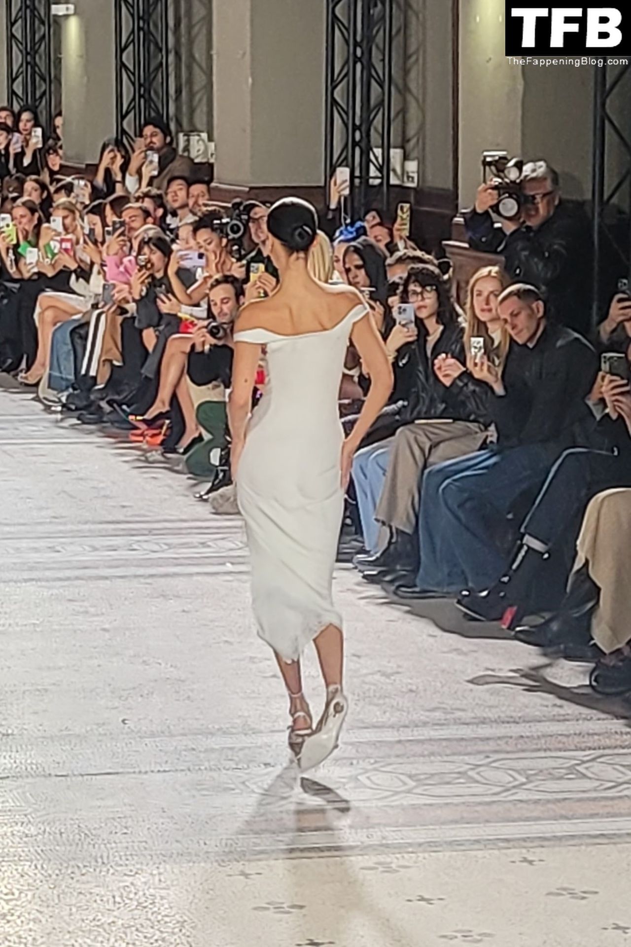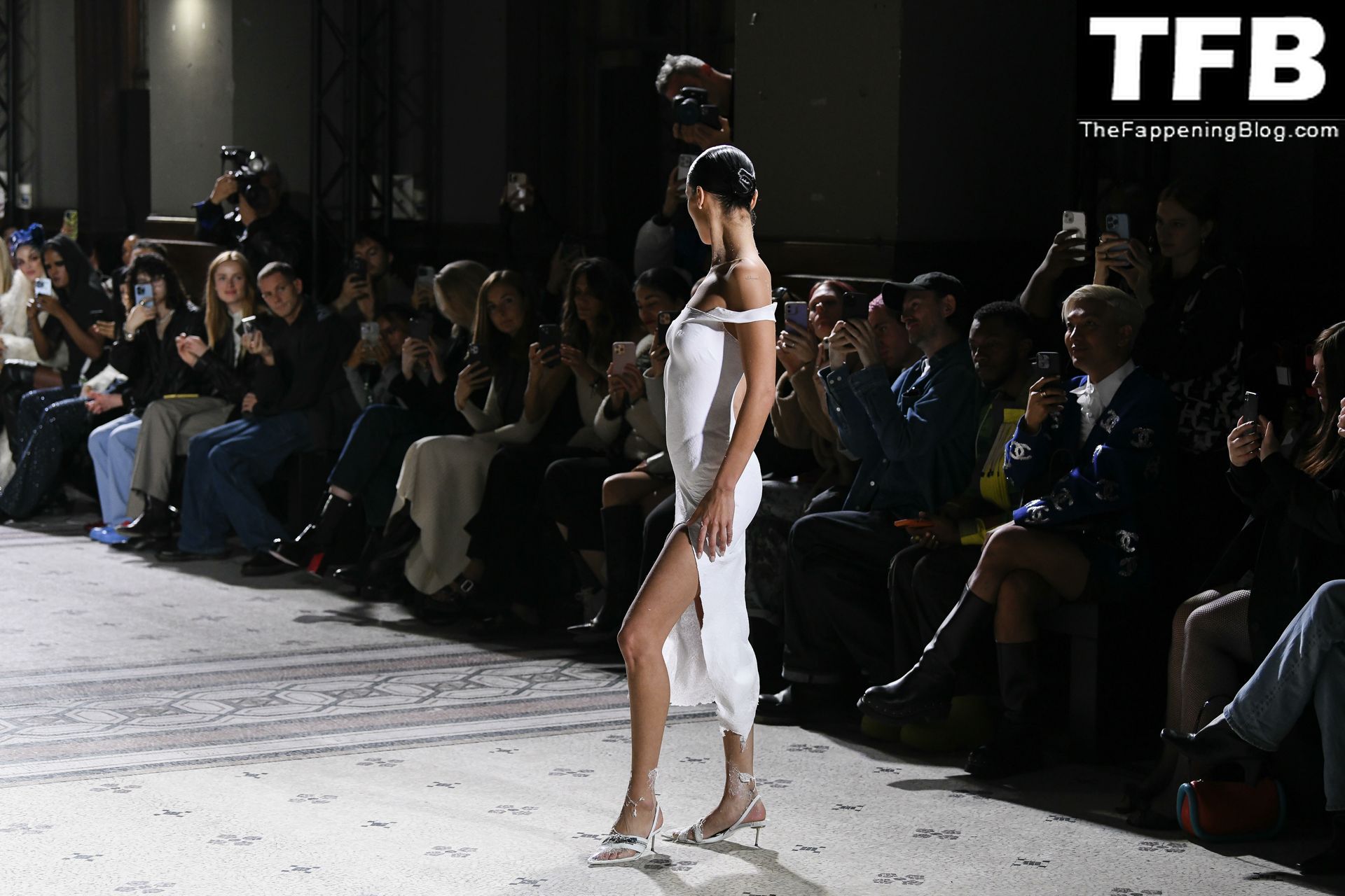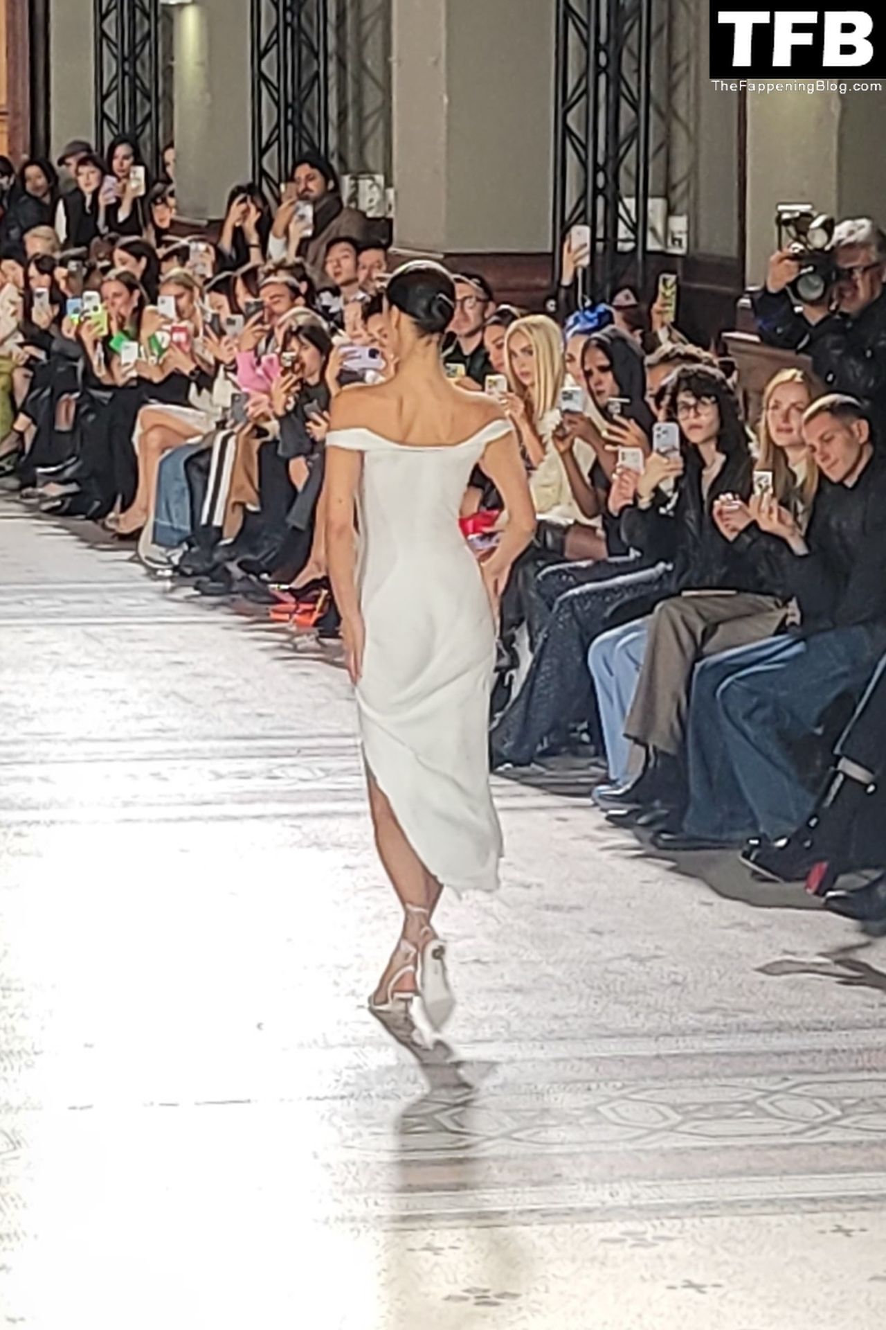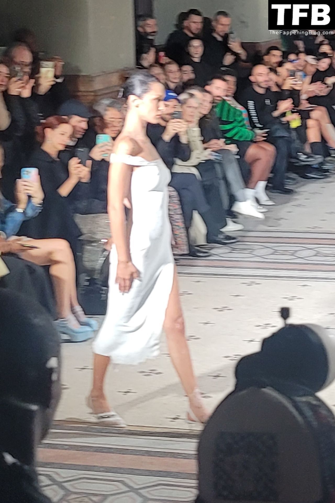 Белла Хадид появляется на показе мод Coperni во время Парижской недели моды, 30.09.2022. Модель получает платье, распылённое краской, прямо во время показа.
