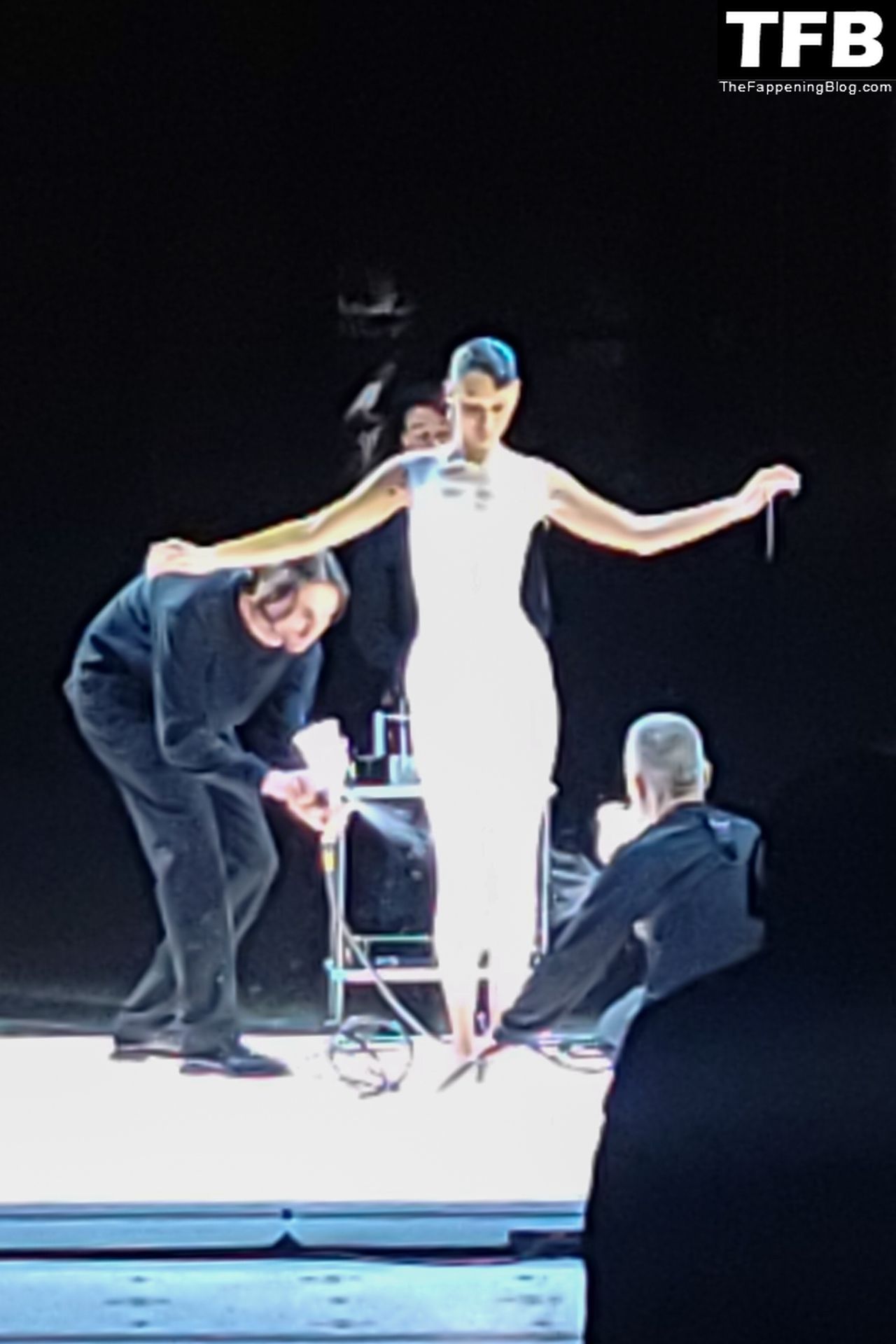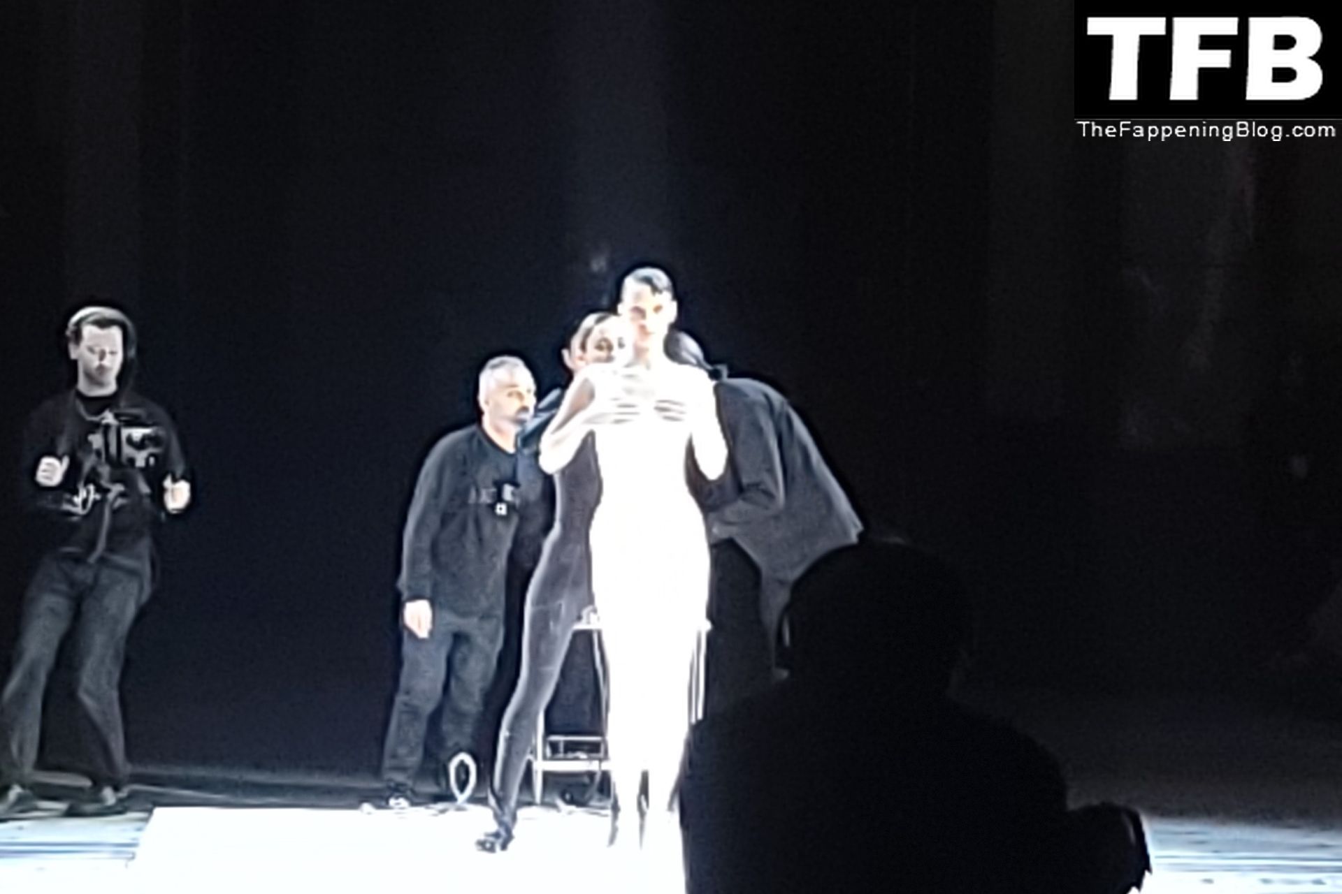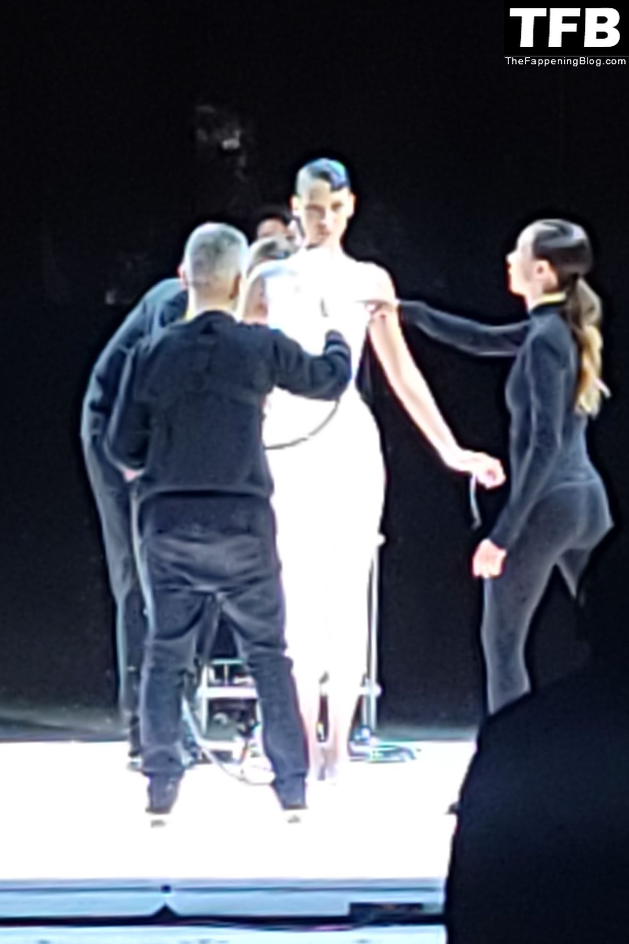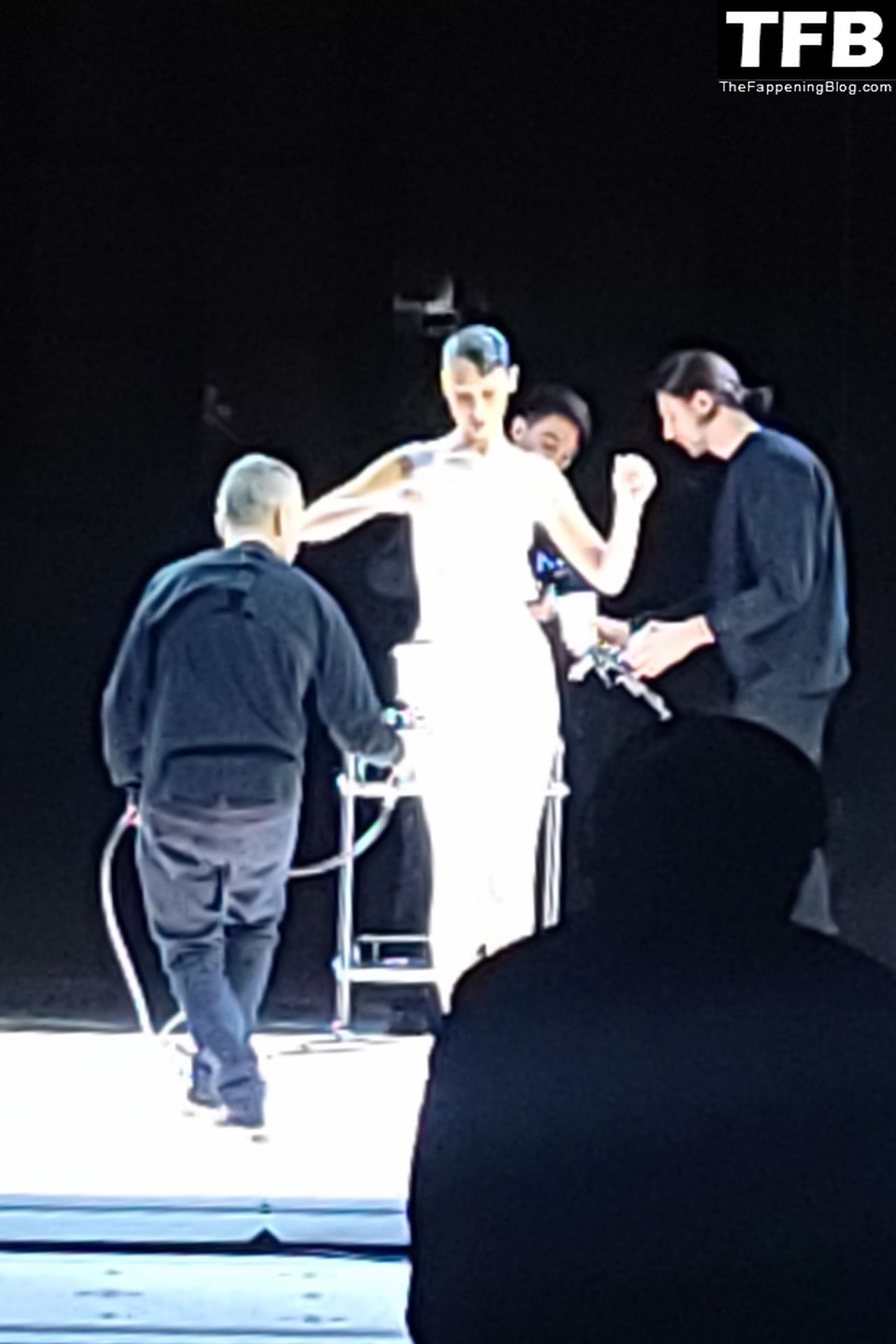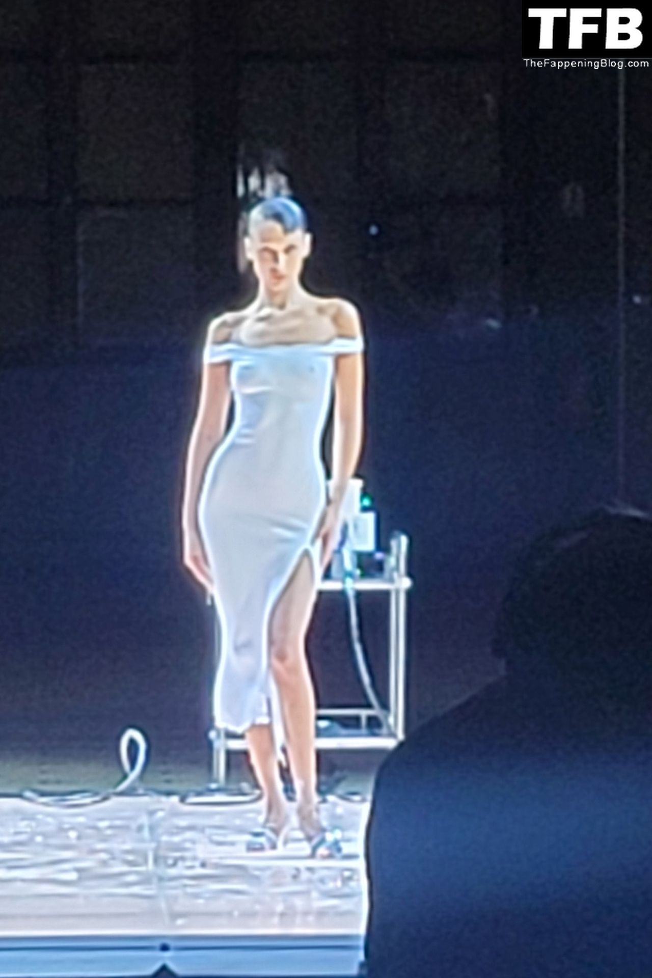 Белла Хадид появляется на показе мод Coperni во время Парижской недели моды, 30.09.2022. Модель получает платье, распылённое краской, прямо во время показа.