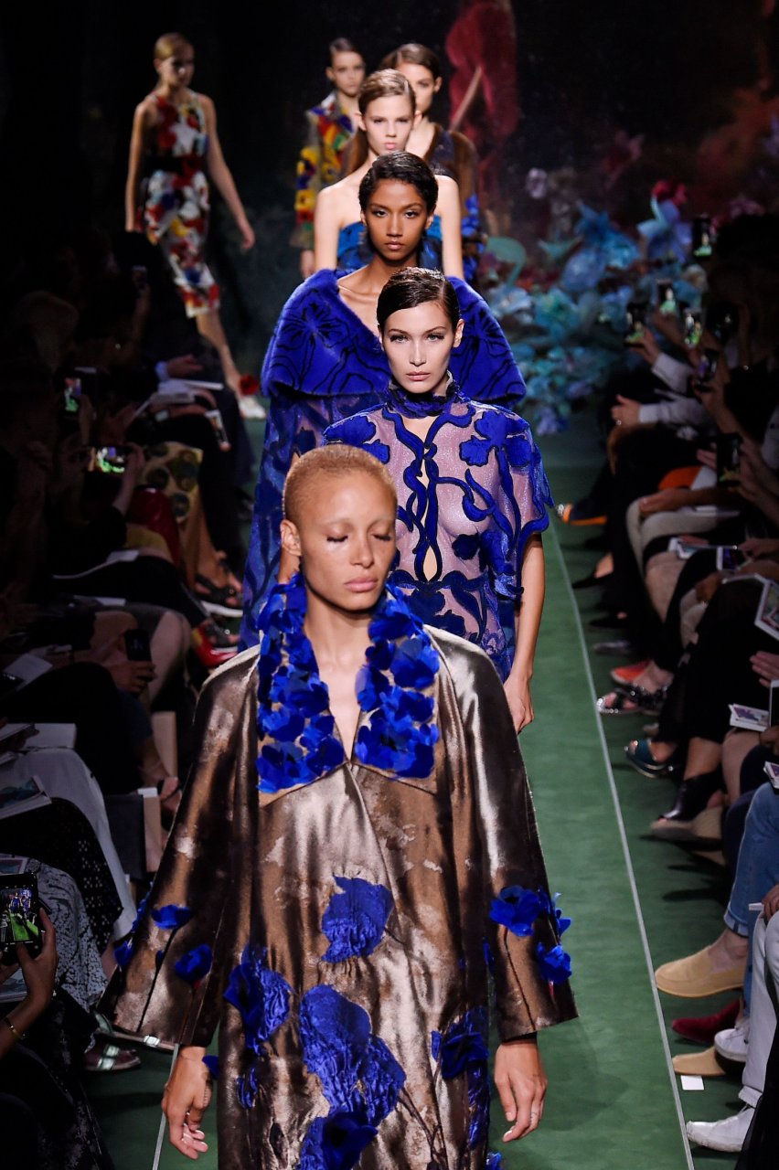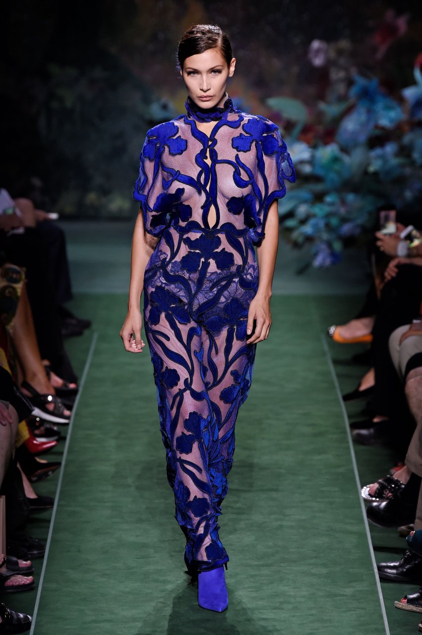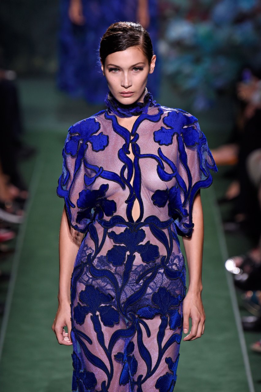 Модель Белла Хадид демонстрирует свои груди на подиуме в Париже, 07.05.2017.