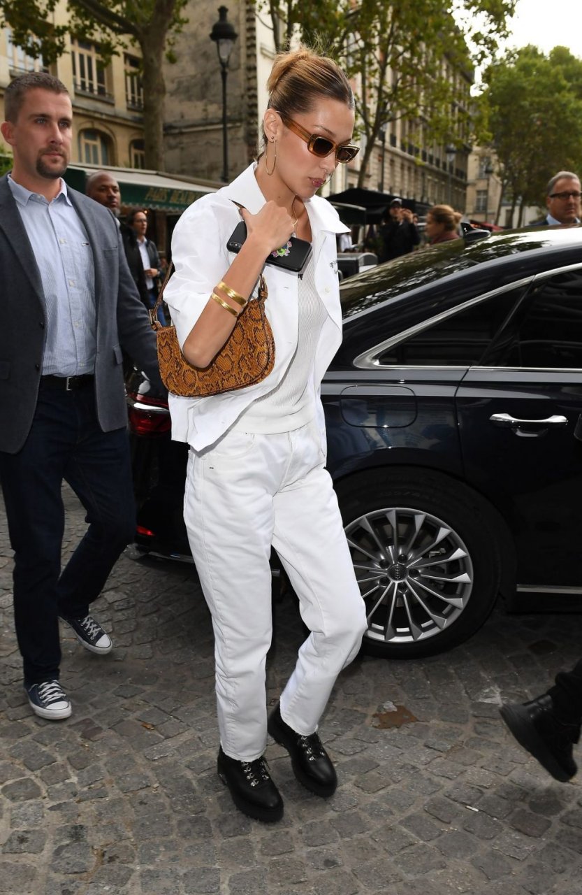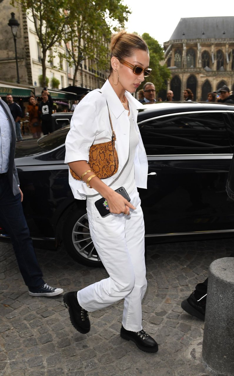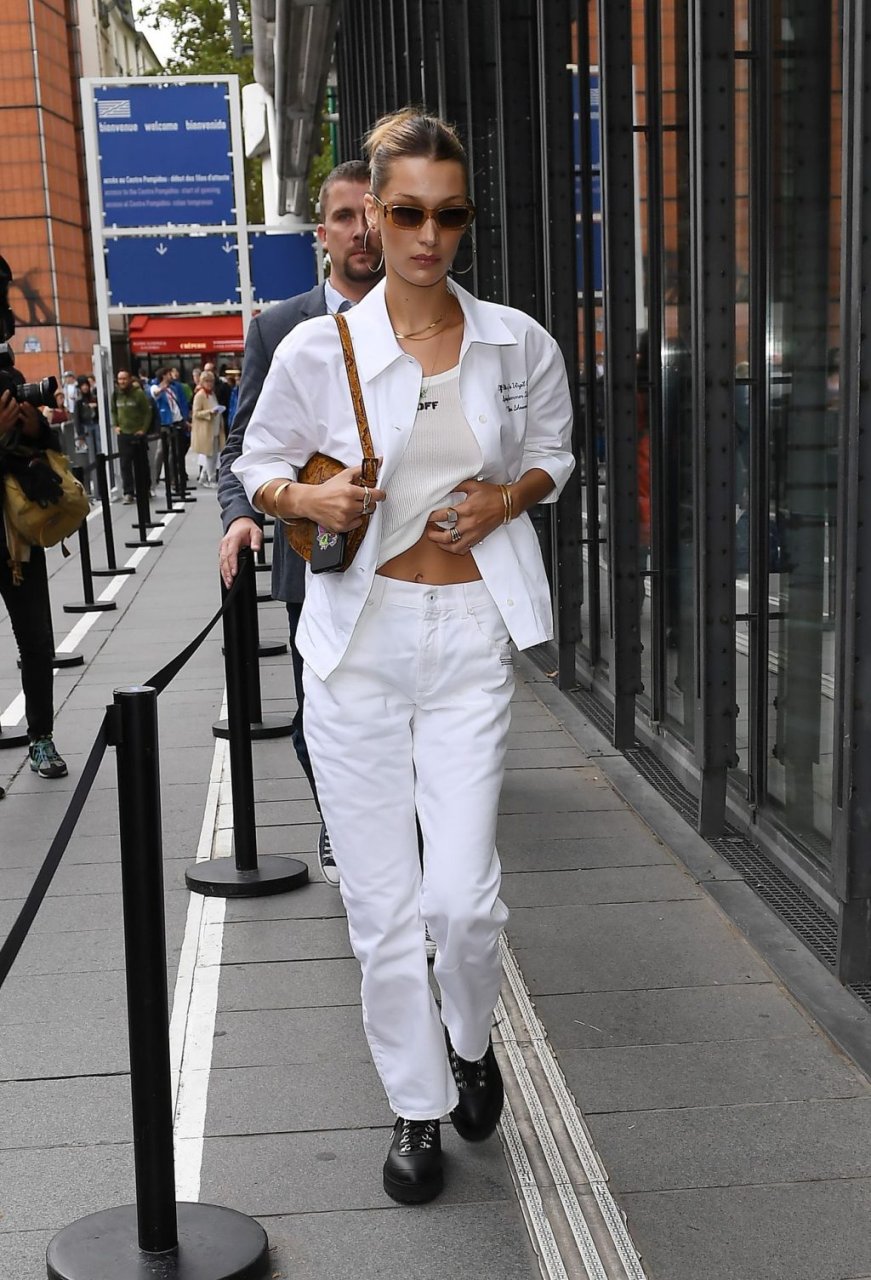 Bella Hadid была замечена, покидая свой отель Le Royal Monceau, одетая в Off-White по случаю показа мод бренда во время Парижской недели моды, 26.09.2019.