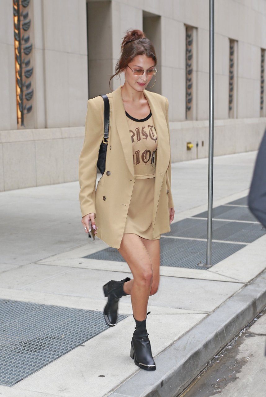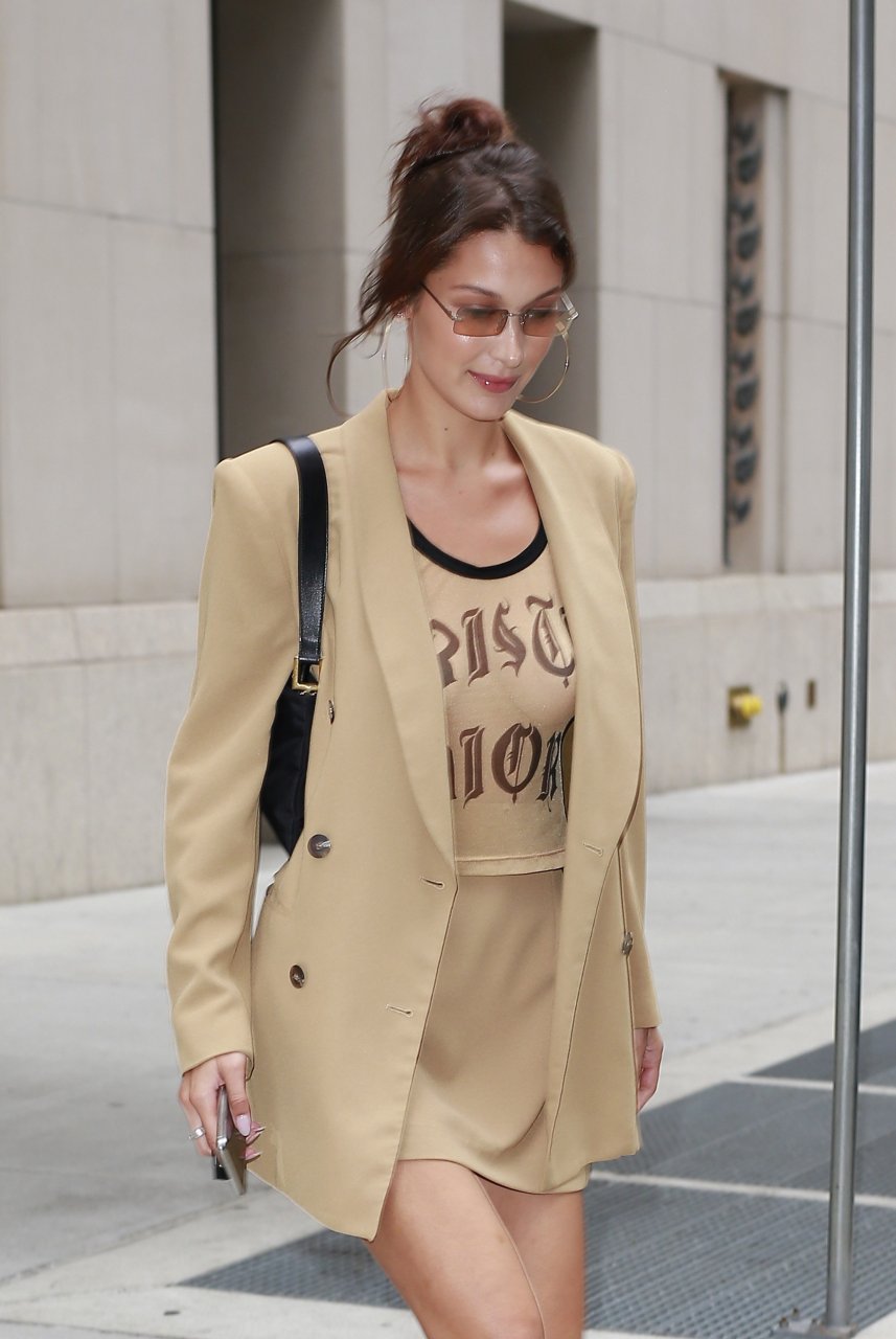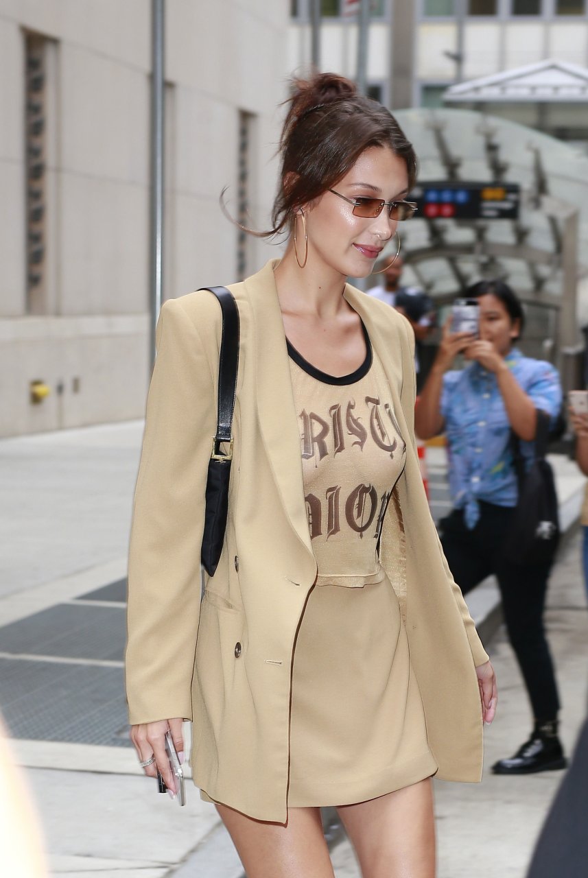 Модель Белла Хадид без бюстгальтера была замечена в прозрачной футболке Dior, когда она приезжала в офис в Нью-Йорке, 07.09.2018.
