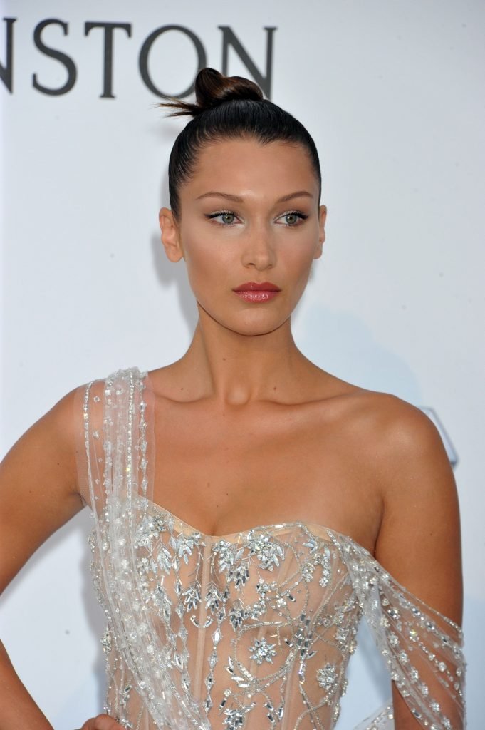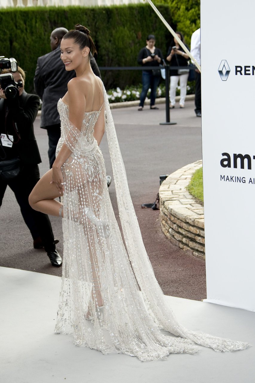Bella Hadid носит прозрачное белое платье на 24-м гала-вечере amfAR’s Cinema Against AIDS на 70-м Каннском кинофестивале, 25.05.2017. Изабелла Хадид — американская модель и актриса. Возраст – 20 лет.
