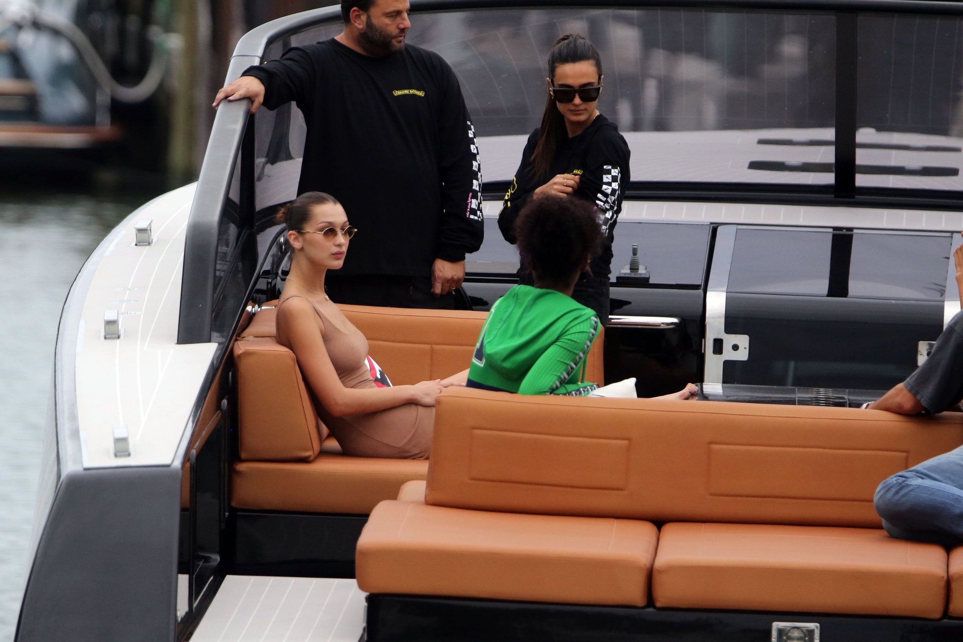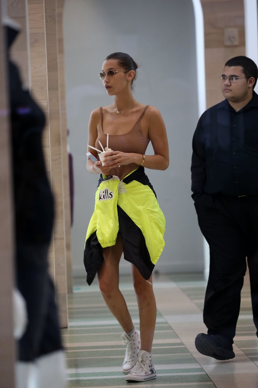 Модель Белла Хадид, 21 год, носит очень короткое платье, когда идет за покупками с Хейли Болдуин в Майами, 27.11.2017.